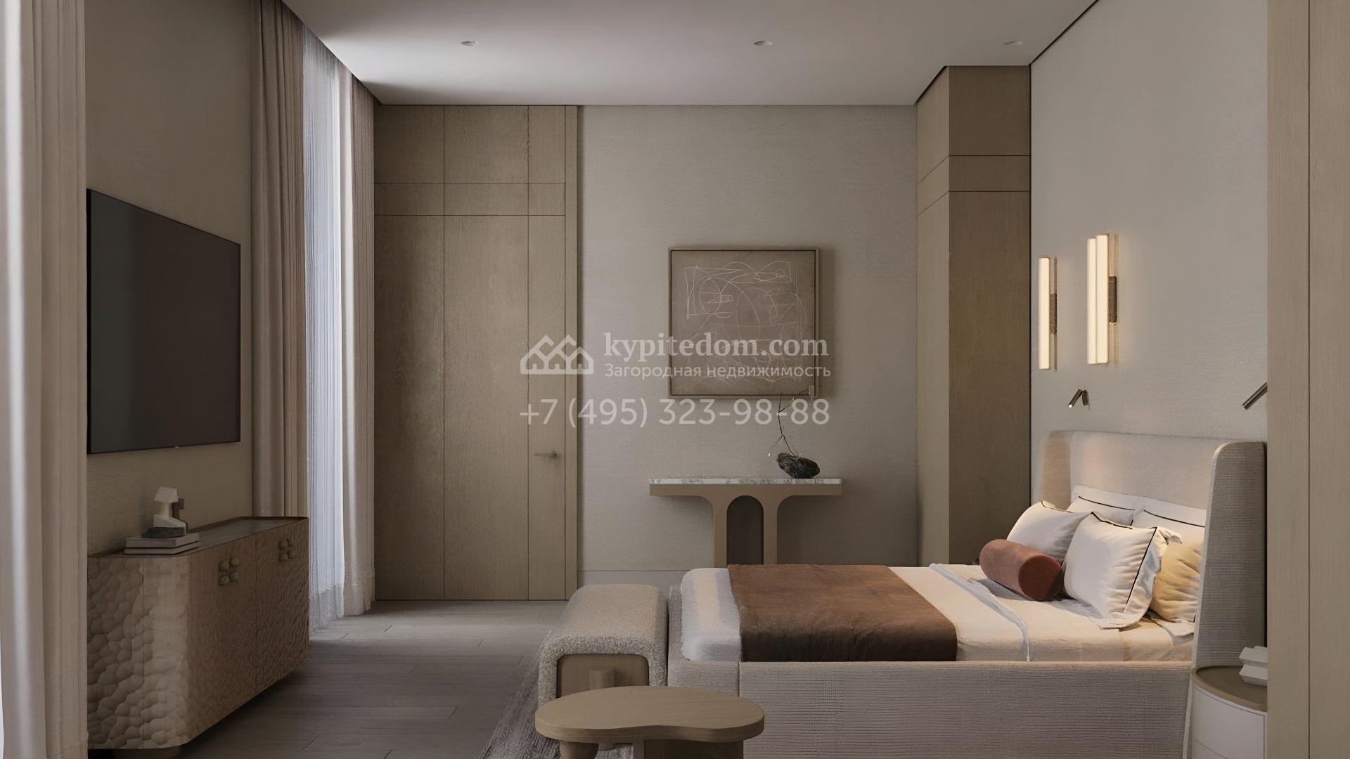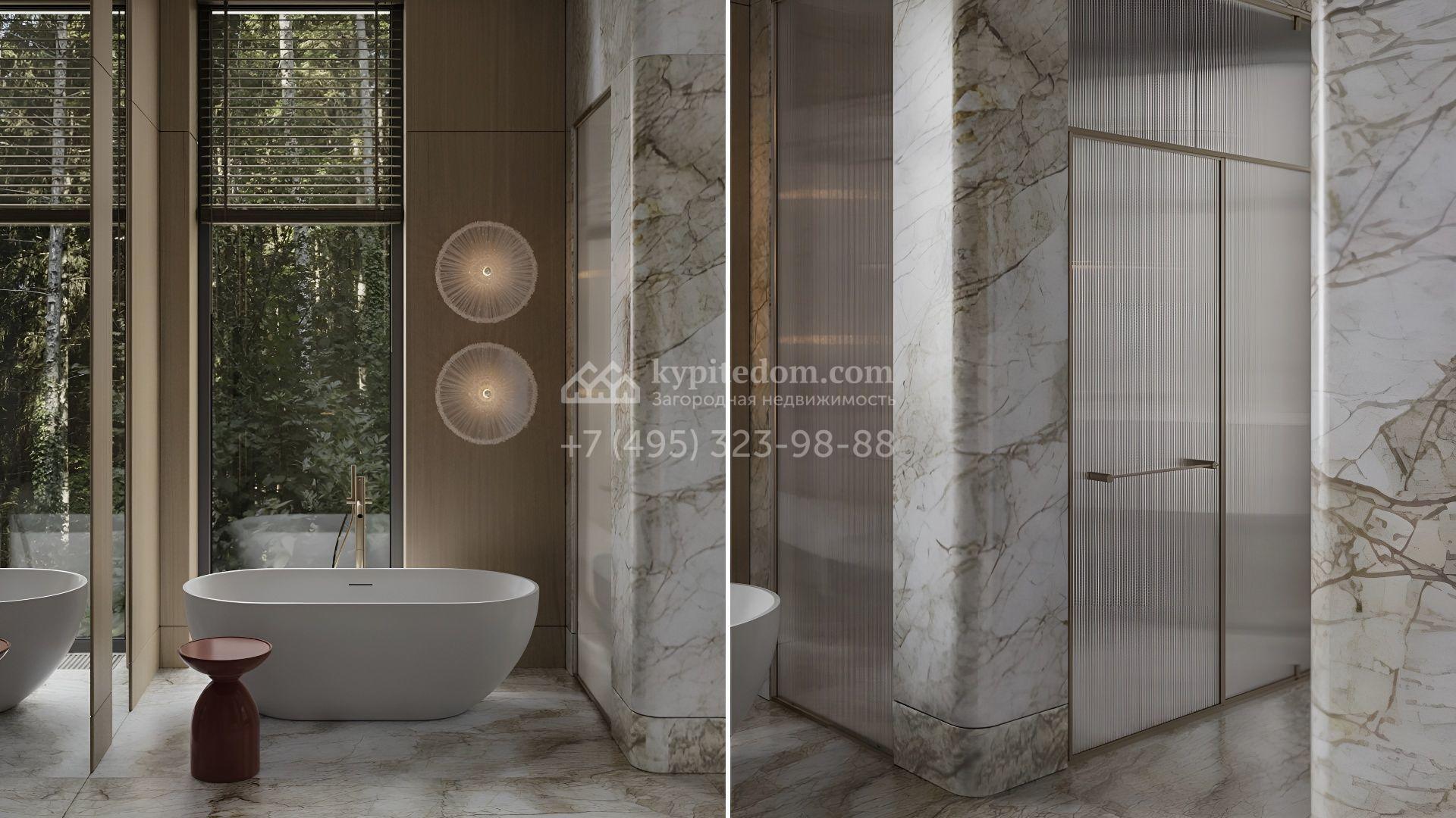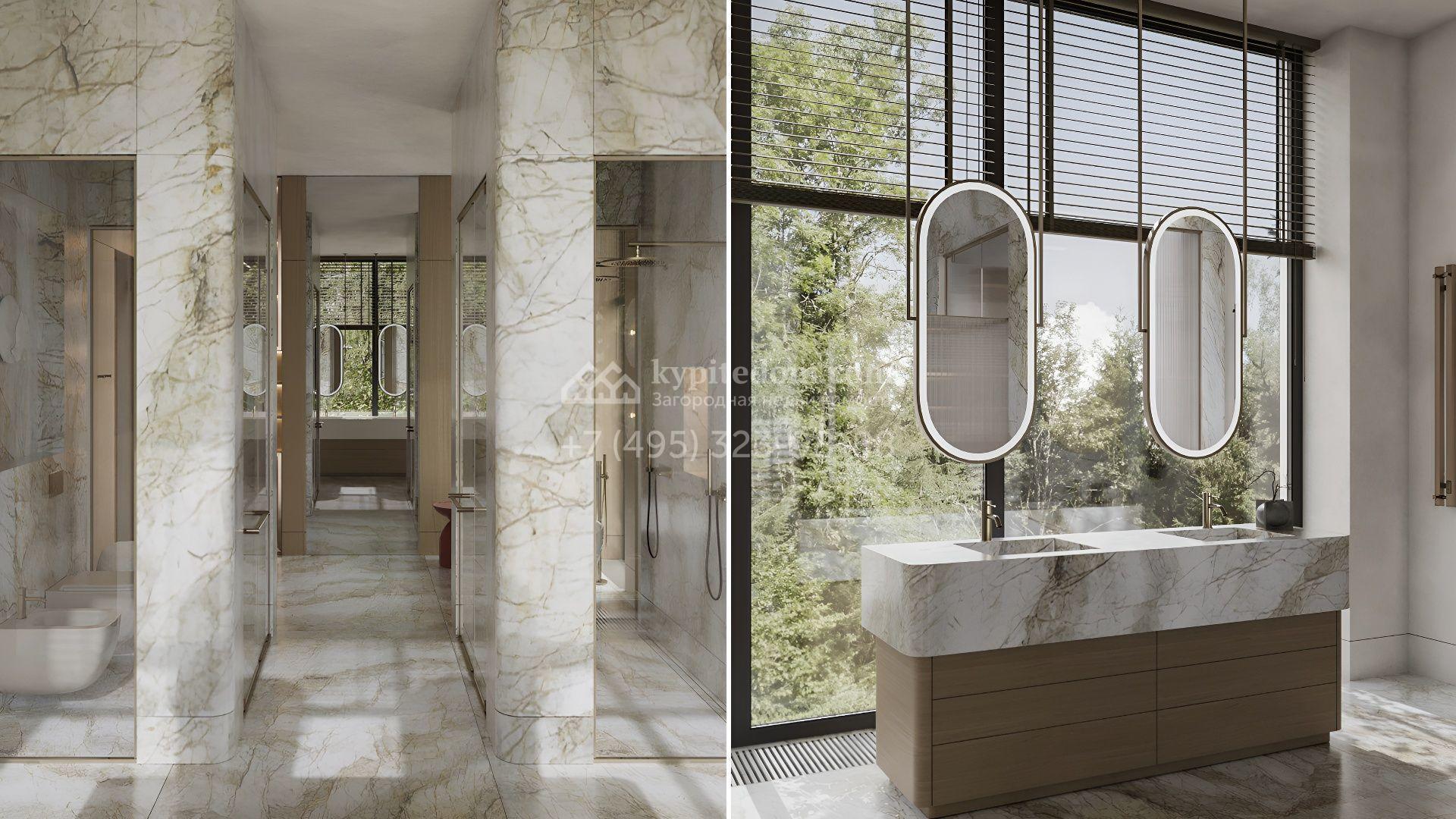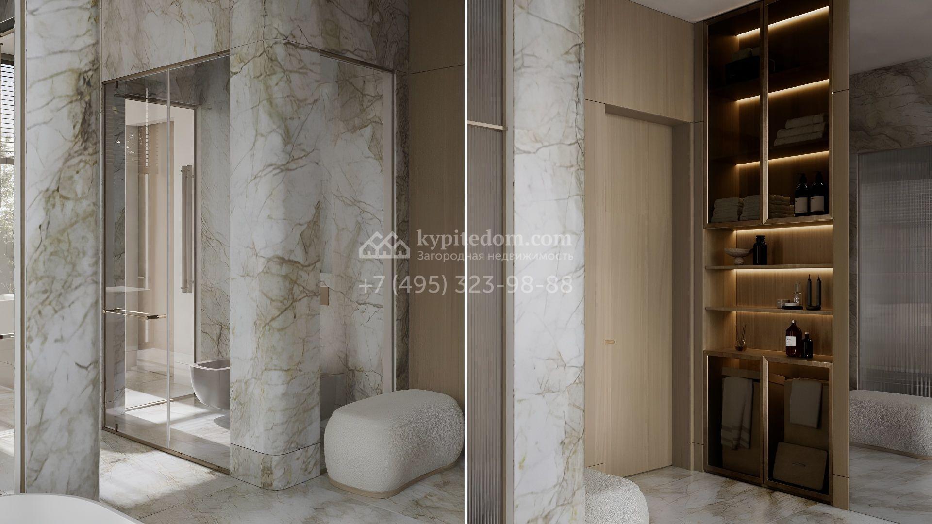 Интерьер выдержан в спокойной современной стилистике. Преобладают натуральные текстуры, светлая палитра и выверенные линии. Мрамор, древесина и текстильные детали формируют цельный образ, в котором сочетаются комфорт и чистота форм. Освещение продумано до мелочей: встроенные сценарии и декоративные элементы акцентируют зоны, а мебель легкого силуэта поддерживает общую композицию.
