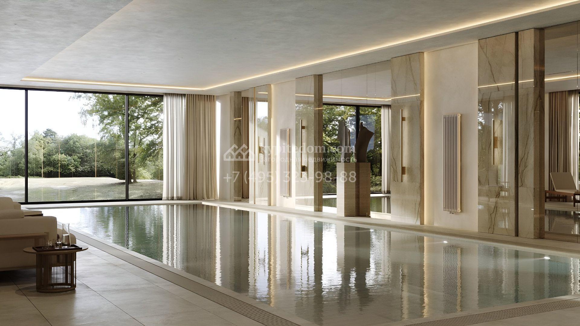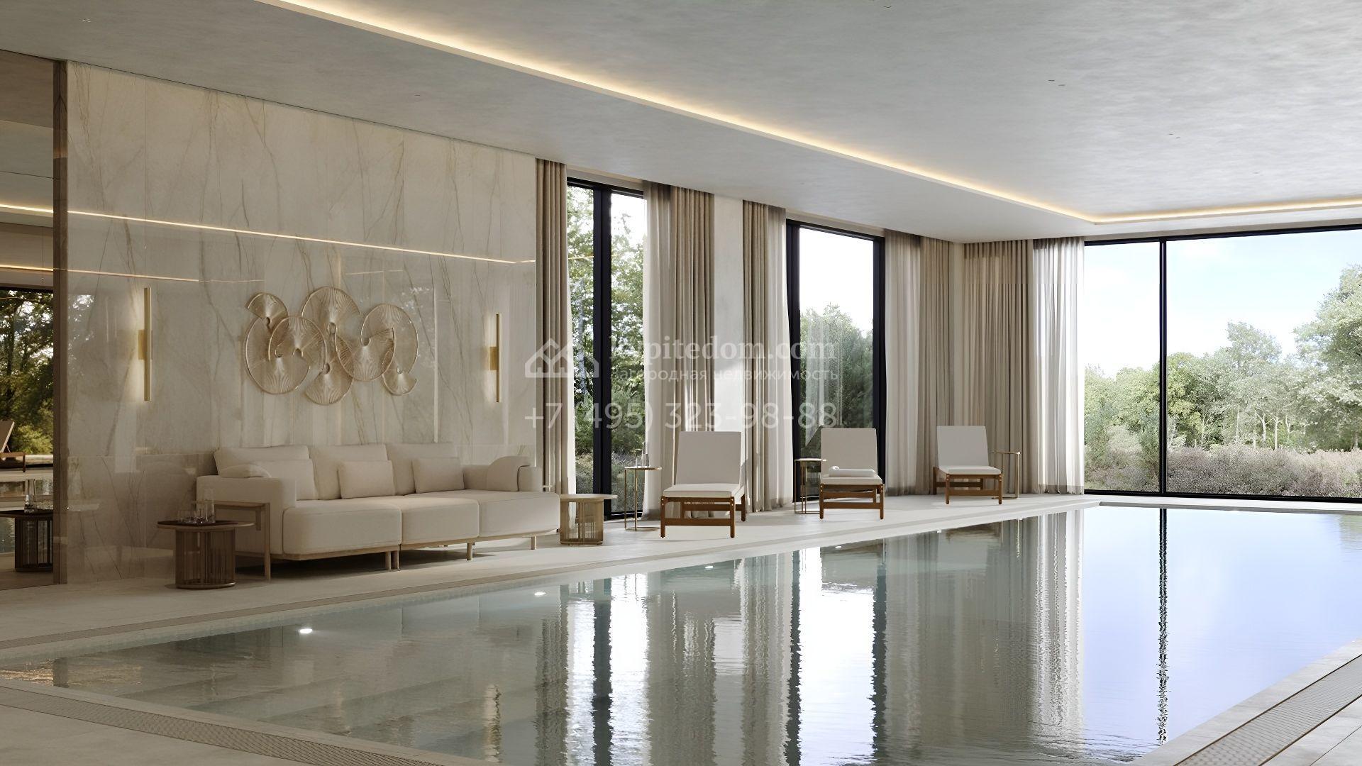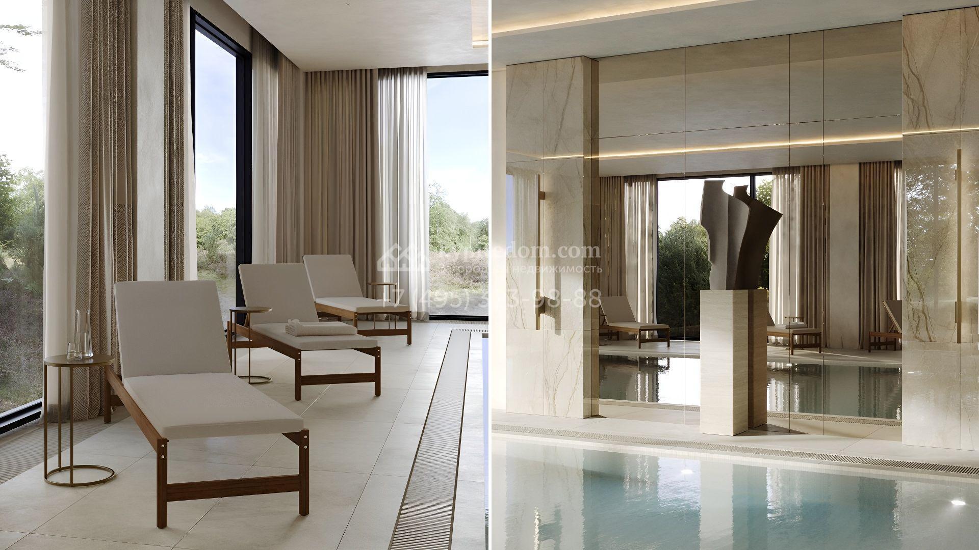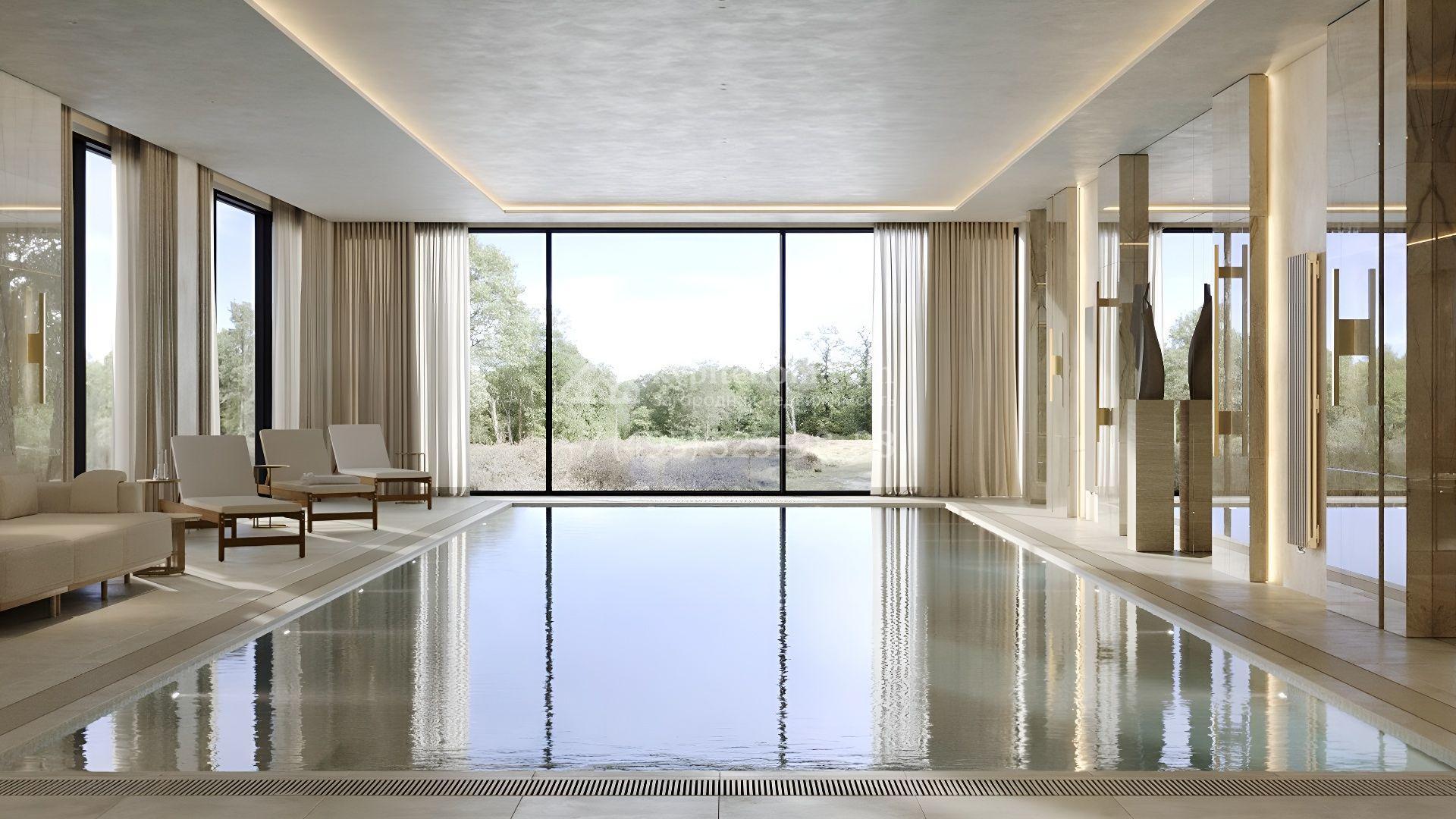 Функциональная планировка включает 5 спален с личными гардеробными и ванными, кухню-гостиную, вспомогательную кухню, кабинет, спортивный зал и спа-зону с бассейном и сауной. Также предусмотрен отдельный блок для персонала с тремя спальнями и кухней. Участок благоустроен: ровный газон, гравийные дорожки и плотные зелёные посадки формируют приватное пространство, подходящее для отдыха, прогулок и тишины.