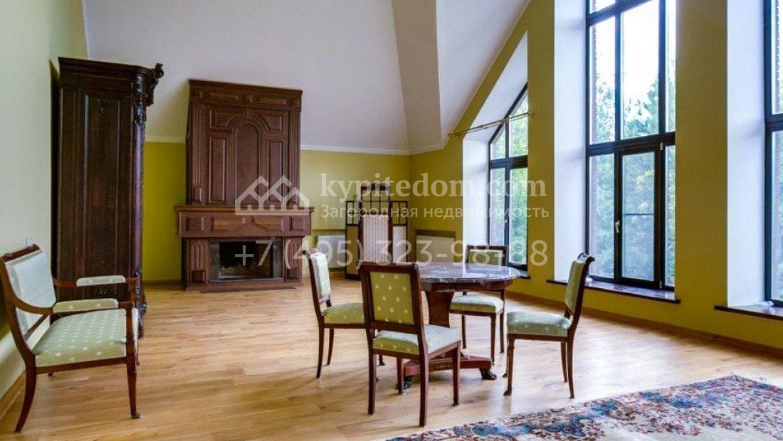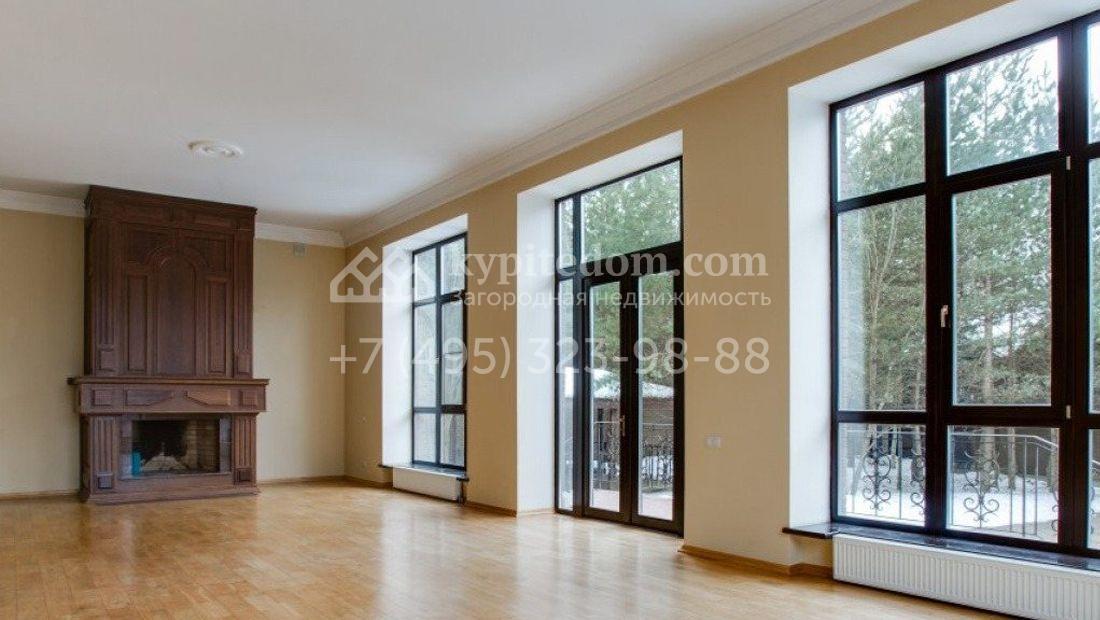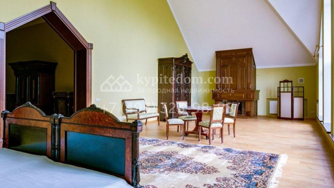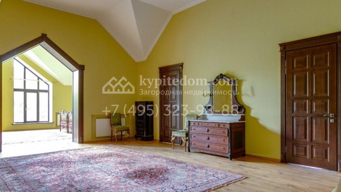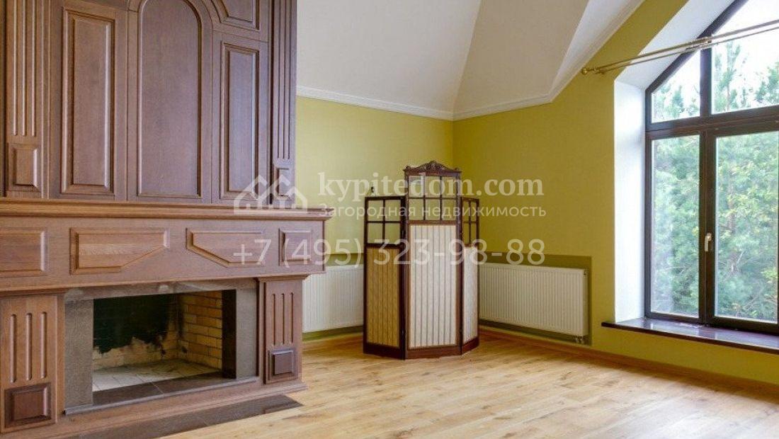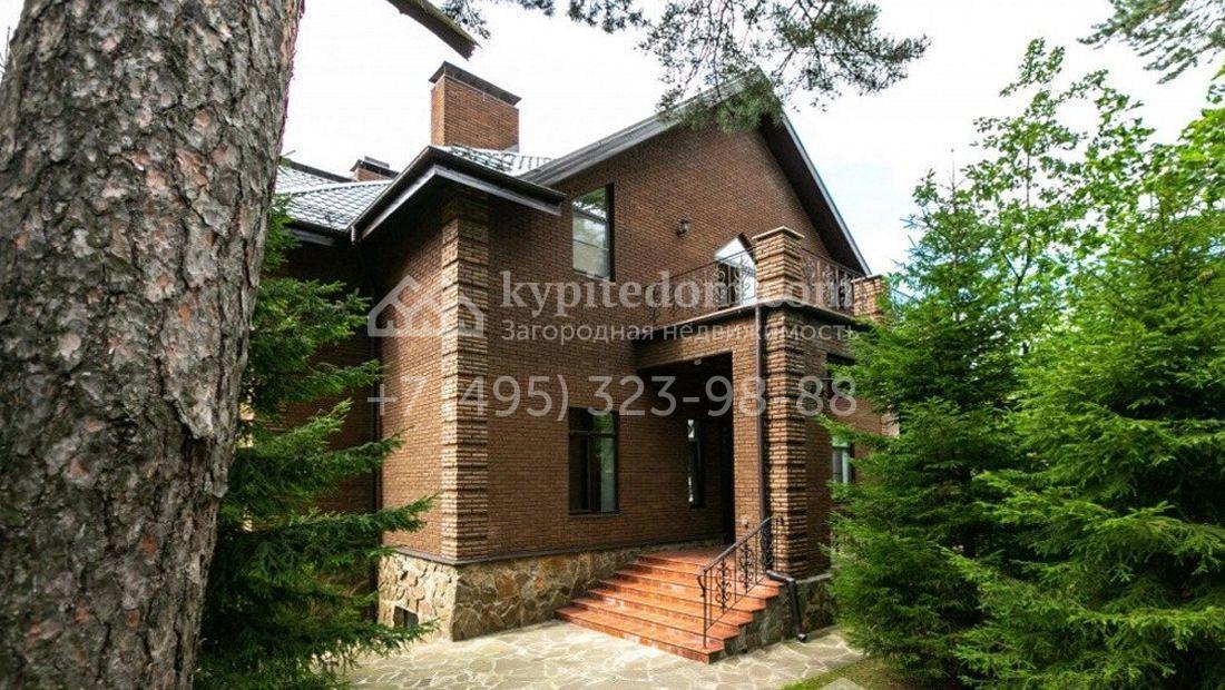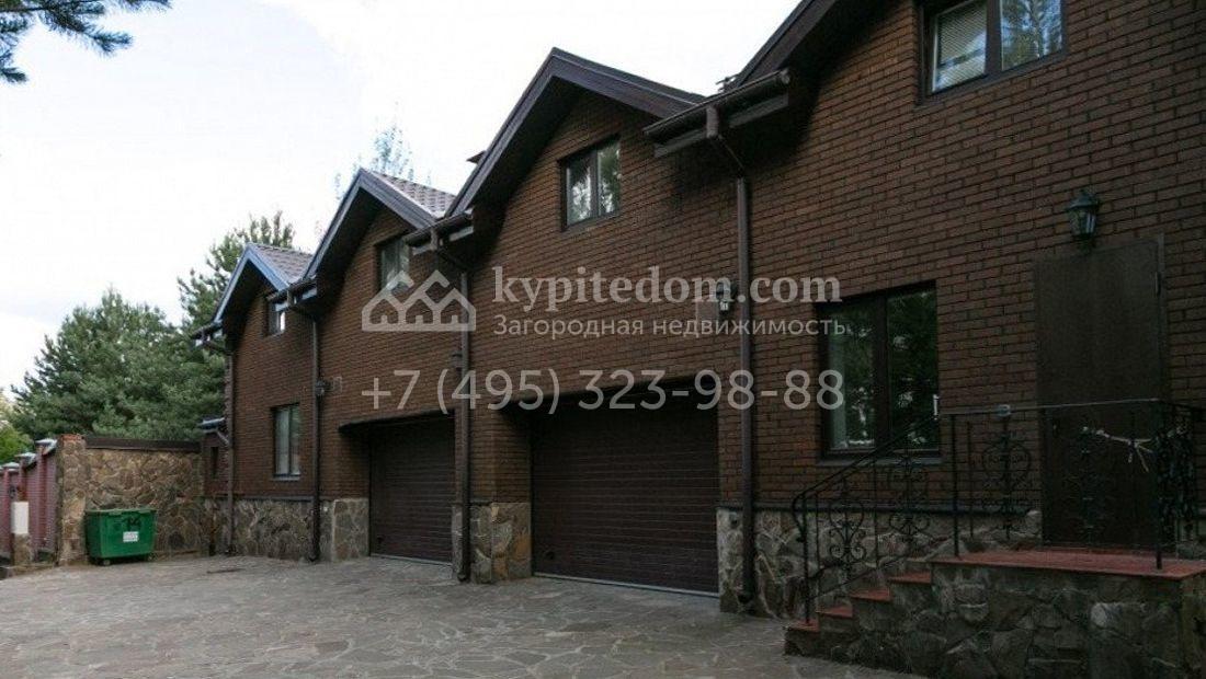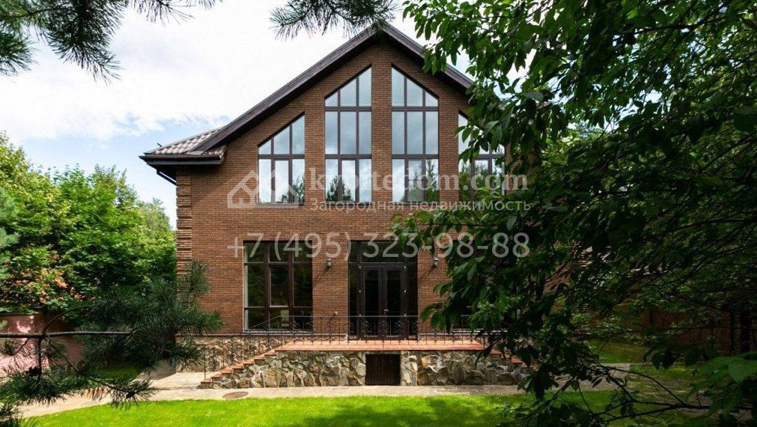 Дом 980 м² в современном английском стиле построен на участке 20 соток около соснового леса. Лаконичный фасад с большими мансардными окнами облицован клинкерным кирпичом с имитацией рустовки, цоколь облицован натуральным камнем. Со стороны дороги в дом встроен гараж для 2 машин. На нижнем уровне дома расположена СПА-зона с бассейном и сауной. Первый этаж занимает кухня с фасадом без встроенной техники, столовая с выходом на террасу, каминный зал и спальня. На втором этаже в одной из спален установлен камин с панелями из темного дерева. Современный интерьер дома дополнен английской резной антикварной мебелью. На участке дорожки вымощены сланцем, постелен газон, посажены хвойные деревья.