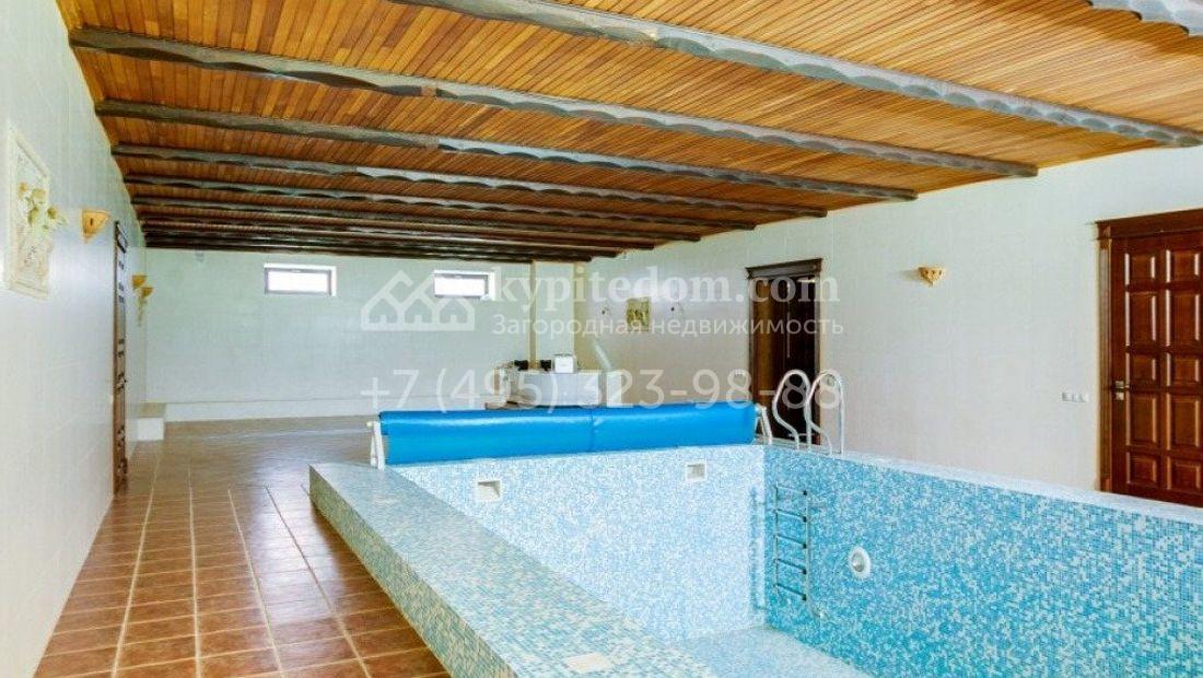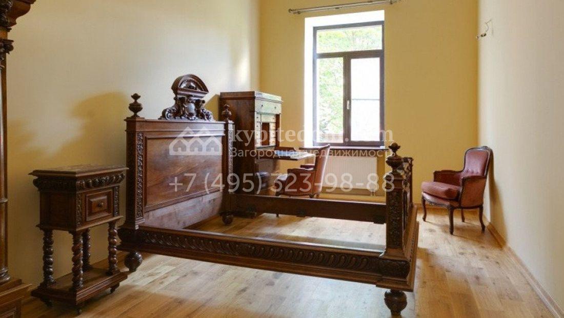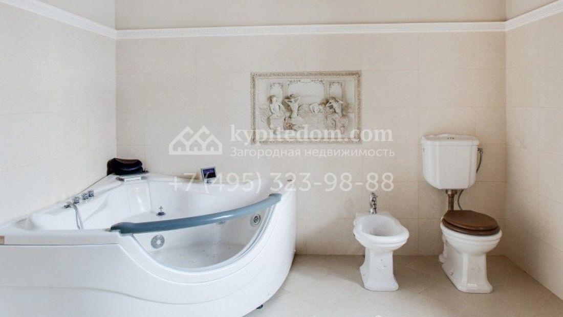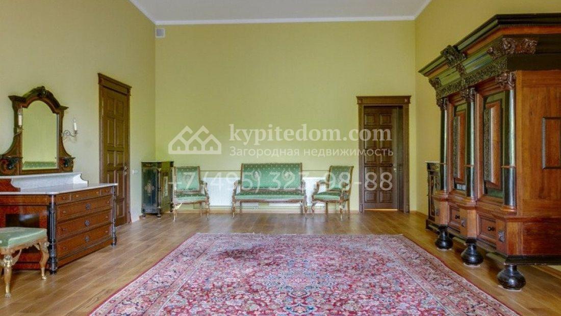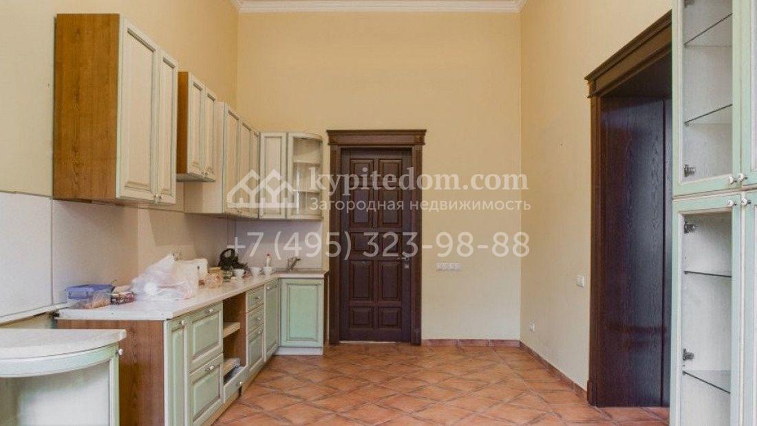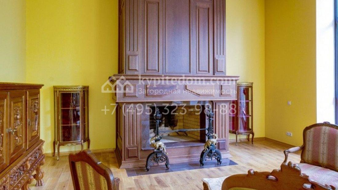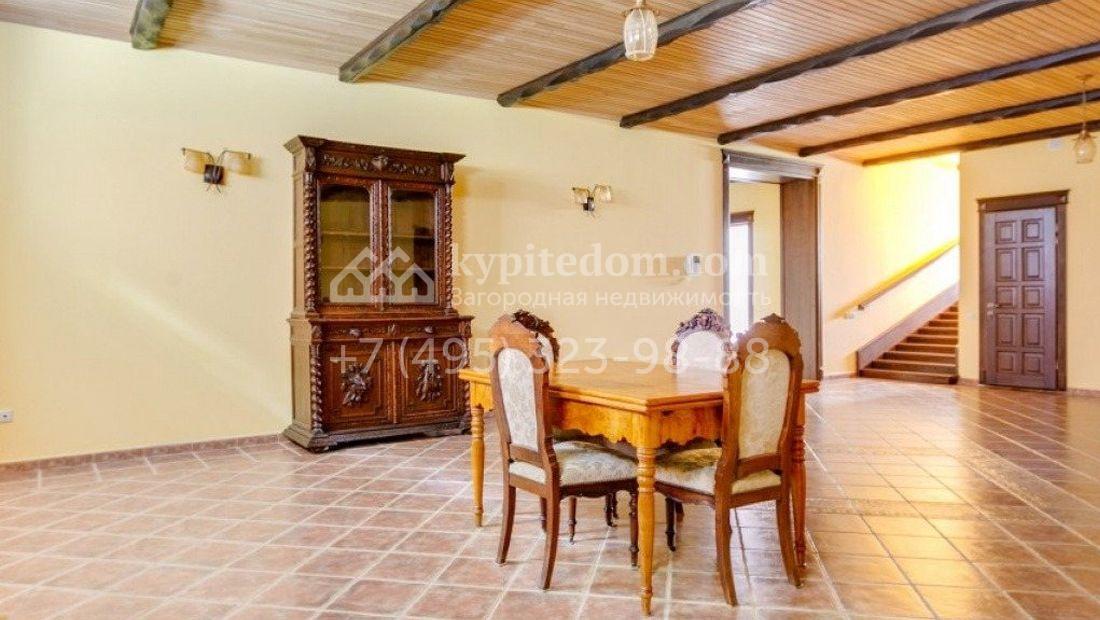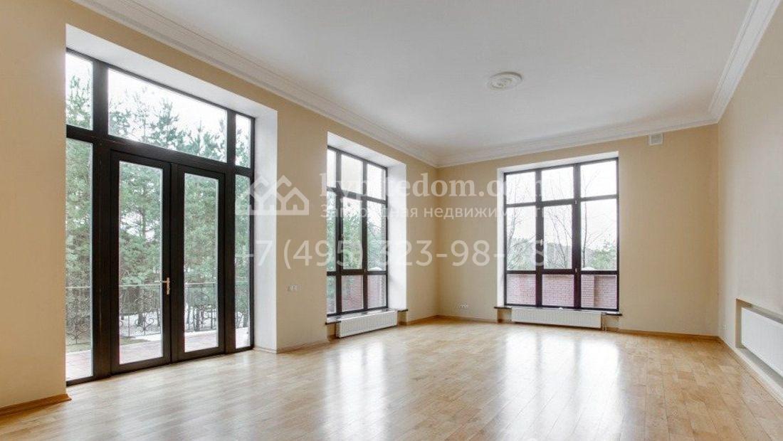Дом 980 м² в современном английском стиле построен на участке 20 соток около соснового леса. Лаконичный фасад с большими мансардными окнами облицован клинкерным кирпичом с имитацией рустовки, цоколь облицован натуральным камнем. Со стороны дороги в дом встроен гараж для 2 машин. На нижнем уровне дома расположена СПА-зона с бассейном и сауной. Первый этаж занимает кухня с фасадом без встроенной техники, столовая с выходом на террасу, каминный зал и спальня. На втором этаже в одной из спален установлен камин с панелями из темного дерева. Современный интерьер дома дополнен английской резной антикварной мебелью. На участке дорожки вымощены сланцем, постелен газон, посажены хвойные деревья.