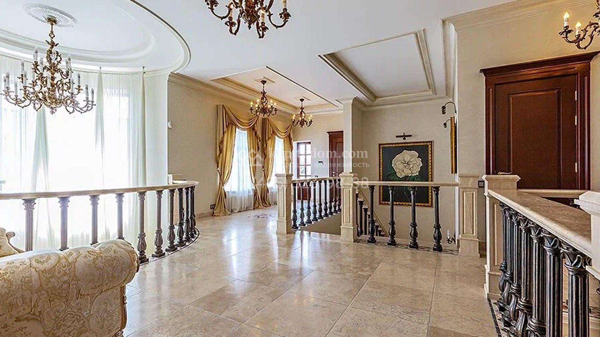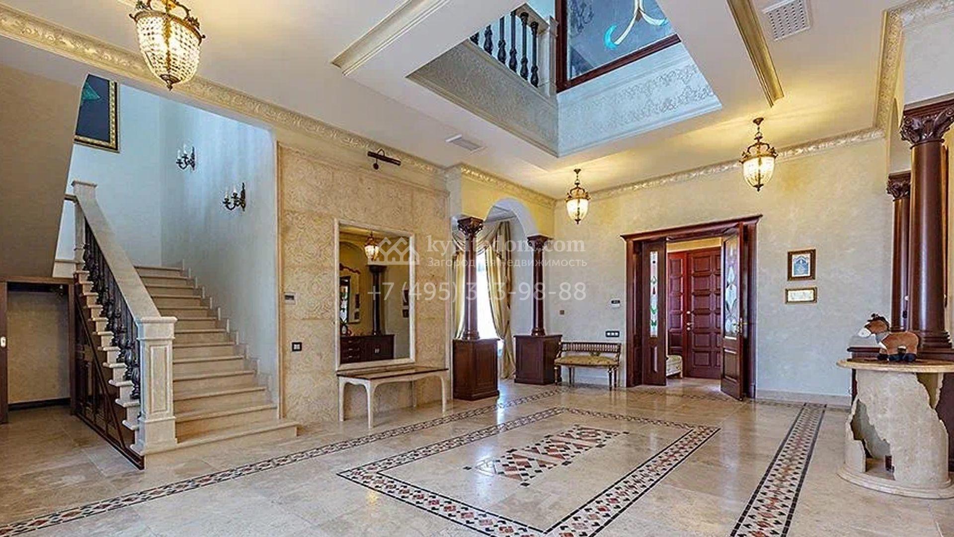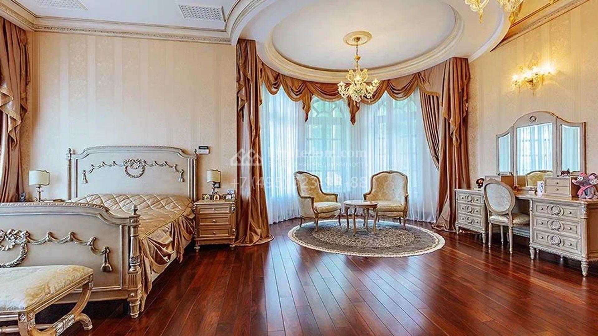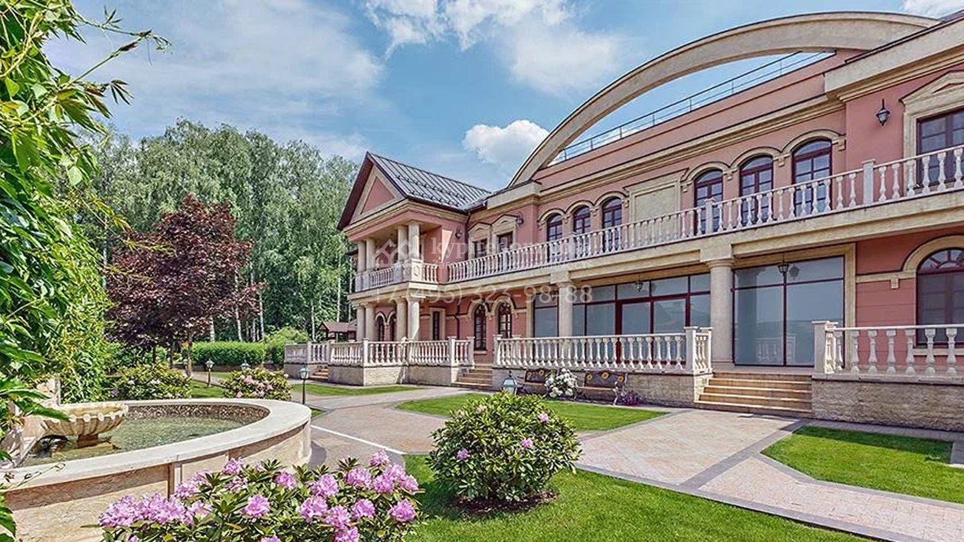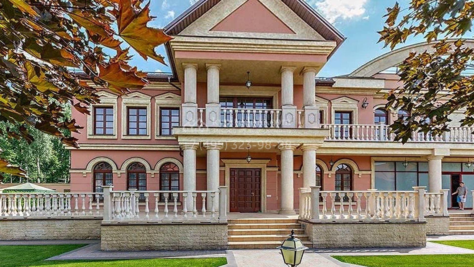 Загородная резиденция в классическом стиле площадью 1 500 м² расположена на лесном участке 25 соток с ландшафтным дизайном. Перед симметричным зданием с массивными колоннами разместили летний фонтан. Дом разделен на два флигеля — хозяйский и гостевой. Флигель хозяев выдержан в классическом стиле с двумя спальнями, кабинетом, двухсветным холлом и меблированной на заказ гостиной. Гостевой флигель в современном стиле — здесь спланированы 3 спальни, кабинет, а также кухня и гостиная.
