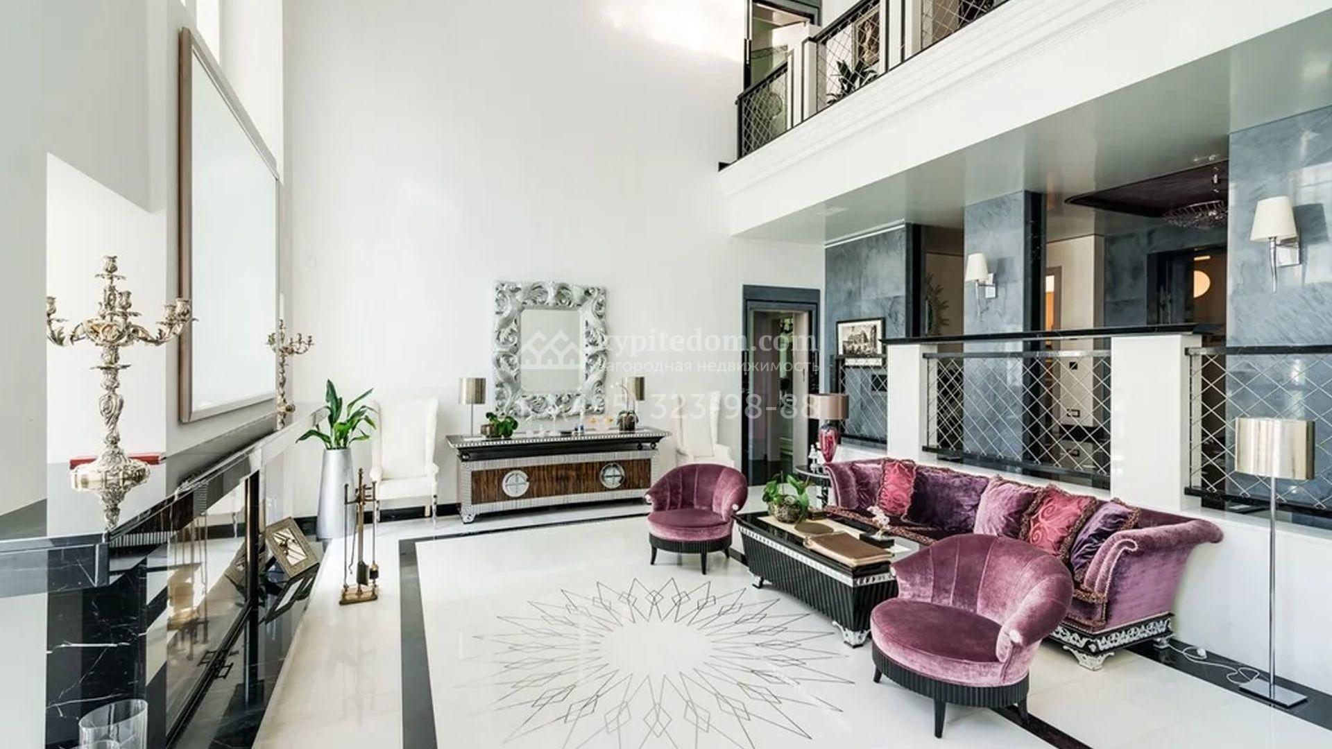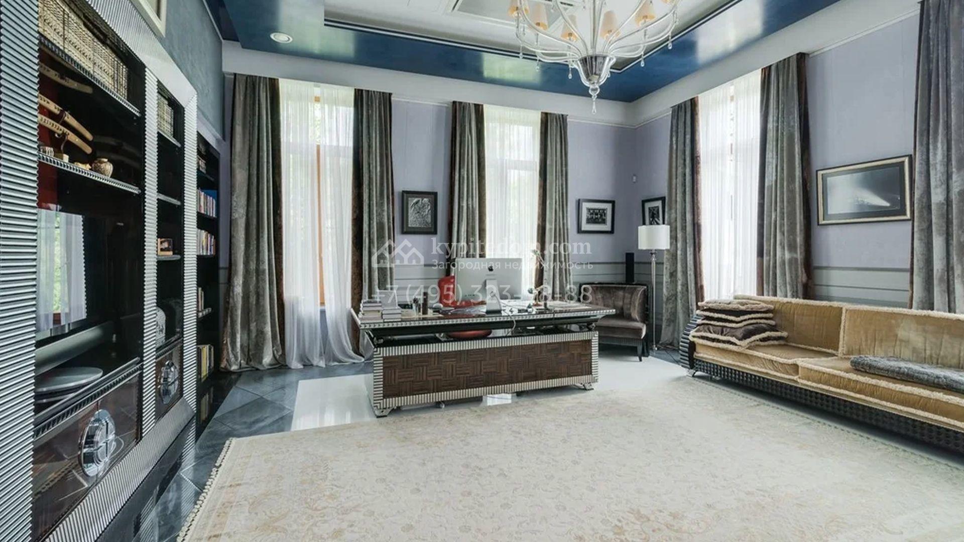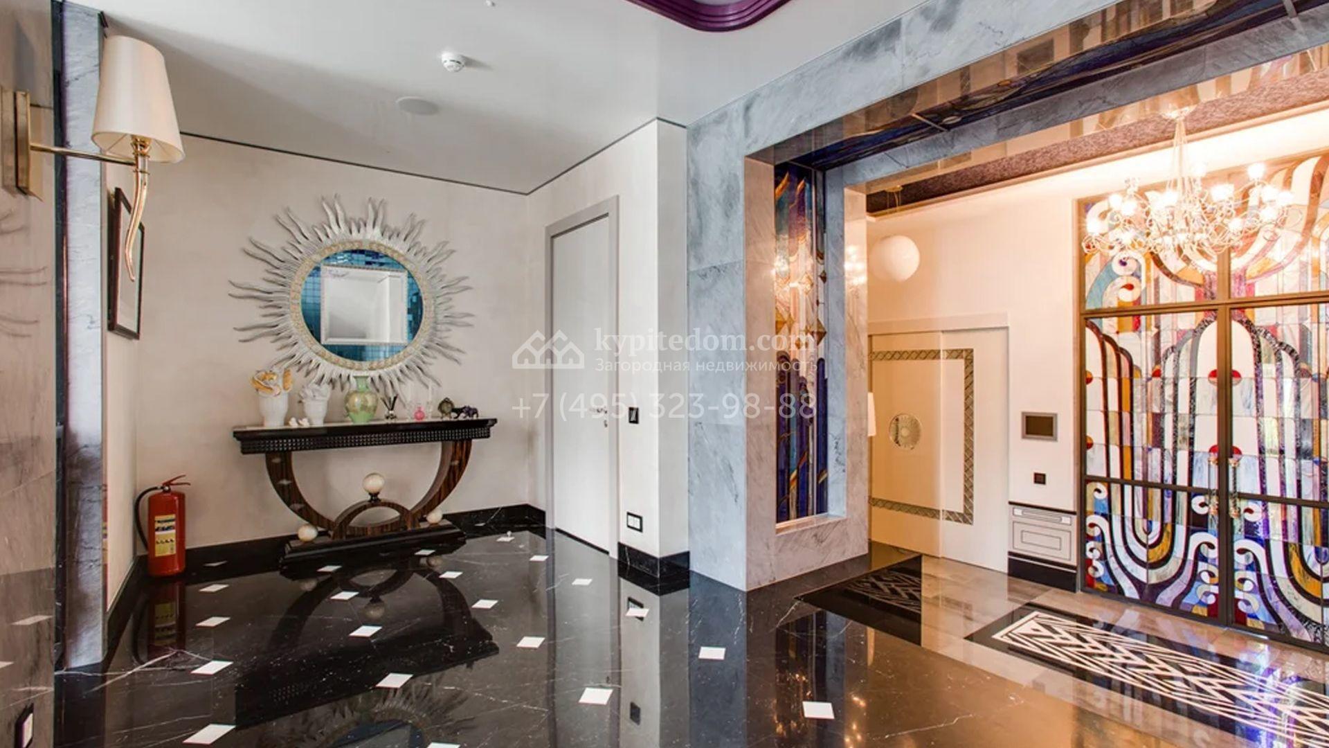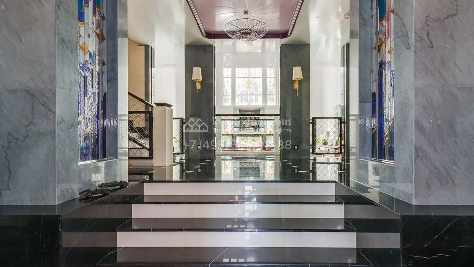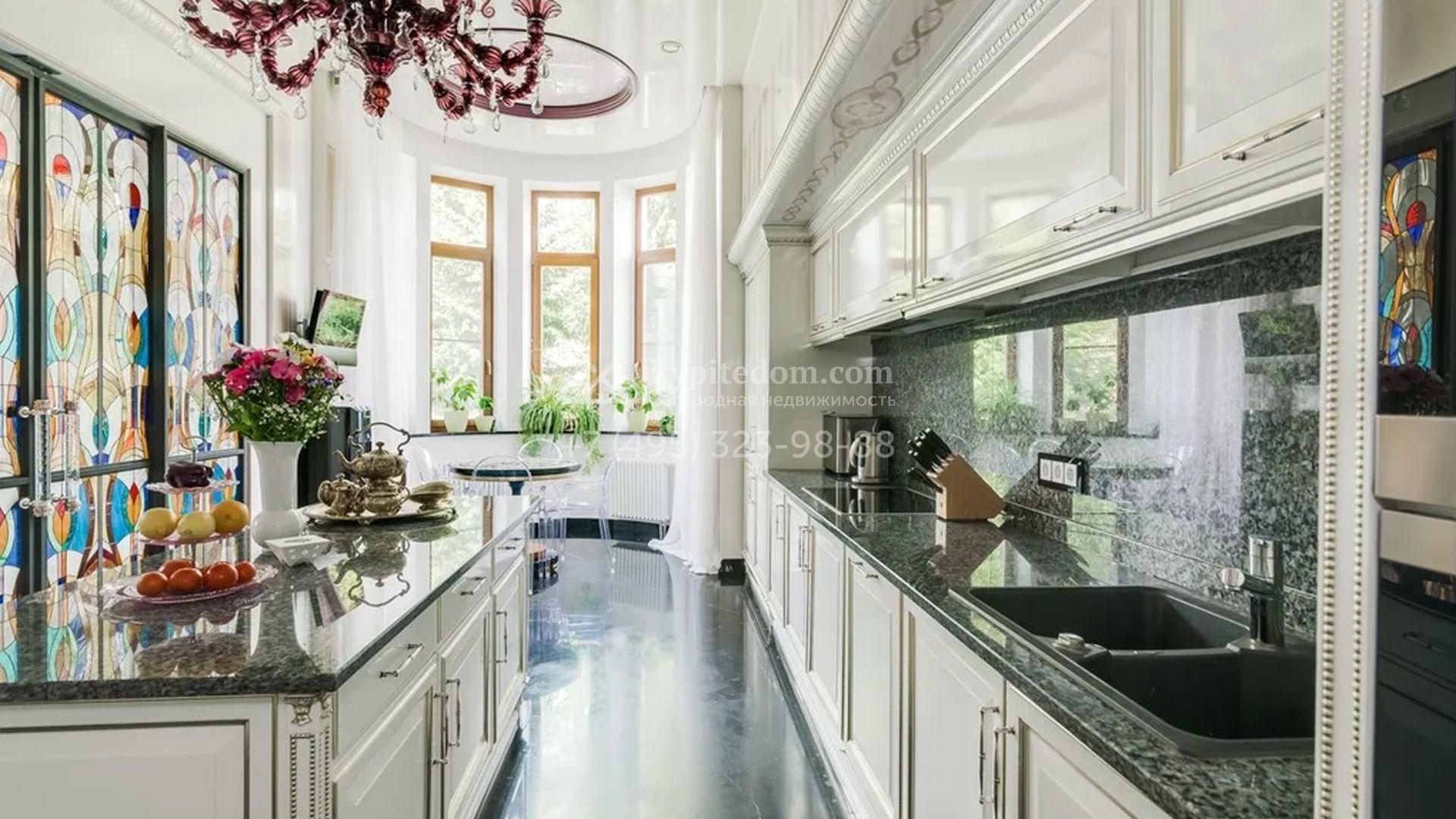 Представительная резиденция в классическом стиле площадью 930 м² расположен на участке 32 сотки с лесными деревьями. Фасад дома украшен античным портиком и колоннами, со стороны участка к дому примыкает остекленный зимний сад. Интерьер резиденции оформлен в неоклассическом стиле с использованием дорогих натуральных материалов. Центр притяжения дома — двухсветная гостиная с бордовой яркой люстрой. Цокольный этаж отведен под SPA-зону с крио-сауной и хамамом, кинозал и блок для персонала. На втором этаже 4 спальни в разных стилях с приватными санузлами и гардеробными комнатами. На участке дорожки вымощены брусчаткой, устроена зона барбекю, проведена подсветка. Перед домом посадили декоративные кустарники и шаровидные клены.