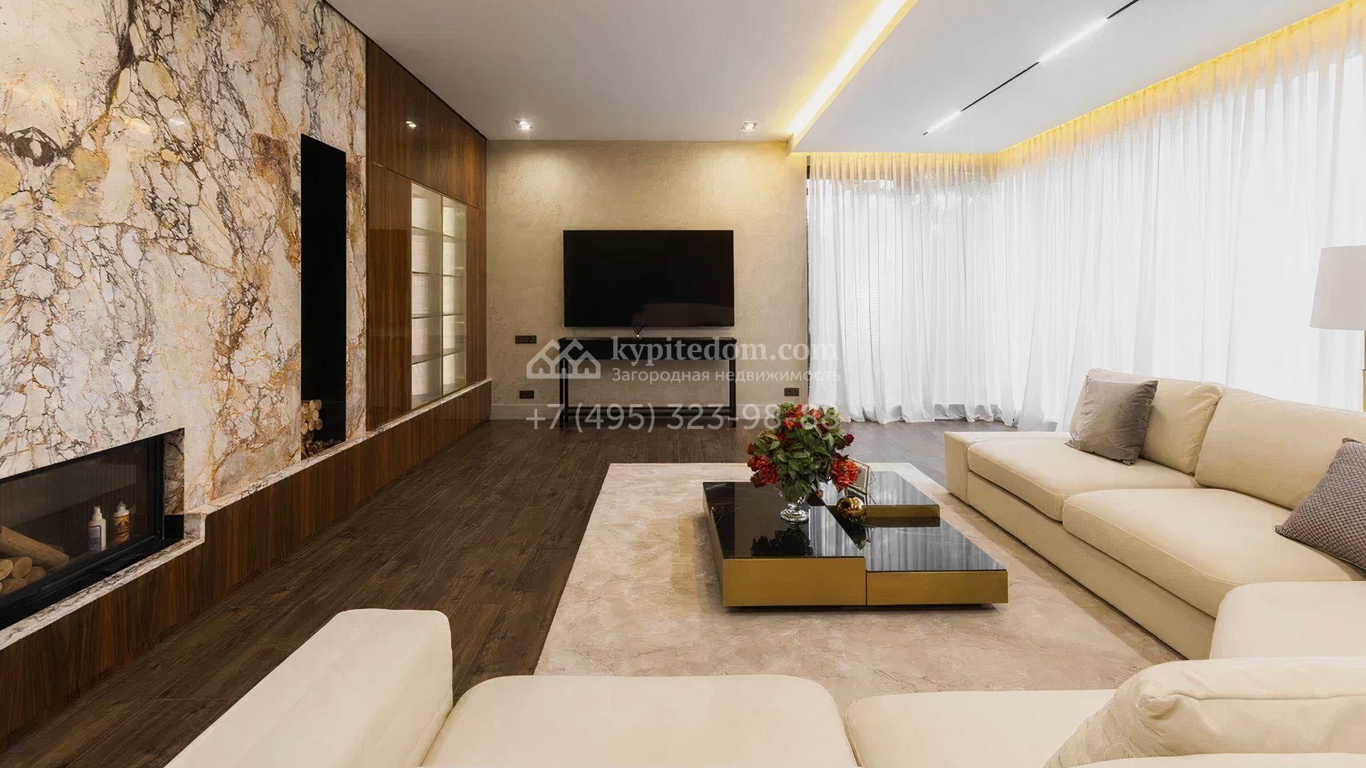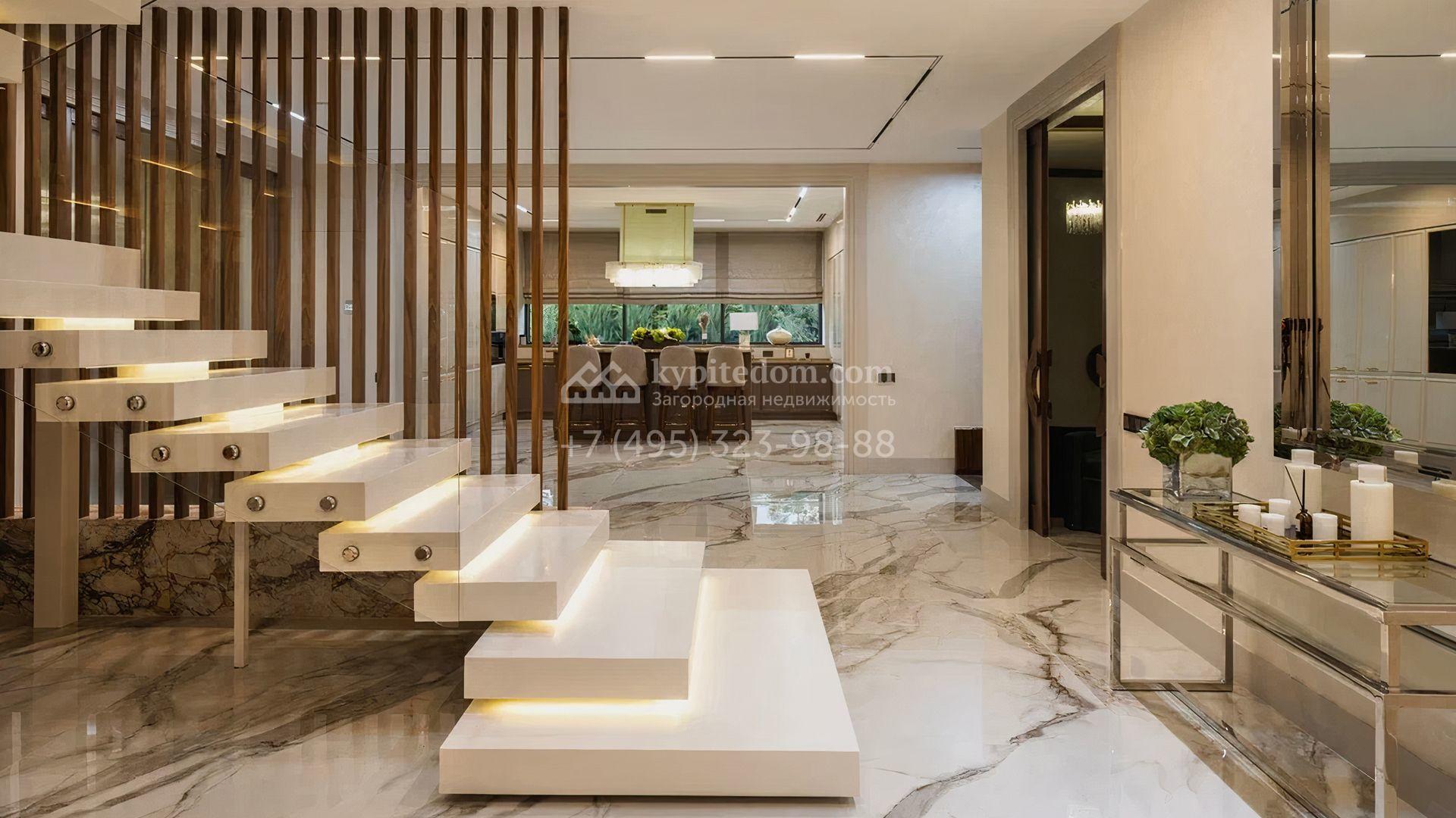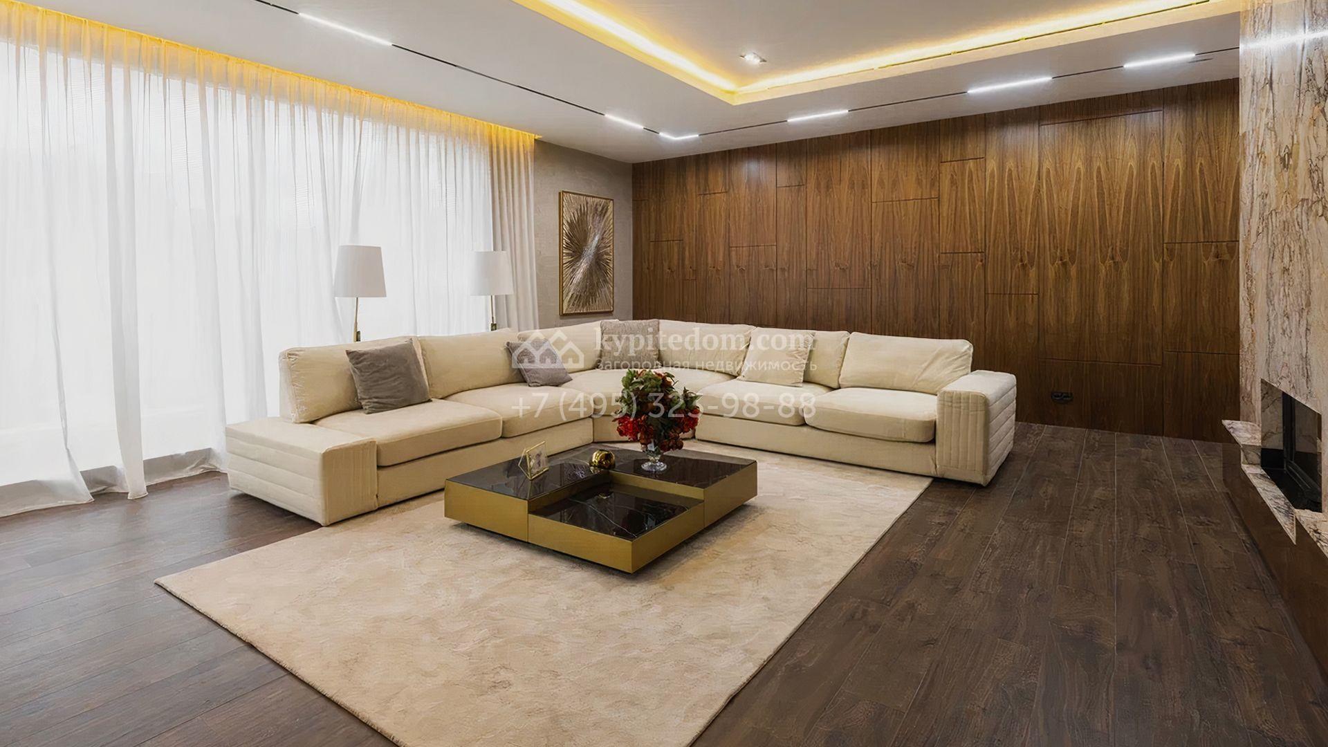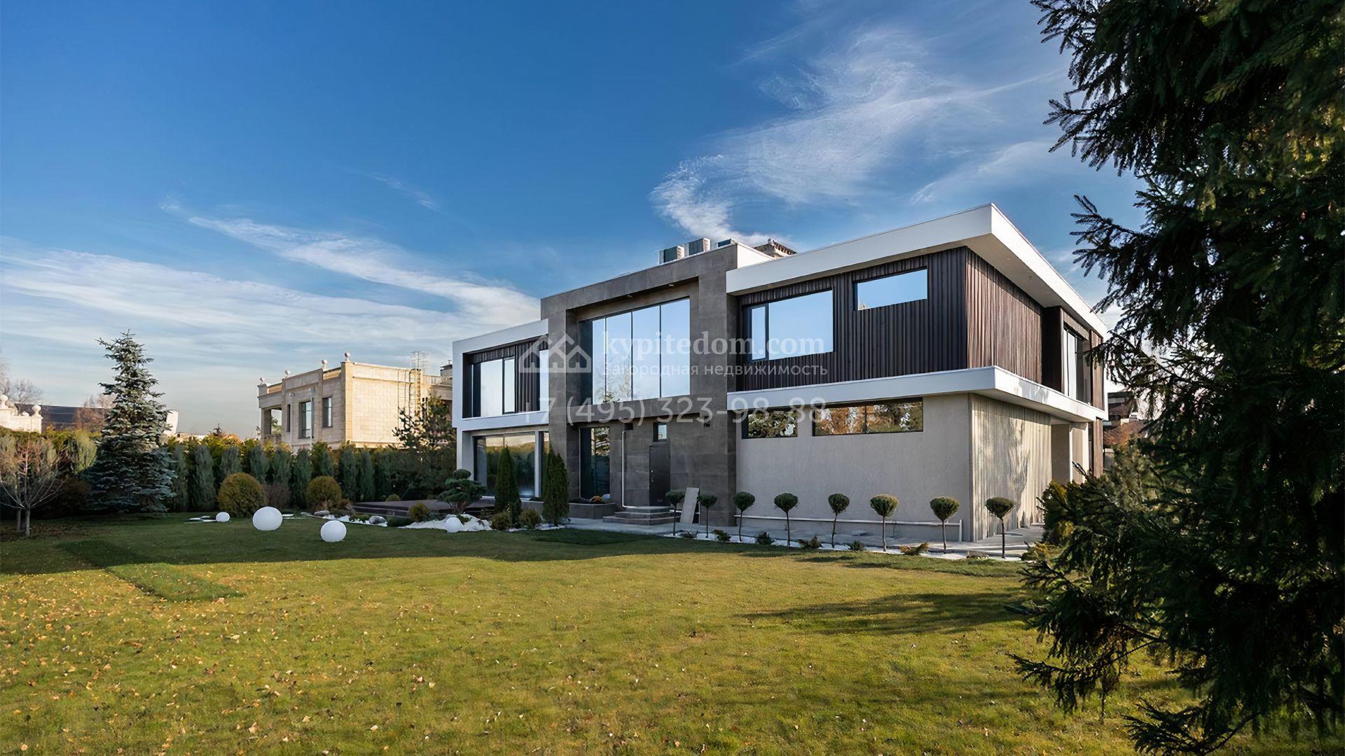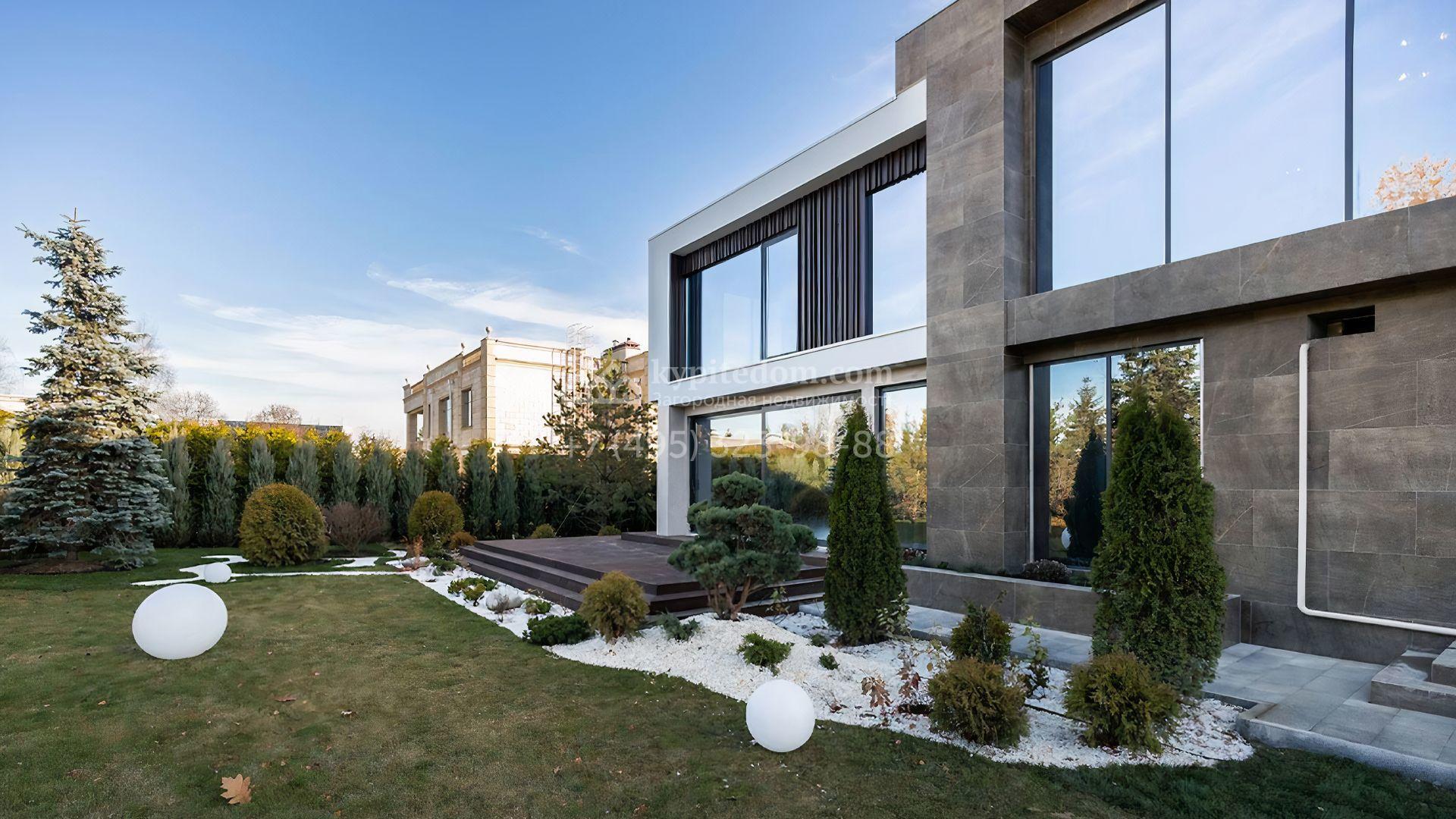 Загородный особняк площадью 856 м² расположен на полевом участке 25 соток. Фасад выполнен в современном стиле, облицован бежевой штукатуркой, серо-коричневым камнем и деревом. Благодаря большой площади остекления пространство наполнено воздухом и светом. В отделке интерьера в светлых оттенках использовались качественные и дорогостоящие материалы, установлена бытовая техника Miele. Планировка дома включает пять спален, гостиную с камином, кухню-столовую с выходом на террасу, кабинет, хаммам и комнату отдыха. Предусмотрен встроенный гараж на две машины. На участке выполнен ландшафтный дизайн, высажены туи, деревья и кустарники.