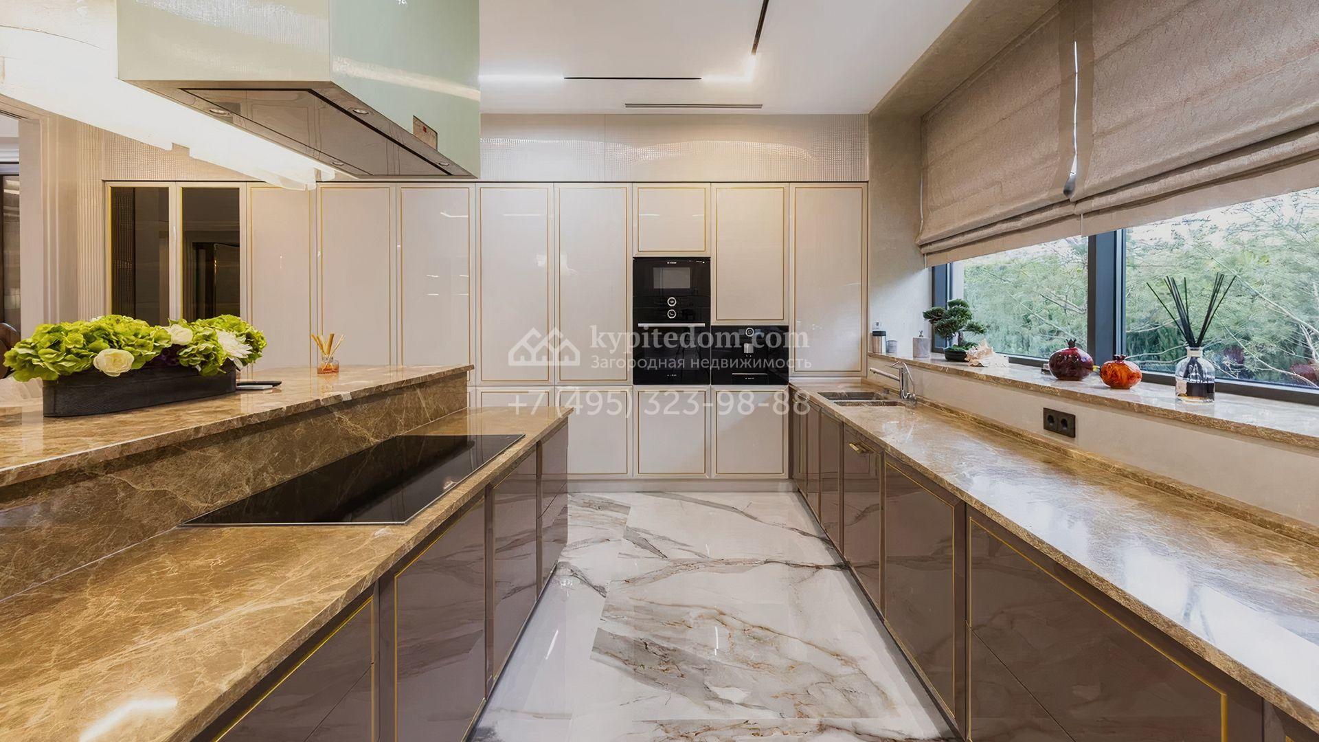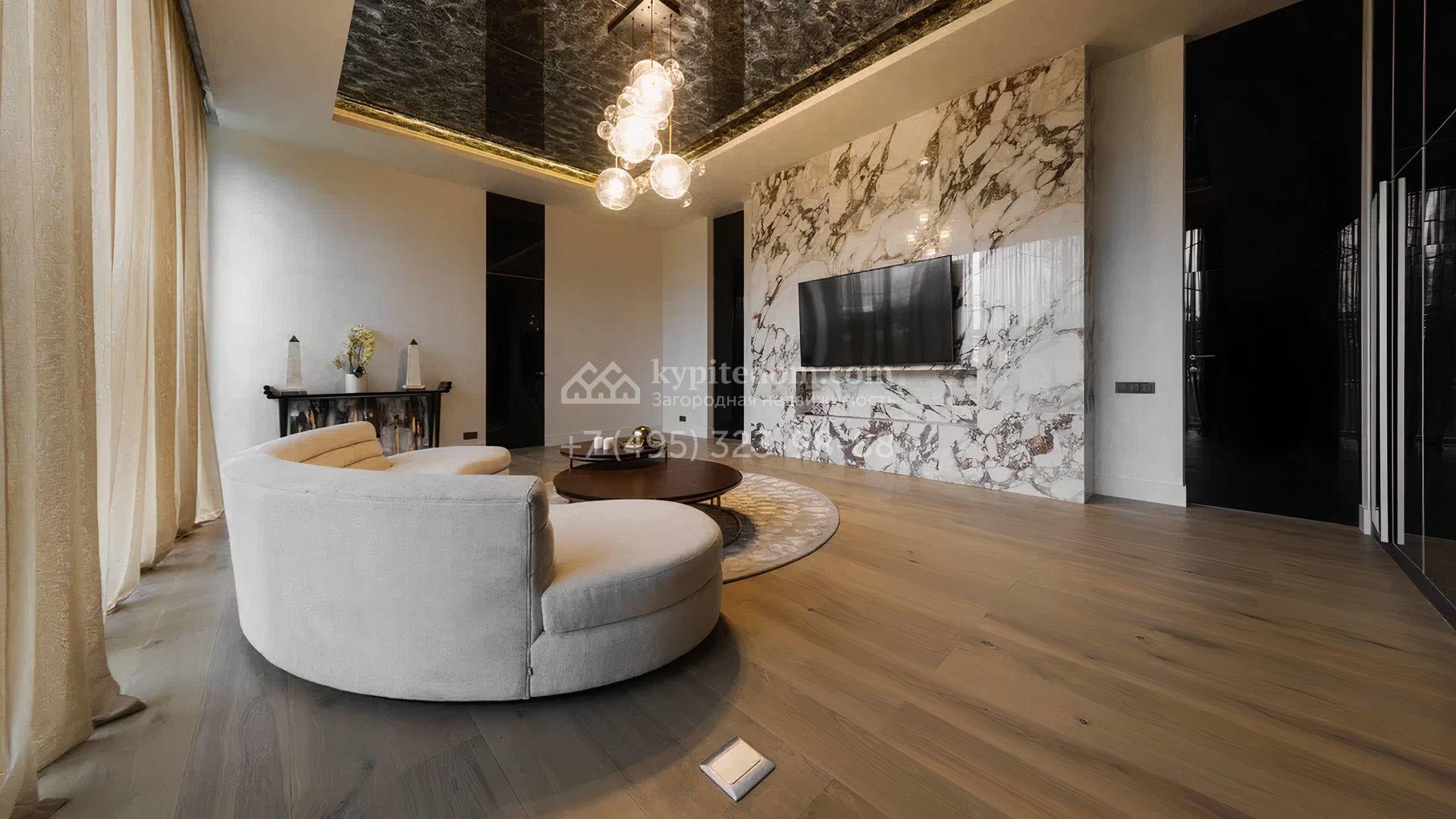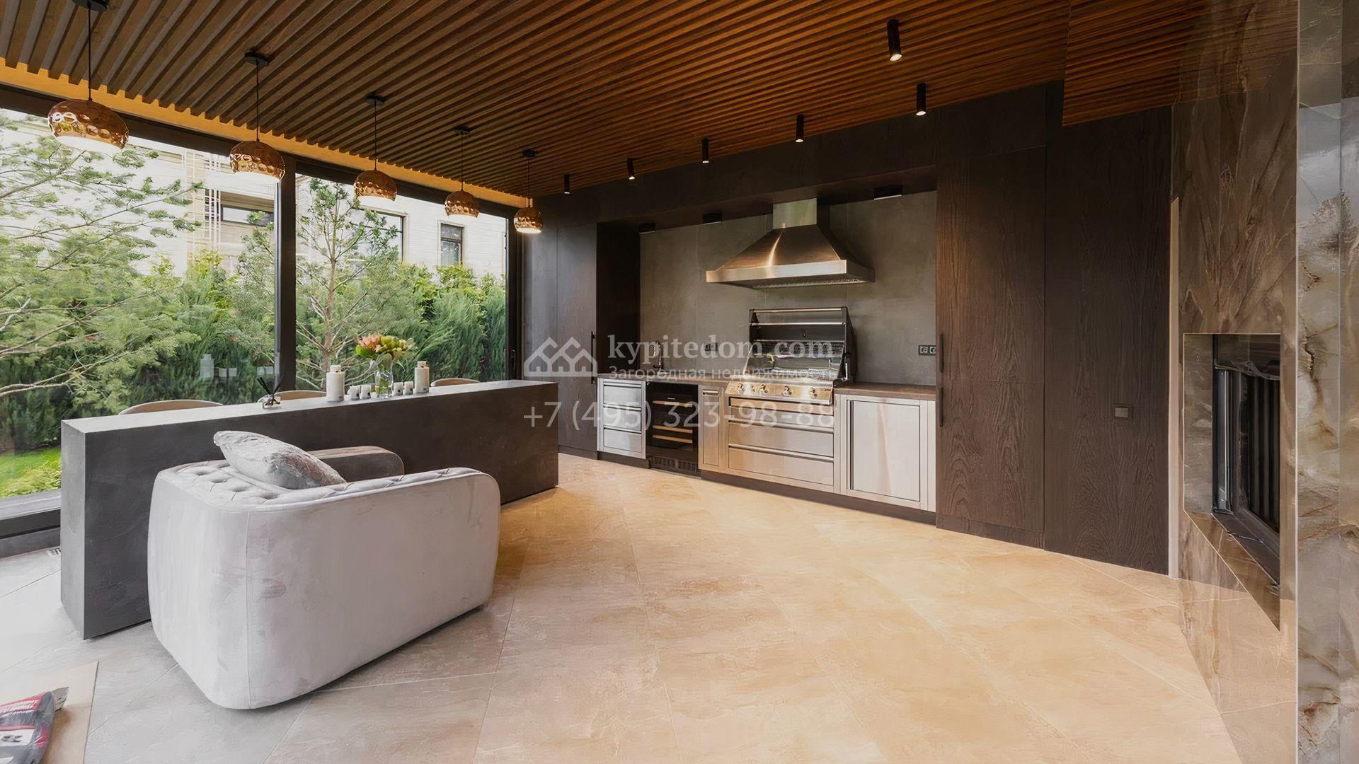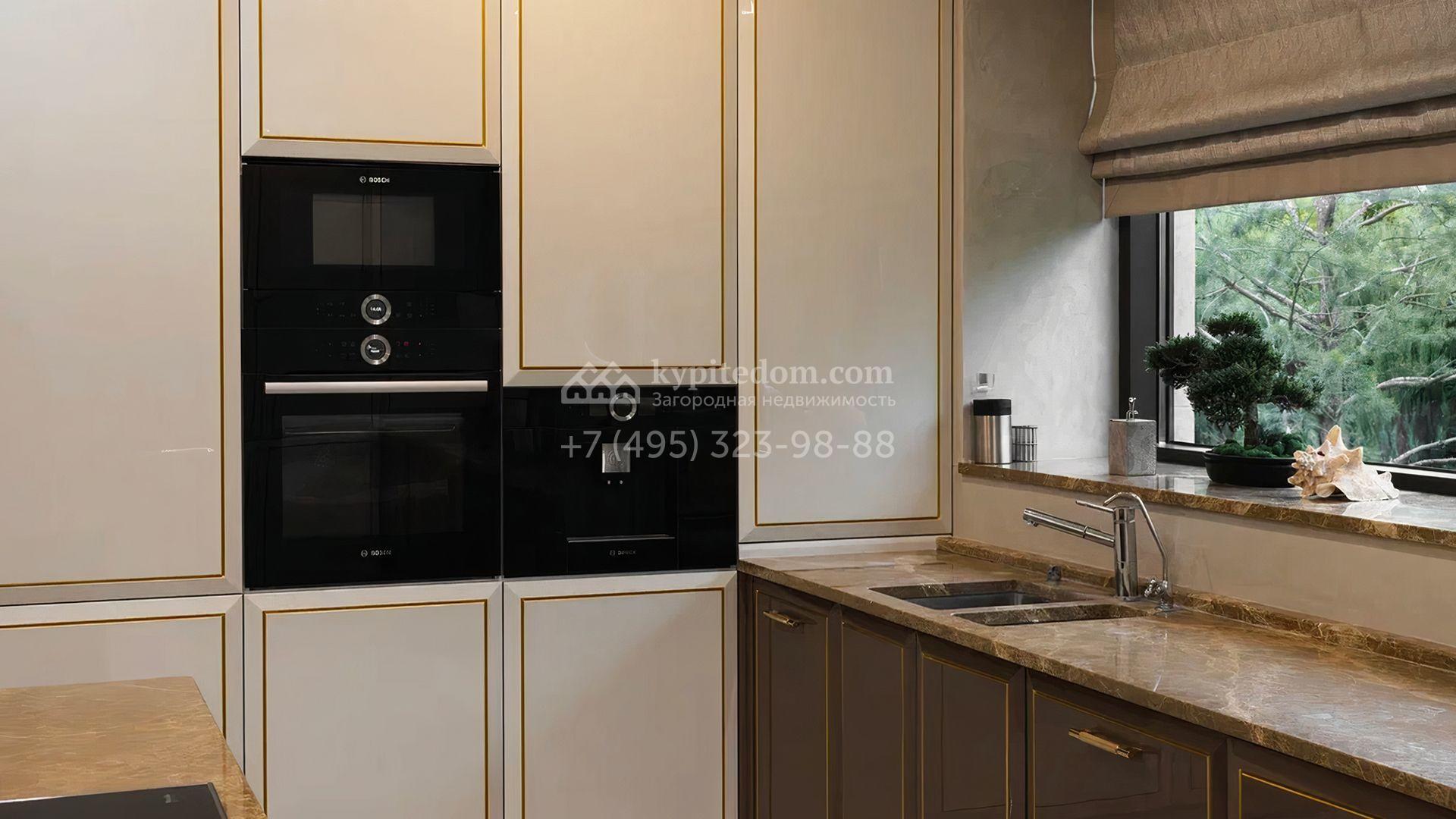 Загородный особняк площадью 856 м² расположен на полевом участке 25 соток. Фасад выполнен в современном стиле, облицован бежевой штукатуркой, серо-коричневым камнем и деревом. Благодаря большой площади остекления пространство наполнено воздухом и светом. В отделке интерьера в светлых оттенках использовались качественные и дорогостоящие материалы, установлена бытовая техника Miele. Планировка дома включает пять спален, гостиную с камином, кухню-столовую с выходом на террасу, кабинет, хаммам и комнату отдыха. Предусмотрен встроенный гараж на две машины. На участке выполнен ландшафтный дизайн, высажены туи, деревья и кустарники.
