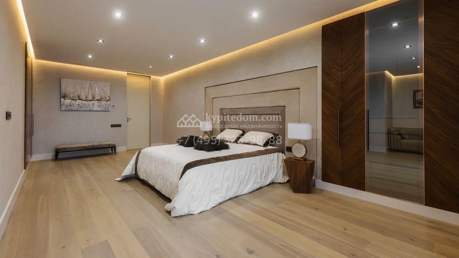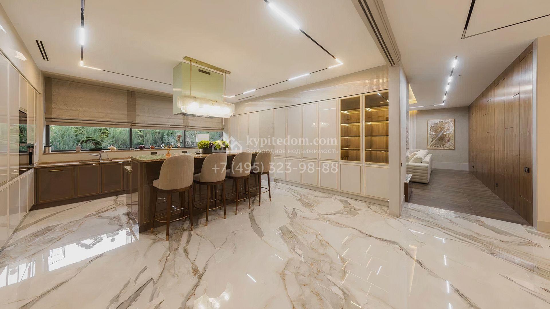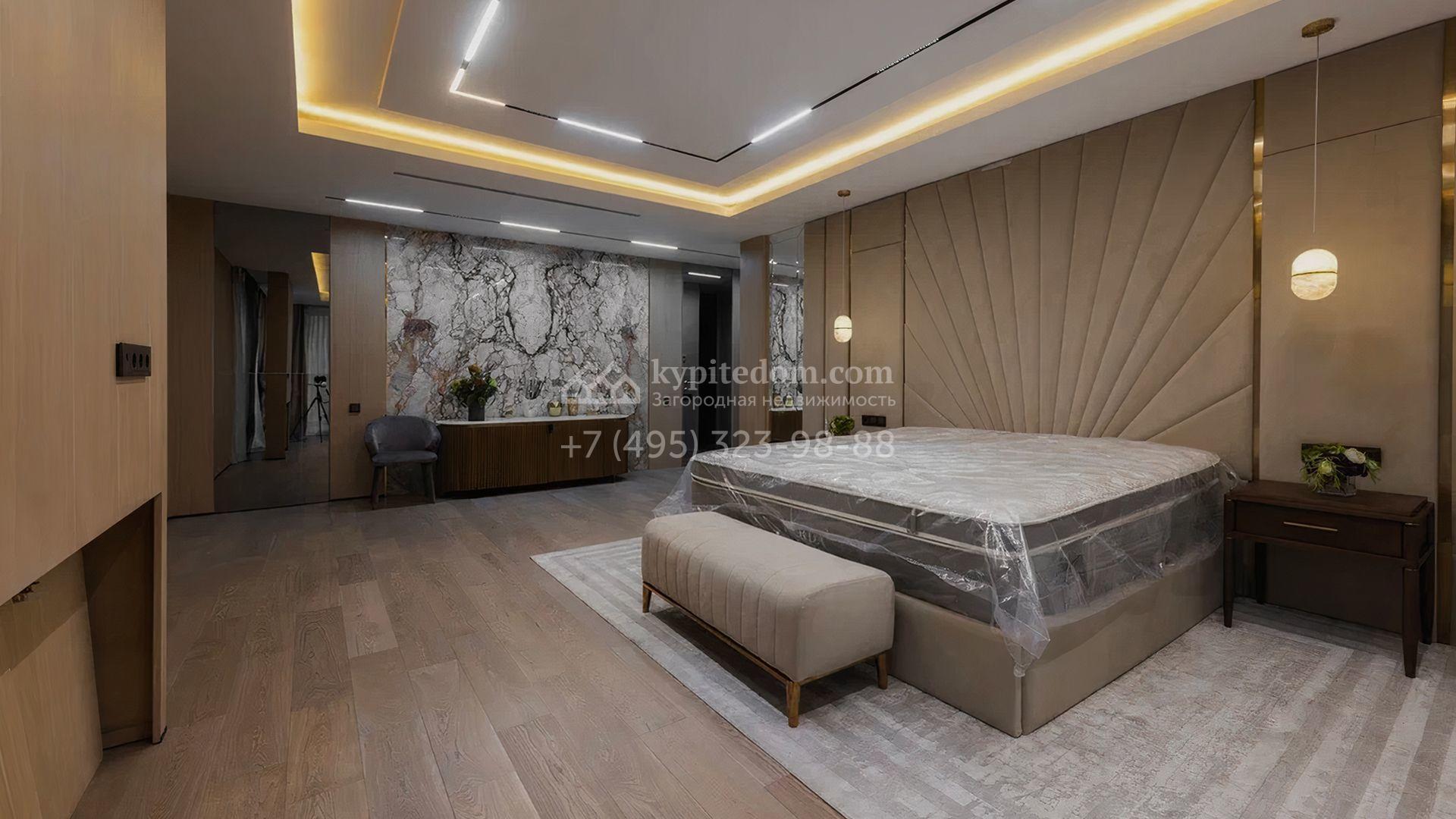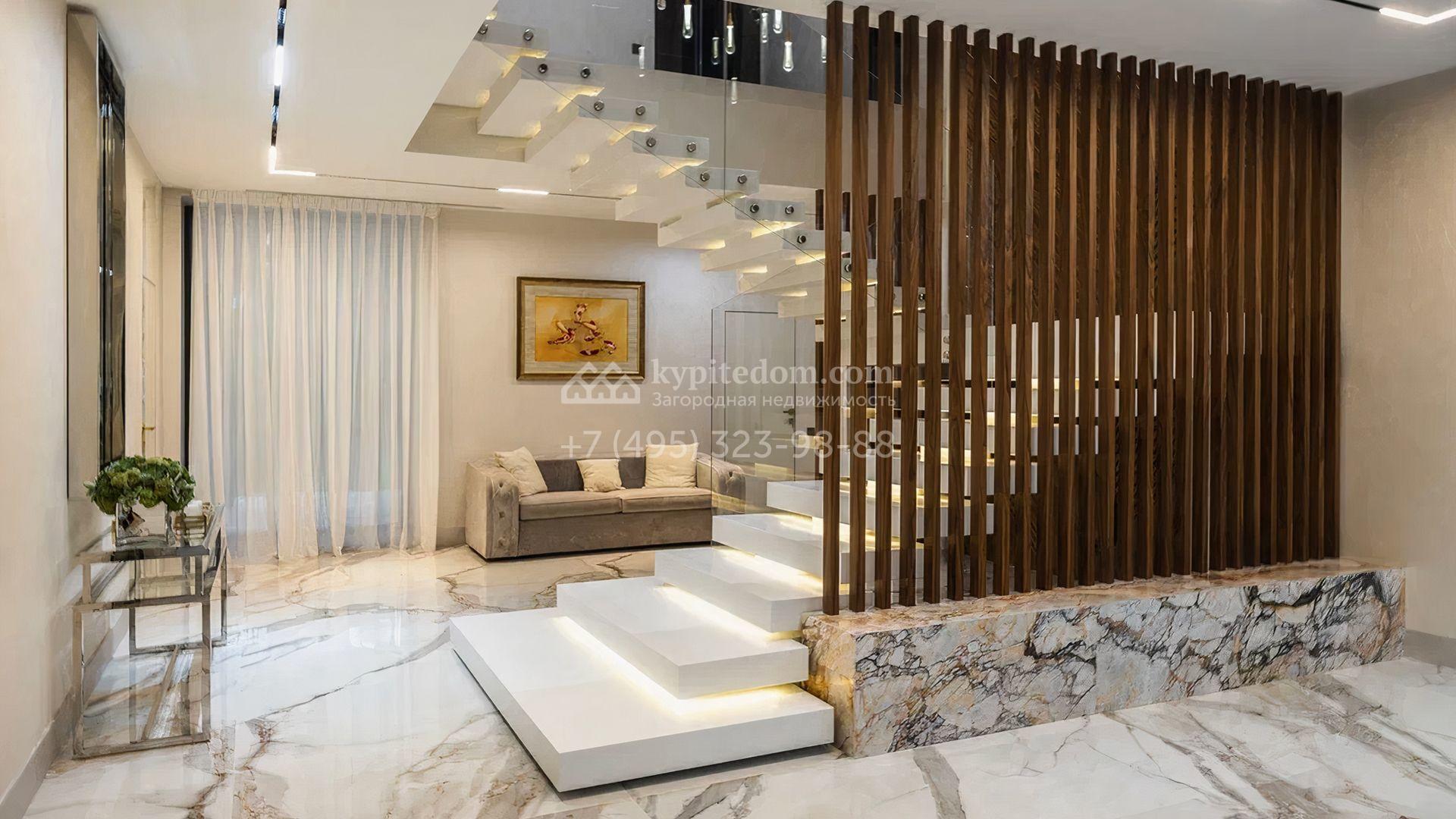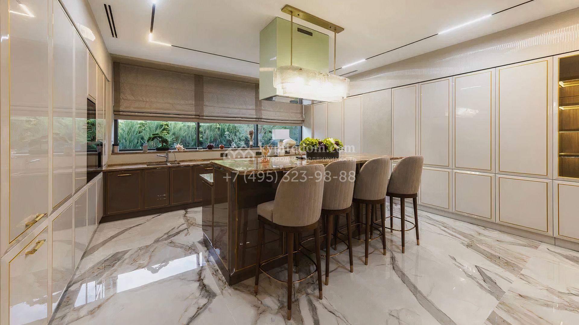 Загородный особняк площадью 856 м² расположен на полевом участке 25 соток. Фасад выполнен в современном стиле, облицован бежевой штукатуркой, серо-коричневым камнем и деревом. Благодаря большой площади остекления пространство наполнено воздухом и светом. В отделке интерьера в светлых оттенках использовались качественные и дорогостоящие материалы, установлена бытовая техника Miele. Планировка дома включает пять спален, гостиную с камином, кухню-столовую с выходом на террасу, кабинет, хаммам и комнату отдыха. Предусмотрен встроенный гараж на две машины. На участке выполнен ландшафтный дизайн, высажены туи, деревья и кустарники.