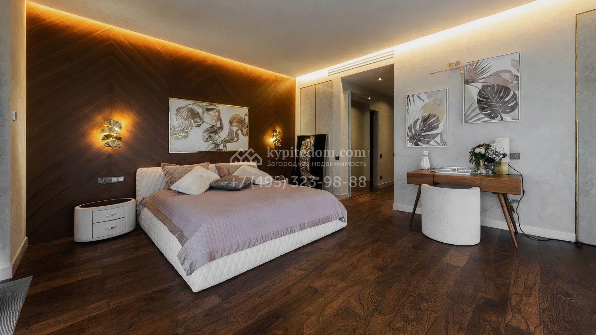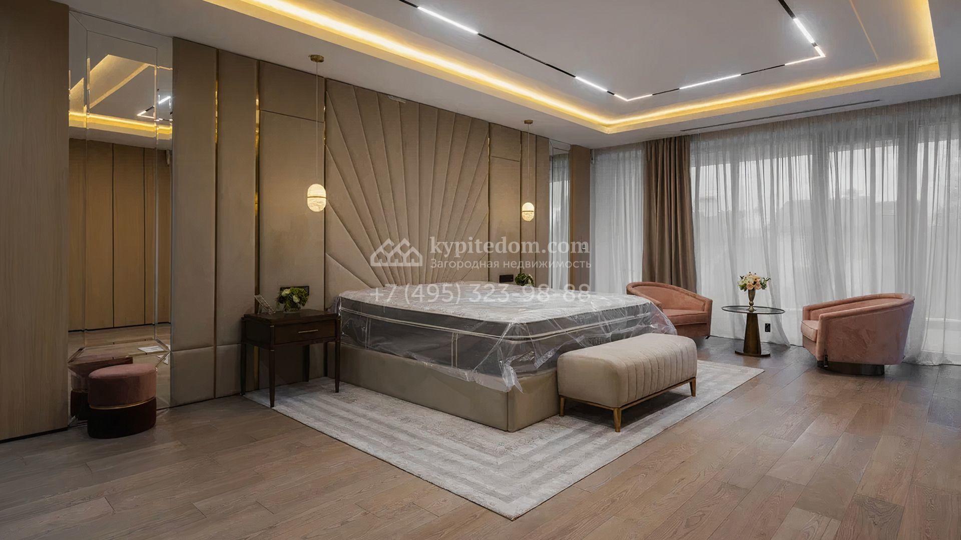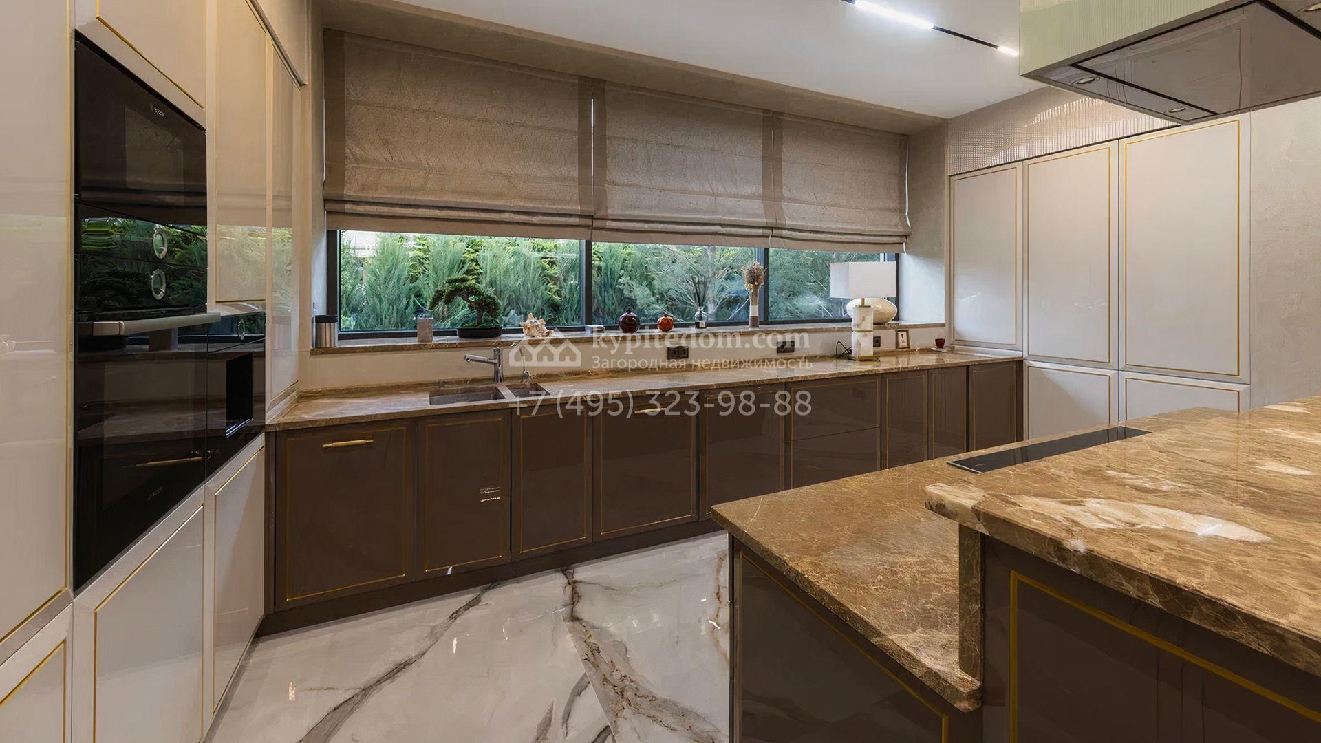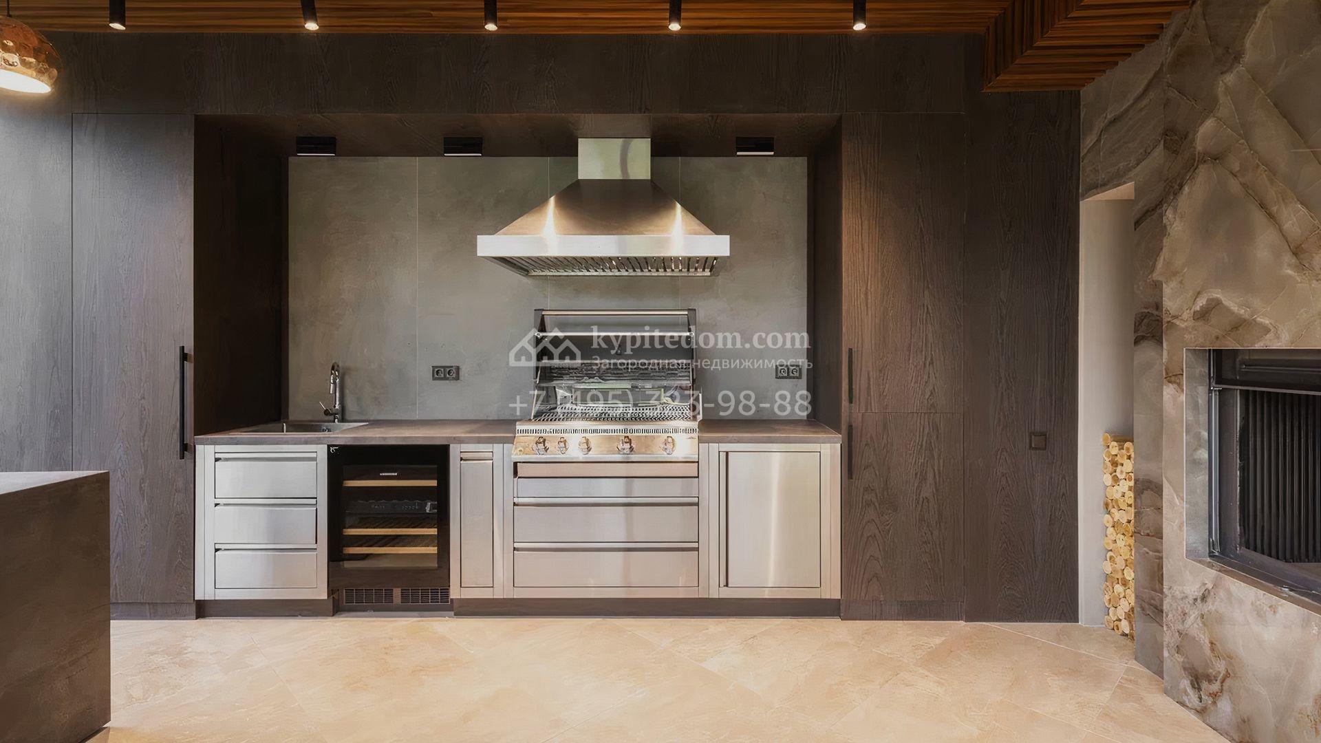 Загородный особняк площадью 856 м² расположен на полевом участке 25 соток. Фасад выполнен в современном стиле, облицован бежевой штукатуркой, серо-коричневым камнем и деревом. Благодаря большой площади остекления пространство наполнено воздухом и светом. В отделке интерьера в светлых оттенках использовались качественные и дорогостоящие материалы, установлена бытовая техника Miele. Планировка дома включает пять спален, гостиную с камином, кухню-столовую с выходом на террасу, кабинет, хаммам и комнату отдыха. Предусмотрен встроенный гараж на две машины. На участке выполнен ландшафтный дизайн, высажены туи, деревья и кустарники.