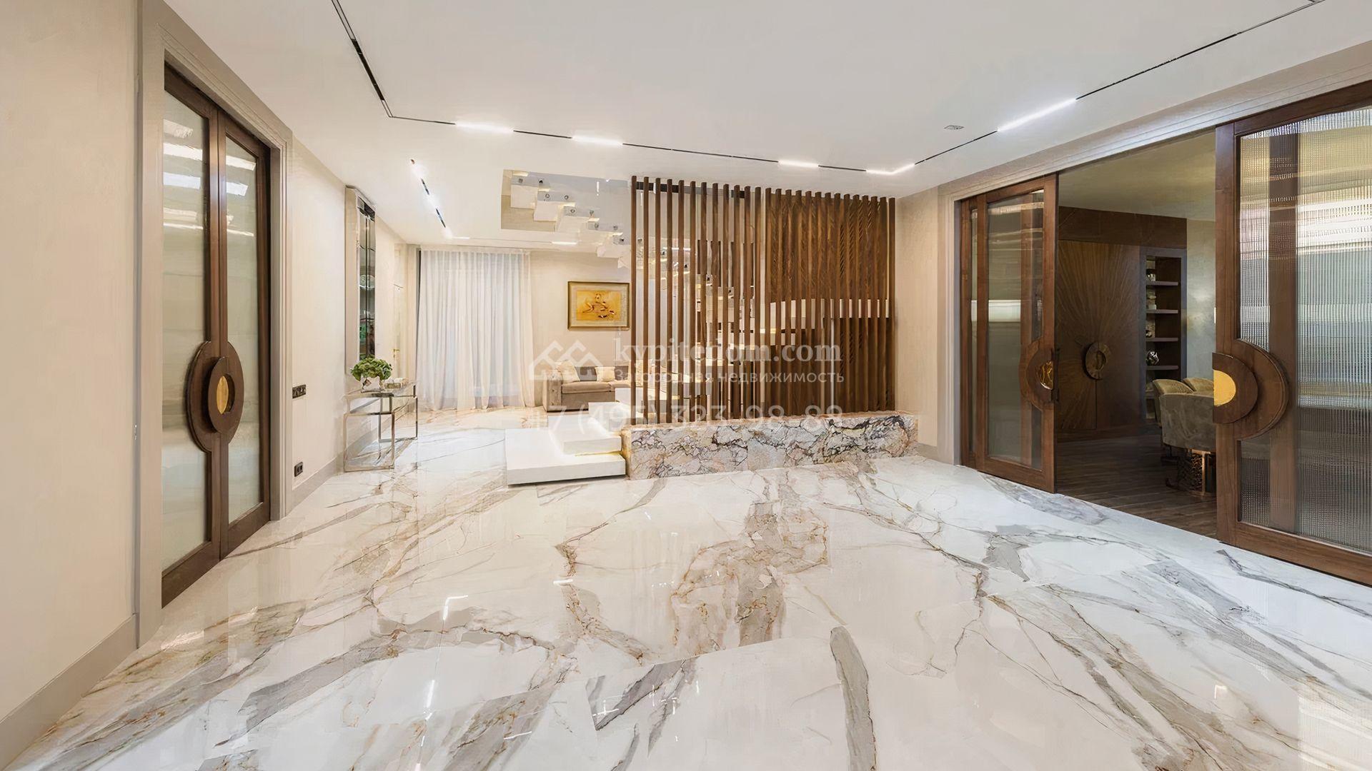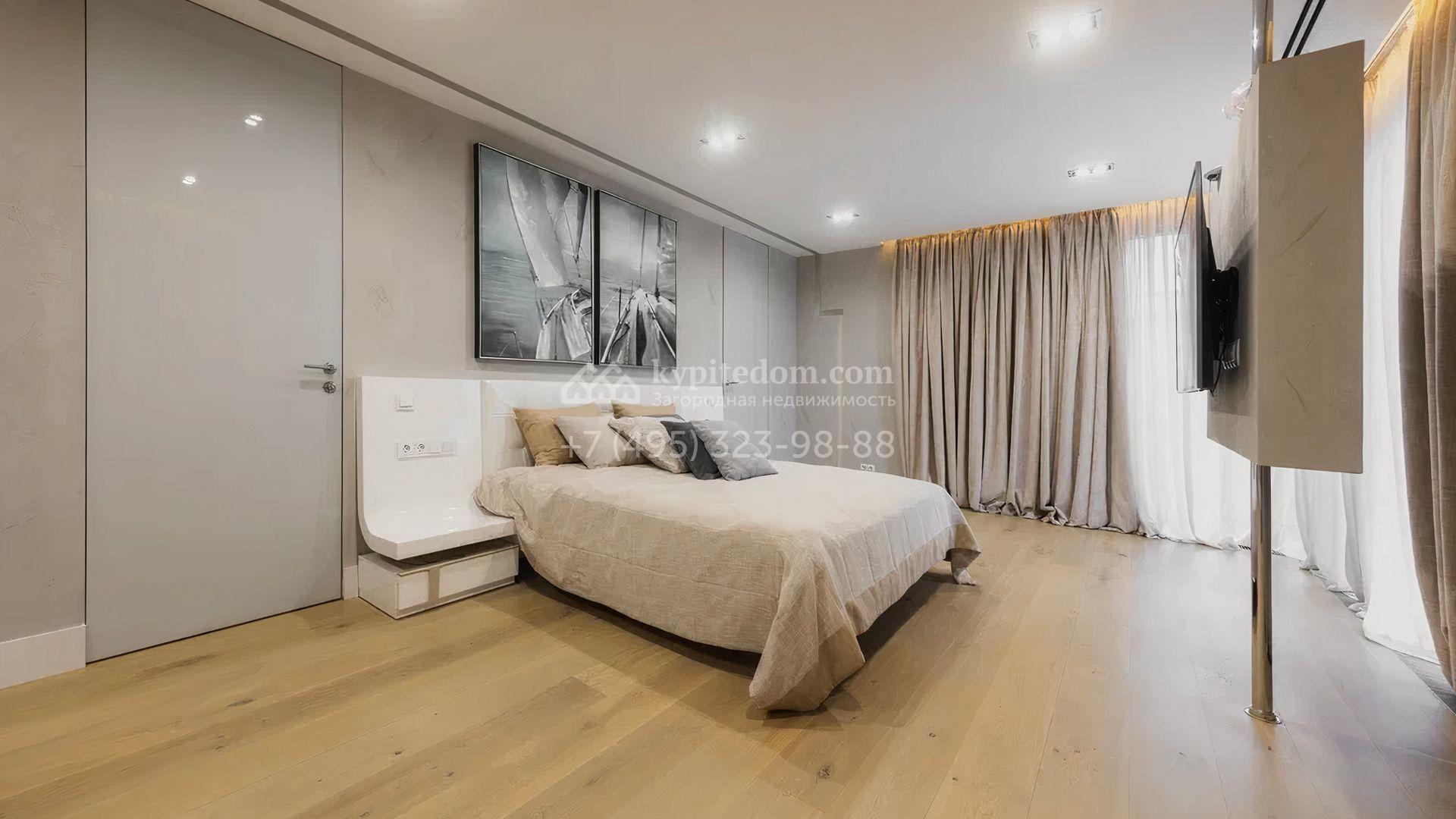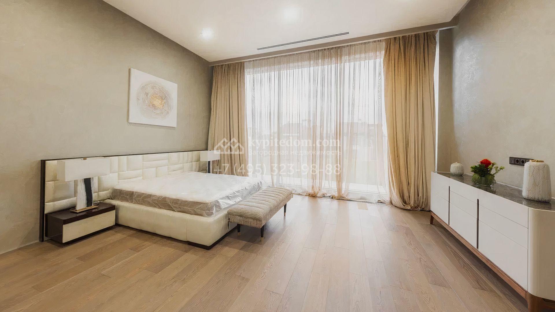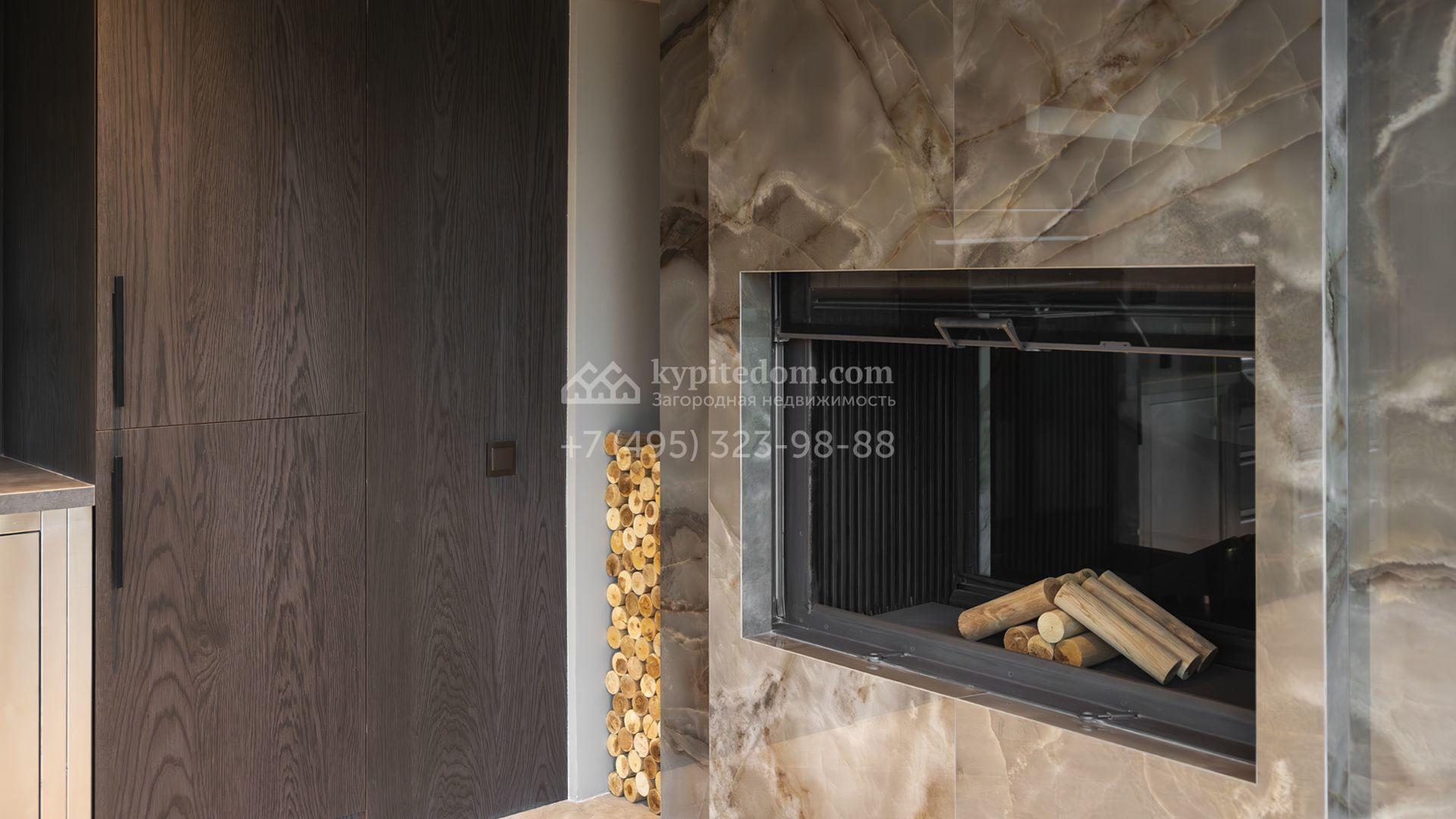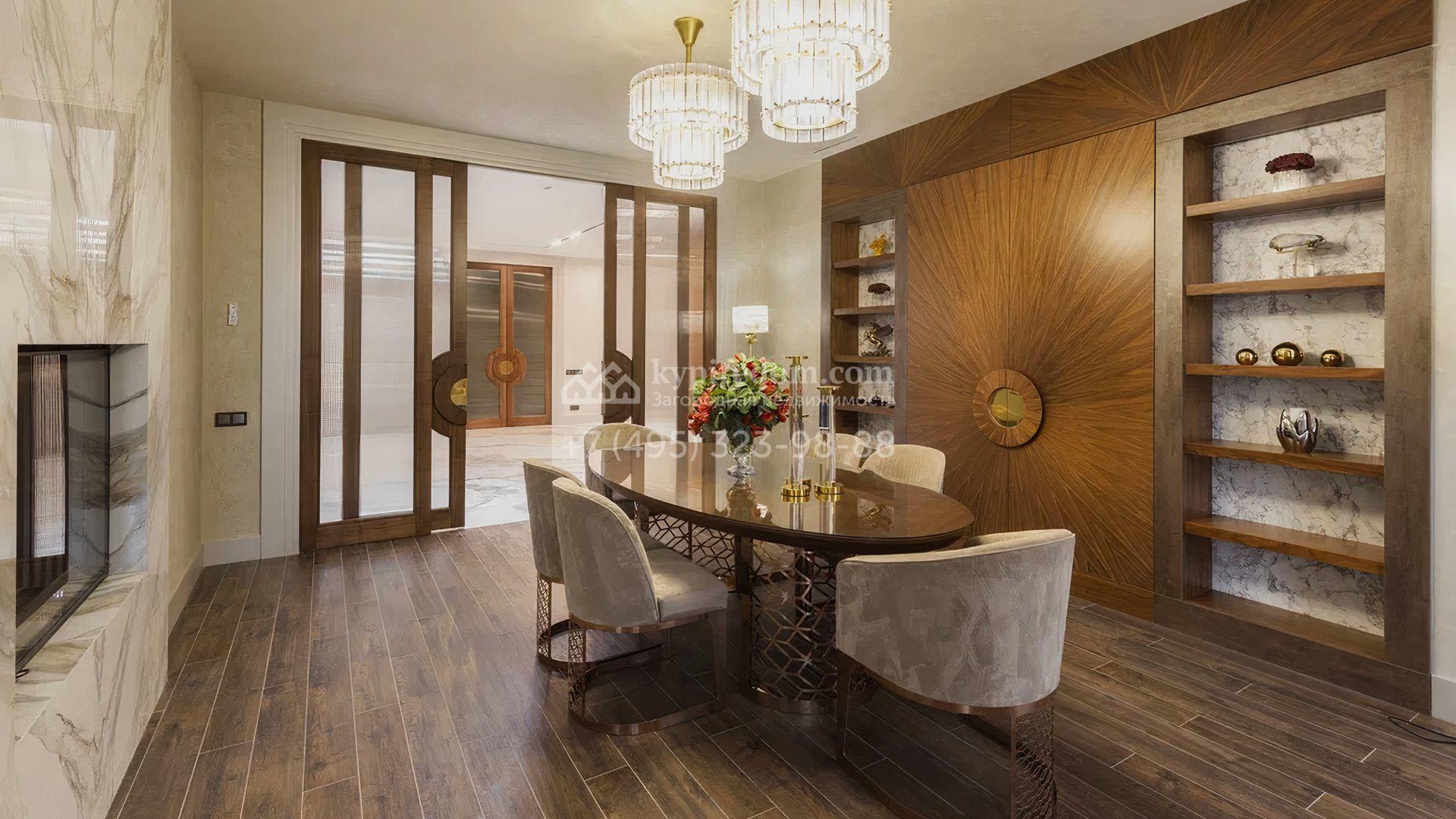 Загородный особняк площадью 856 м² расположен на полевом участке 25 соток. Фасад выполнен в современном стиле, облицован бежевой штукатуркой, серо-коричневым камнем и деревом. Благодаря большой площади остекления пространство наполнено воздухом и светом. В отделке интерьера в светлых оттенках использовались качественные и дорогостоящие материалы, установлена бытовая техника Miele. Планировка дома включает пять спален, гостиную с камином, кухню-столовую с выходом на террасу, кабинет, хаммам и комнату отдыха. Предусмотрен встроенный гараж на две машины. На участке выполнен ландшафтный дизайн, высажены туи, деревья и кустарники.