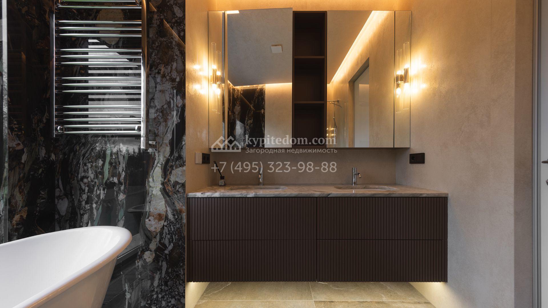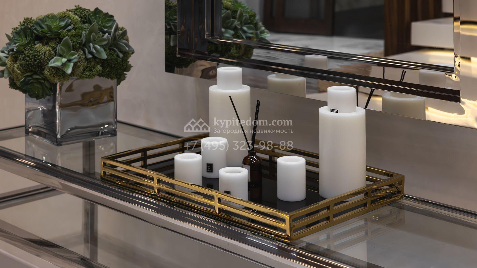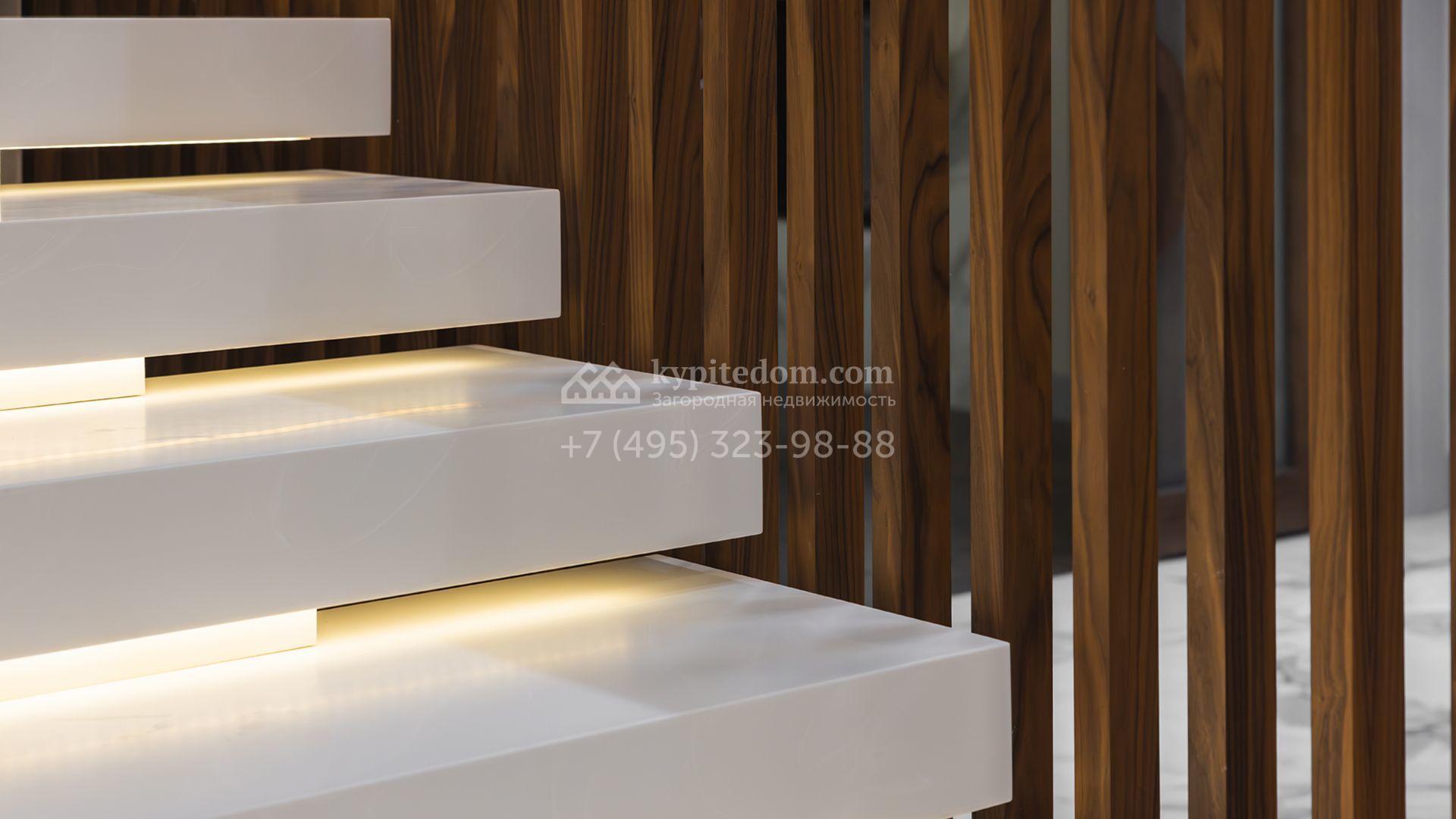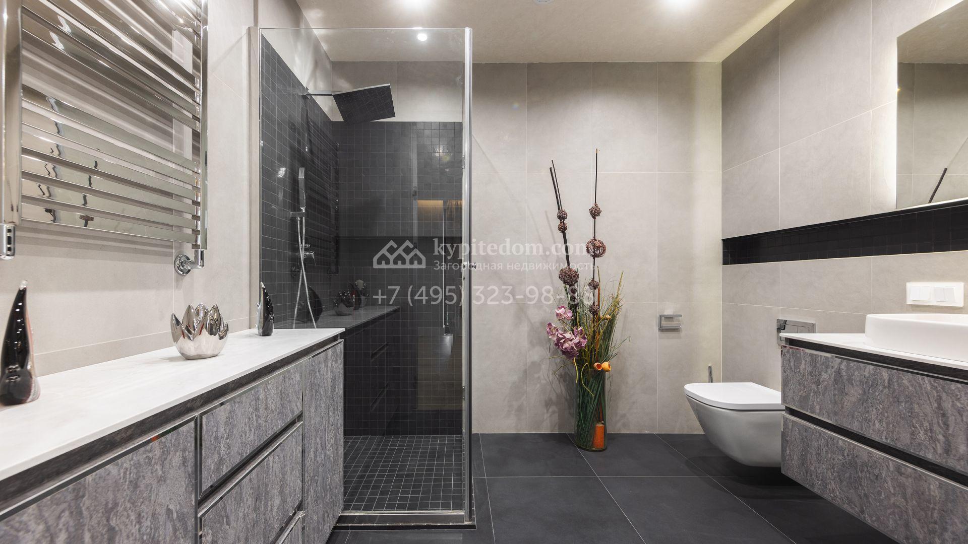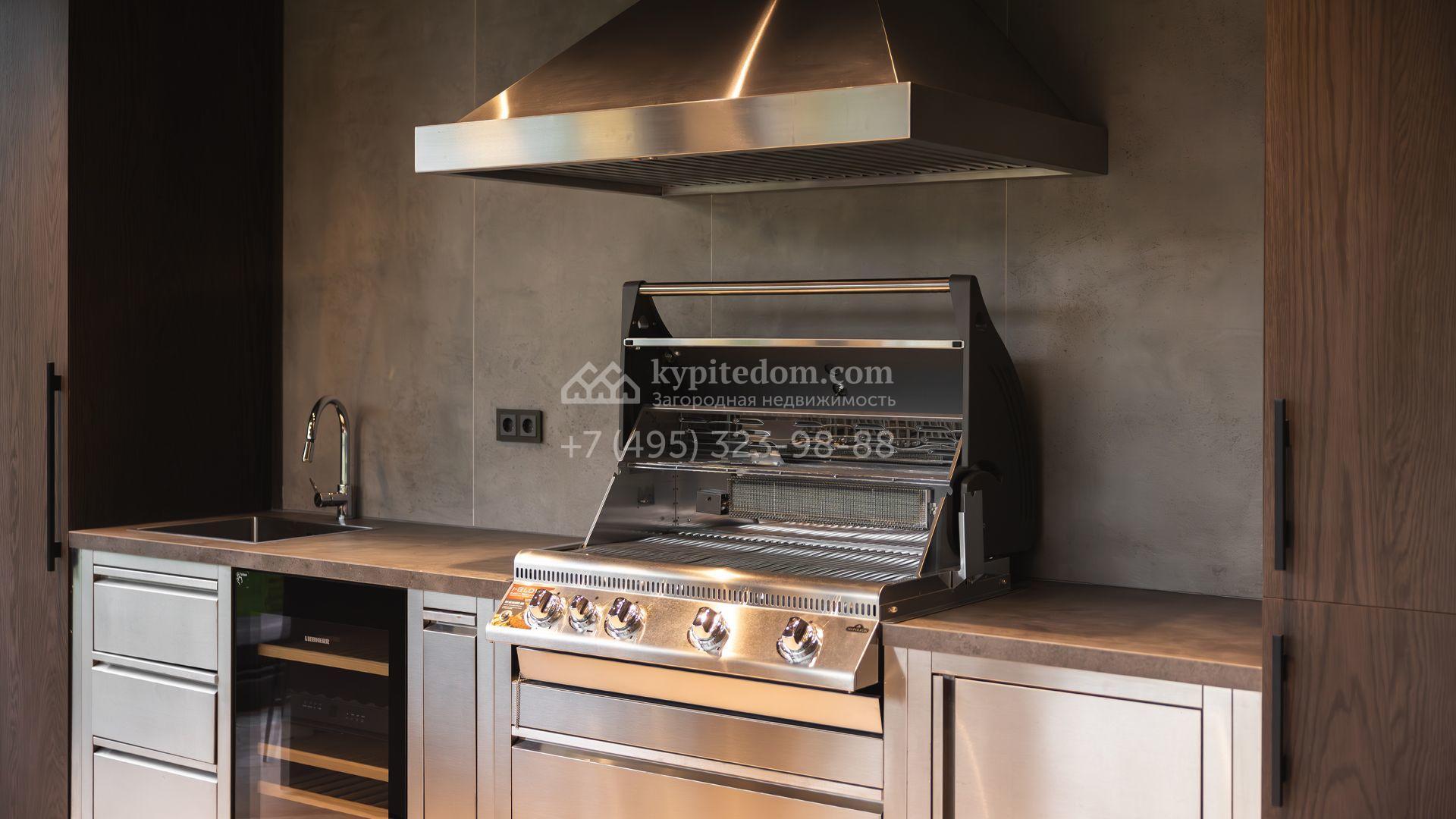 Загородный особняк площадью 856 м² расположен на полевом участке 25 соток. Фасад выполнен в современном стиле, облицован бежевой штукатуркой, серо-коричневым камнем и деревом. Благодаря большой площади остекления пространство наполнено воздухом и светом. В отделке интерьера в светлых оттенках использовались качественные и дорогостоящие материалы, установлена бытовая техника Miele. Планировка дома включает пять спален, гостиную с камином, кухню-столовую с выходом на террасу, кабинет, хаммам и комнату отдыха. Предусмотрен встроенный гараж на две машины. На участке выполнен ландшафтный дизайн, высажены туи, деревья и кустарники.