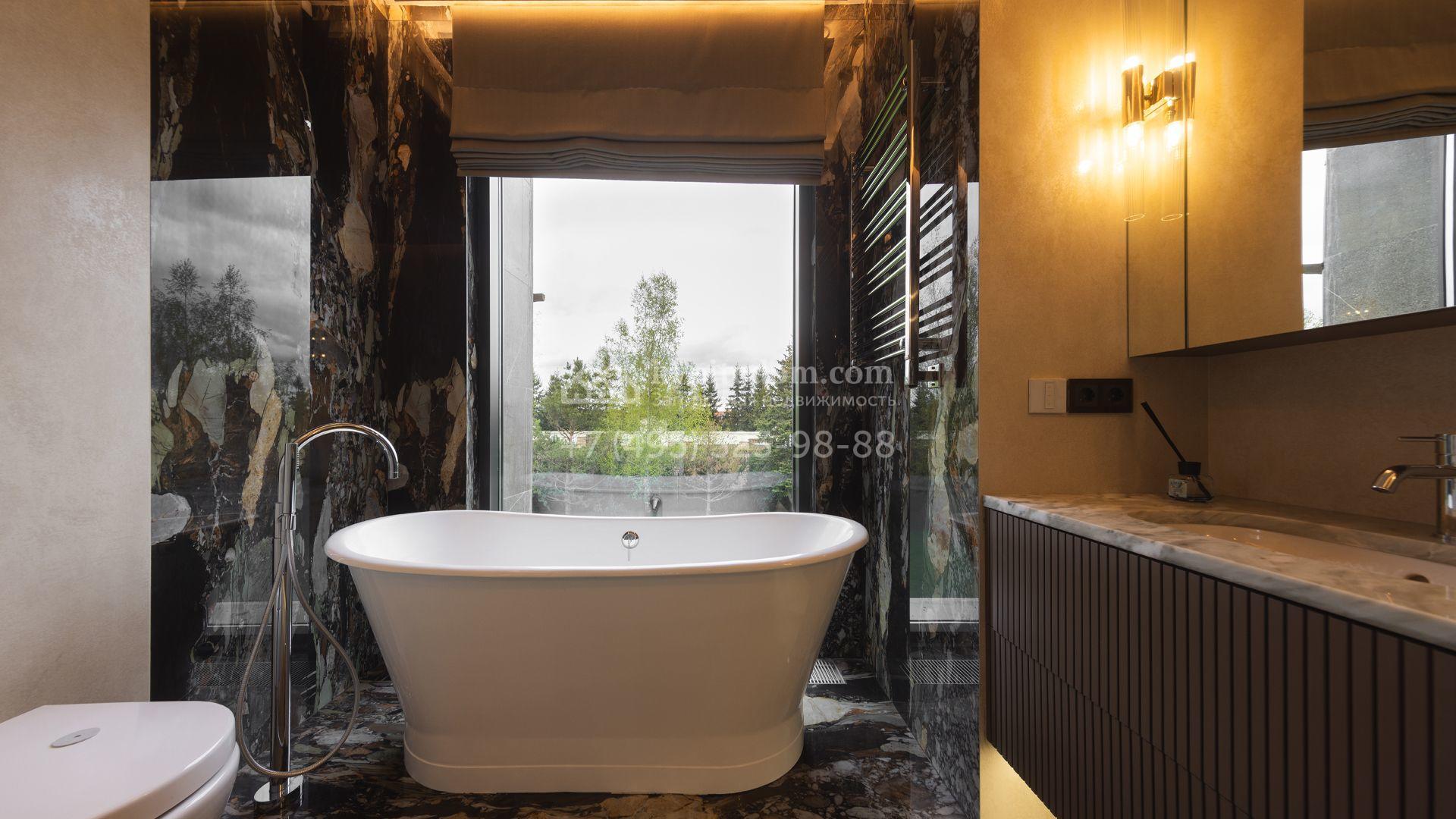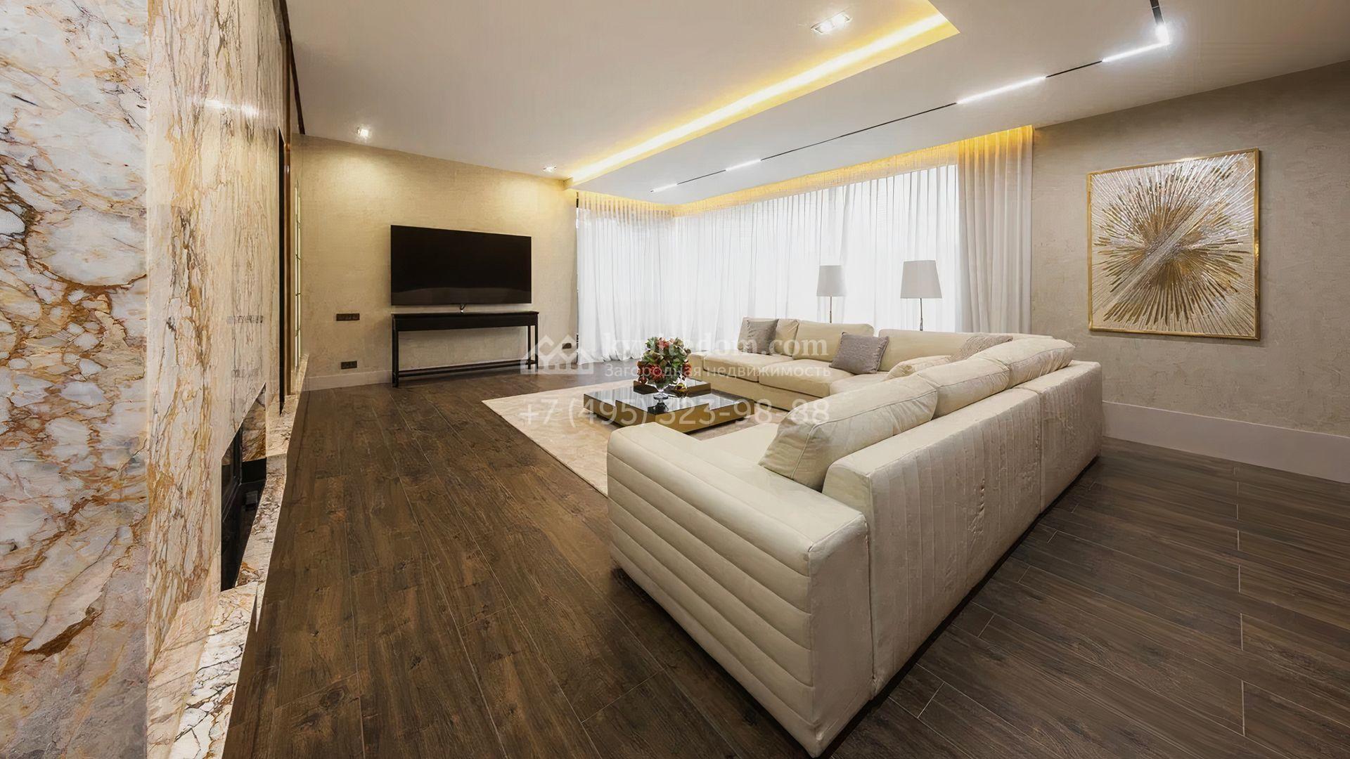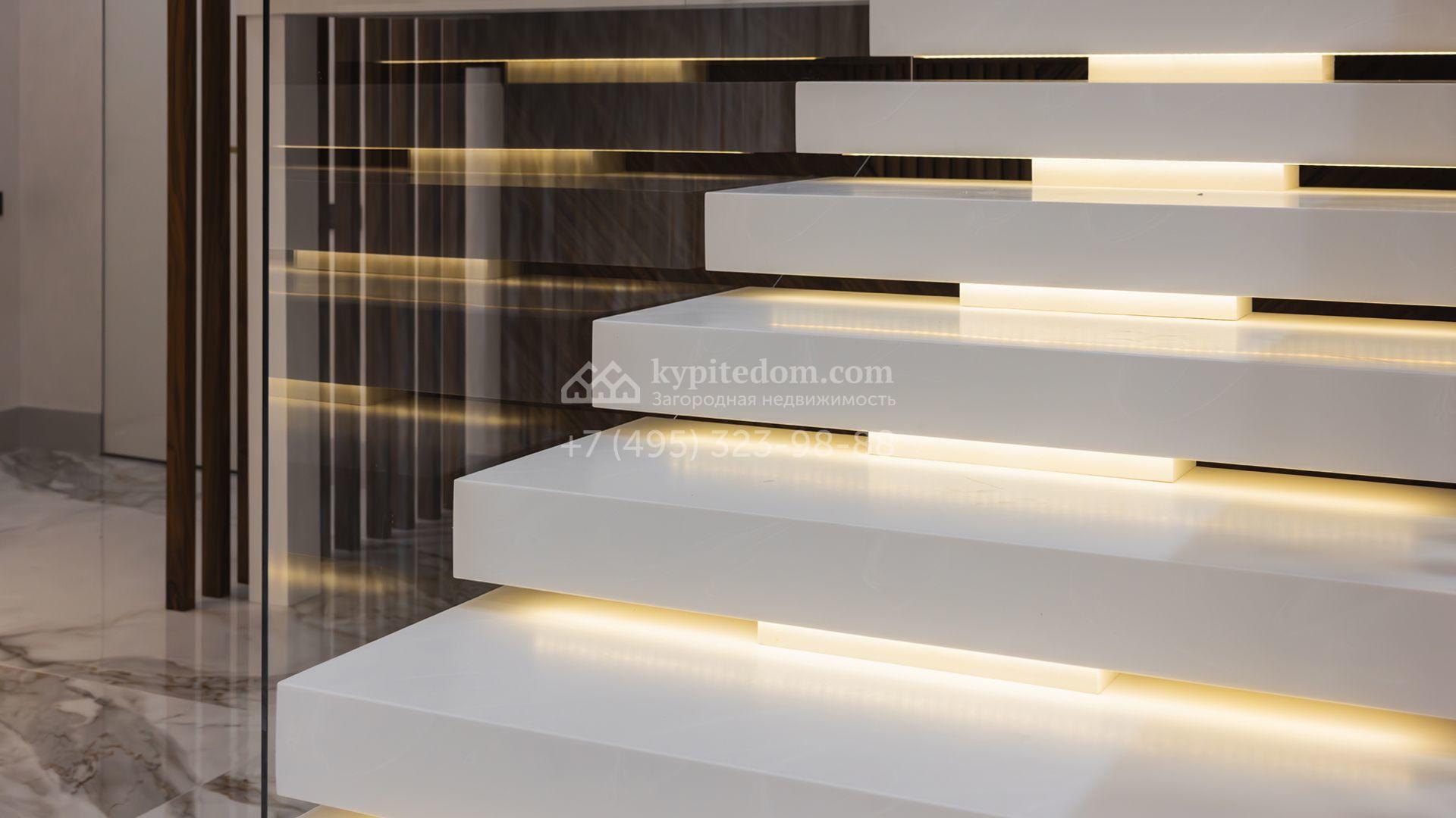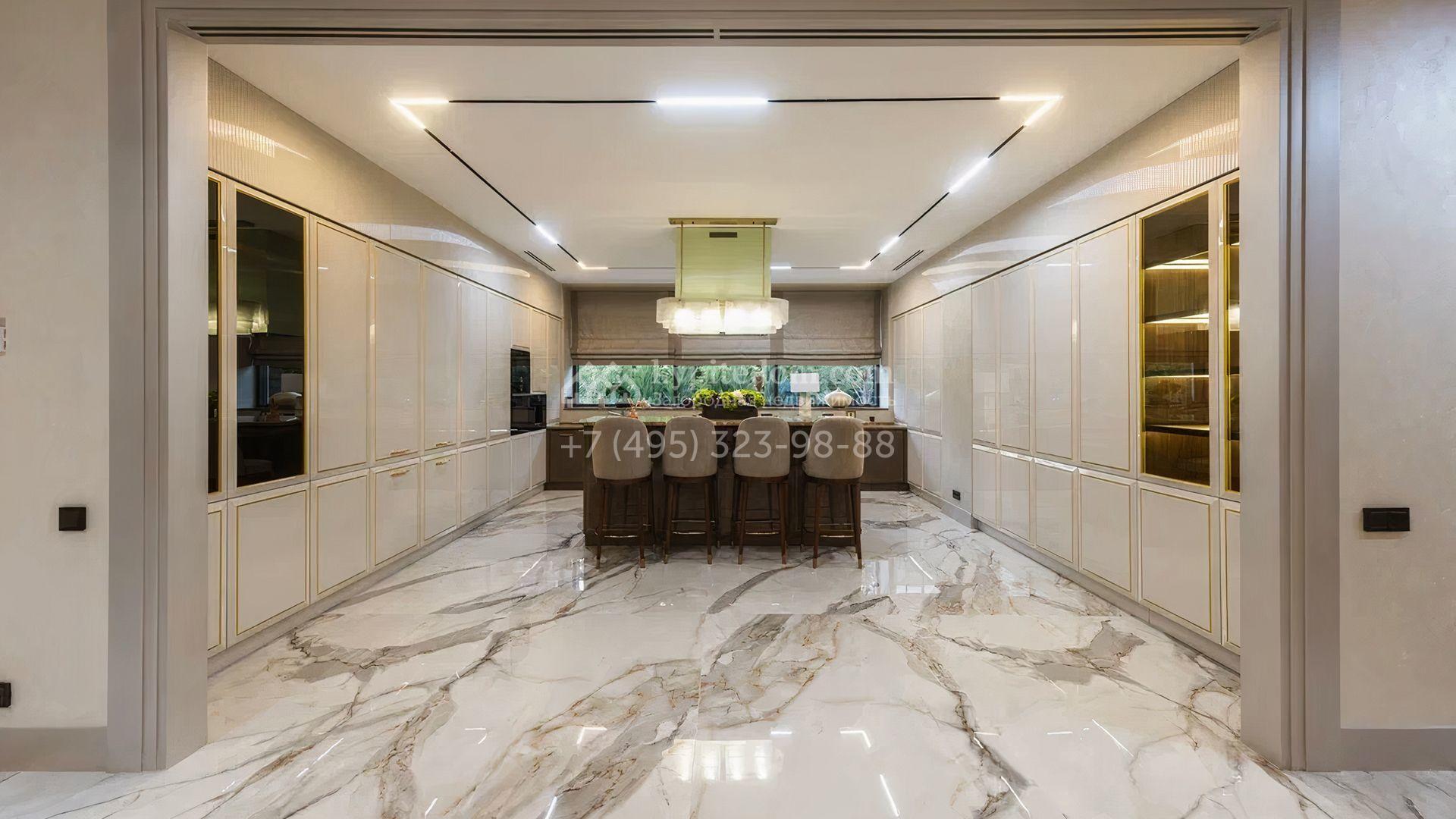 Загородный особняк площадью 856 м² расположен на полевом участке 25 соток. Фасад выполнен в современном стиле, облицован бежевой штукатуркой, серо-коричневым камнем и деревом. Благодаря большой площади остекления пространство наполнено воздухом и светом. В отделке интерьера в светлых оттенках использовались качественные и дорогостоящие материалы, установлена бытовая техника Miele. Планировка дома включает пять спален, гостиную с камином, кухню-столовую с выходом на террасу, кабинет, хаммам и комнату отдыха. Предусмотрен встроенный гараж на две машины. На участке выполнен ландшафтный дизайн, высажены туи, деревья и кустарники.