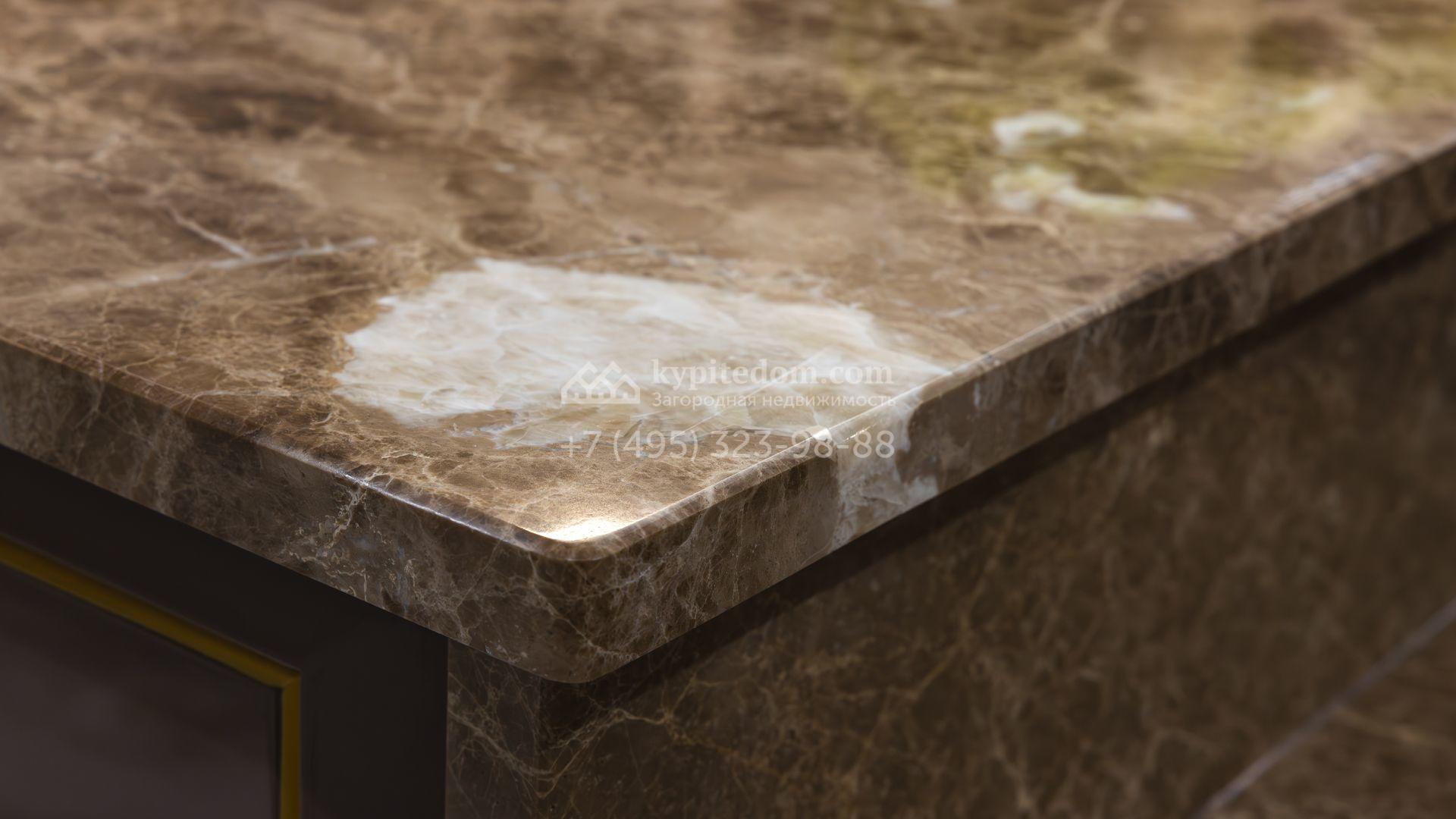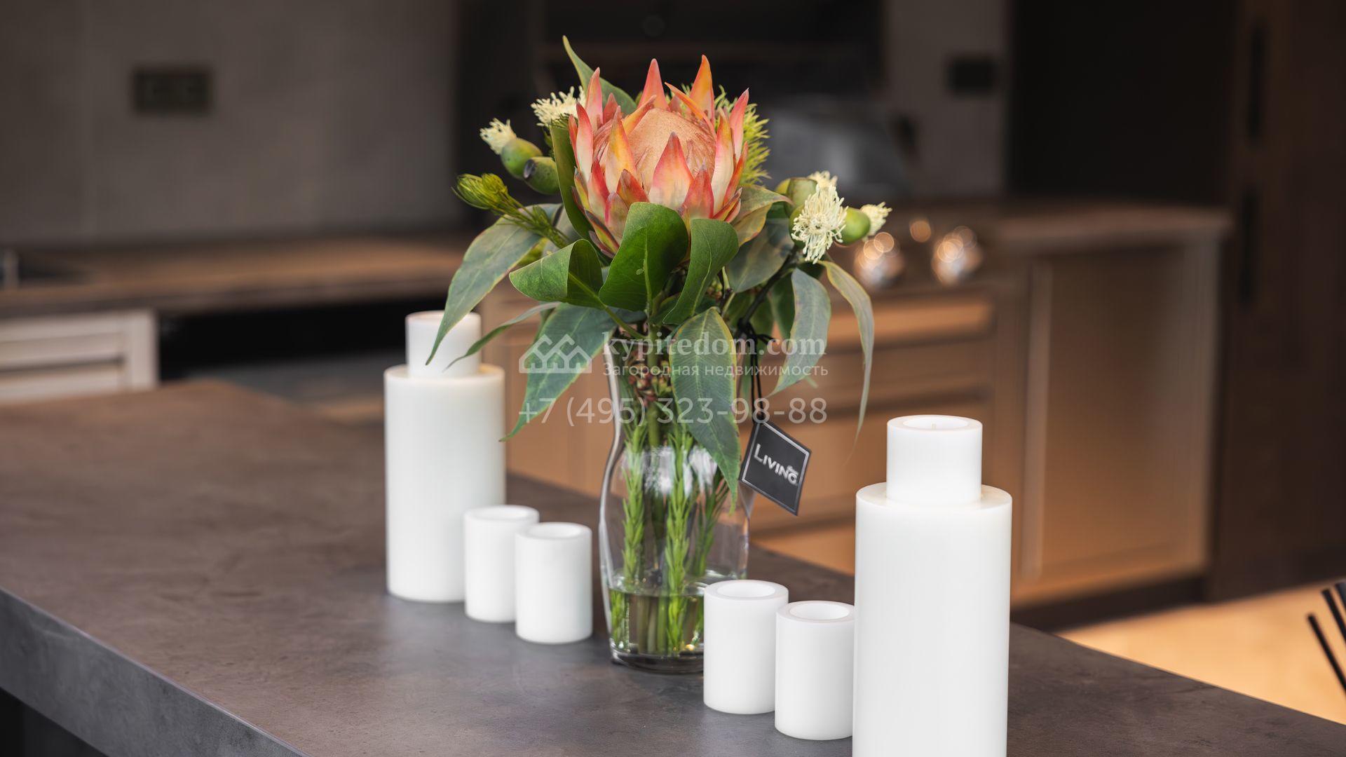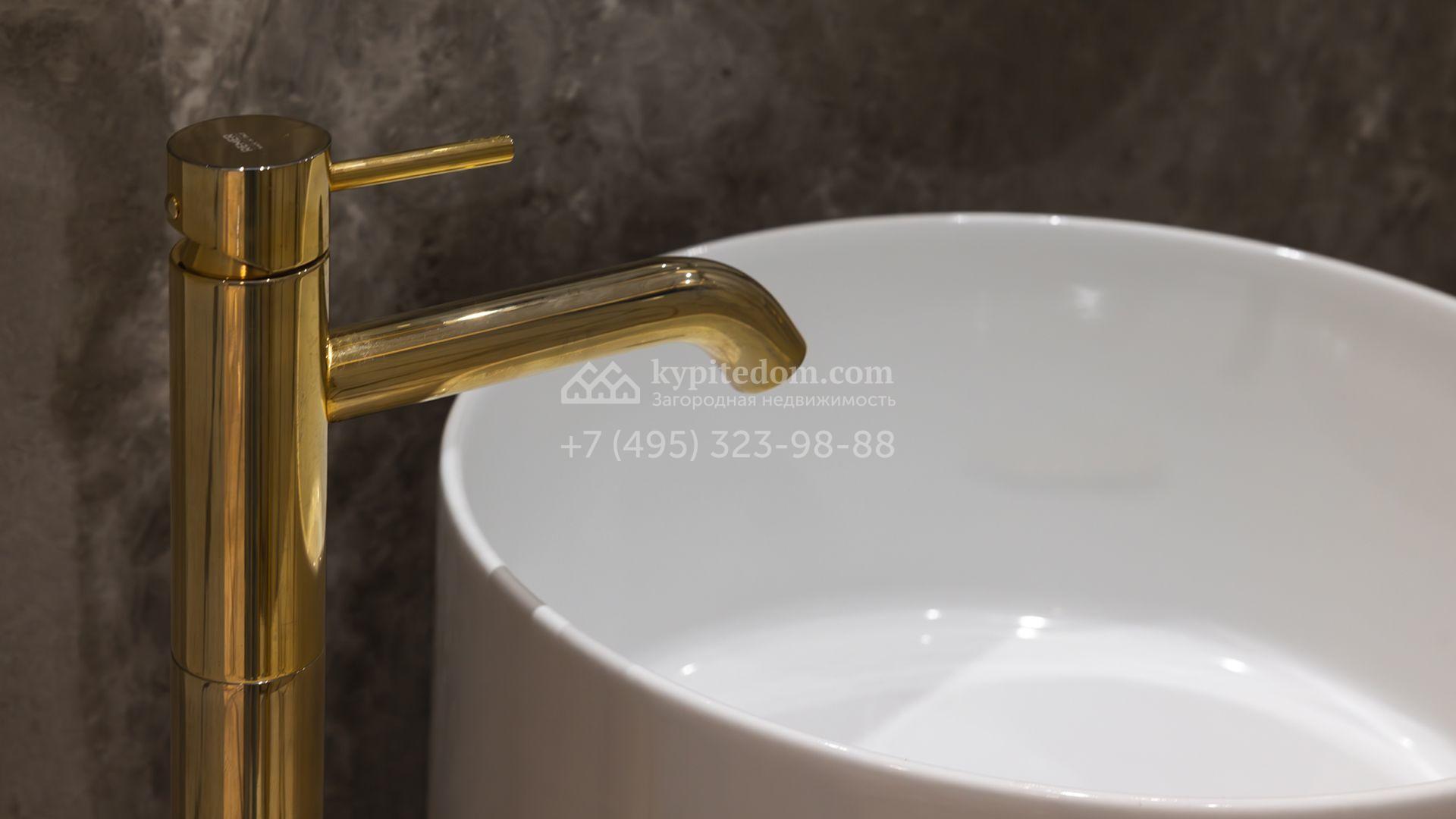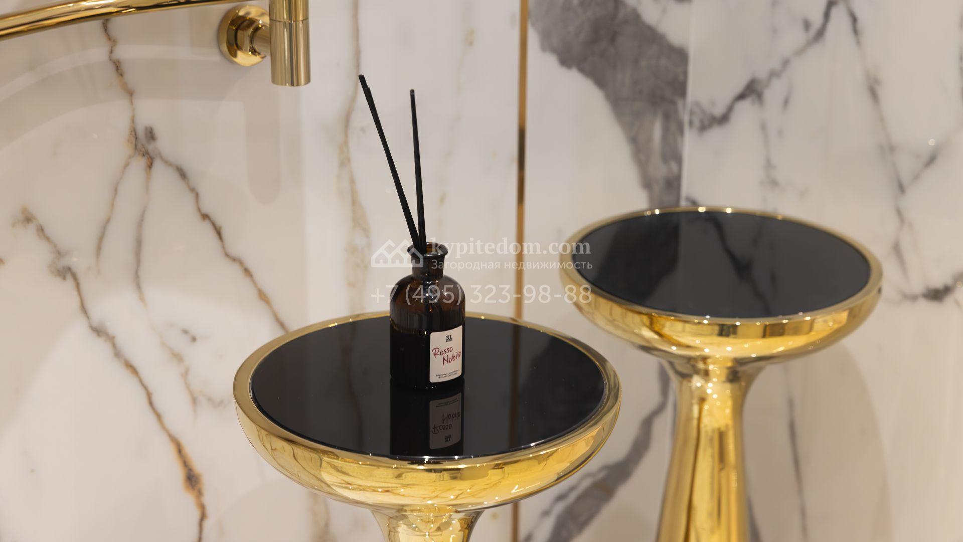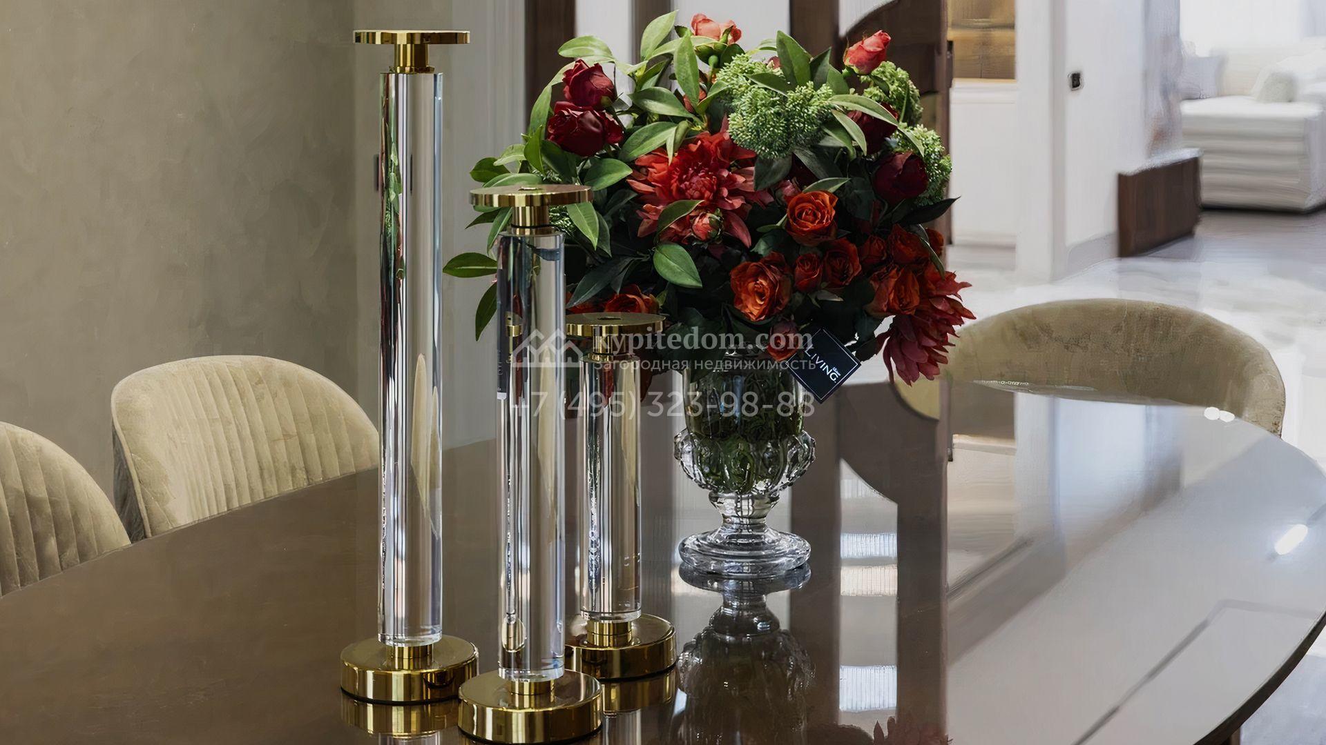 Загородный особняк площадью 856 м² расположен на полевом участке 25 соток. Фасад выполнен в современном стиле, облицован бежевой штукатуркой, серо-коричневым камнем и деревом. Благодаря большой площади остекления пространство наполнено воздухом и светом. В отделке интерьера в светлых оттенках использовались качественные и дорогостоящие материалы, установлена бытовая техника Miele. Планировка дома включает пять спален, гостиную с камином, кухню-столовую с выходом на террасу, кабинет, хаммам и комнату отдыха. Предусмотрен встроенный гараж на две машины. На участке выполнен ландшафтный дизайн, высажены туи, деревья и кустарники.
