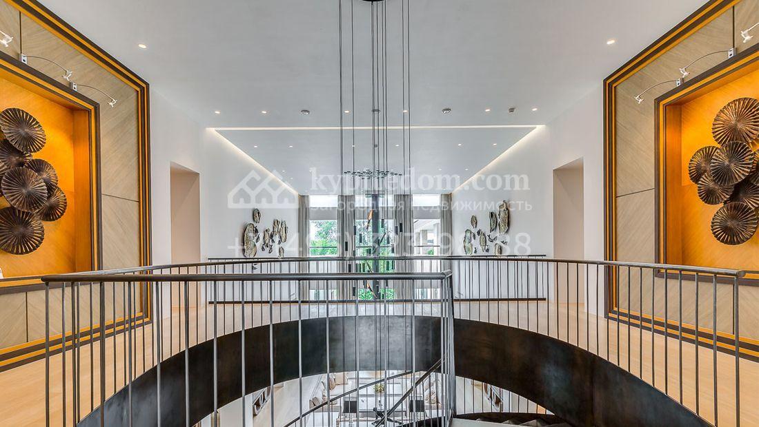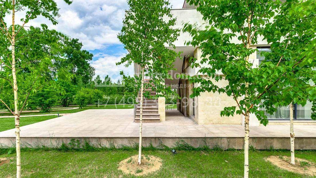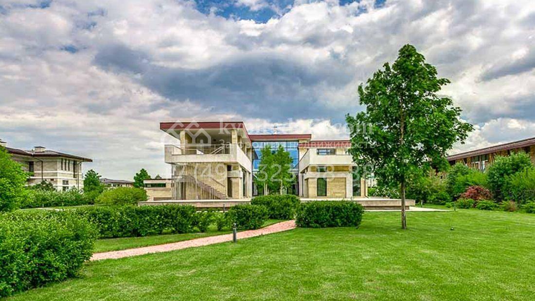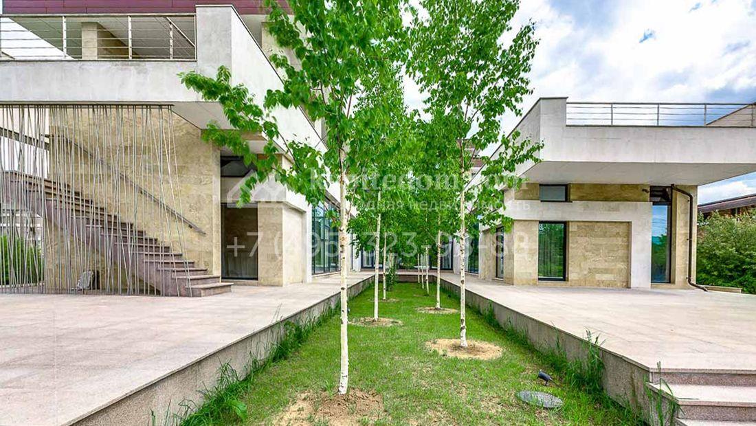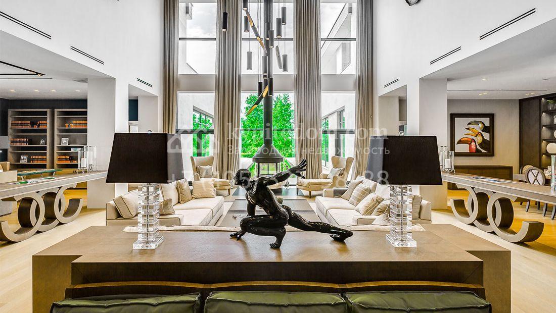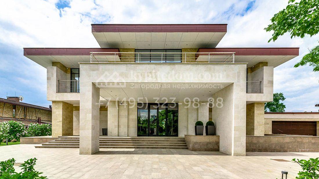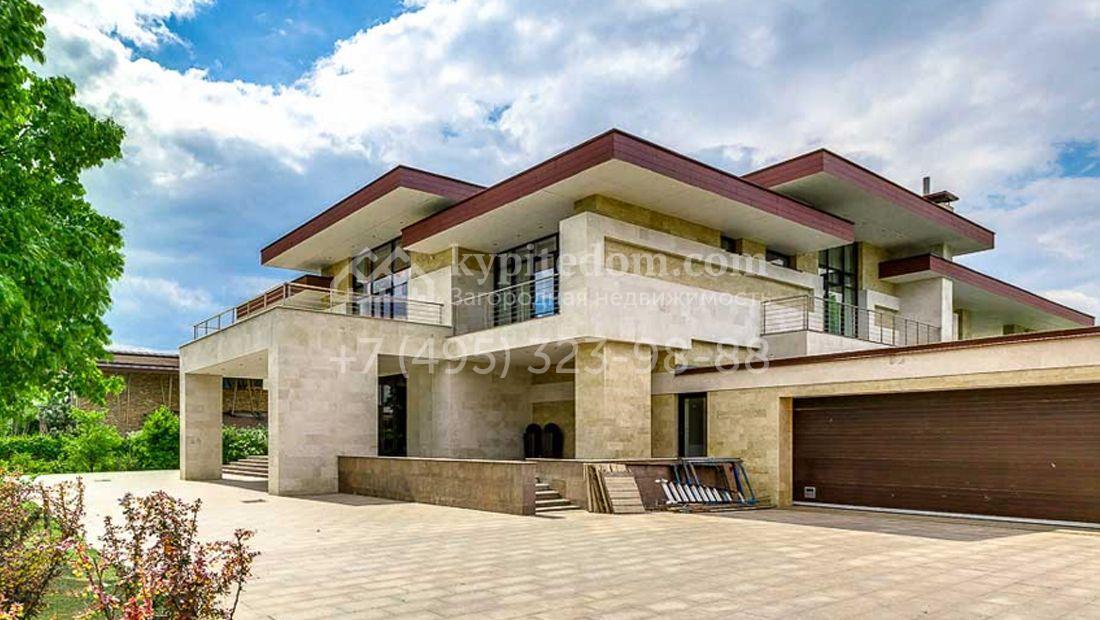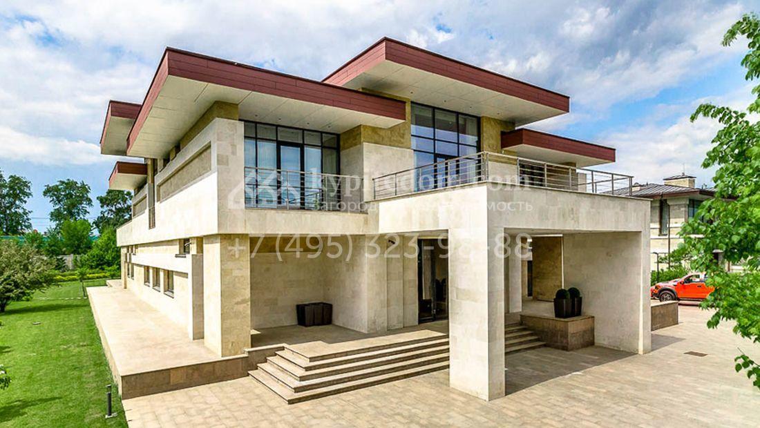 Просторная загородная резиденция в стиле американского архитектора Френка Ллойда Райта площадью 1509 м² построена на открытом участке 50 соток. Дом со множеством открытых террас облицован натуральным камнем песочного оттенка. В первый этаж встроен гараж для машин. Представительная резиденция оформлена в современном стиле, мебель и аксессуары подобраны из дизайнерских коллекций. Главная гостиная дома имеет панорамное двухуровневое остекление. Кухня, санузлы, гардеробные оборудованы техникой и мебелью.