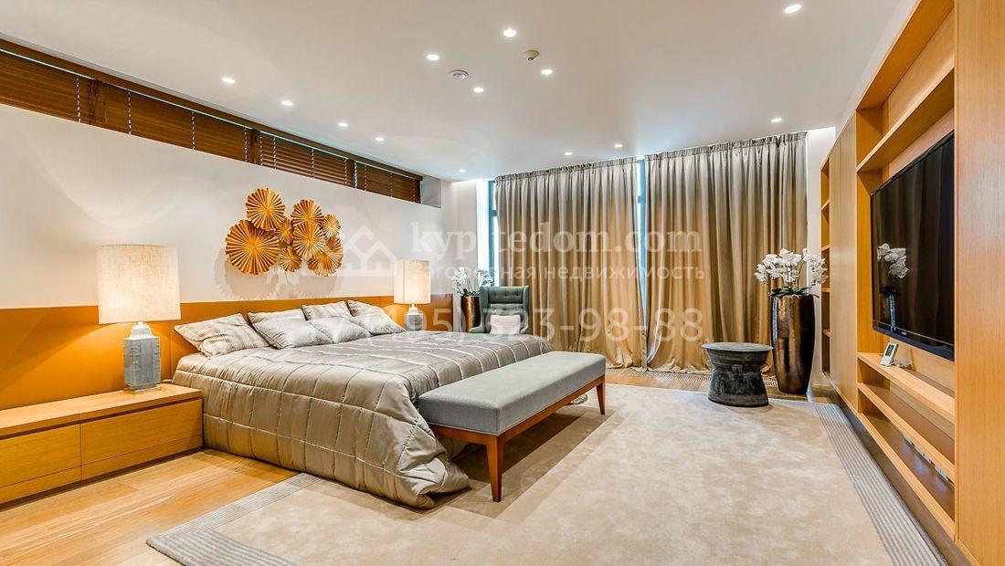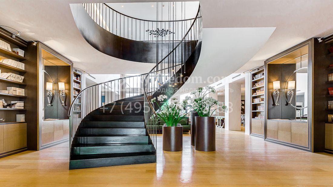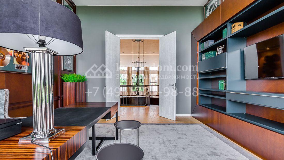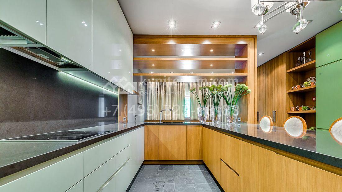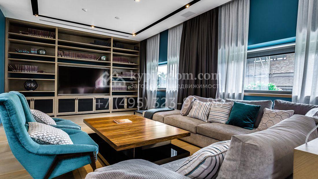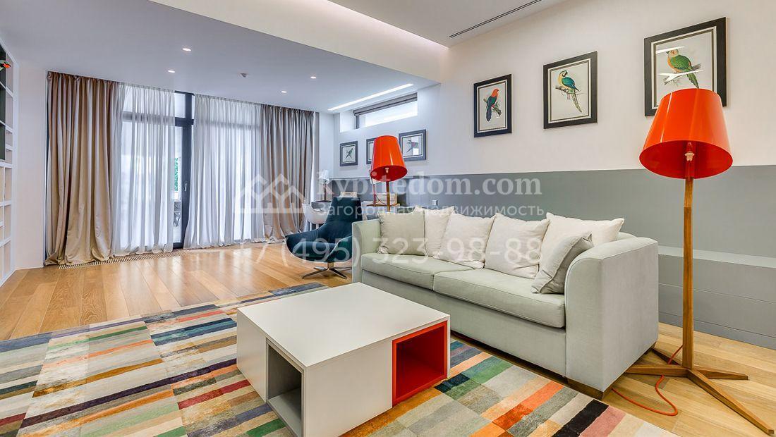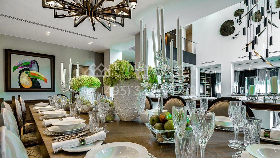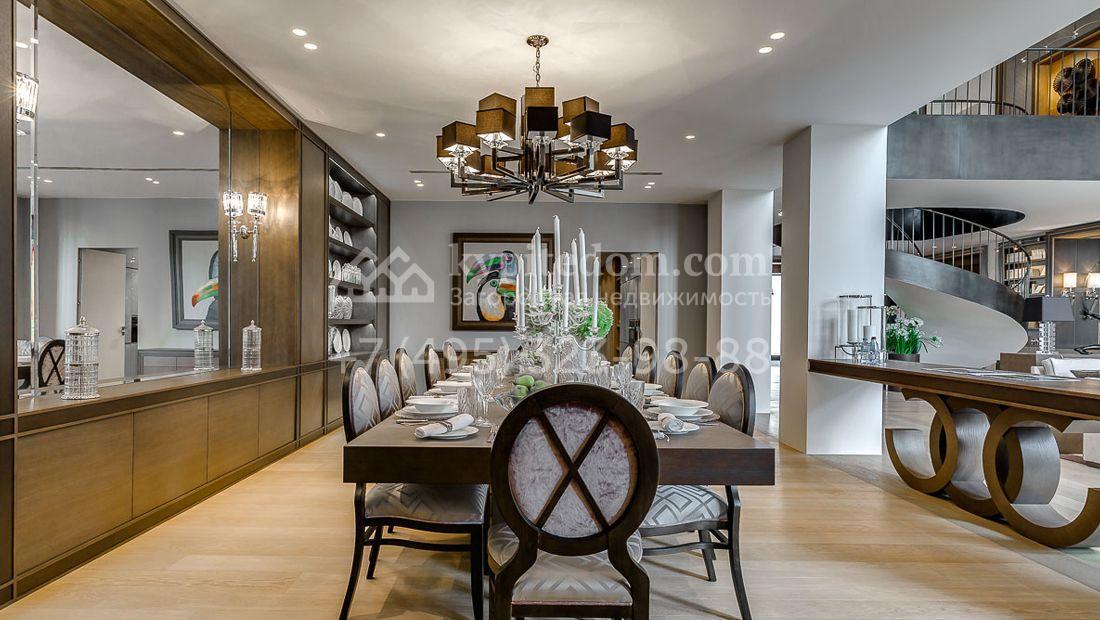 Просторная загородная резиденция в стиле американского архитектора Френка Ллойда Райта площадью 1509 м² построена на открытом участке 50 соток. Дом со множеством открытых террас облицован натуральным камнем песочного оттенка. В первый этаж встроен гараж для машин. Представительная резиденция оформлена в современном стиле, мебель и аксессуары подобраны из дизайнерских коллекций. Главная гостиная дома имеет панорамное двухуровневое остекление. Кухня, санузлы, гардеробные оборудованы техникой и мебелью.