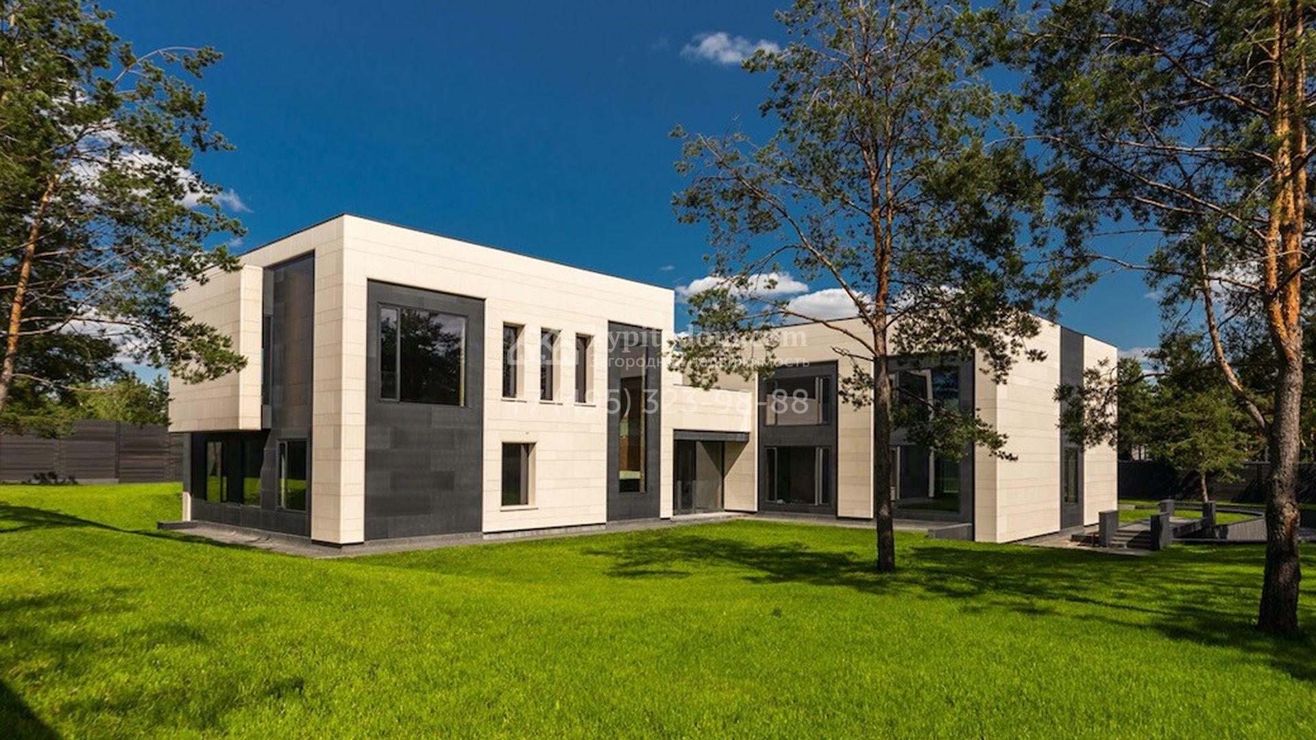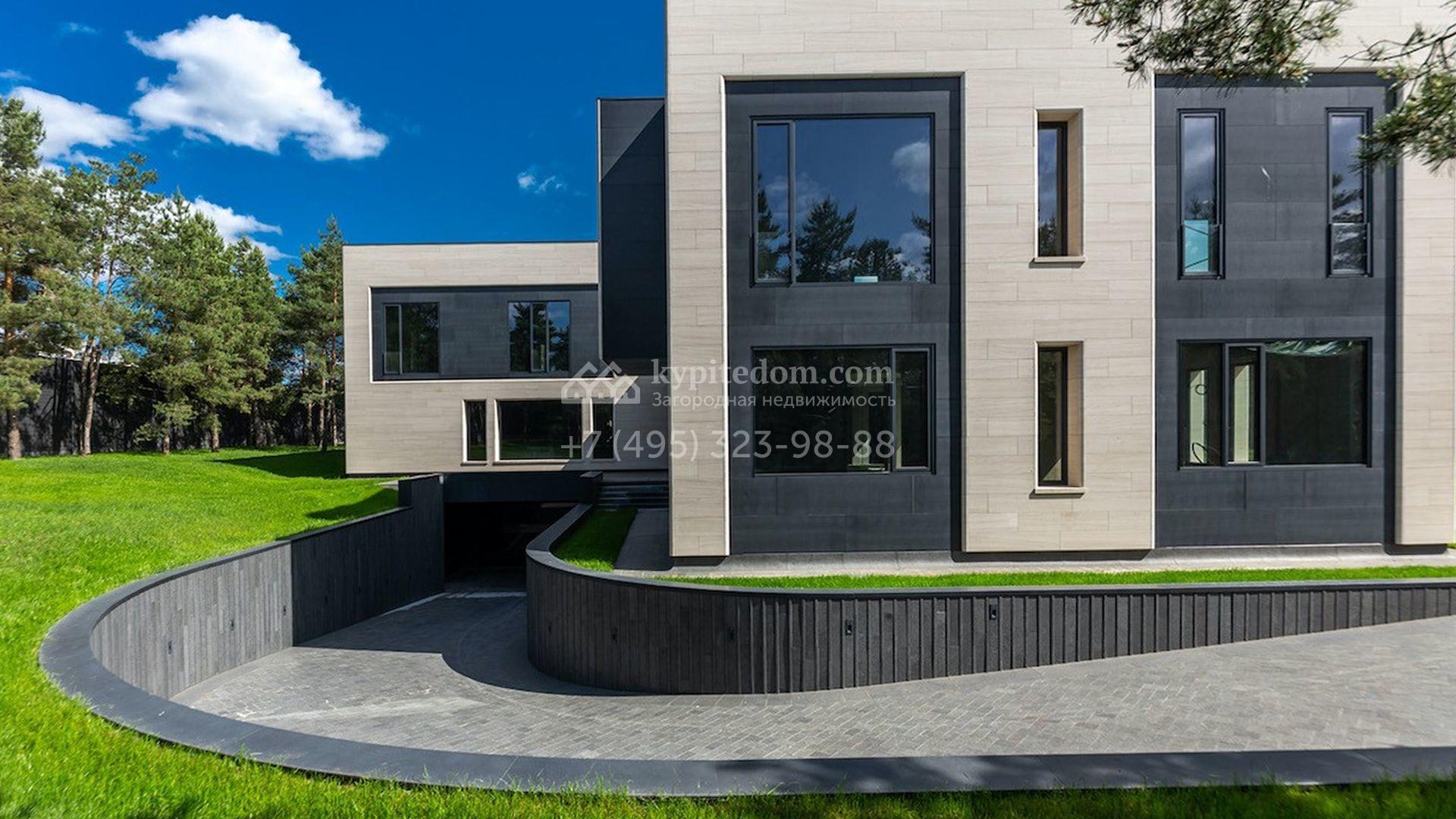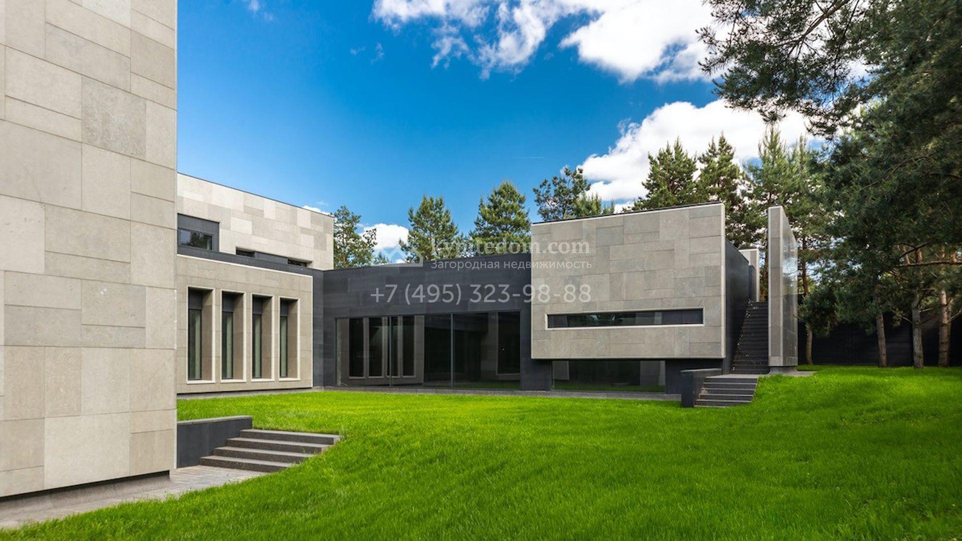 Загородная резиденция площадью 2 240 м² расположена на просторном полевом участке 39,9 соток правильной формы. Дом построен по архитектурному проекту в современном стиле с плоской кровлей, облицован белым и графитовым камнем. В доме на цокольном этаже спланирован гараж для нескольких машин, на первом и втором этажах предусмотрено 8 спален и бассейн с выходом на участок. Все этажи соединяет лифт. Отделка whitebox оставляет простор для интерьерных решений. На участке посадили ровный газон, по периметру высадили молодые сосны.
