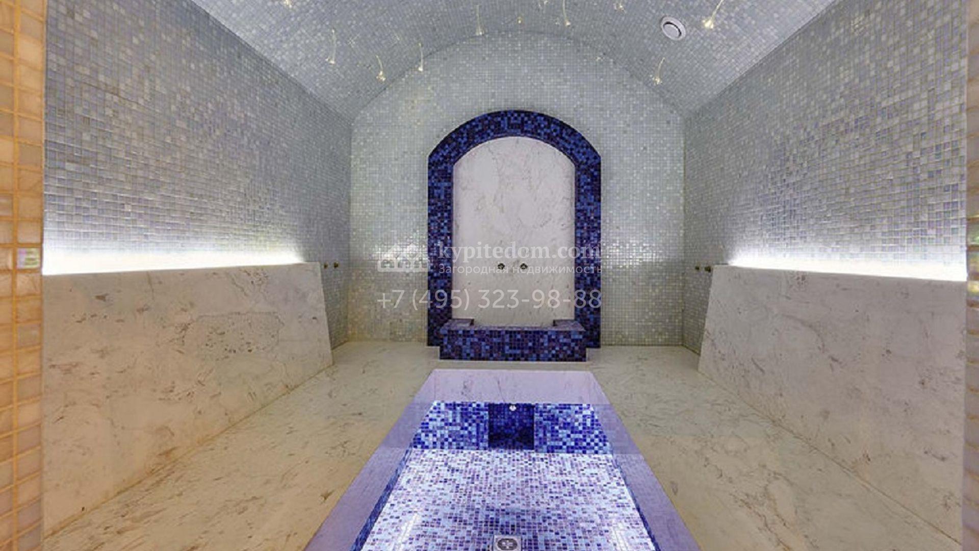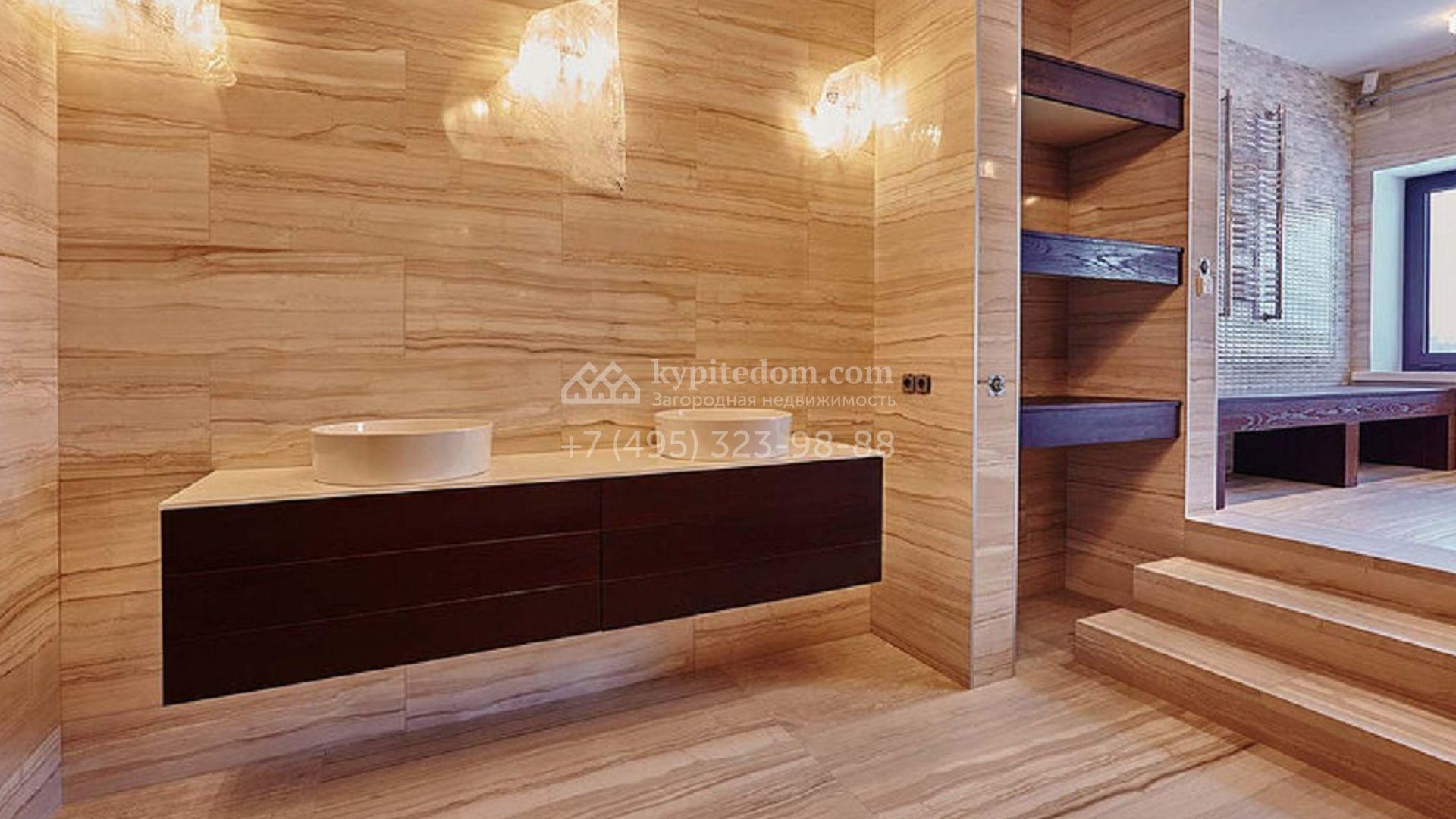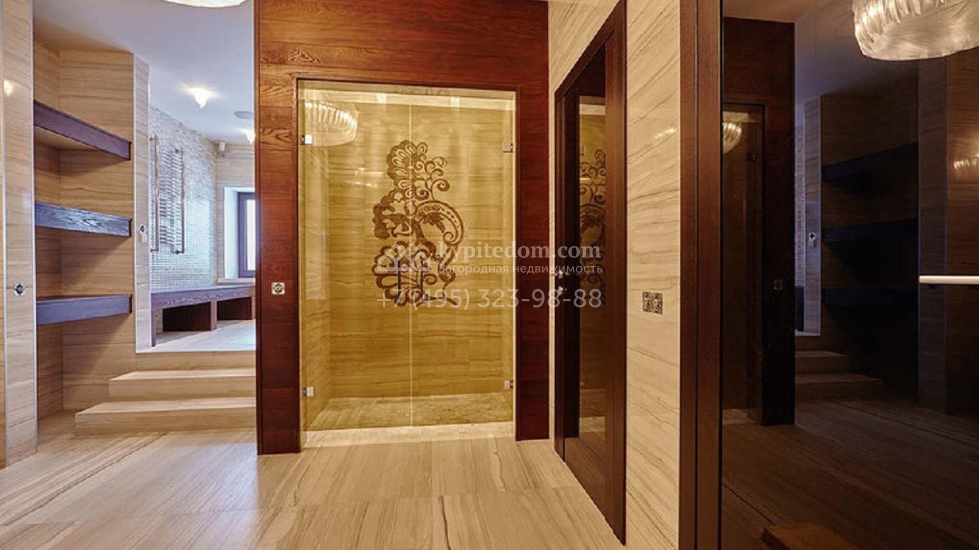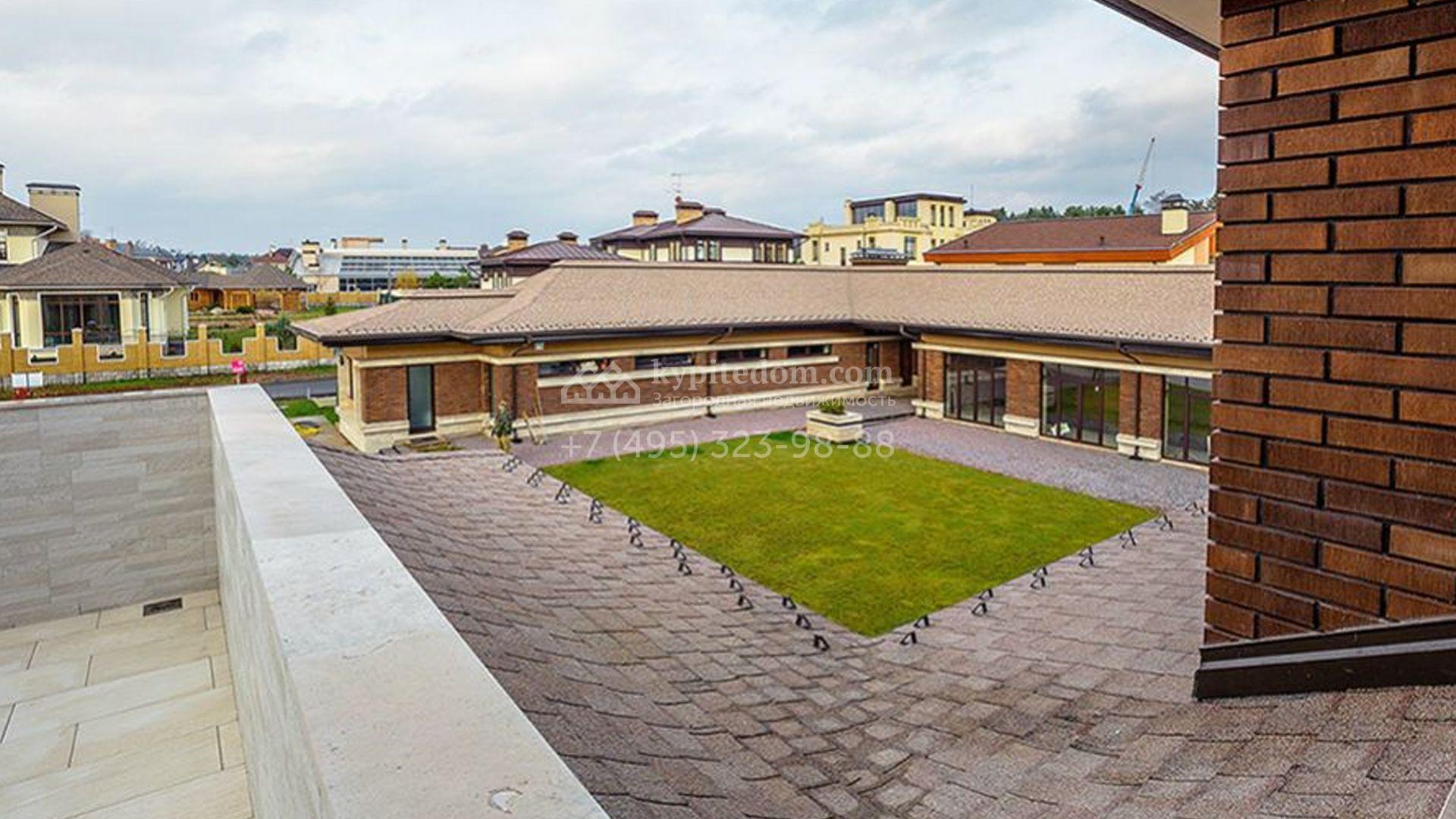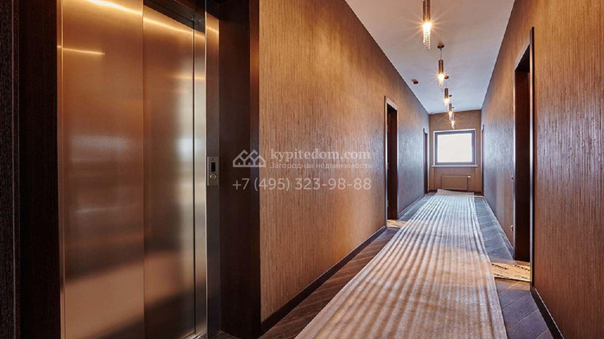 Загородное поместье с бассейном и 6-ю спальнями распложено около пруда, на участке 55 соток. Дом площадью 1866 построен в стиле американского архитектора ХХ века Френка Ллойда Райта — фасад в натуральных цветах с широким карнизом хорошо отлично вливается в природное окружение. На первом этаже дома расположена зона отдыха с бассейном и турецкой баней. На втором этаже 5 спален с санузлами и несколькими гардеробными. Интерьер выполнен в неоклассическом стиле в теплых тонах, дополнен дизайнерской мебелью. На участке постелен газон, проведена подсветка, дорожки вымощены плиткой и деревом. В дом встроен гараж для 3 машин с квартирой для персонала.