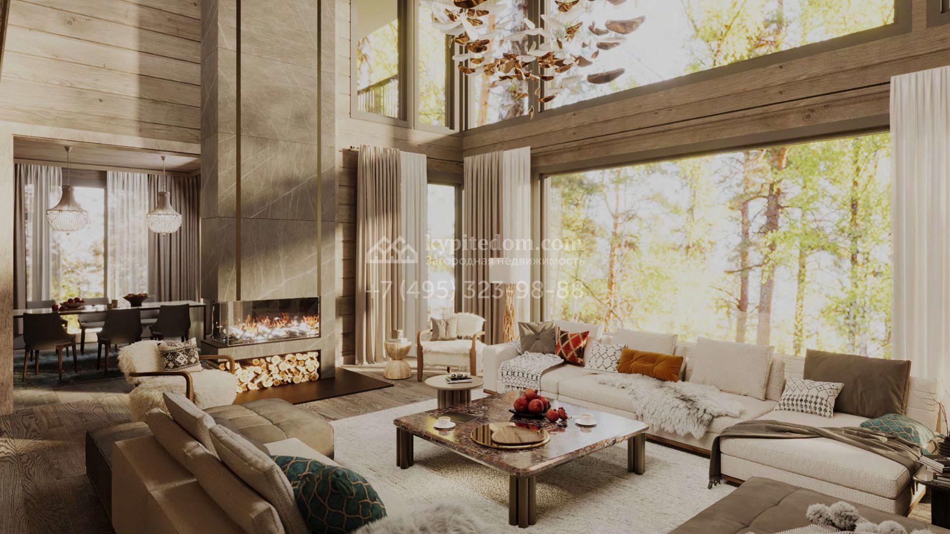 Загородный дом по проекту «Весна» площадью 550 м² расположен на участке 22,3 сотки в реликтовом лесу. Фасад здания с большими панорамными окнами выполнен из клееного бруса увеличенного размера и декорирован подсветкой. В отделке современного интерьера сохранена фактура дерева, создающая домашний уют. Резиденция включает 4 спальни, просторную гостиную с камином и вторым светом, кухню-столовую и террасу, на которой можно обустроить зону барбекю. На участке выполнен ландшафтный дизайн в стиле английского сада.