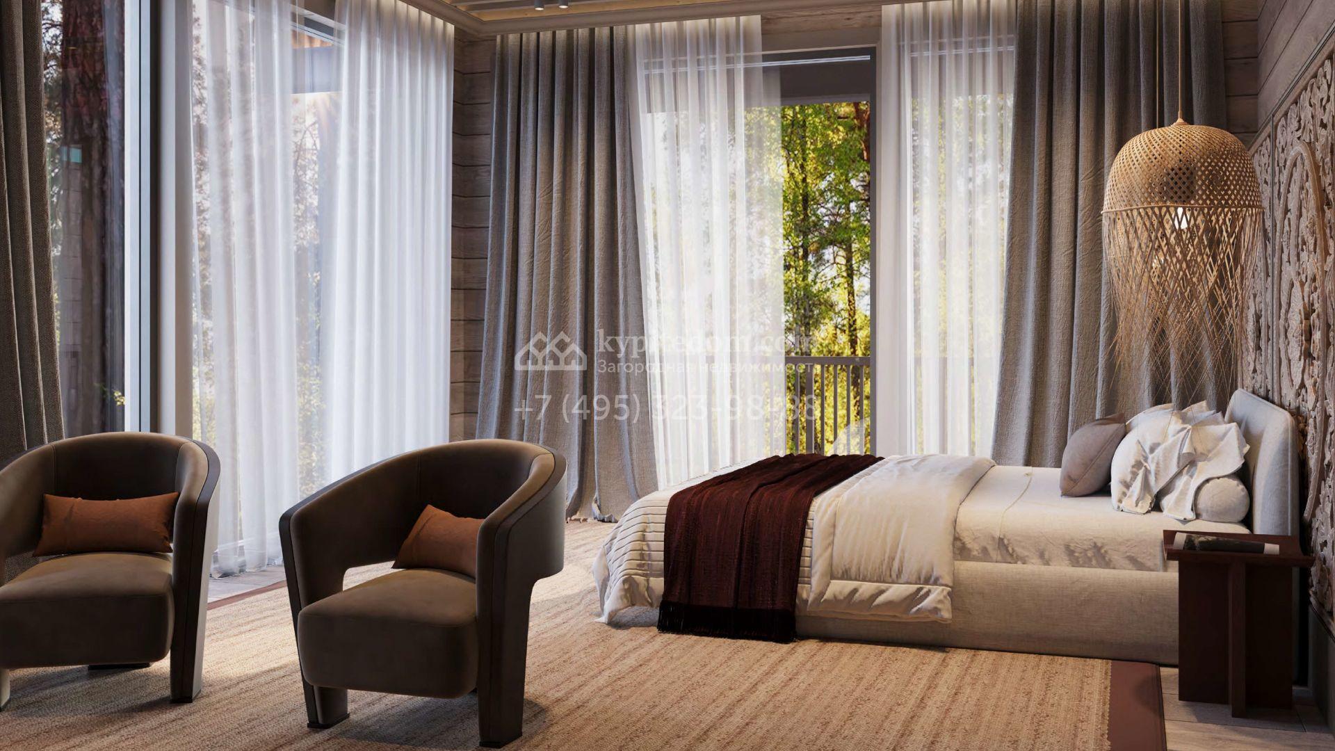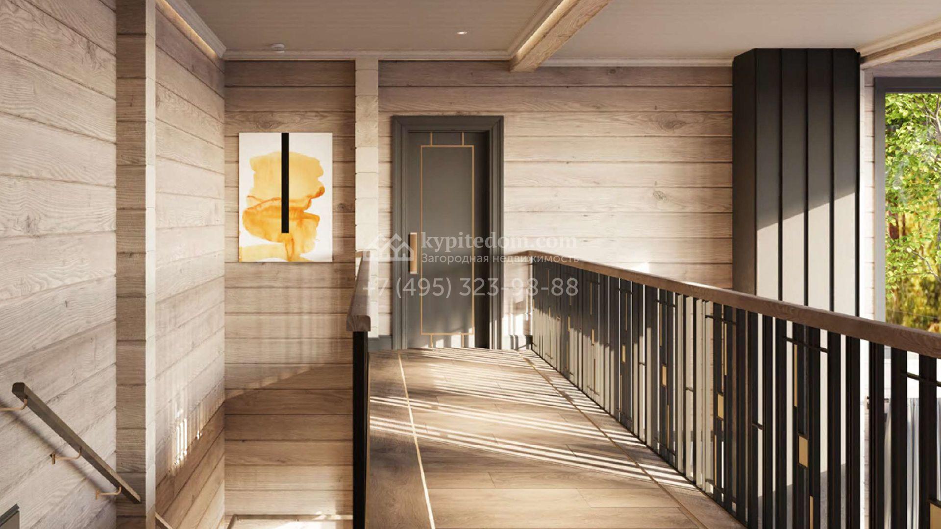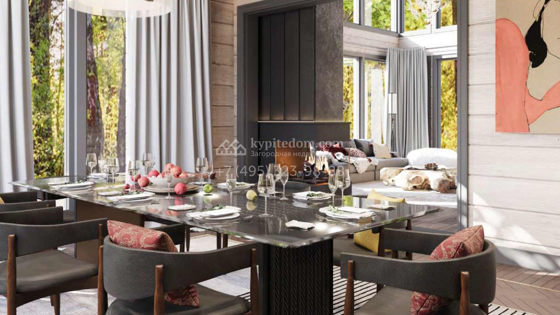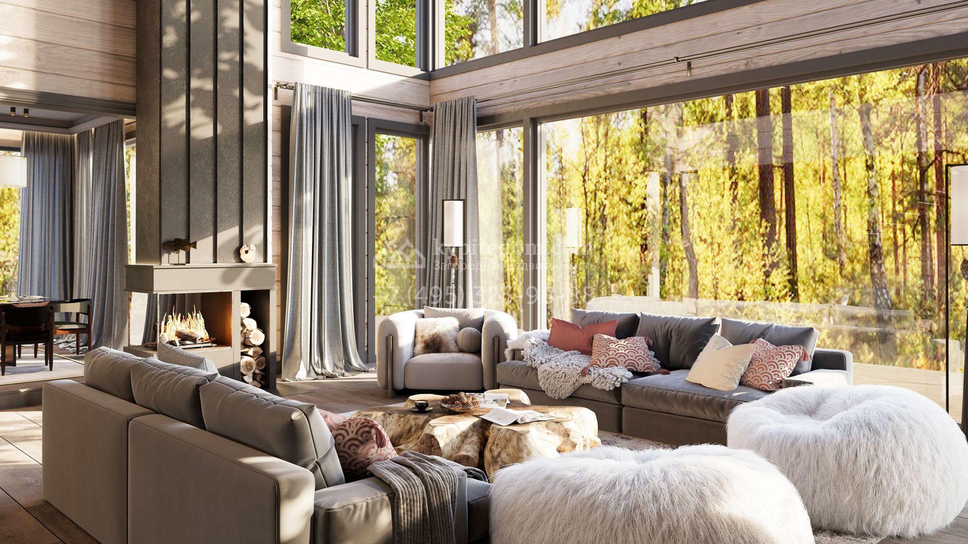 Загородный дом по проекту «Весна» площадью 550 м² расположен на участке 29 соток в реликтовом лесу. Фасад здания с большими панорамными окнами выполнен из клееного бруса увеличенного размера и декорирован подсветкой. В отделке современного интерьера сохранена фактура дерева, создающая домашний уют. Резиденция включает 5 спален, просторную гостиную с камином и вторым светом, кухню-столовую и террасу, на которой можно обустроить зону барбекю. На участке выполнен ландшафтный дизайн в стиле английского сада.