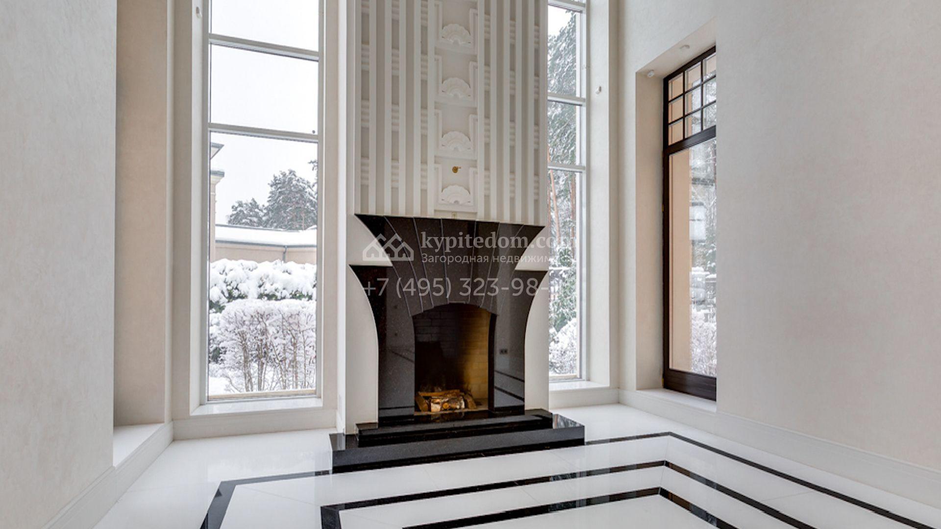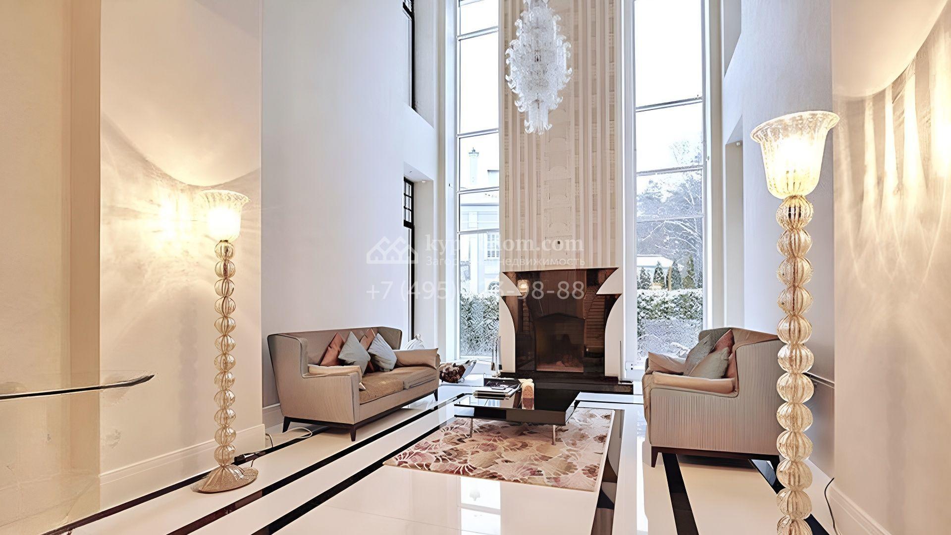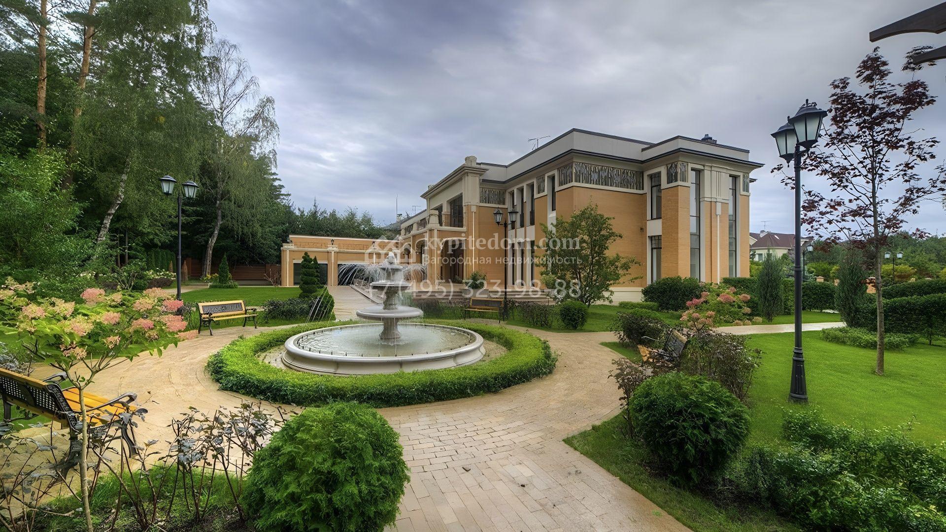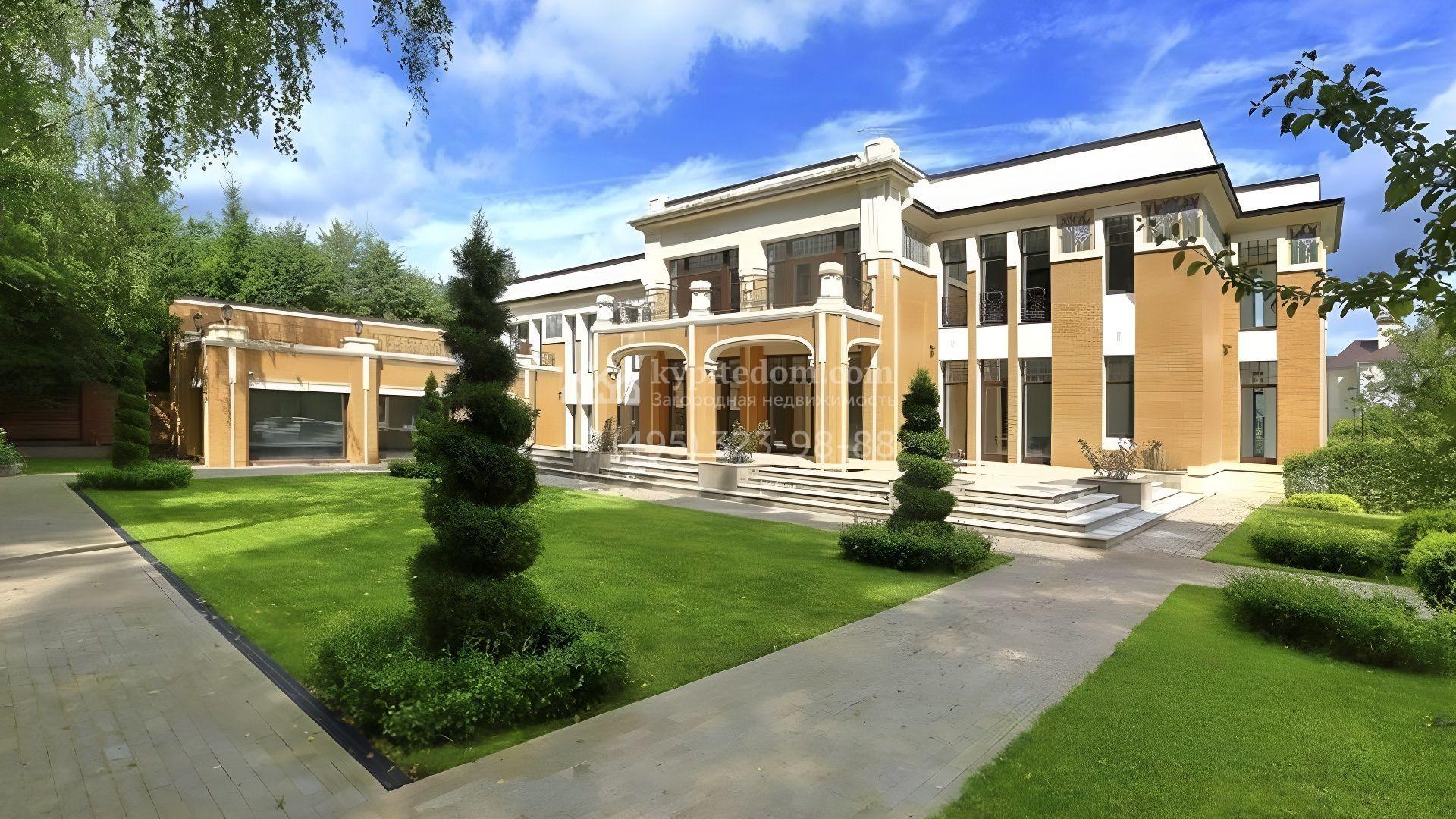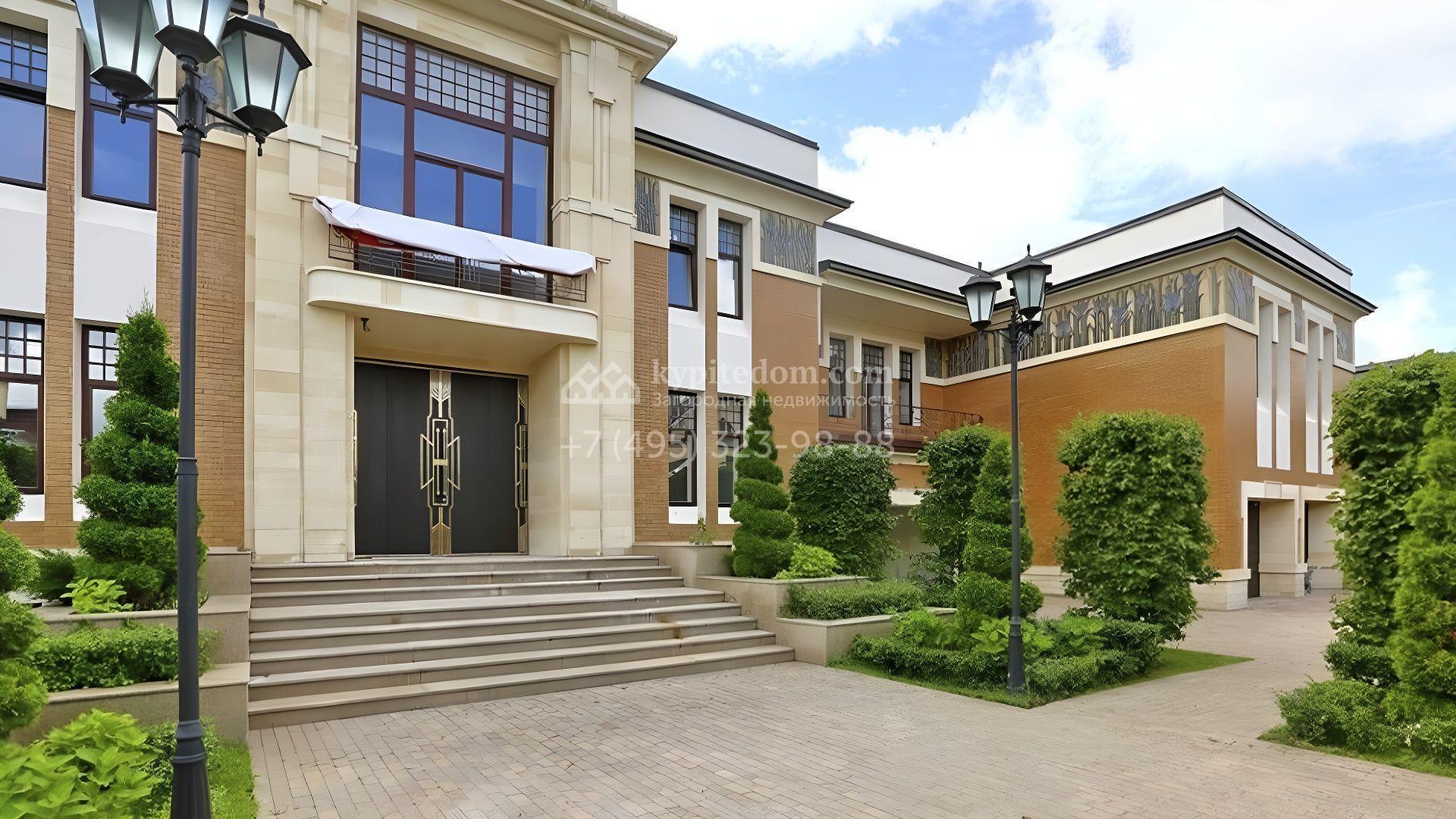 Представительная загородная резиденция площадью 1375 м² расположена на участке 98 соток у леса. Фасад в стиле «модерн» облицован клинкерным кирпичом, украшен рельефами и фресками с цветочным орнаментом. В здание встроен гараж для 3 машин. Интерьер резиденции выполнили в современном стиле в светлых тонах с использованием натурального камня и широкоформатного керамогранита. Кухня и санузлы дома оборудованы техникой лучших европейских брендов. Точкой притяжения дома служит гостиная с камином в стиле модерн — он встроен в резную колонну. В СПА-зоне оборудовали большой бассейн с сауной и соляной комнатой. На цокольном этаже разместили винную комнату и спальни персонала. На участке выполнили ландшафтный дизайн.