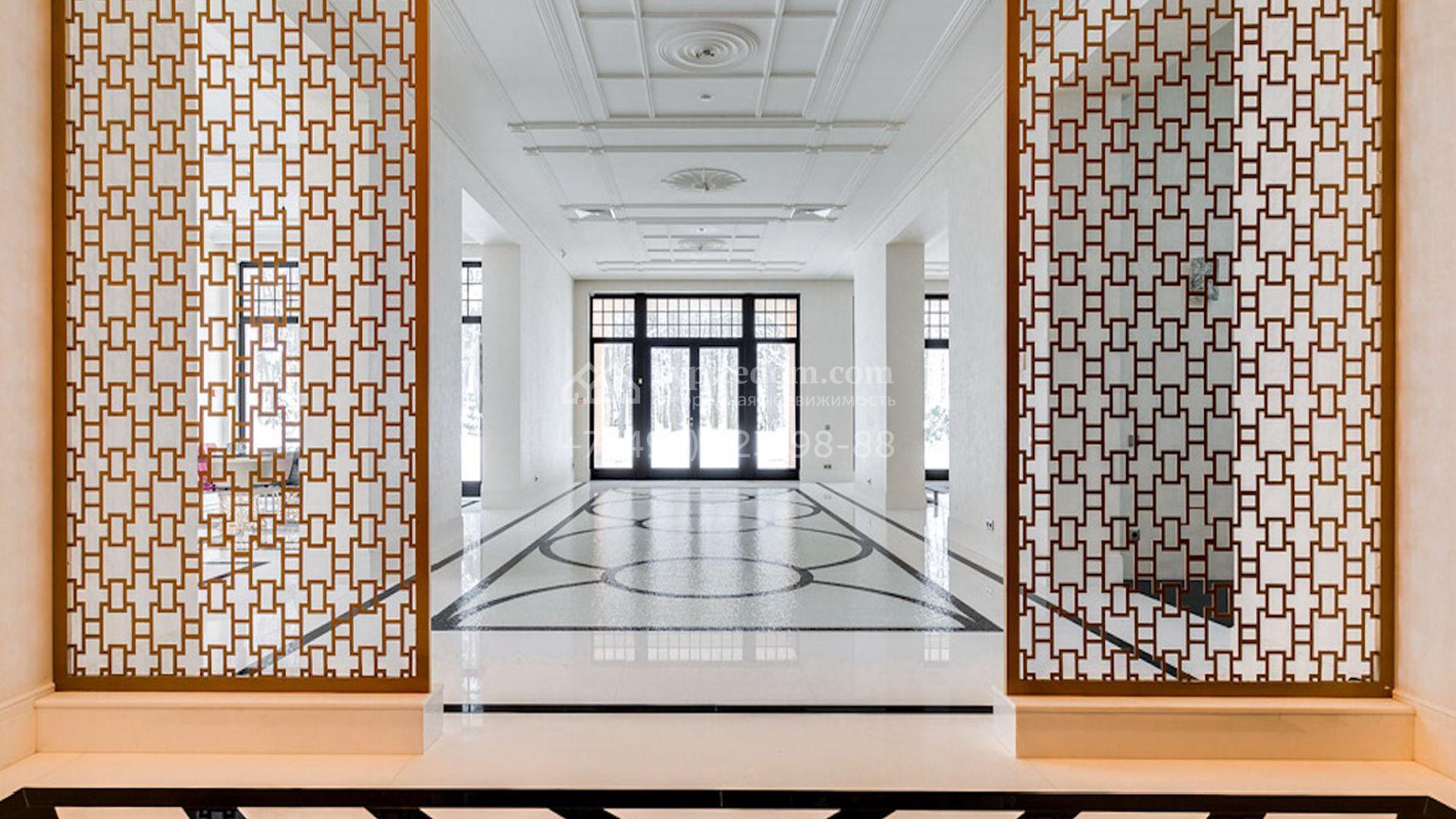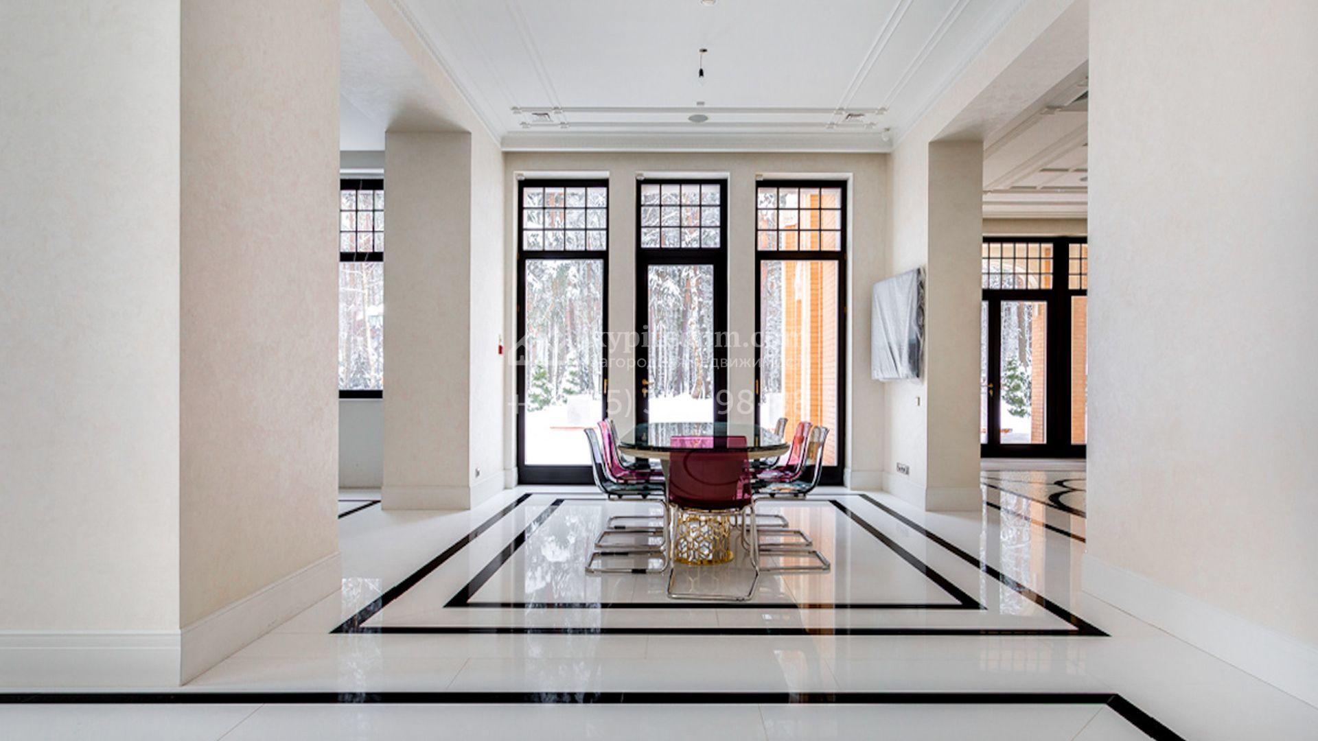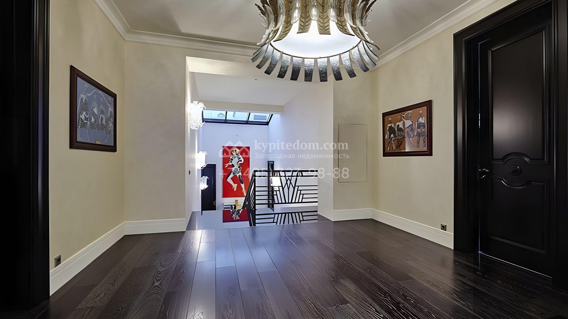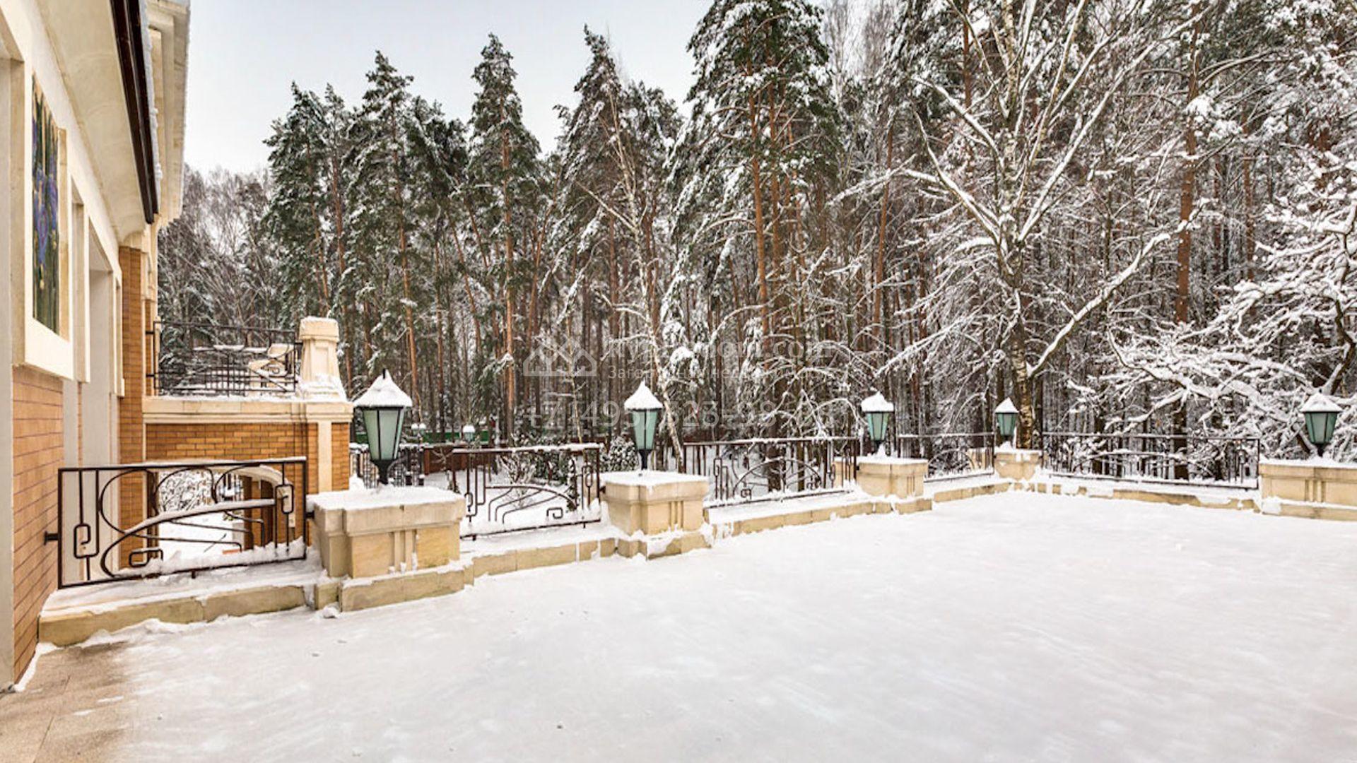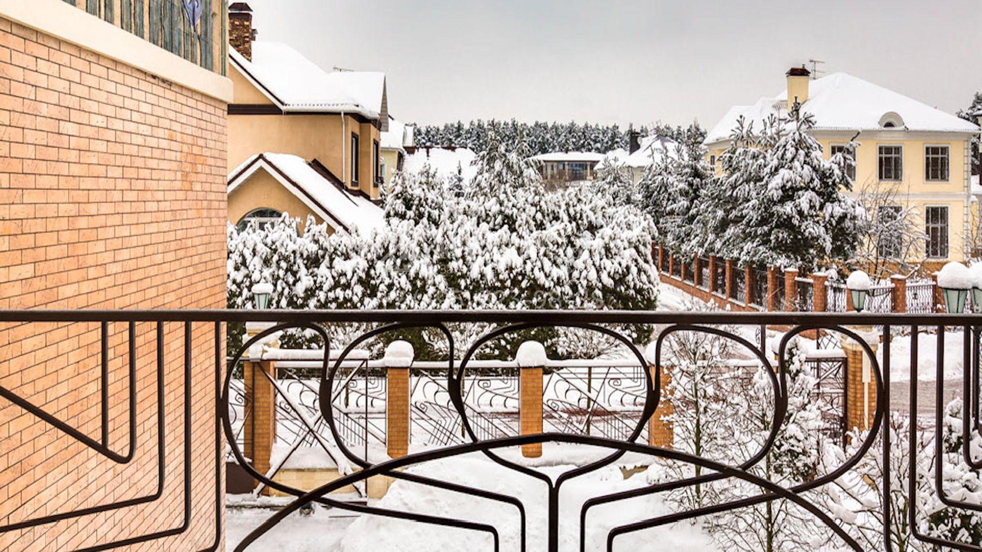Представительная загородная резиденция площадью 1375 м² расположена на участке 98 соток у леса. Фасад в стиле «модерн» облицован клинкерным кирпичом, украшен рельефами и фресками с цветочным орнаментом. В здание встроен гараж для 3 машин. Интерьер резиденции выполнили в современном стиле в светлых тонах с использованием натурального камня и широкоформатного керамогранита. Кухня и санузлы дома оборудованы техникой лучших европейских брендов. Точкой притяжения дома служит гостиная с камином в стиле модерн — он встроен в резную колонну. В СПА-зоне оборудовали большой бассейн с сауной и соляной комнатой. На цокольном этаже разместили винную комнату и спальни персонала. На участке выполнили ландшафтный дизайн.