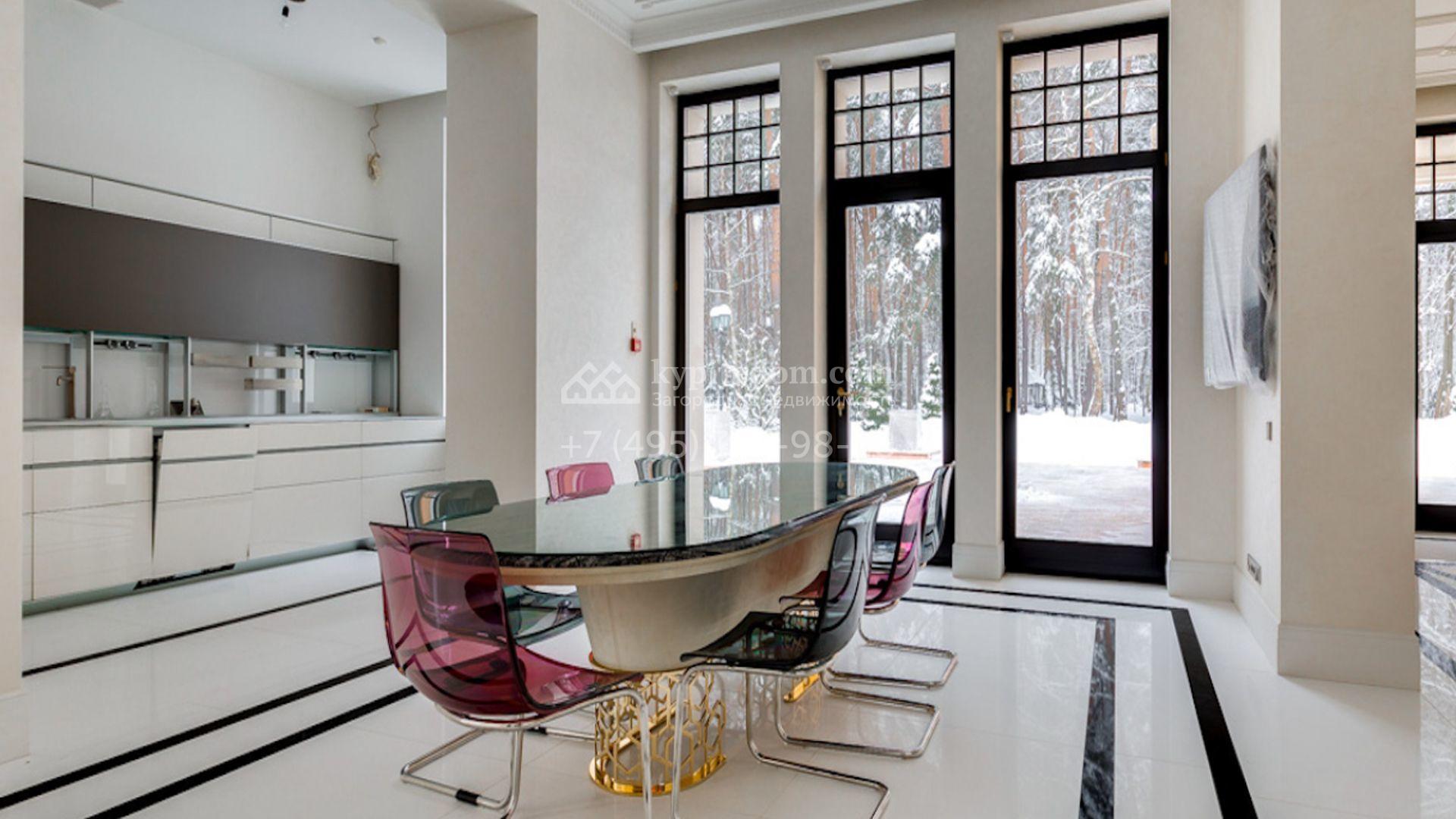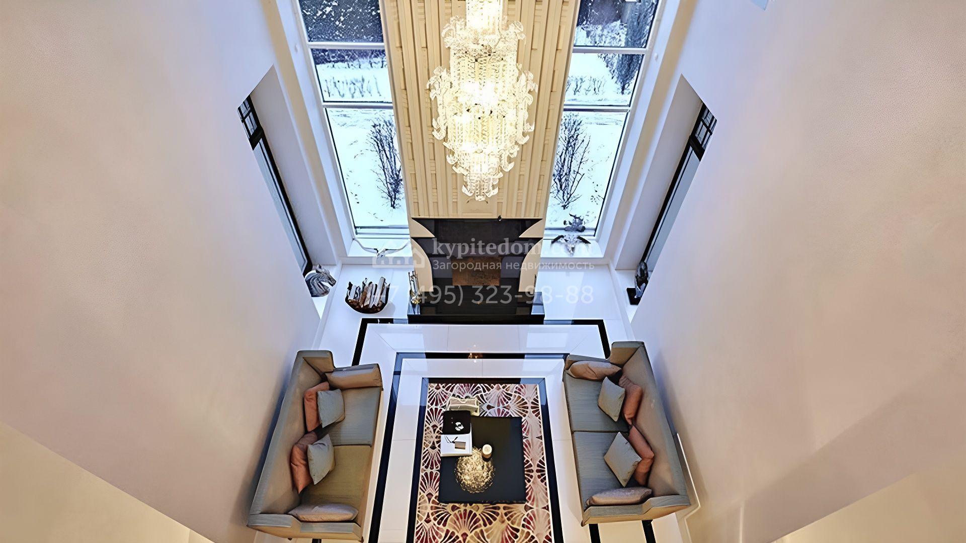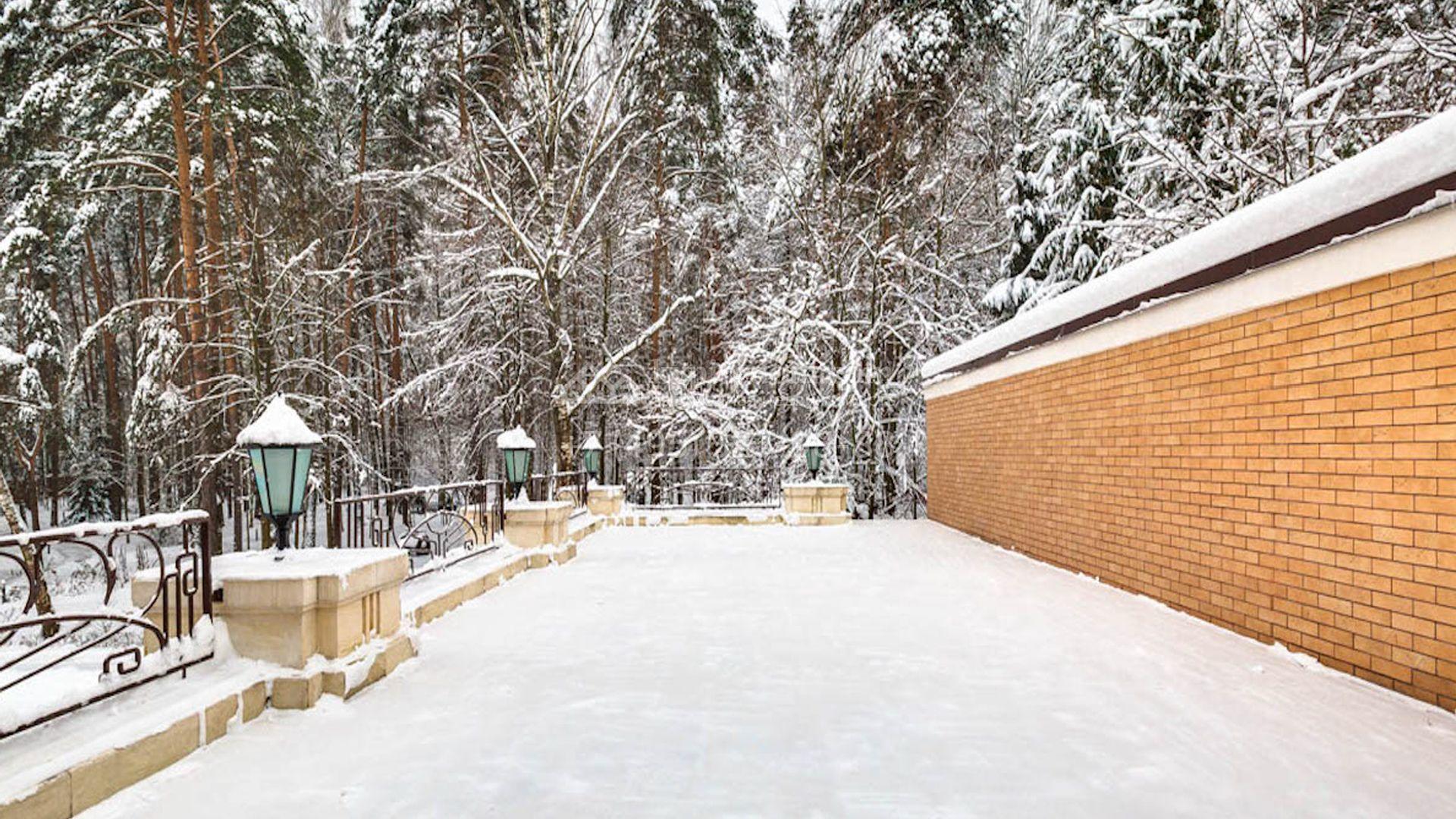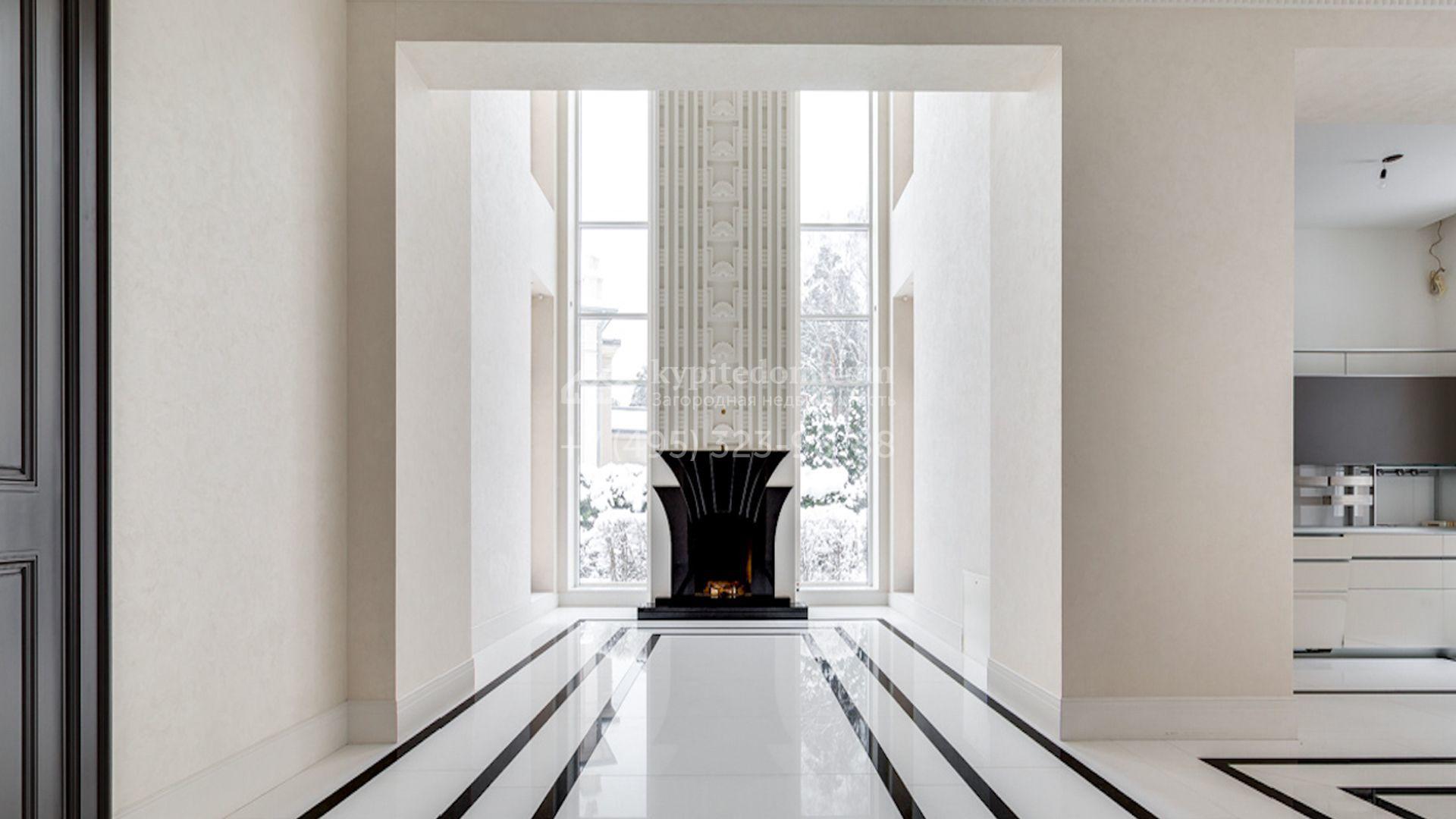Представительная загородная резиденция площадью 1375 м² расположена на участке 98 соток у леса. Фасад в стиле «модерн» облицован клинкерным кирпичом, украшен рельефами и фресками с цветочным орнаментом. В здание встроен гараж для 3 машин. Интерьер резиденции выполнили в современном стиле в светлых тонах с использованием натурального камня и широкоформатного керамогранита. Кухня и санузлы дома оборудованы техникой лучших европейских брендов. Точкой притяжения дома служит гостиная с камином в стиле модерн — он встроен в резную колонну. В СПА-зоне оборудовали большой бассейн с сауной и соляной комнатой. На цокольном этаже разместили винную комнату и спальни персонала. На участке выполнили ландшафтный дизайн.