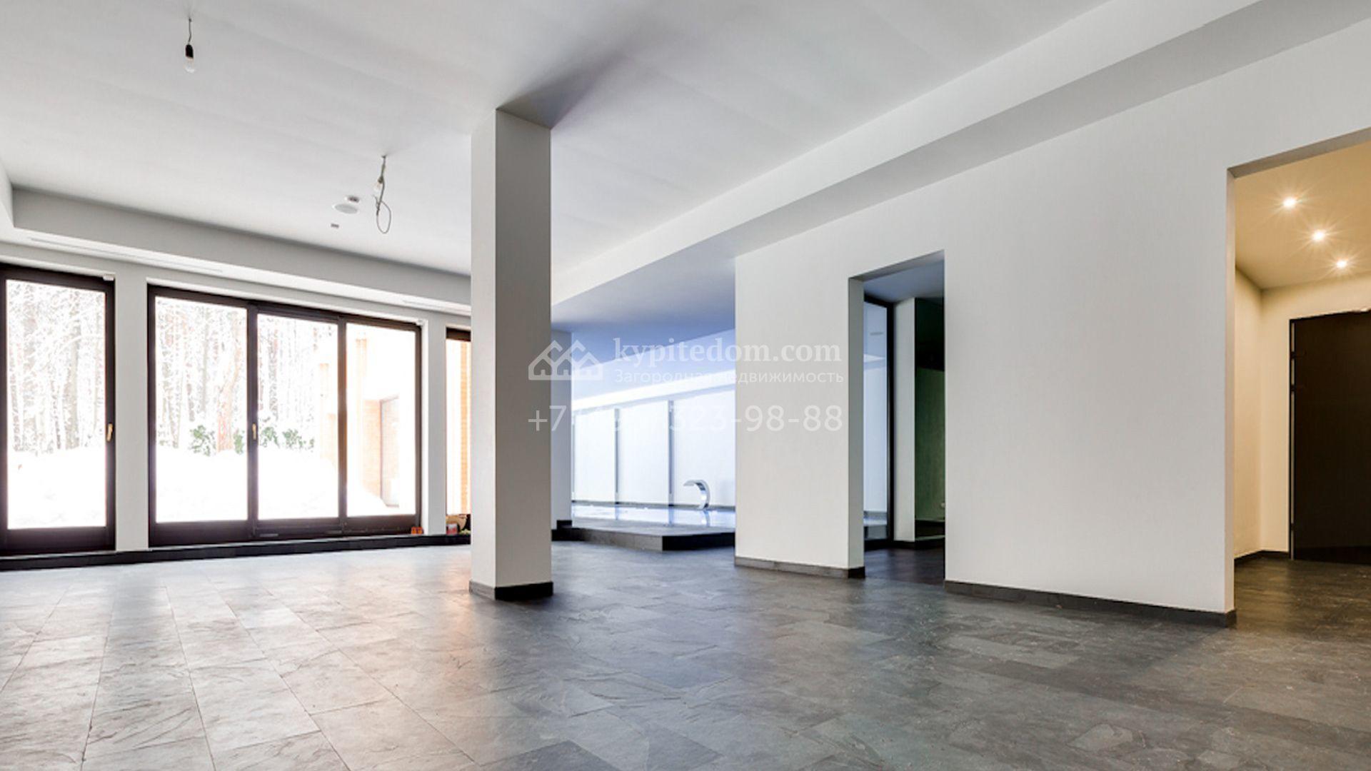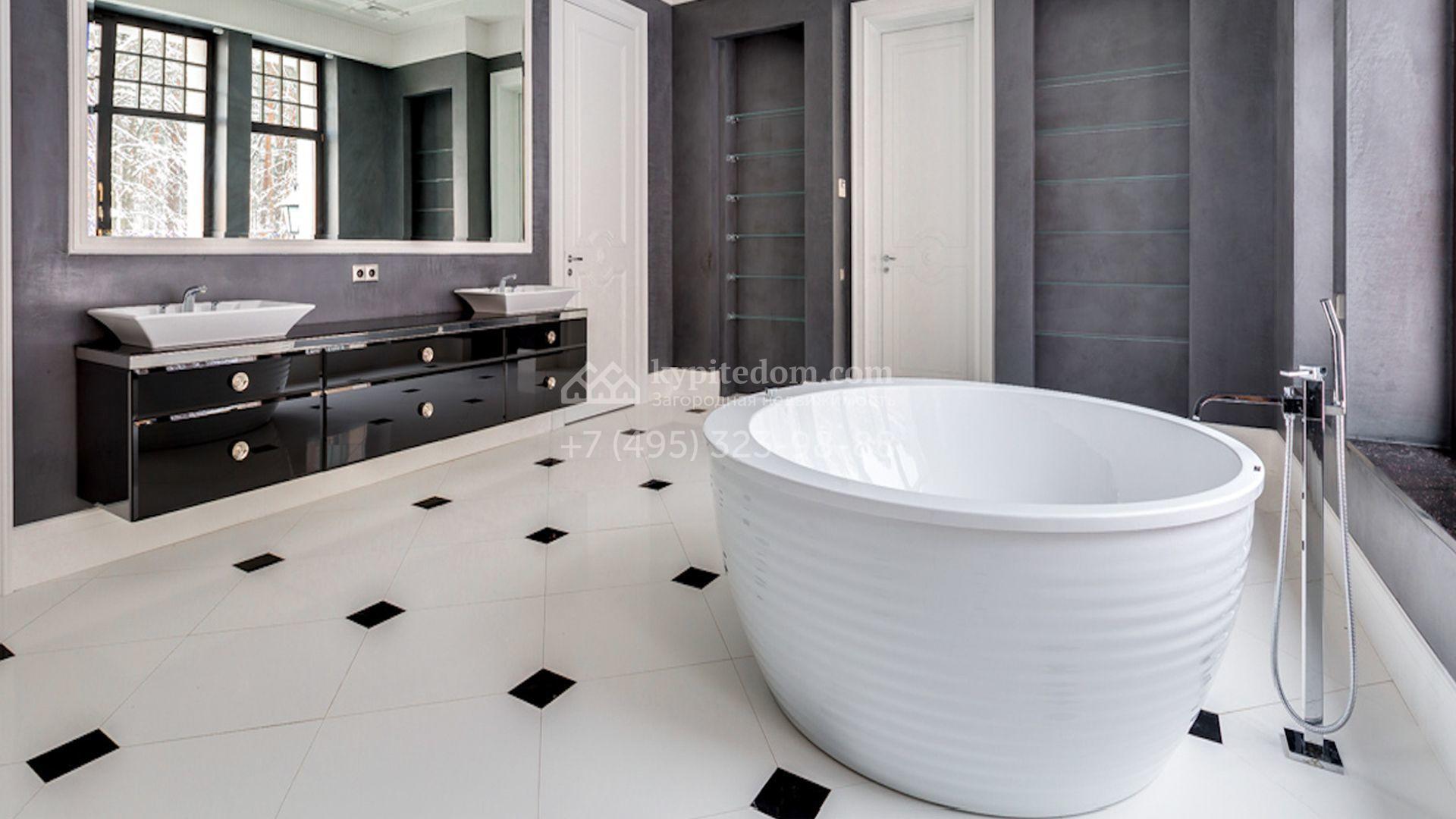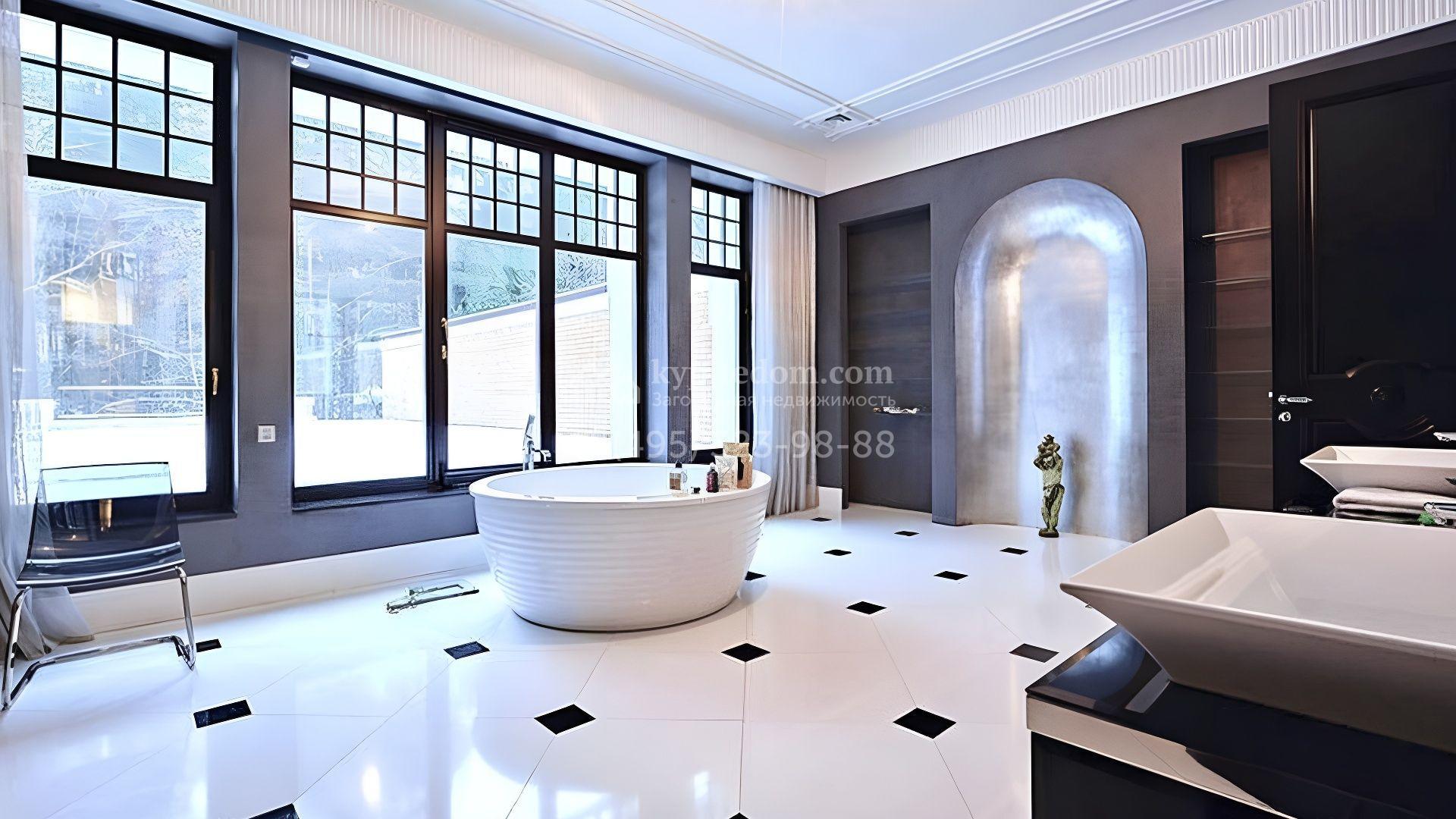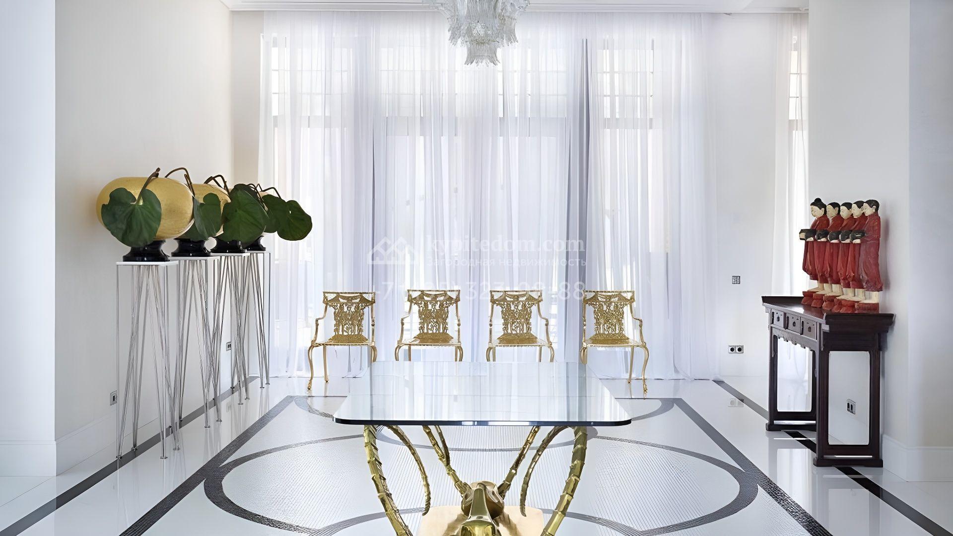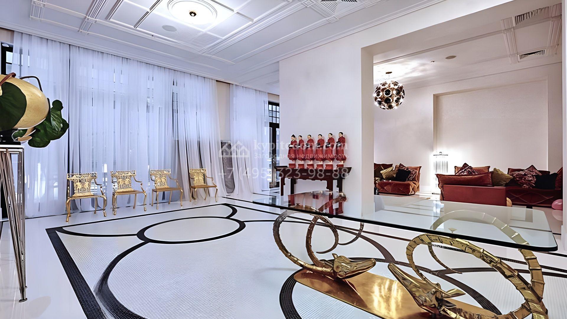 Представительная загородная резиденция площадью 1375 м² расположена на участке 98 соток у леса. Фасад в стиле «модерн» облицован клинкерным кирпичом, украшен рельефами и фресками с цветочным орнаментом. В здание встроен гараж для 3 машин. Интерьер резиденции выполнили в современном стиле в светлых тонах с использованием натурального камня и широкоформатного керамогранита. Кухня и санузлы дома оборудованы техникой лучших европейских брендов. Точкой притяжения дома служит гостиная с камином в стиле модерн — он встроен в резную колонну. В СПА-зоне оборудовали большой бассейн с сауной и соляной комнатой. На цокольном этаже разместили винную комнату и спальни персонала. На участке выполнили ландшафтный дизайн.