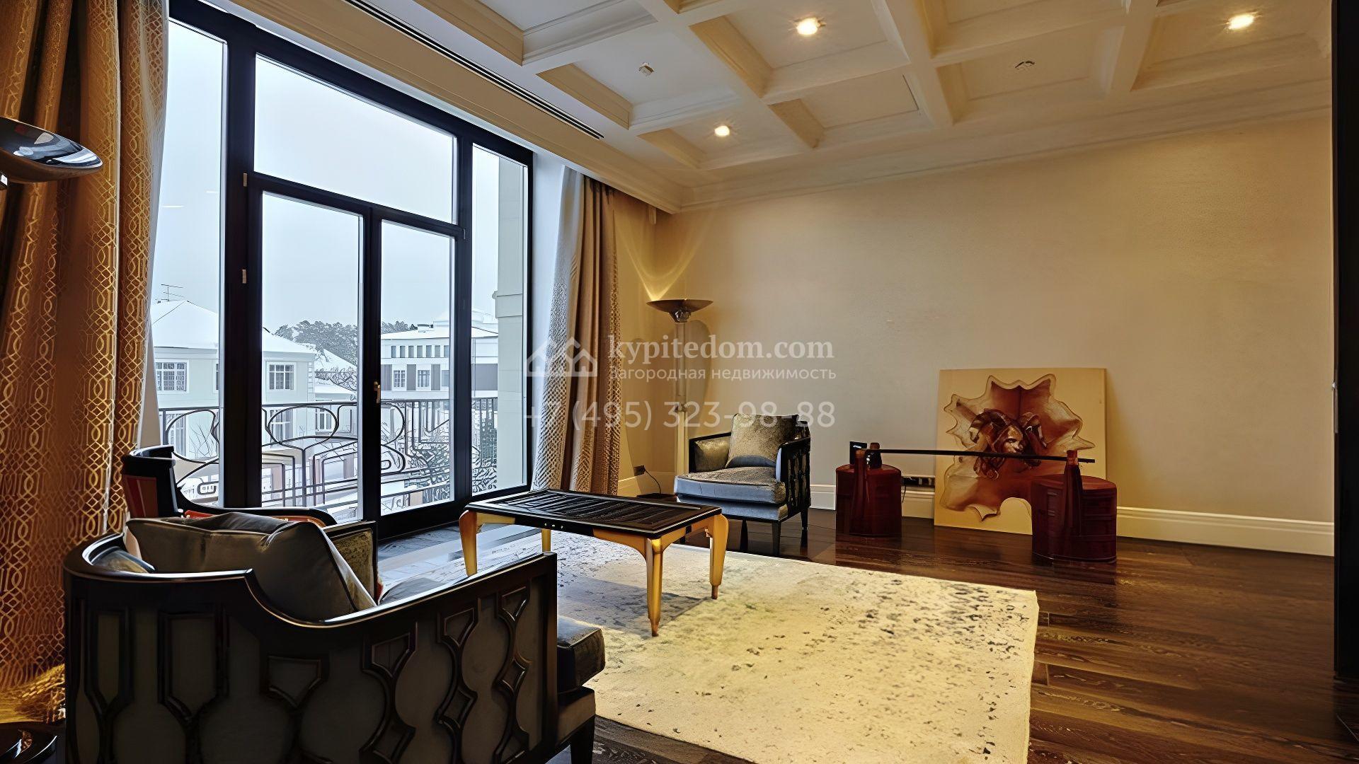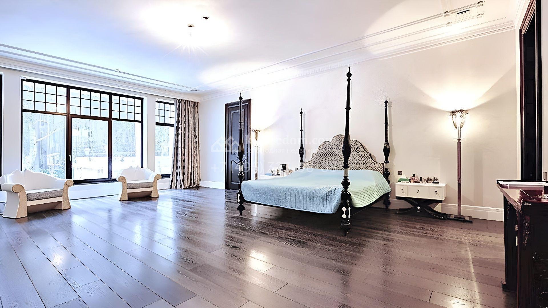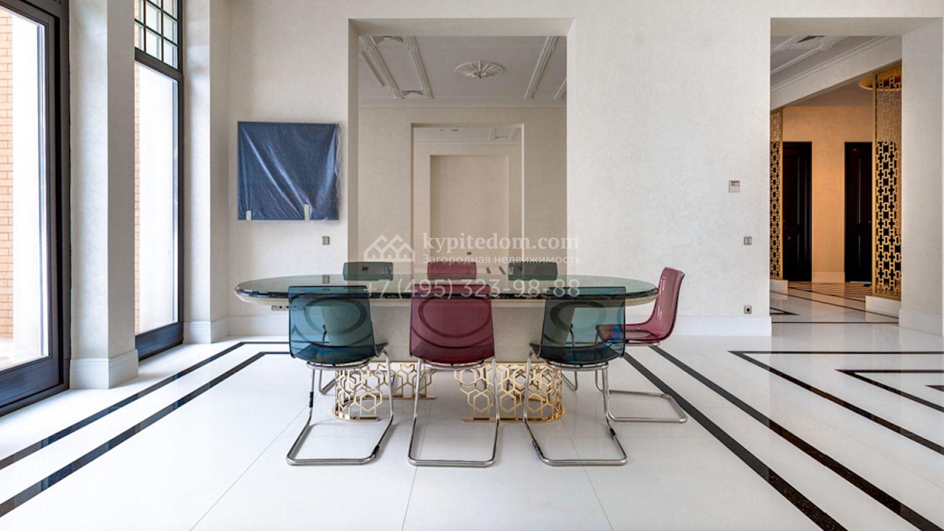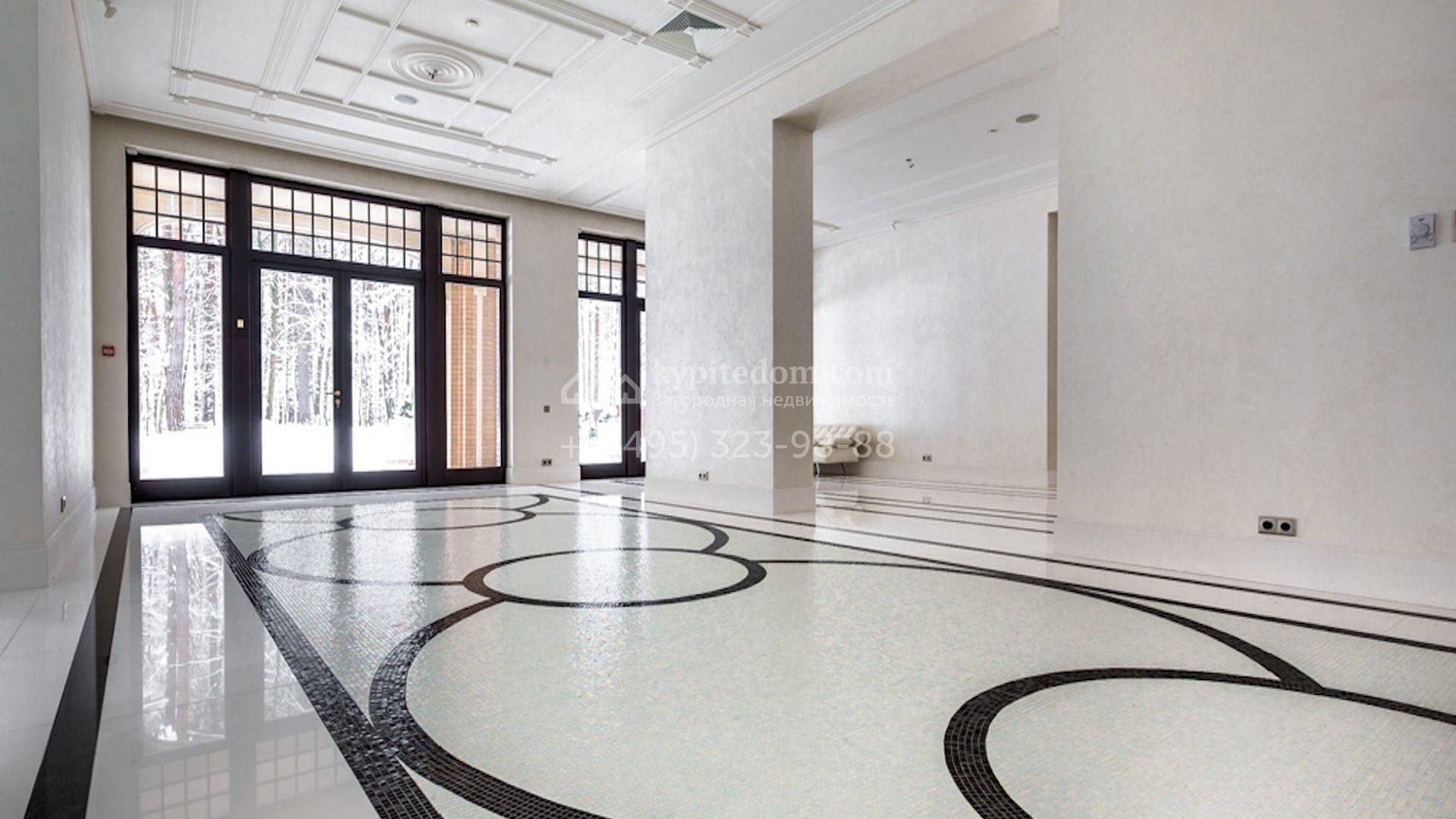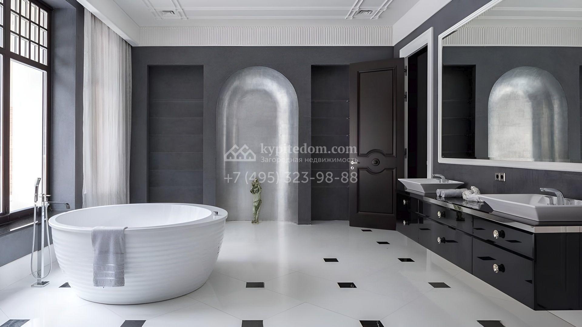 Представительная загородная резиденция площадью 1375 м² расположена на участке 98 соток у леса. Фасад в стиле «модерн» облицован клинкерным кирпичом, украшен рельефами и фресками с цветочным орнаментом. В здание встроен гараж для 3 машин. Интерьер резиденции выполнили в современном стиле в светлых тонах с использованием натурального камня и широкоформатного керамогранита. Кухня и санузлы дома оборудованы техникой лучших европейских брендов. Точкой притяжения дома служит гостиная с камином в стиле модерн — он встроен в резную колонну. В СПА-зоне оборудовали большой бассейн с сауной и соляной комнатой. На цокольном этаже разместили винную комнату и спальни персонала. На участке выполнили ландшафтный дизайн.