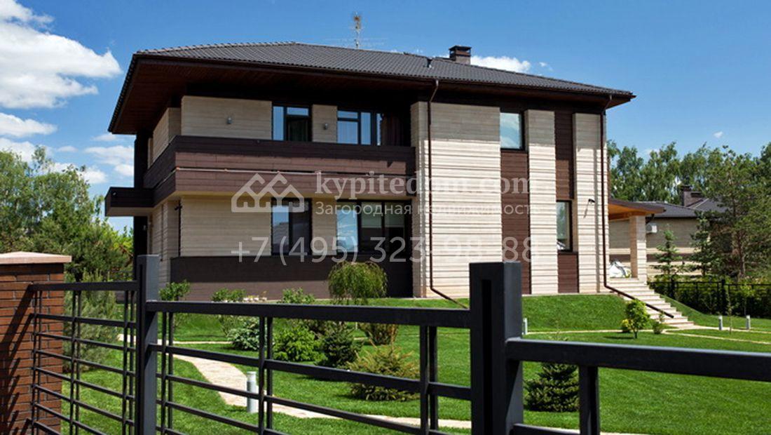 Двухэтажный коттедж без отделки построен на полевом участке 12 соток. Современный фасад дома облицован керамическим крупноформатным камнем, бетонной плиткой и фасадной доской. Первый этаж занимает встроенный гараж, кухня-остров, гостиная и кабинет с выходами на террасу. На втором этаже 3 спальни, 2 санузла и 2 балкона. Общая площадь дома 344 м².