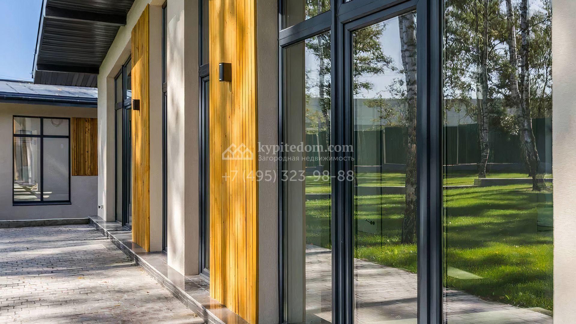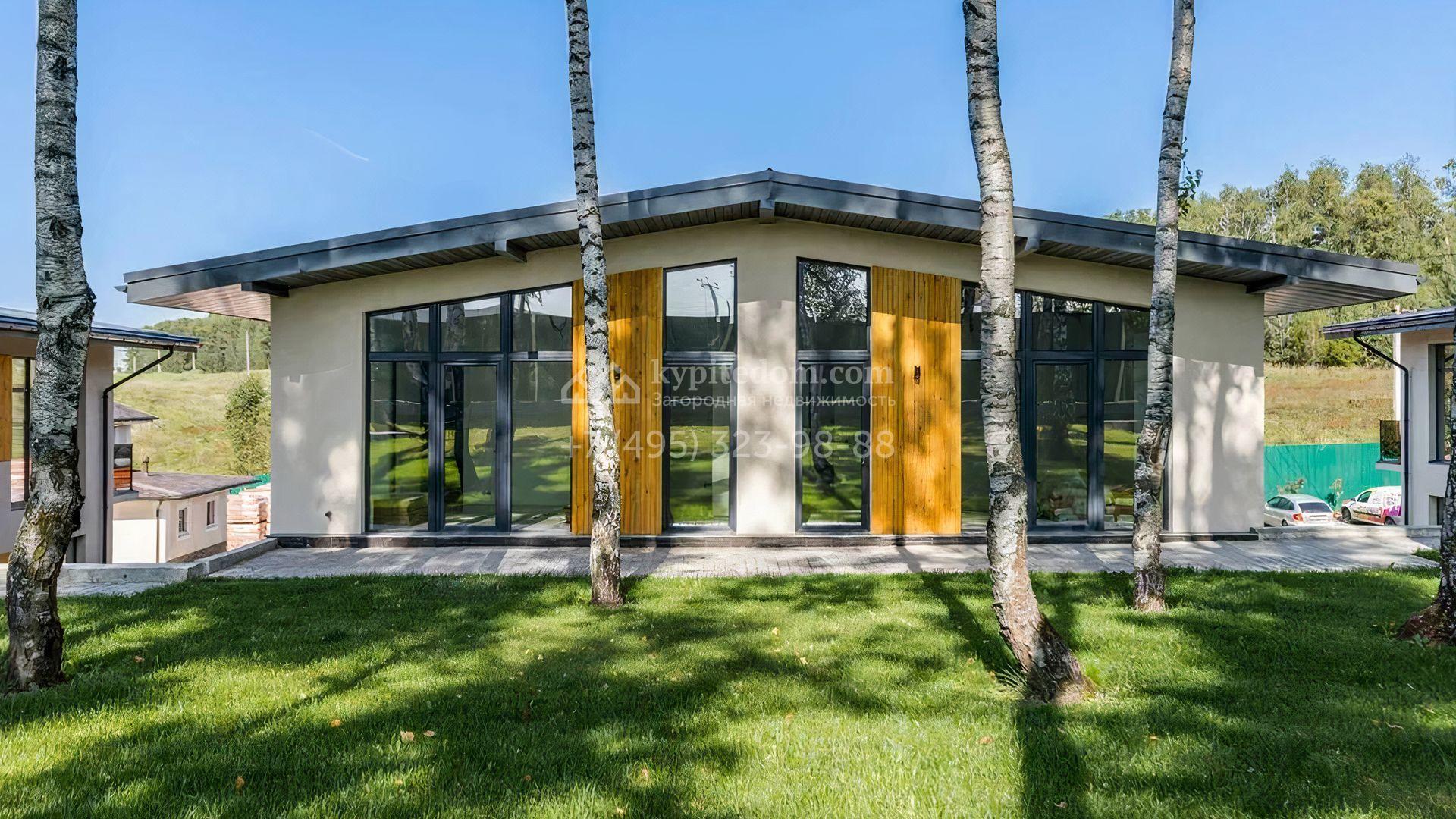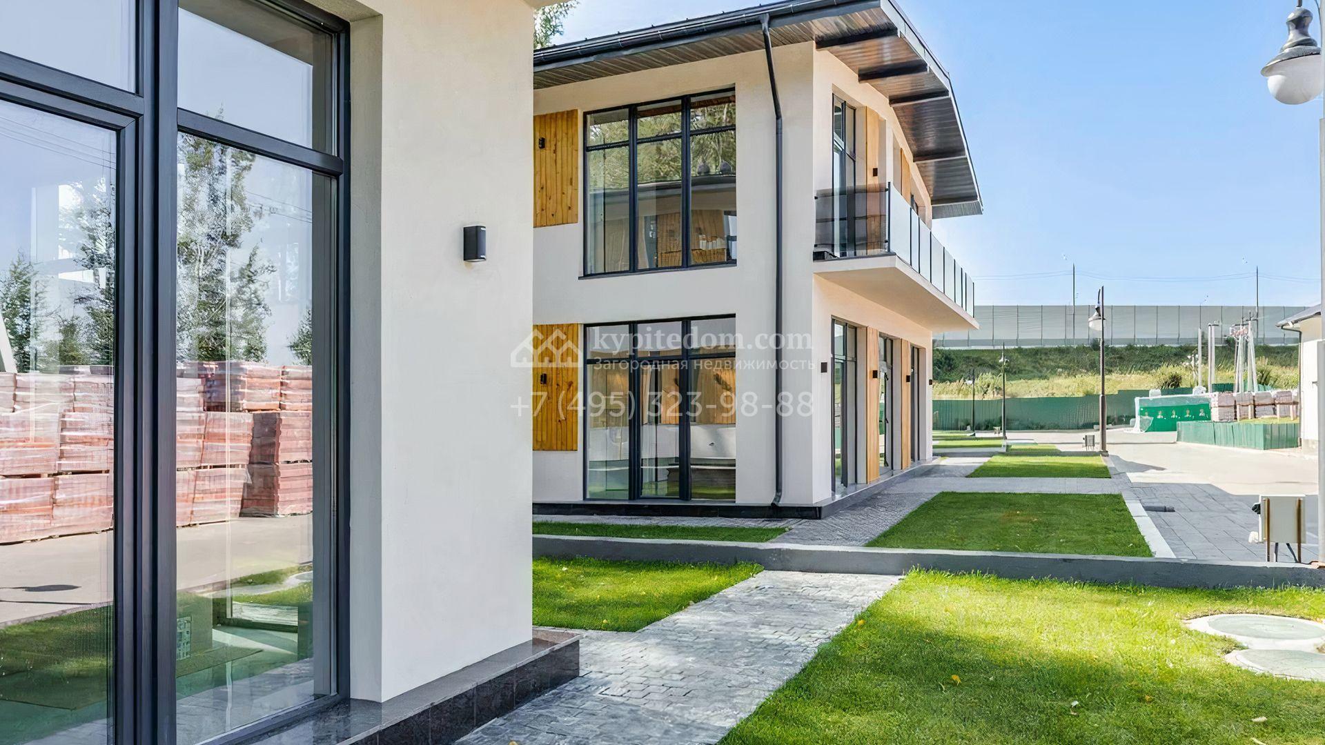 Загородный дом c отделкой под ключ площадью 257 м² построен на уютном участке 7 соток. Фасад двухэтажного здания из кирпича выполнен в современном стиле, облицован штукатуркой и декорирован подсветкой. Благодаря большим окнам внутреннее пространство наполнено воздухом и светом. В резиденции можно организовать несколько спален, также предусмотрены гостиная, кухня и зона столовой. На участке выполнен ландшафтный дизайн, вымощены дорожки, засеян газон и установлено уличное освещение.