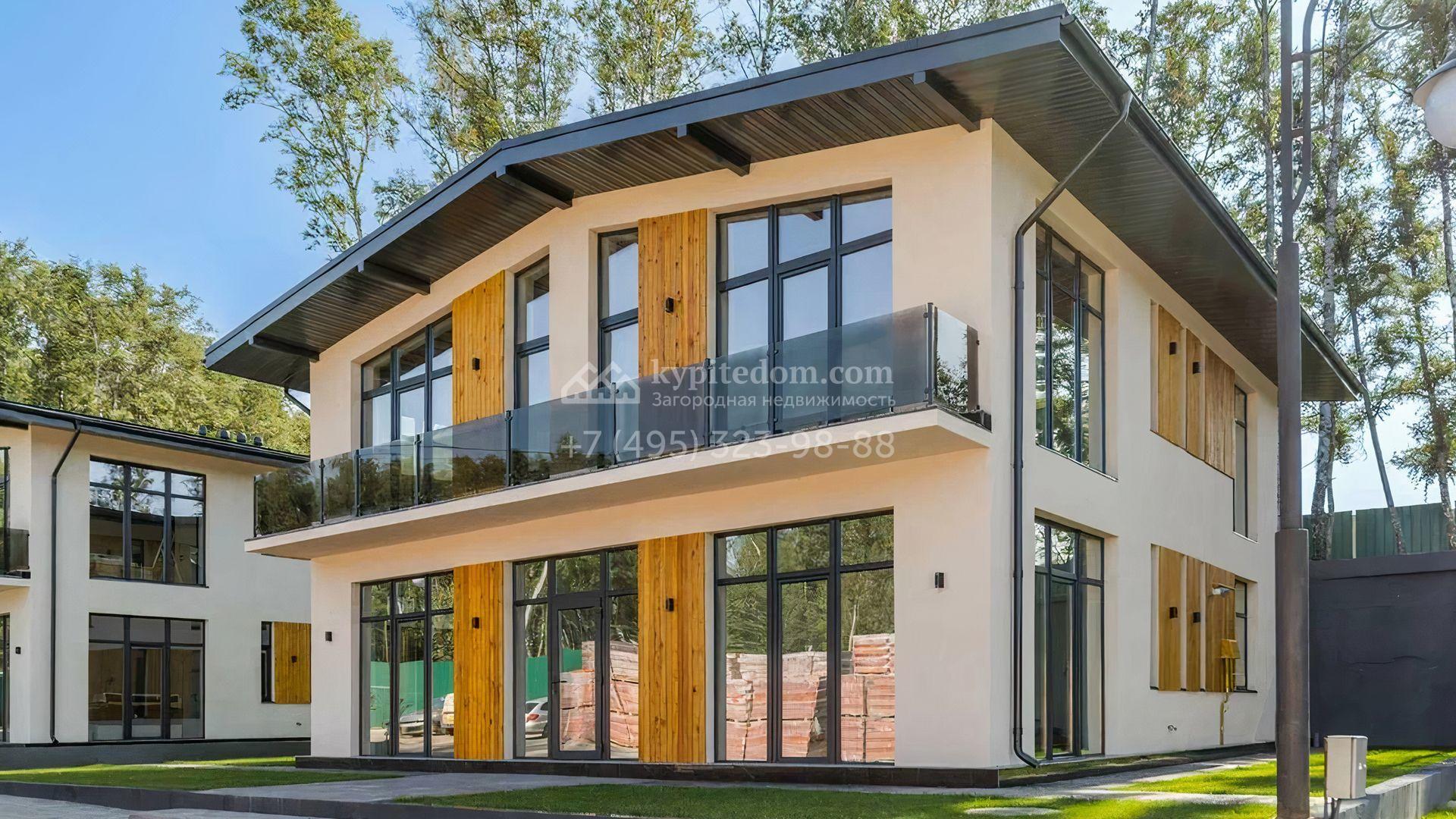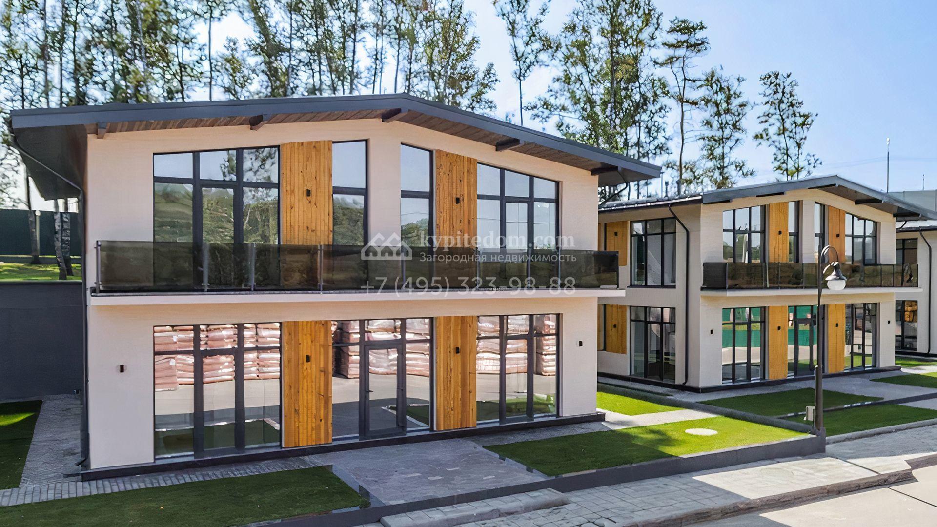Загородный дом c отделкой whitebox площадью 257 м² построен на уютном участке 7 соток. Фасад двухэтажного здания из кирпича выполнен в современном стиле, облицован штукатуркой и декорирован подсветкой. Благодаря большим окнам внутреннее пространство наполнено воздухом и светом. В резиденции можно организовать несколько спален, также предусмотрены гостиная, кухня и зона столовой. На участке выполнен ландшафтный дизайн, вымощены дорожки, засеян газон и установлено уличное освещение.