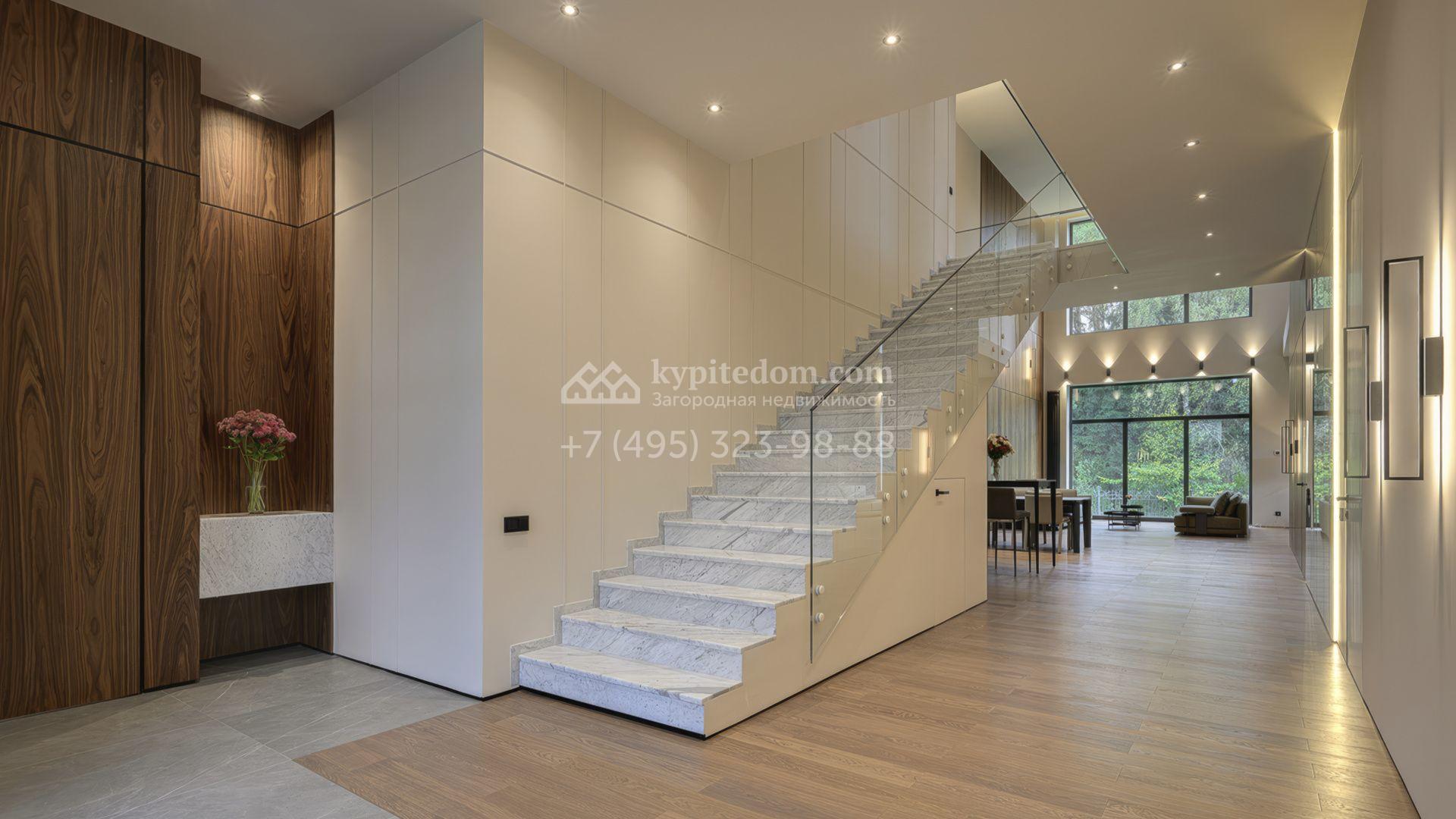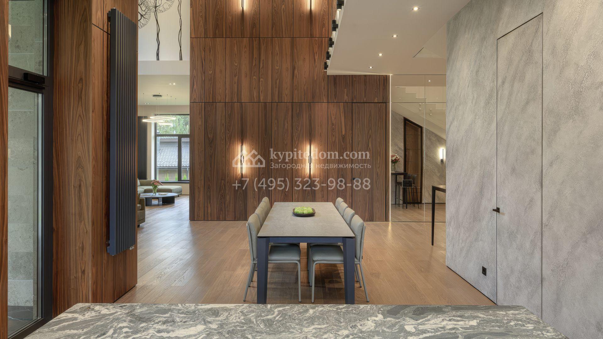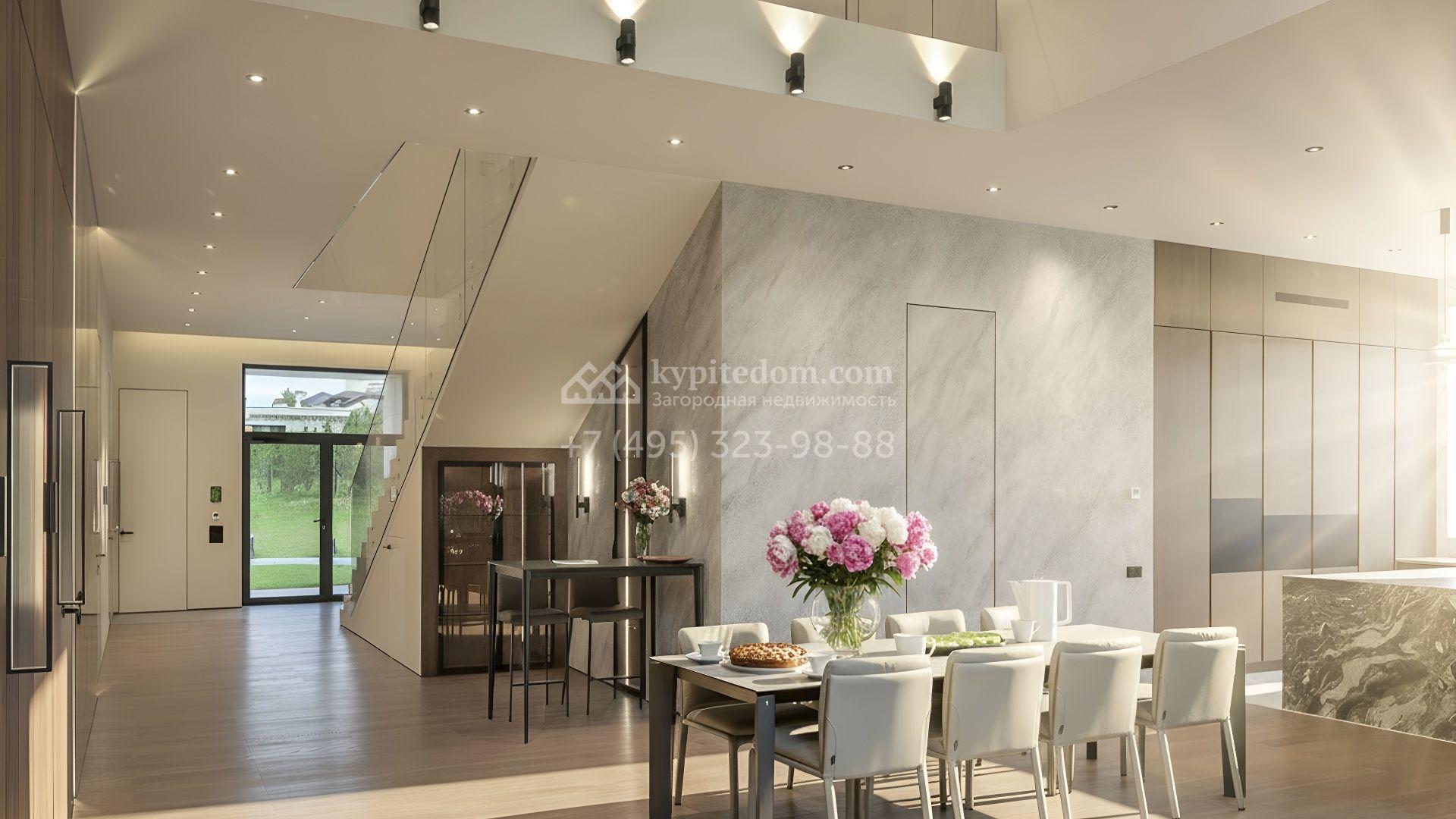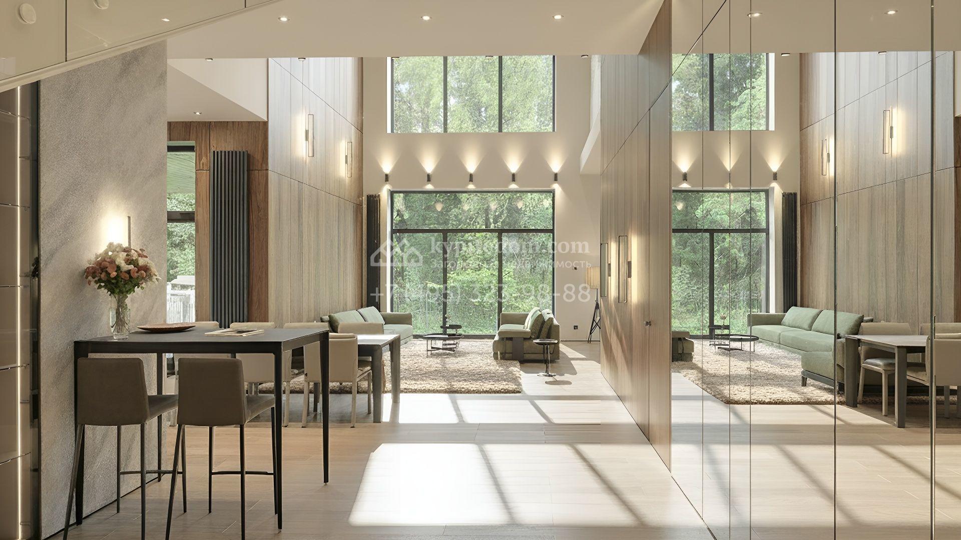 Новый загородный дом площадью 622 м² расположен на прилесном участке 30,2 сотки. В современном дизайне фасада с большими окнами и подсветкой гармонично сочетаются контрастные оттенки и фактуры камня и дерева. Благодаря высоким потолкам и второму свету коттедж заполнен светом и воздухом. Интерьер выдержан в спокойных тонах, поэтому будущим владельцам будет легко подобрать подходящую мебель на свой вкус.