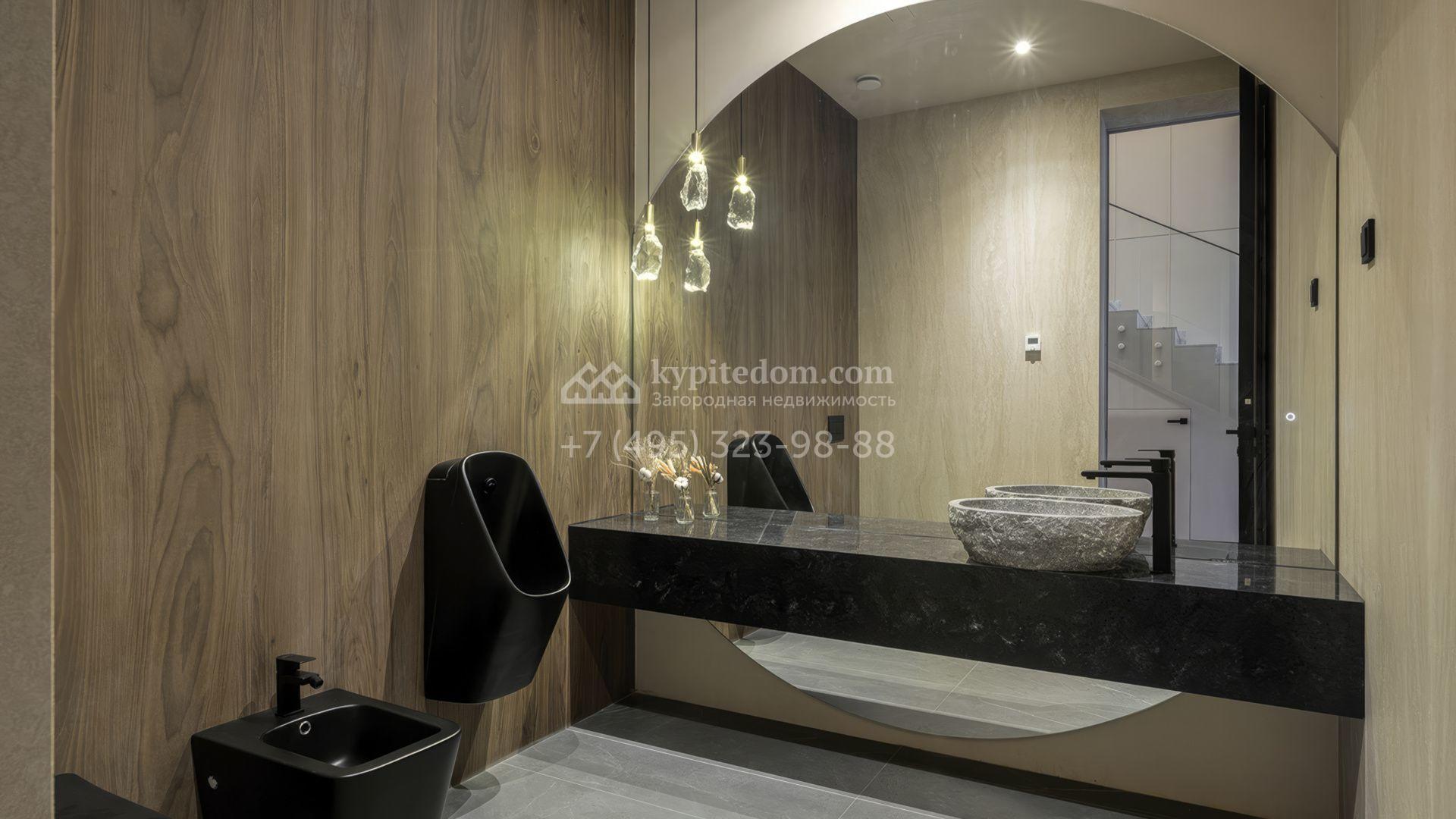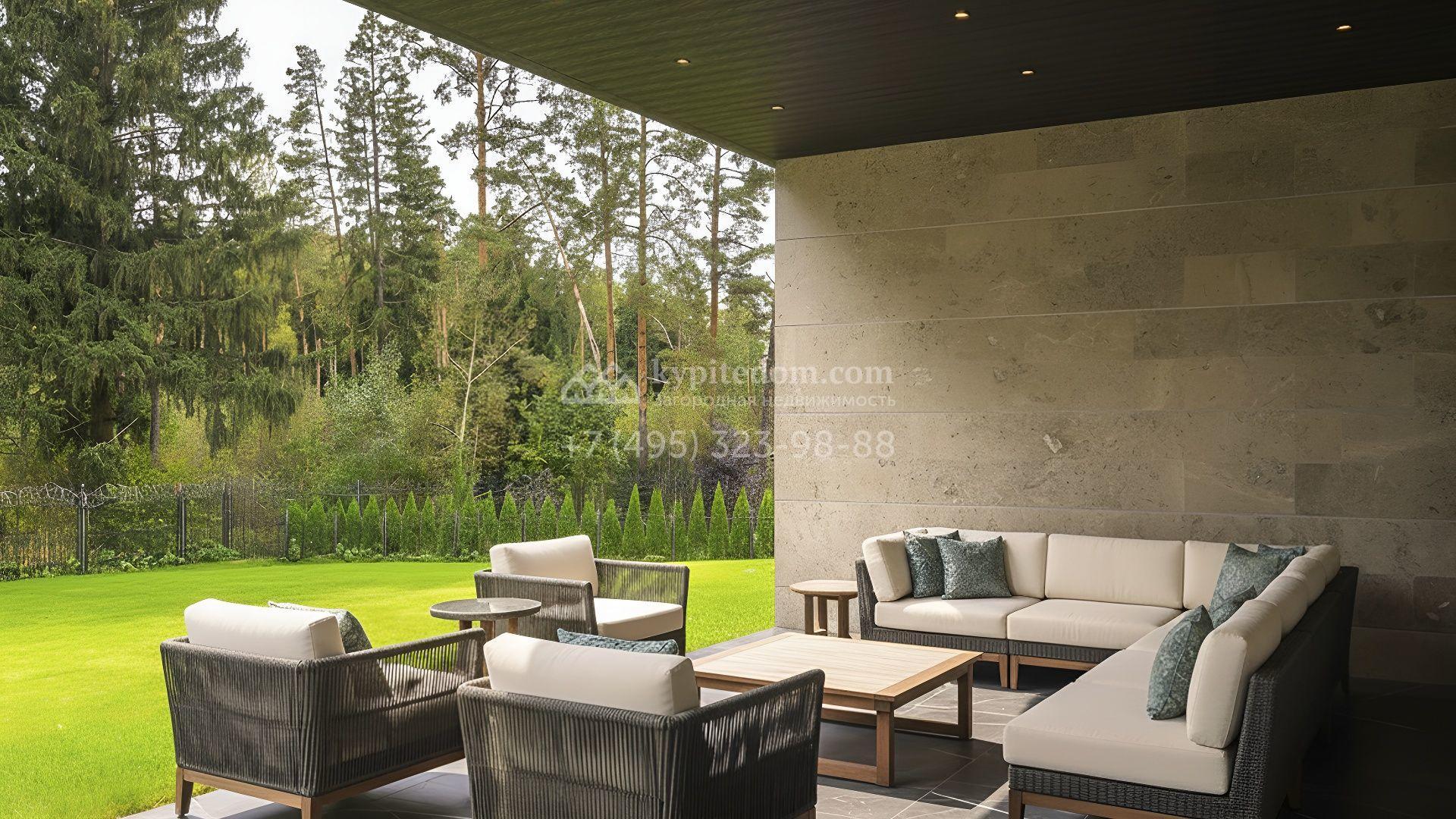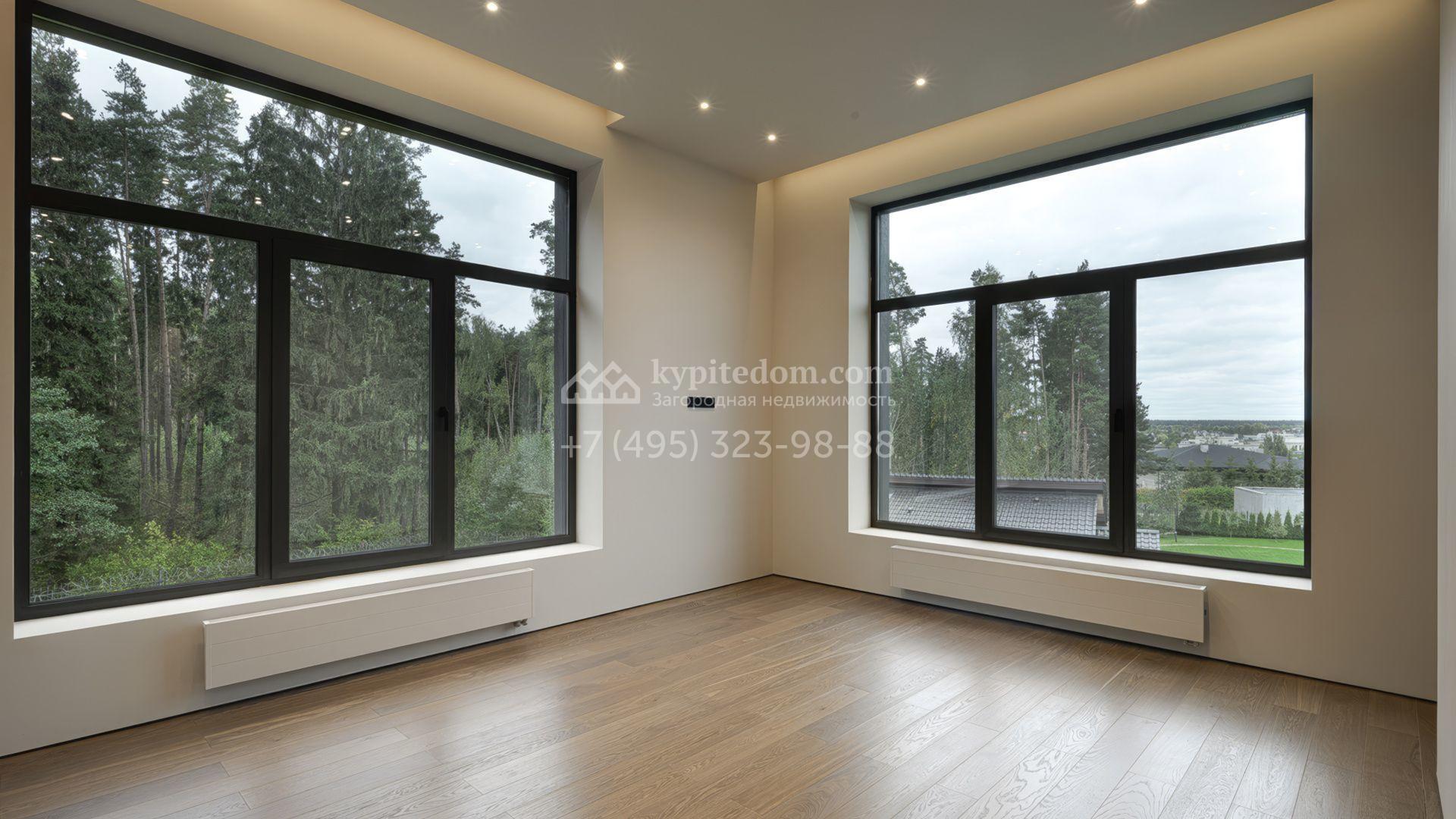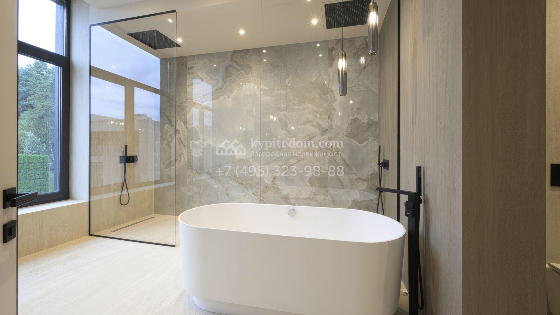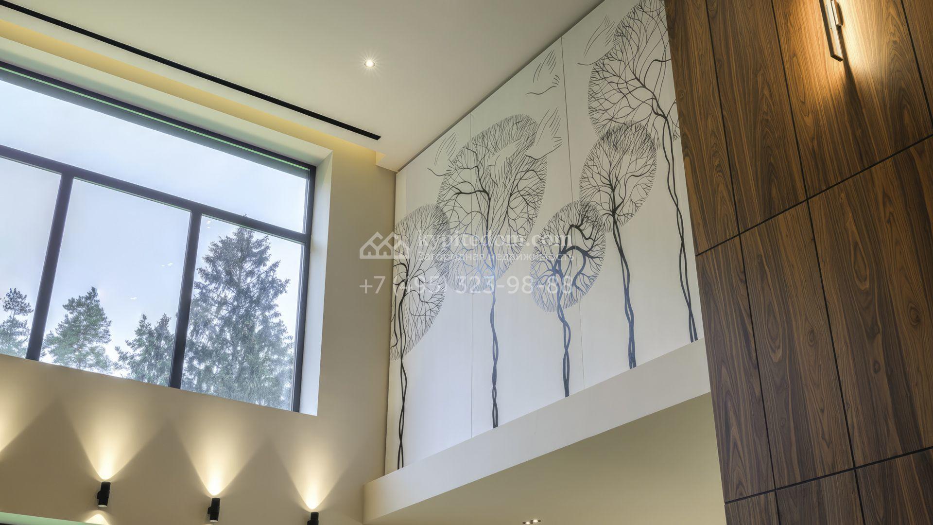 Планировка включает просторную гостиную-кухню-столовую с дровяным камином, TV-зоной и баром, кабинет и 6 спален, 2 из которых можно использовать, как блок для персонала. На территории предусмотрено место для строительства гостевого дома или банного комплекса площадью 500 м², а также во дворе можно обустроить уютную зону для барбекю. На участке выполнен ландшафтный дизайн, засеян газон, растут лесные деревья, вдоль вымощенных дорожек оборудовано уличное освещение.