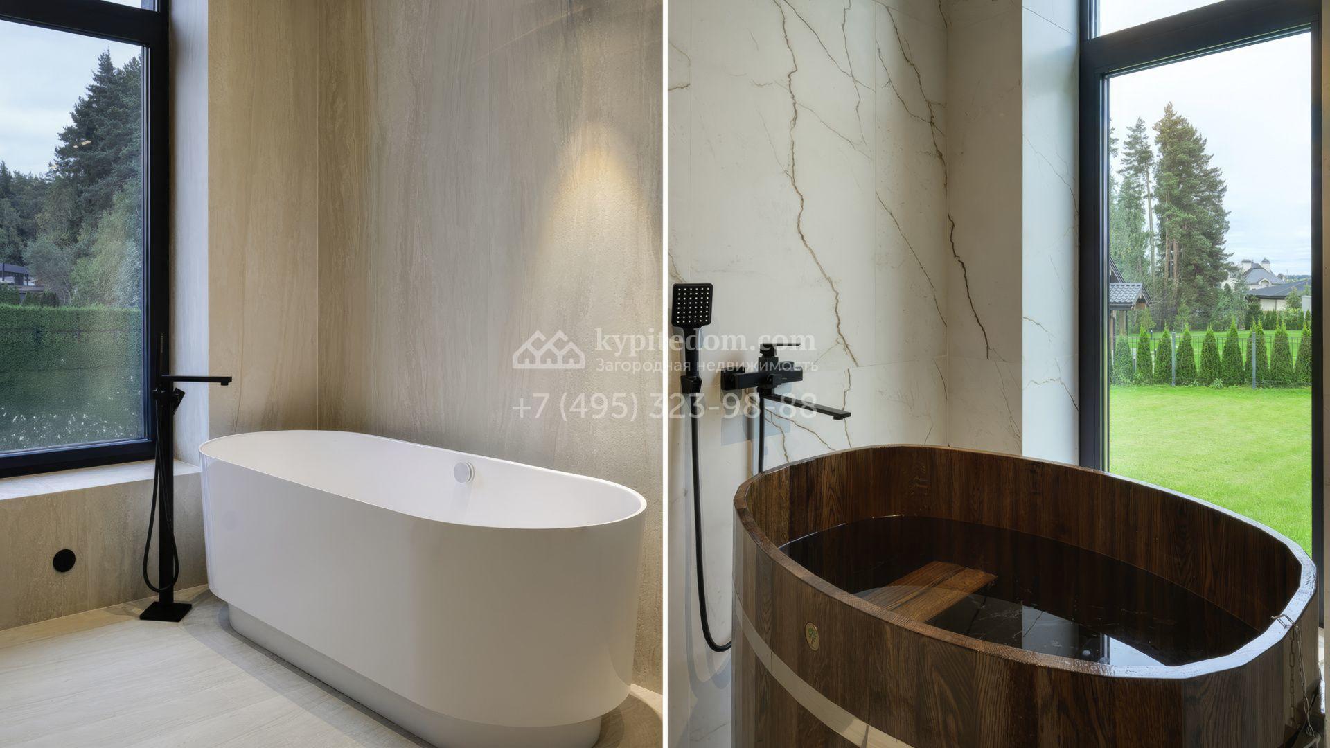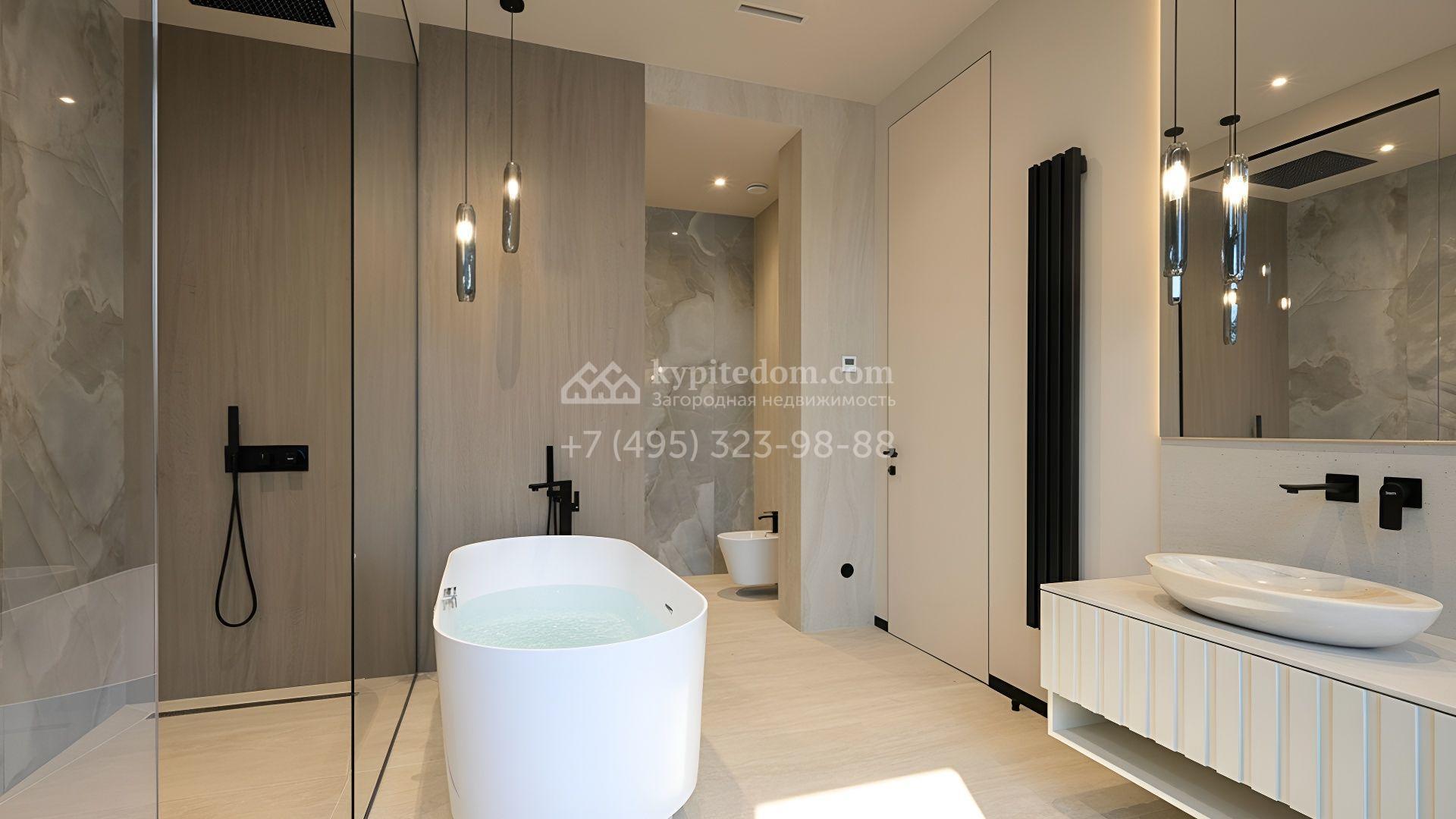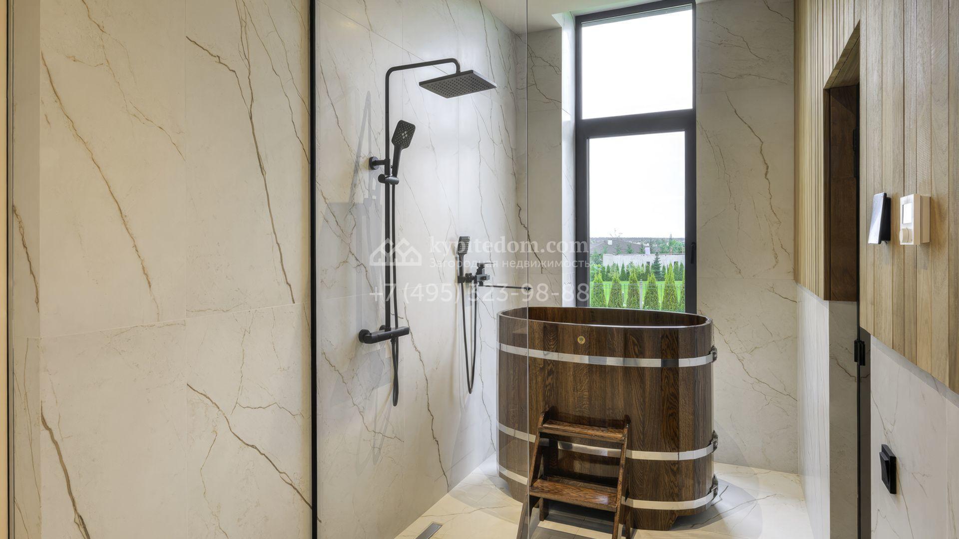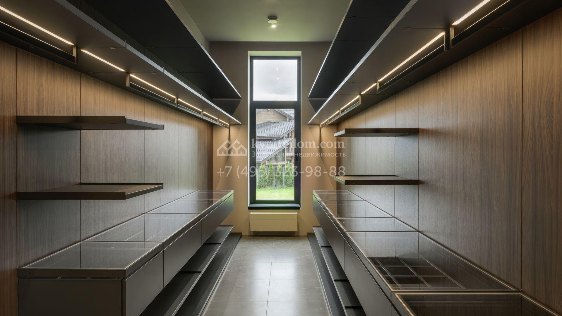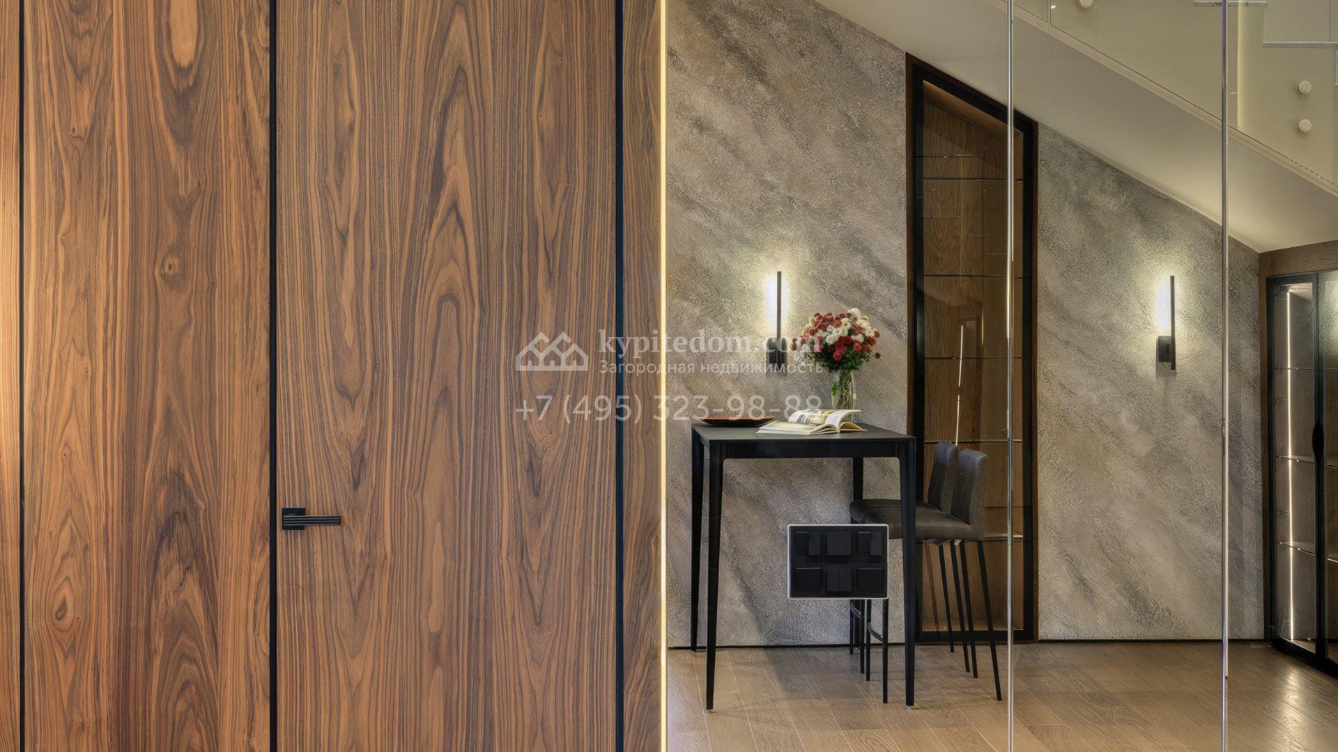Планировка включает просторную гостиную-кухню-столовую с дровяным камином, TV-зоной и баром, кабинет и 6 спален, 2 из которых можно использовать, как блок для персонала. На территории предусмотрено место для строительства гостевого дома или банного комплекса площадью 500 м², а также во дворе можно обустроить уютную зону для барбекю. На участке выполнен ландшафтный дизайн, засеян газон, растут лесные деревья, вдоль вымощенных дорожек оборудовано уличное освещение.