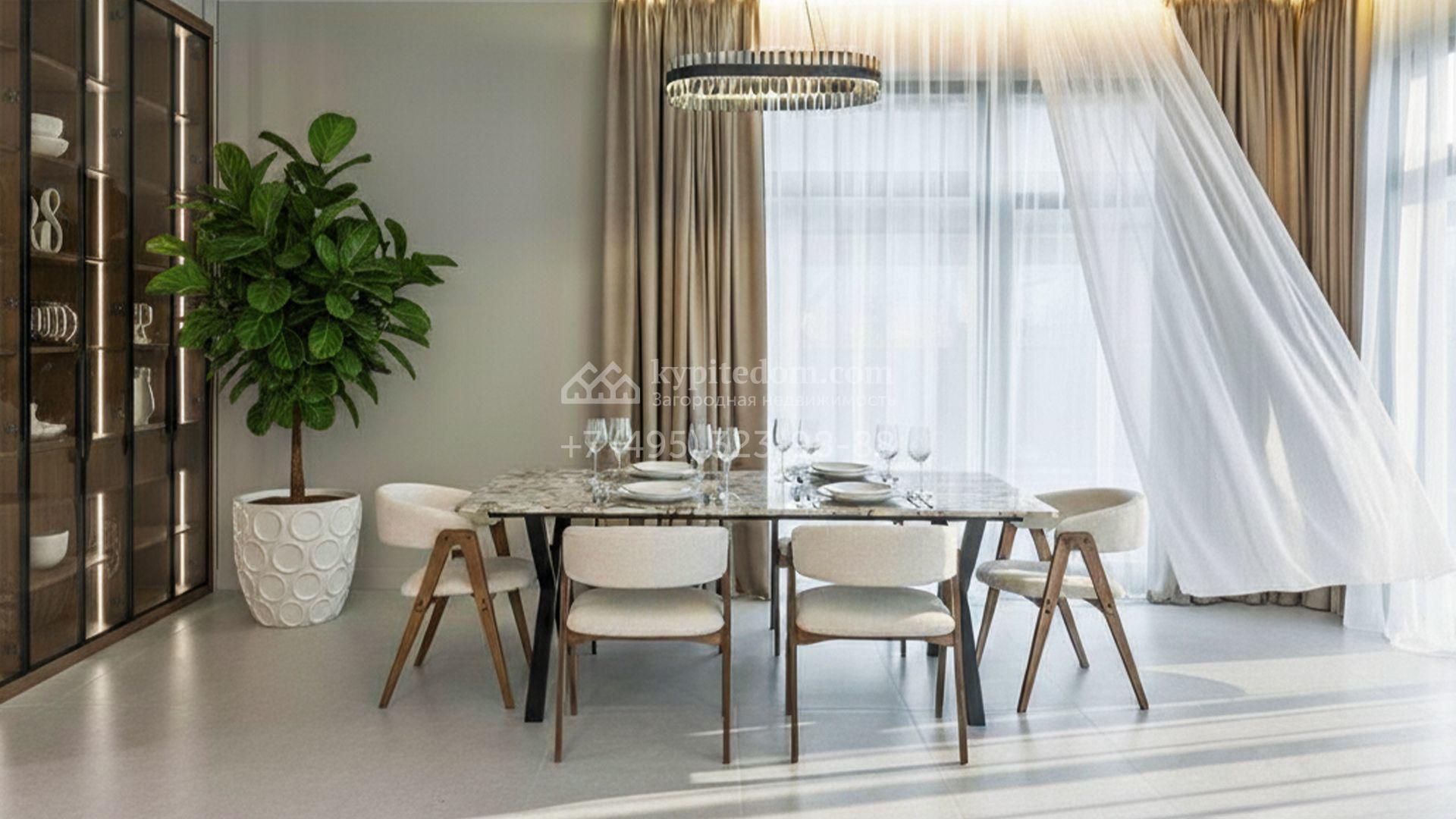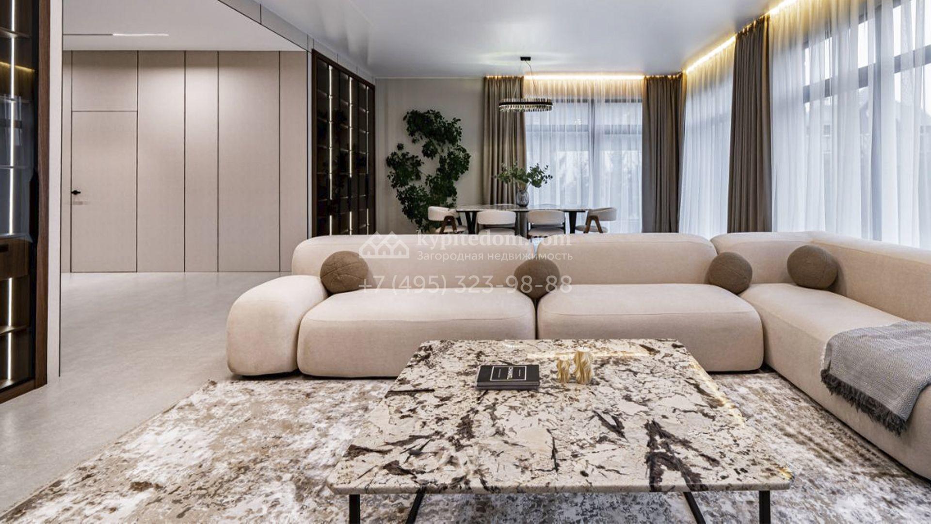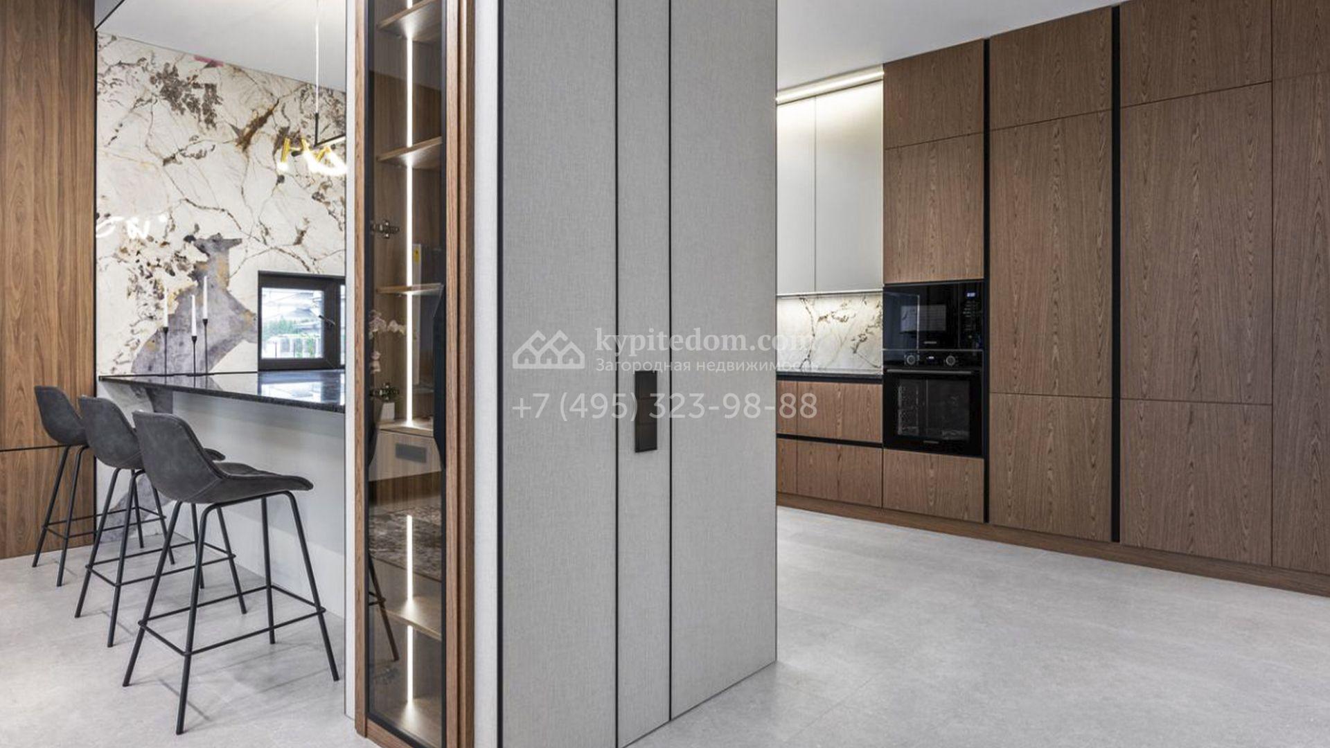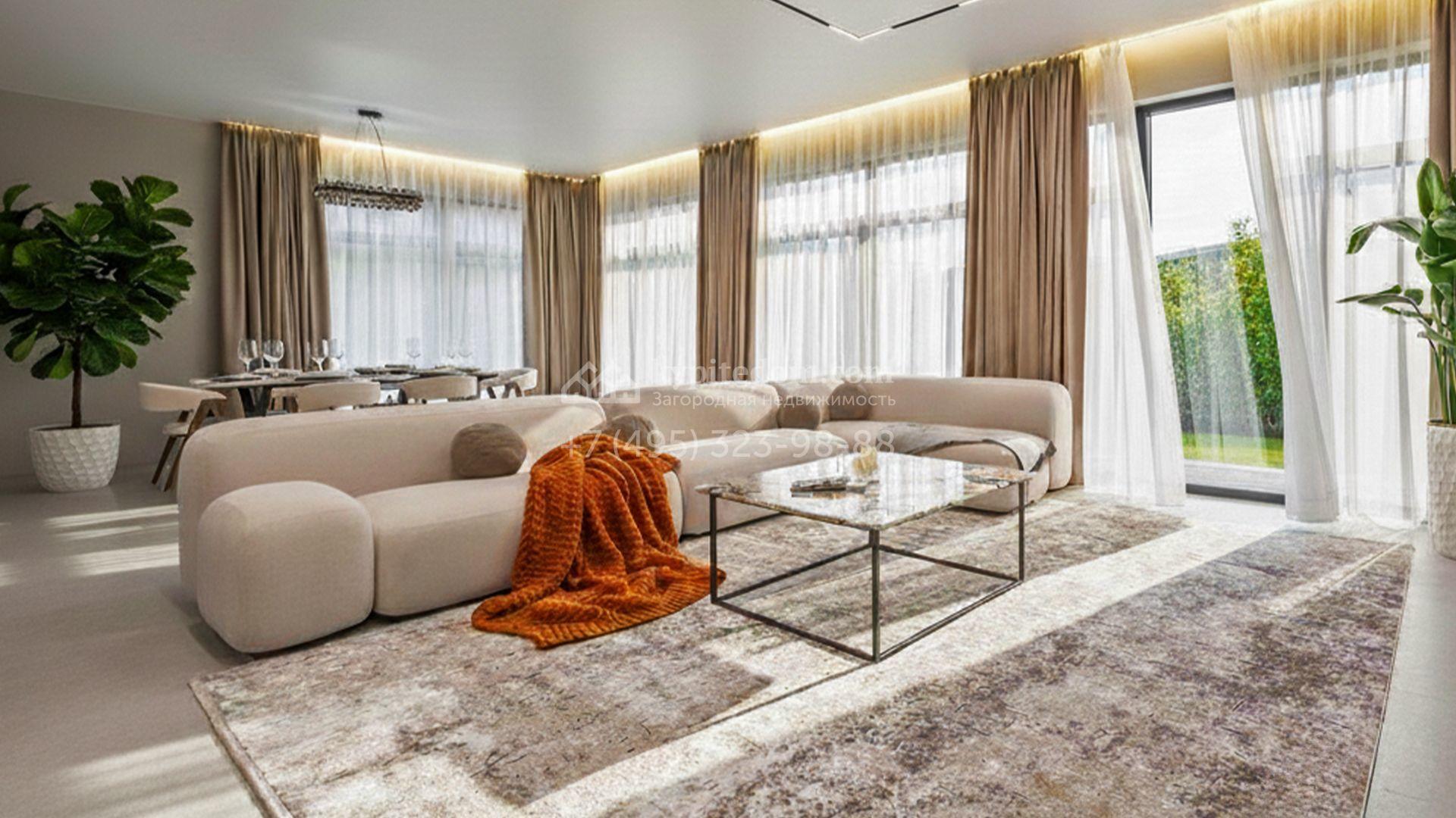 Загородный коттедж площадью 300 м² расположен на полевом участке 7 соток в центральной части посёлка у парковой зоны. Современный фасад гармонично сочетает фактуры камня и дерева в контрастных оттенках, формируя запоминающийся архитектурный облик. Панорамные окна наполняют внутренние пространства солнцем, визуально расширяя их.
