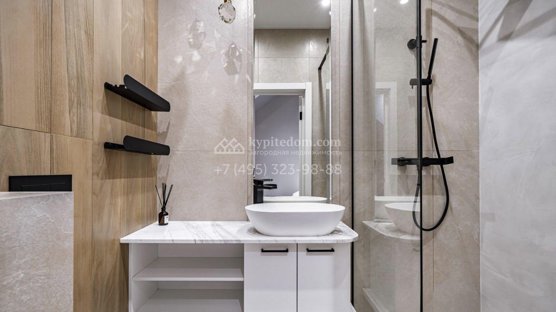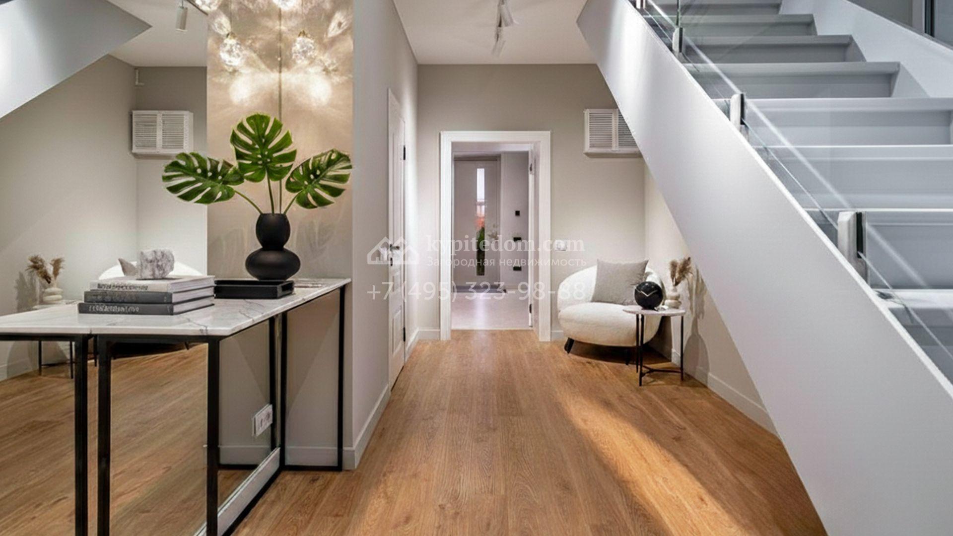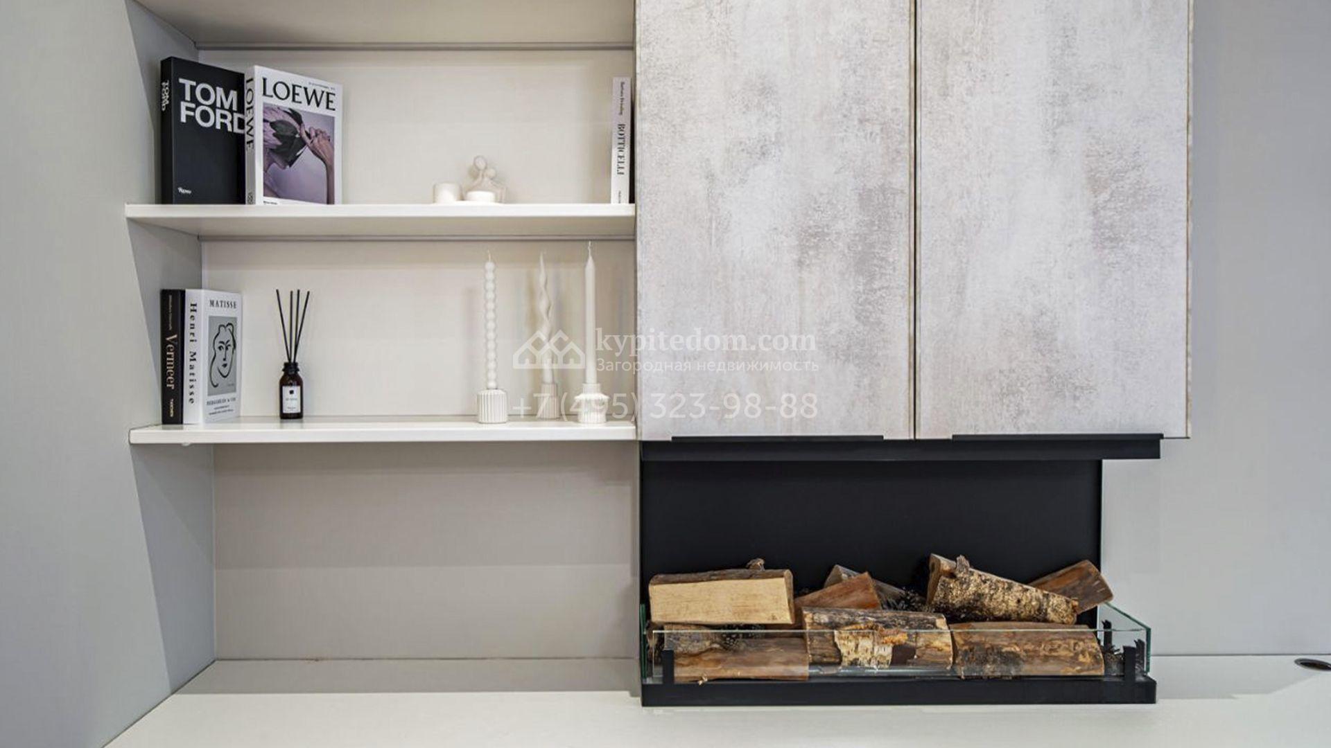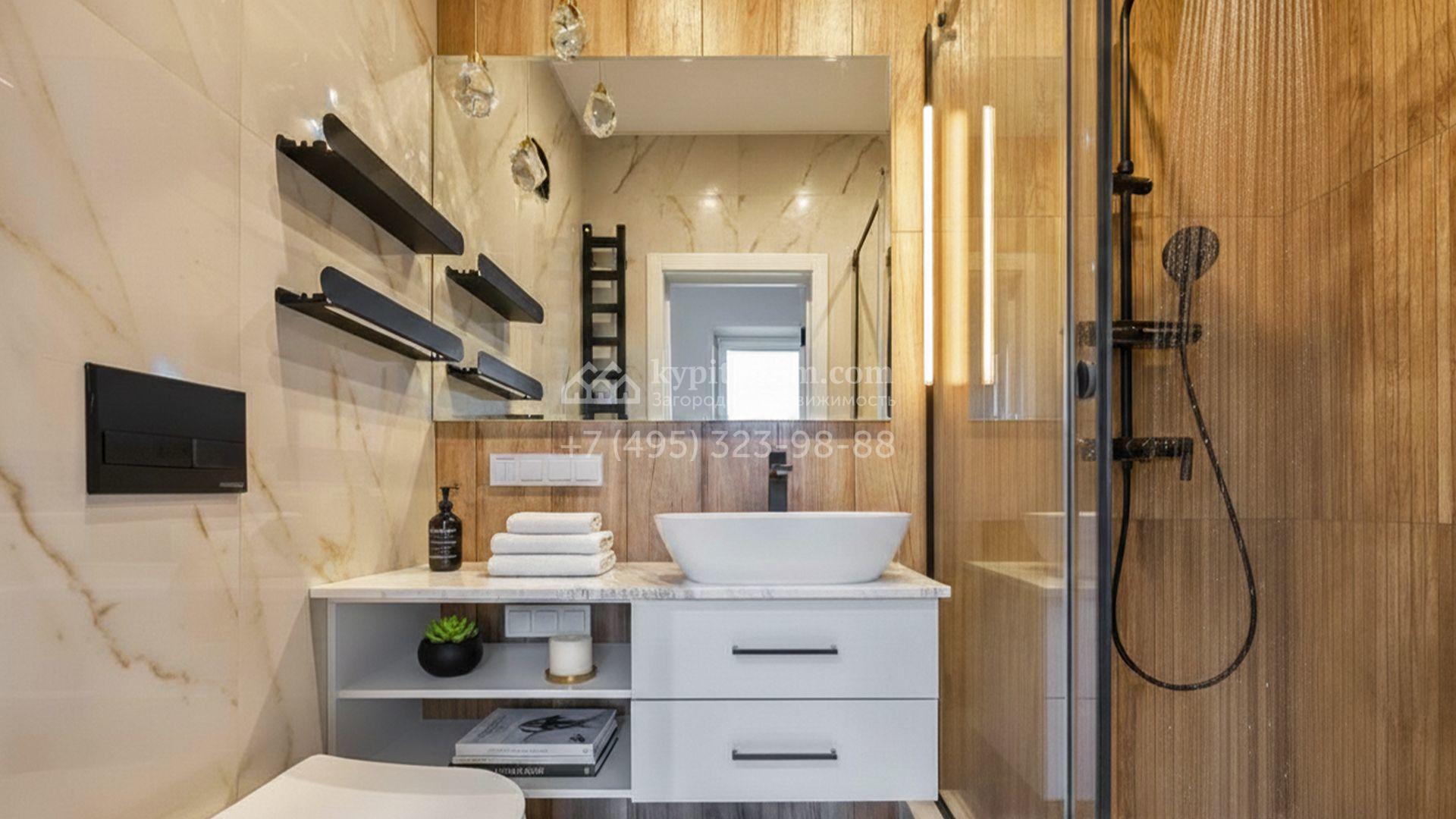 Загородный коттедж площадью 300 м² расположен на полевом участке 7 соток в центральной части посёлка у парковой зоны. Современный фасад гармонично сочетает фактуры камня и дерева в контрастных оттенках, формируя запоминающийся архитектурный облик. Панорамные окна наполняют внутренние пространства солнцем, визуально расширяя их.