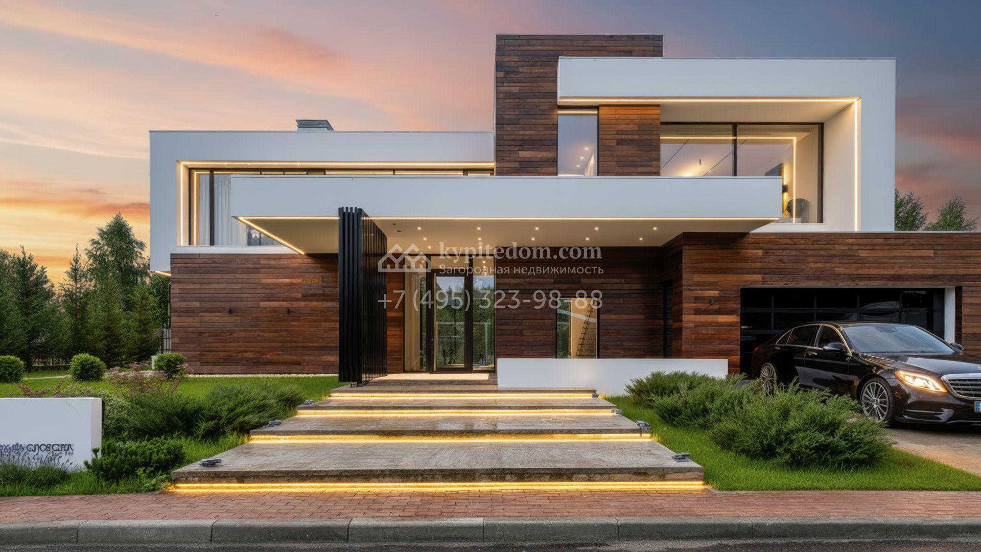 На уединённом угловом участке площадью 15 соток с собственным выходом в живописный лес расположился коттедж площадью 650 м², созданный по проекту Ильи Елисеева. Этот дом — воплощение современной архитектуры, где белоснежная штукатурка гармонично сочетается с панелями с фактурой дерева, а кубические формы здания подчёркнуты стильной подсветкой. Панорамные окна премиальных брендов Schuco и Keller создают эффект единения с природой, наполняя интерьеры естественным светом и открывая живописные виды на природное окружение.