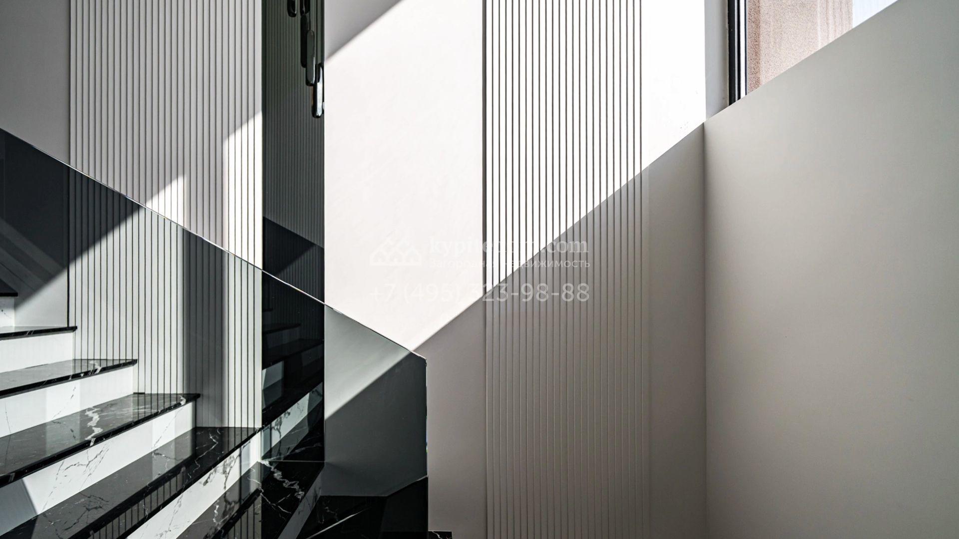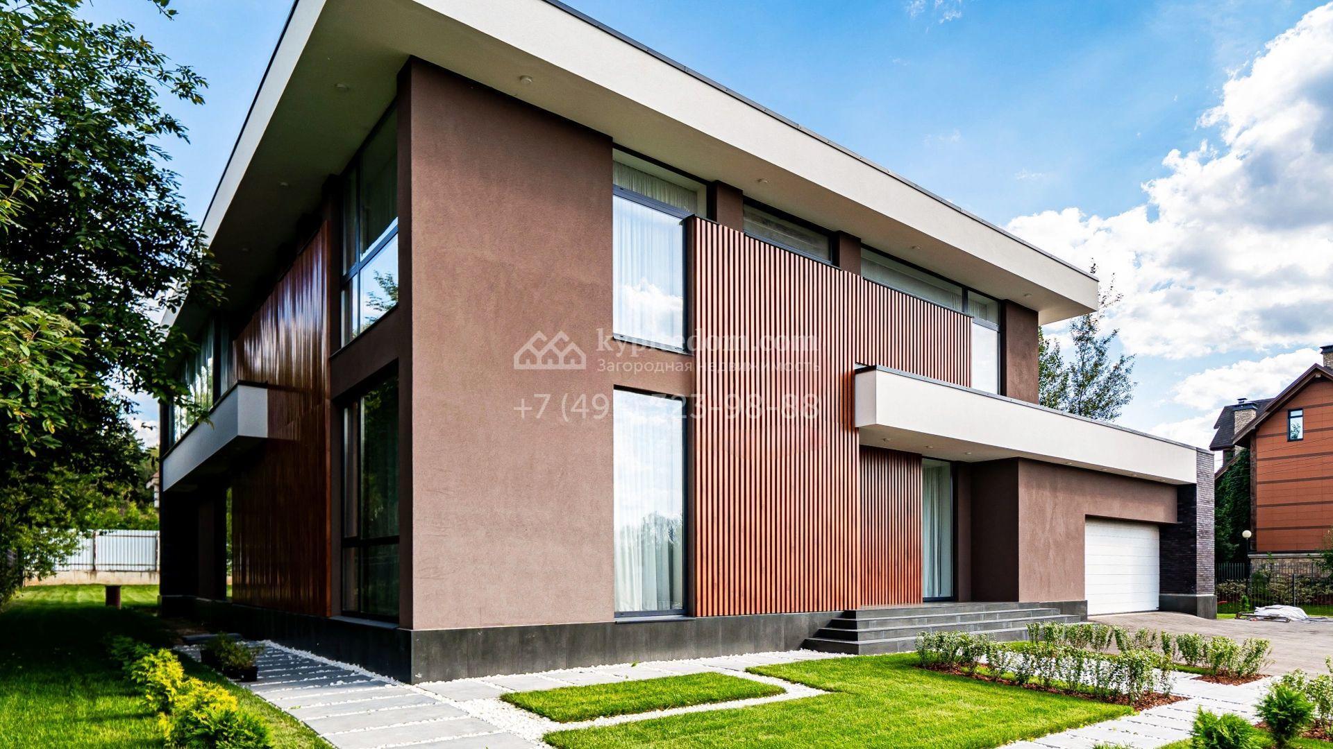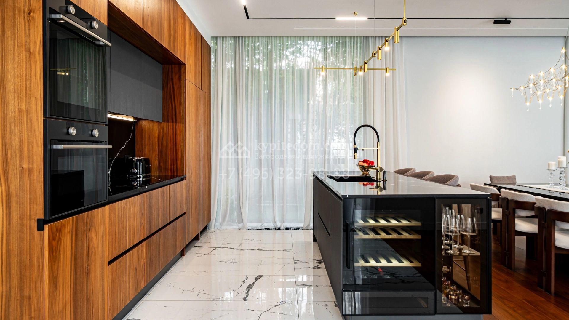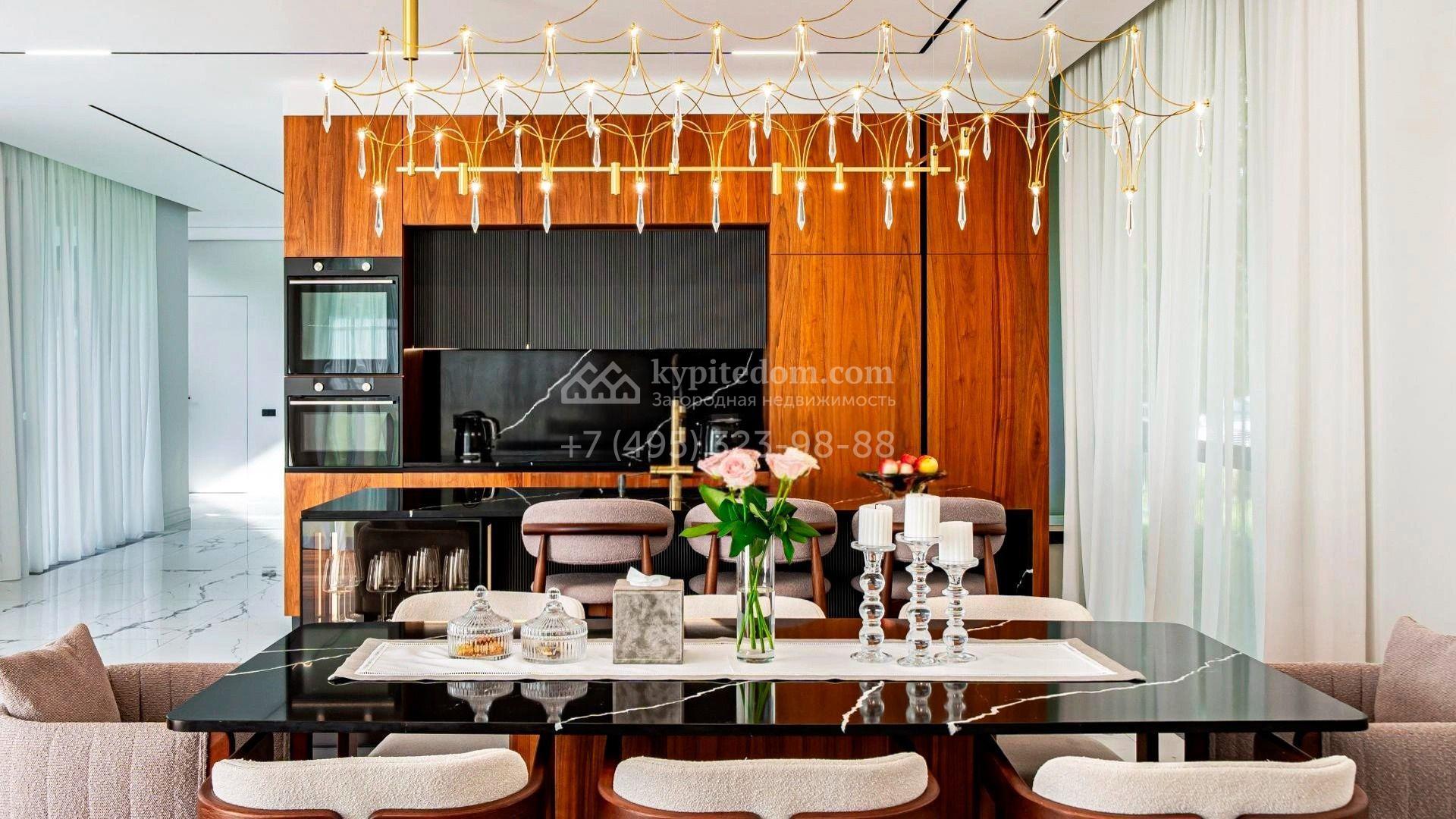 Загородный коттедж площадью 542 м² расположен на живописном полевом участке 19,5 соток. Современный фасад здания, где гармонично сочетаются штукатурка, клинкерный кирпич и благородные планки с фактурой дерева, впечатляет своими строгими линиями, которые в вечернее время элегантно подчеркивает архитектурная подсветка. Панорамные окна создают ощущение единства с природой и наполняют интерьеры солнечными лучами. Внутреннее пространство оформлено в светлой гамме с использованием премиальных материалов. Дизайнерскую отделку дополняют изящные молдинги, стильные светильники и люстры, а также со вкусом подобранная мебель. Для бытового комфорта установлена техника Asko и Liebherr, а за поддержание идеального микроклимата отвечает система кондиционирования.