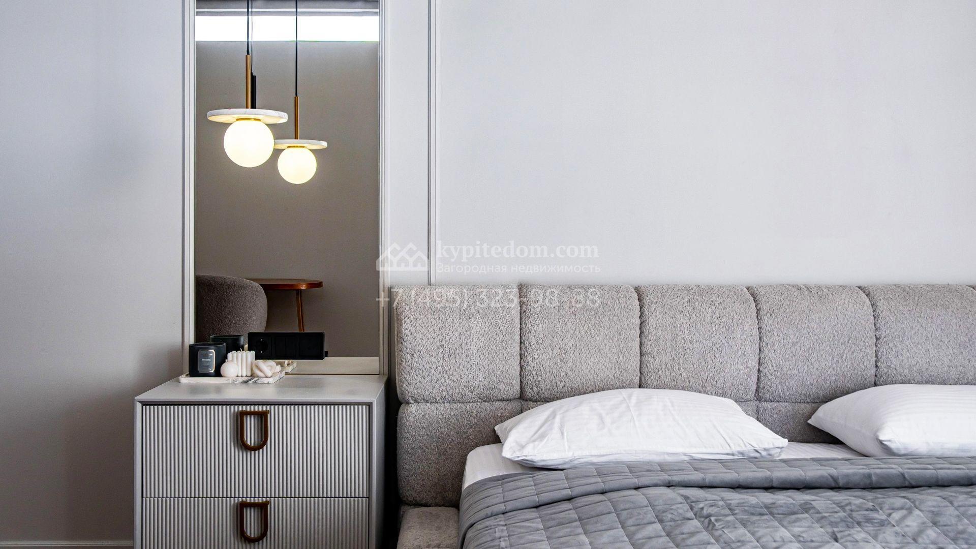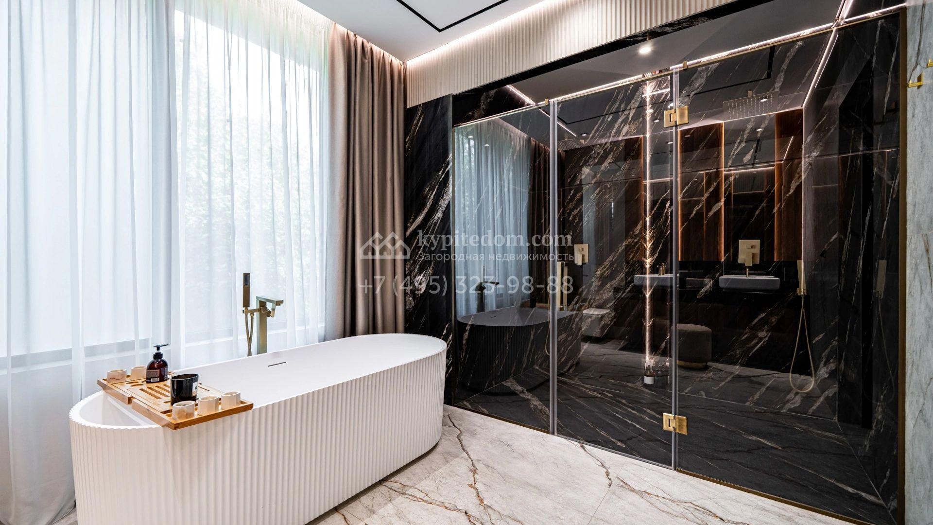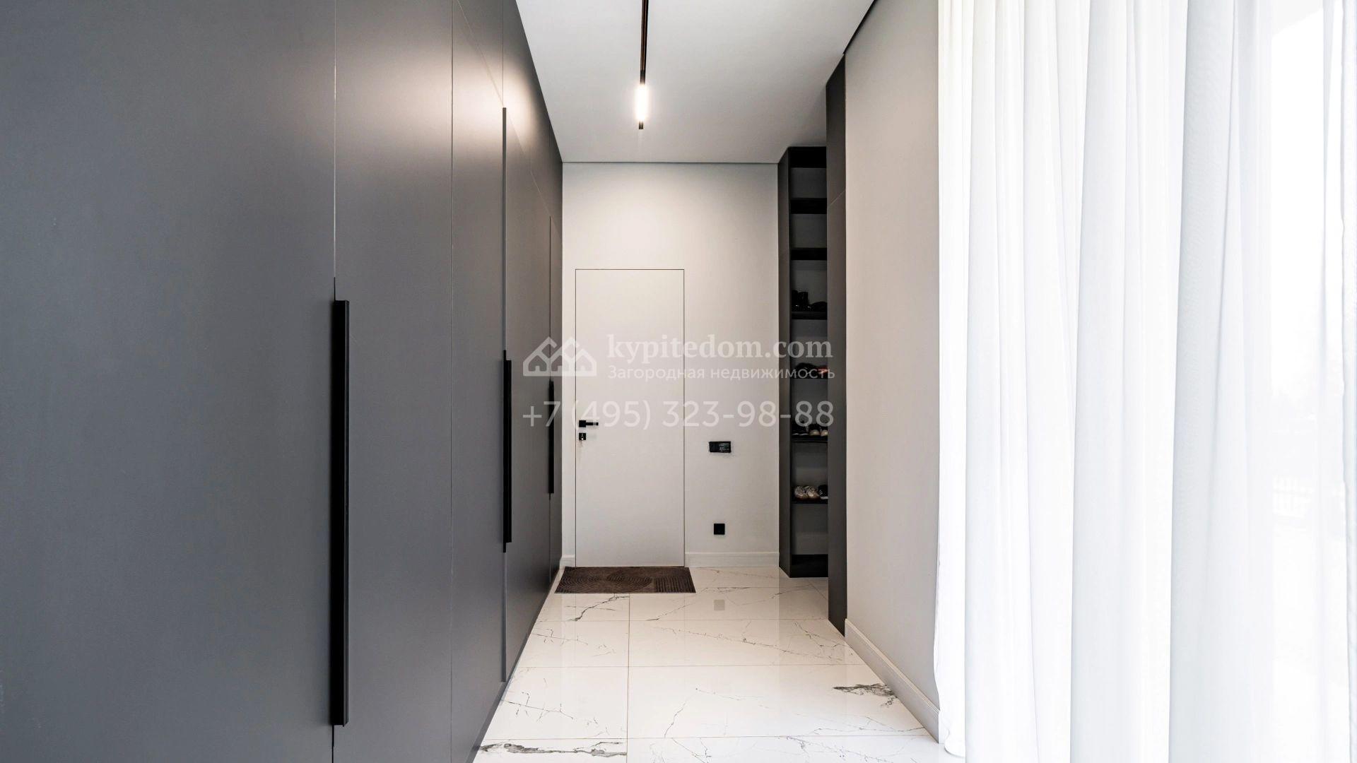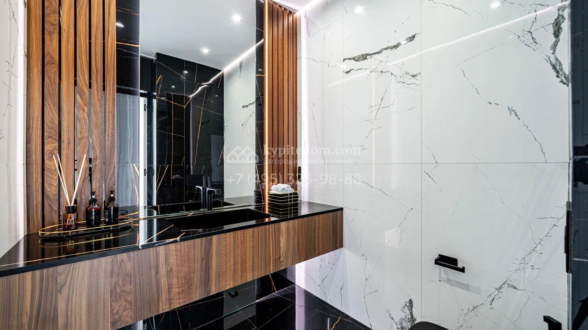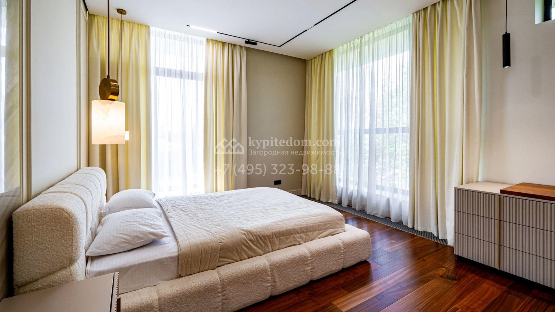 Загородный коттедж площадью 542 м² расположен на живописном полевом участке 19,5 соток. Современный фасад здания, где гармонично сочетаются штукатурка, клинкерный кирпич и благородные планки с фактурой дерева, впечатляет своими строгими линиями, которые в вечернее время элегантно подчеркивает архитектурная подсветка. Панорамные окна создают ощущение единства с природой и наполняют интерьеры солнечными лучами. Внутреннее пространство оформлено в светлой гамме с использованием премиальных материалов. Дизайнерскую отделку дополняют изящные молдинги, стильные светильники и люстры, а также со вкусом подобранная мебель. Для бытового комфорта установлена техника Asko и Liebherr, а за поддержание идеального микроклимата отвечает система кондиционирования.
