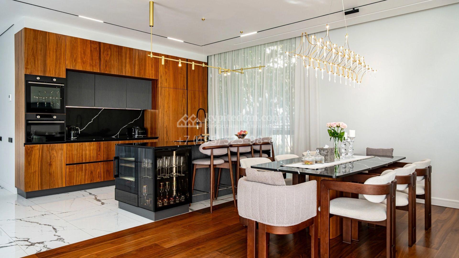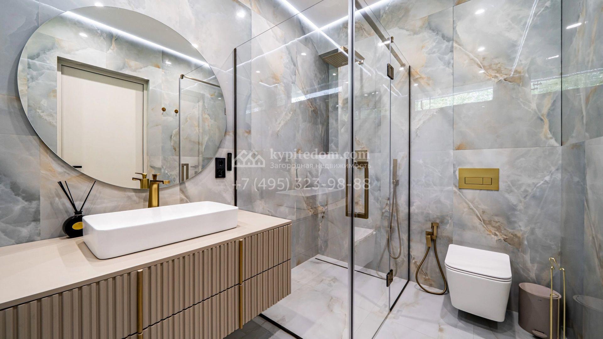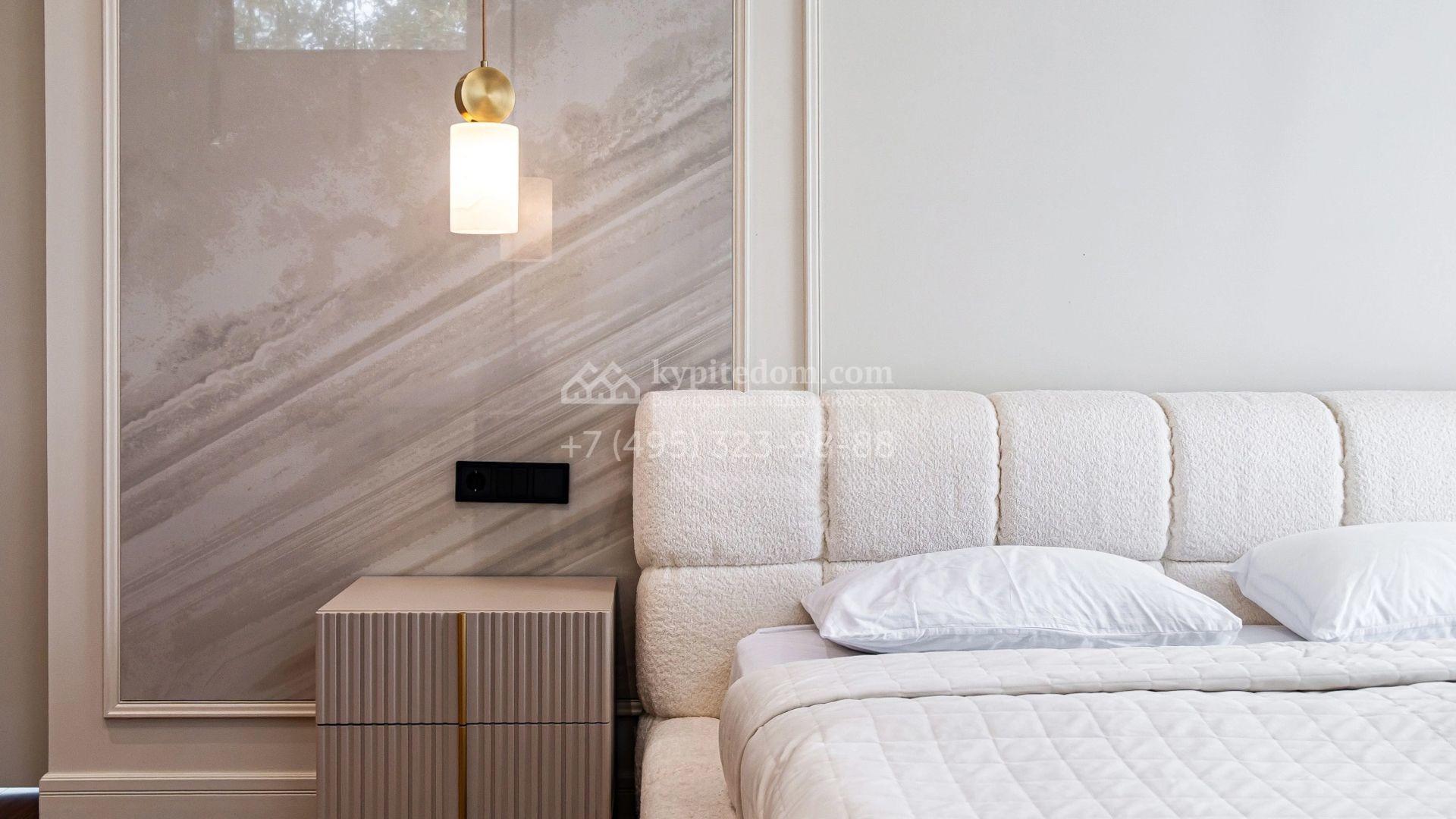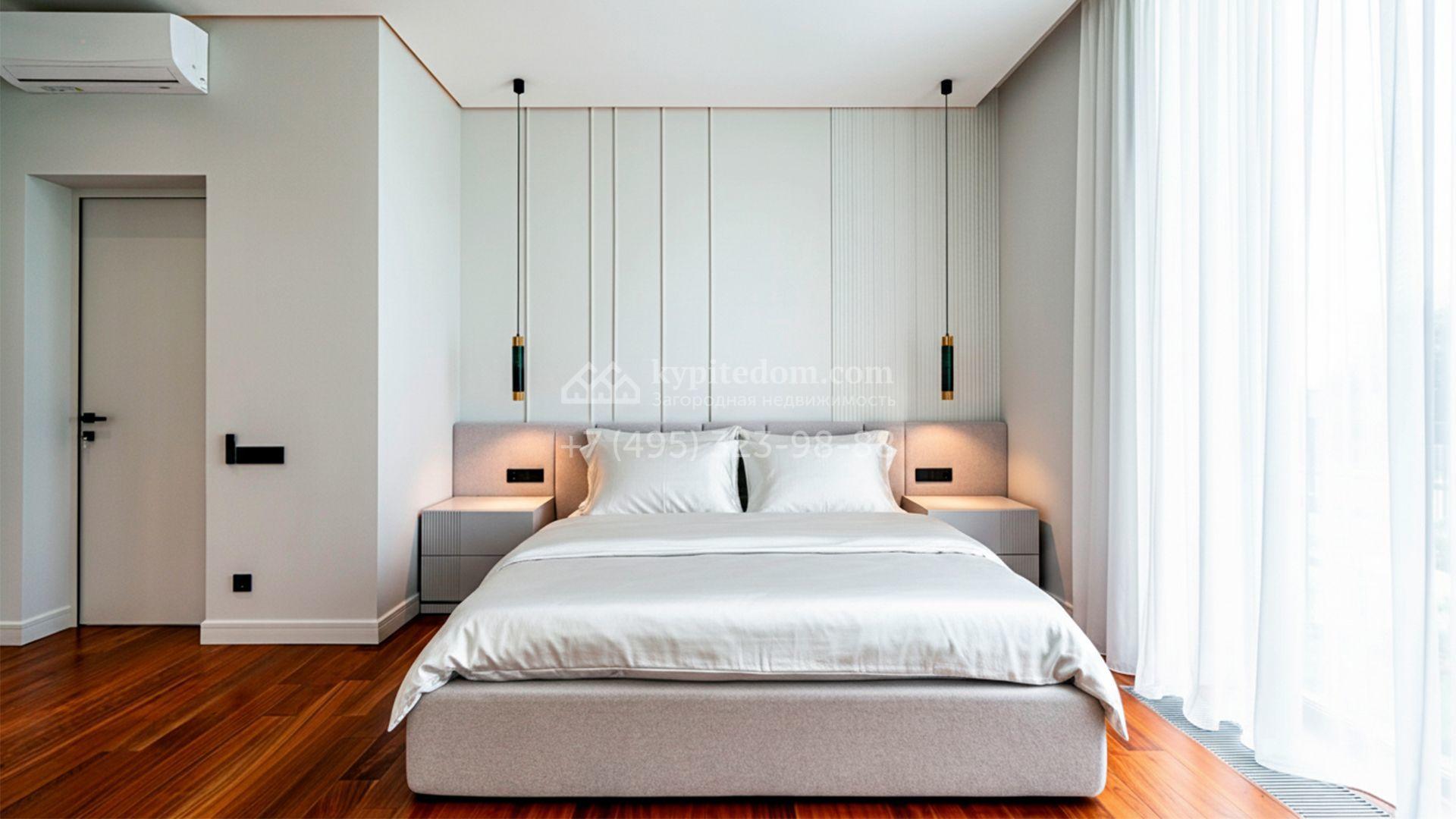 Загородный коттедж площадью 542 м² расположен на живописном полевом участке 19,5 соток. Современный фасад здания, где гармонично сочетаются штукатурка, клинкерный кирпич и благородные планки с фактурой дерева, впечатляет своими строгими линиями, которые в вечернее время элегантно подчеркивает архитектурная подсветка. Панорамные окна создают ощущение единства с природой и наполняют интерьеры солнечными лучами. Внутреннее пространство оформлено в светлой гамме с использованием премиальных материалов. Дизайнерскую отделку дополняют изящные молдинги, стильные светильники и люстры, а также со вкусом подобранная мебель. Для бытового комфорта установлена техника Asko и Liebherr, а за поддержание идеального микроклимата отвечает система кондиционирования.