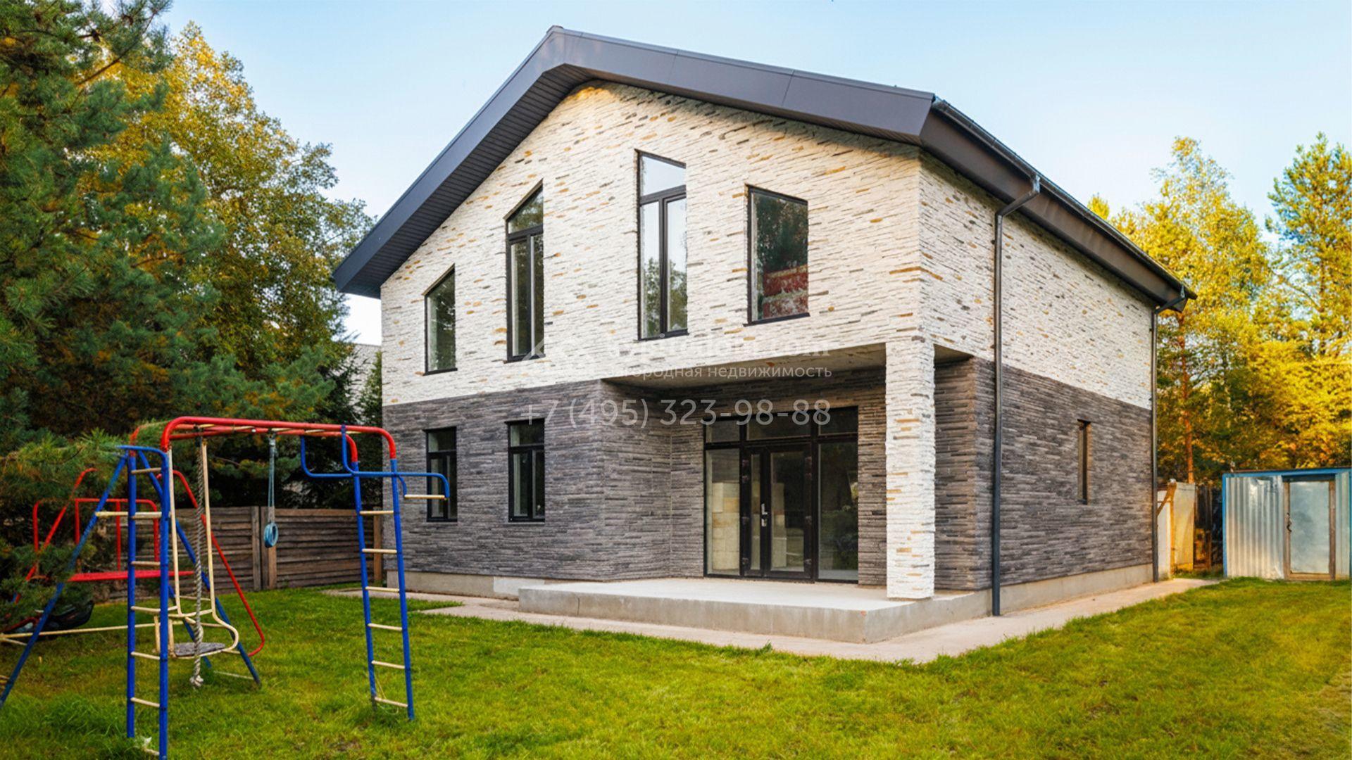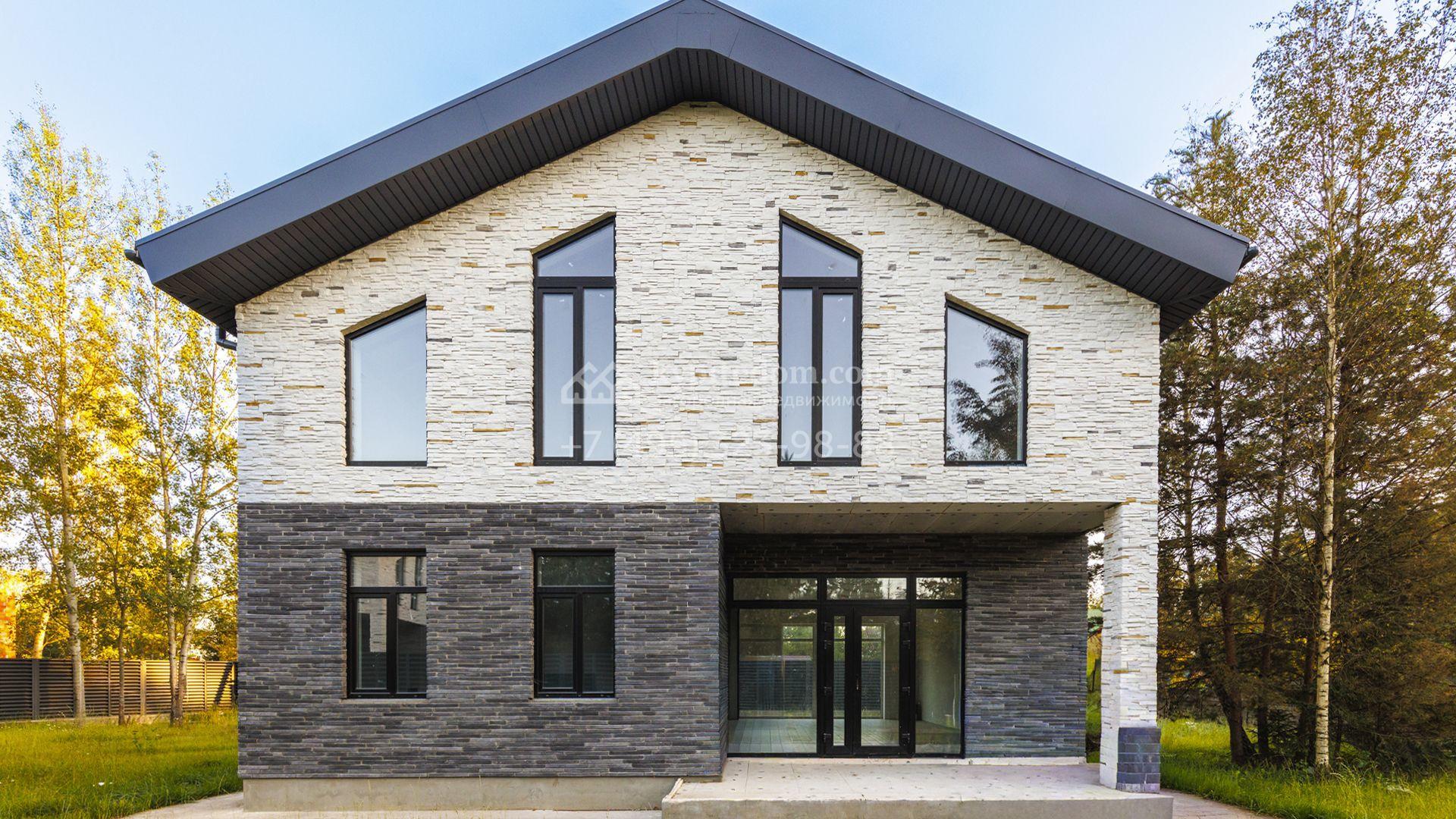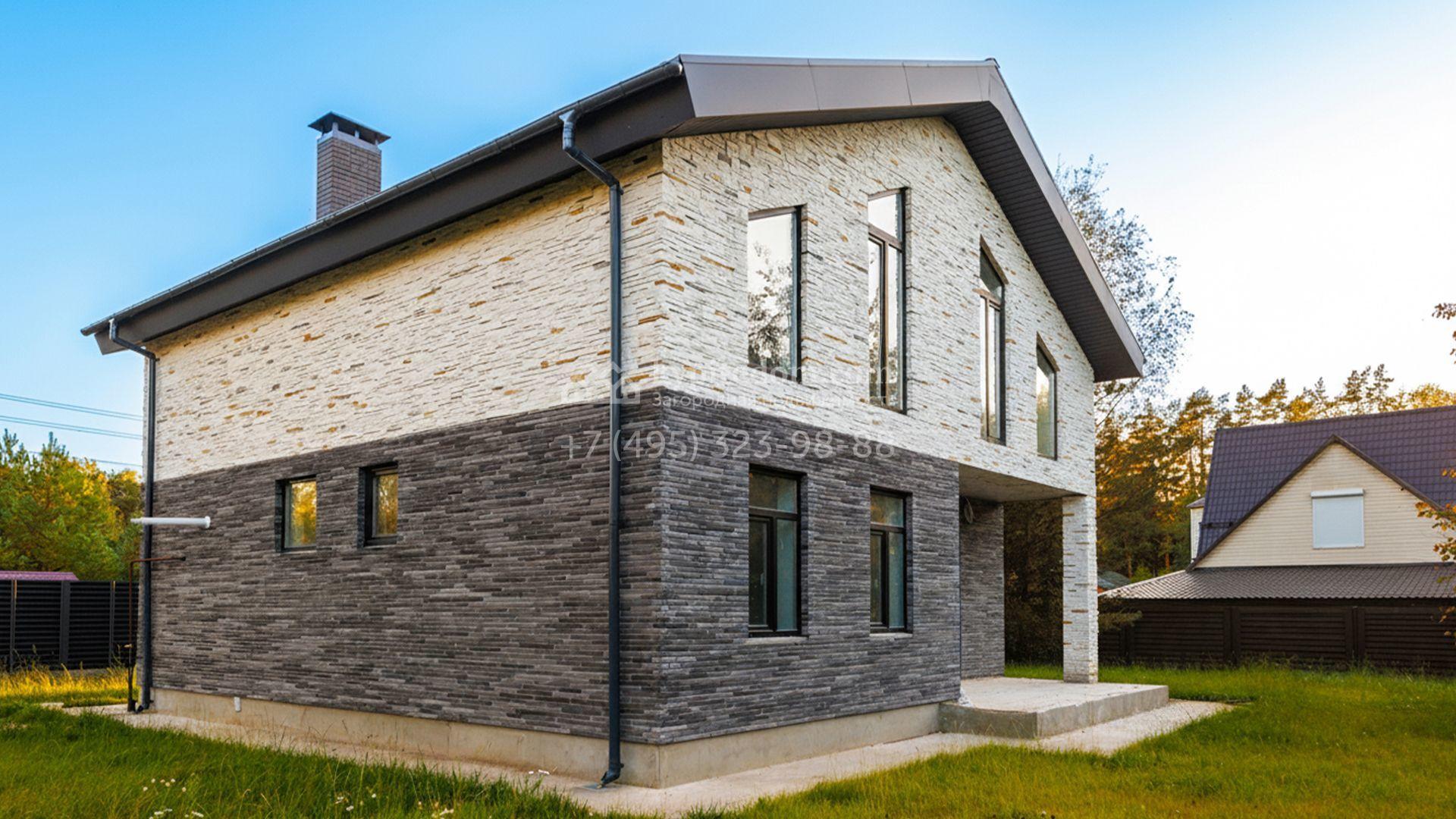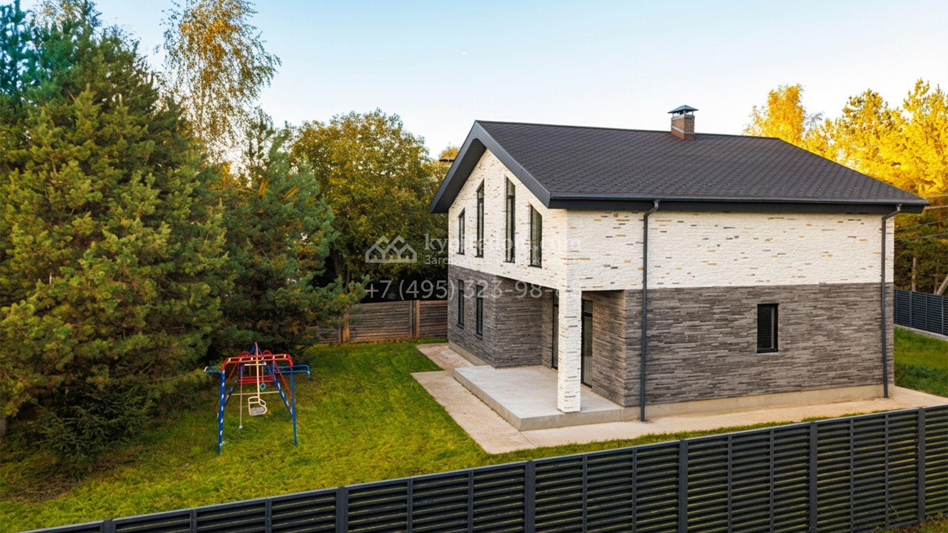 Загородный коттедж площадью 218 м² расположен на полевом участке 10 соток. Современный фасад облицован плиткой с фактурой камня двух контрастирующих оттенков, что придаёт зданию стильный архитектурный облик. Наполненные светом интерьеры представлены без отделки — будущие владельцы смогут реализовать здесь любой дизайн-проект.
