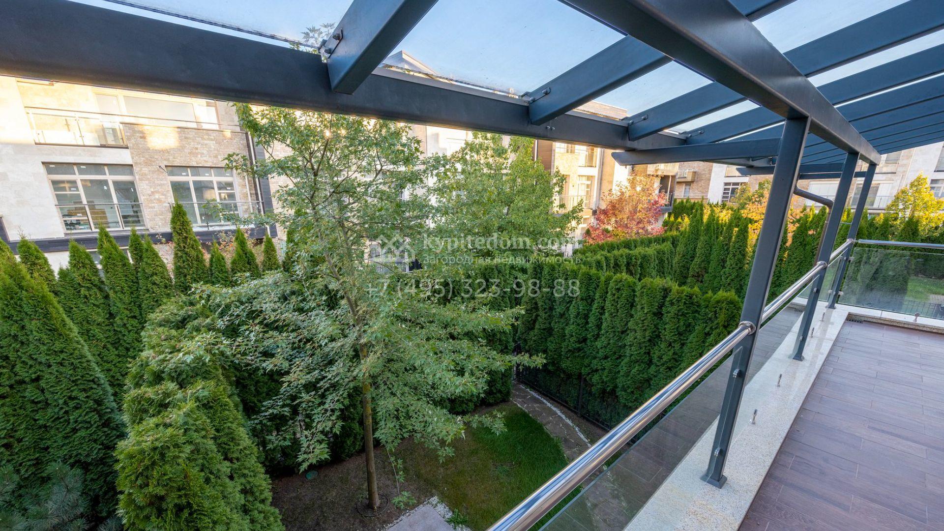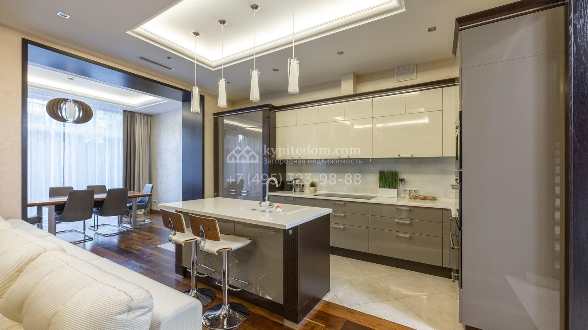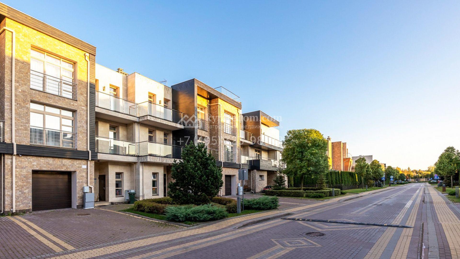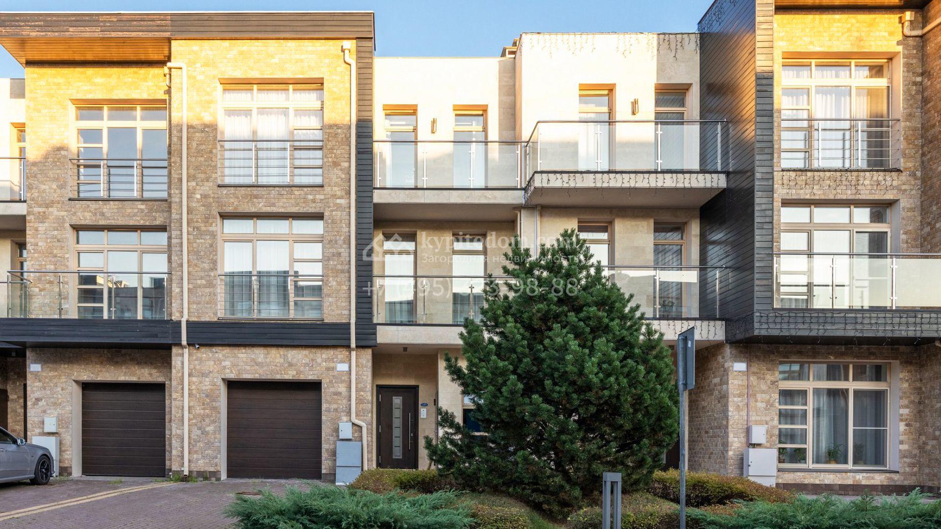 Таунхаус площадью 310 м² расположен на полевом участке 2,7 сотки. Фасад в райтовском стиле облицован травертином, лиственницей и мрамором. В отделке современного интерьера использованы дорогостоящие материалы, установлена мебель и система «умный дом». Планировка дома включает 5 спален, просторную кухню-гостиную с камином, столовую с выходом на участок и кабинет. В контуре резиденции расположен гараж. На участке выполнен ландшафтный дизайн, по периметру высажены туи и вымощены дорожки.