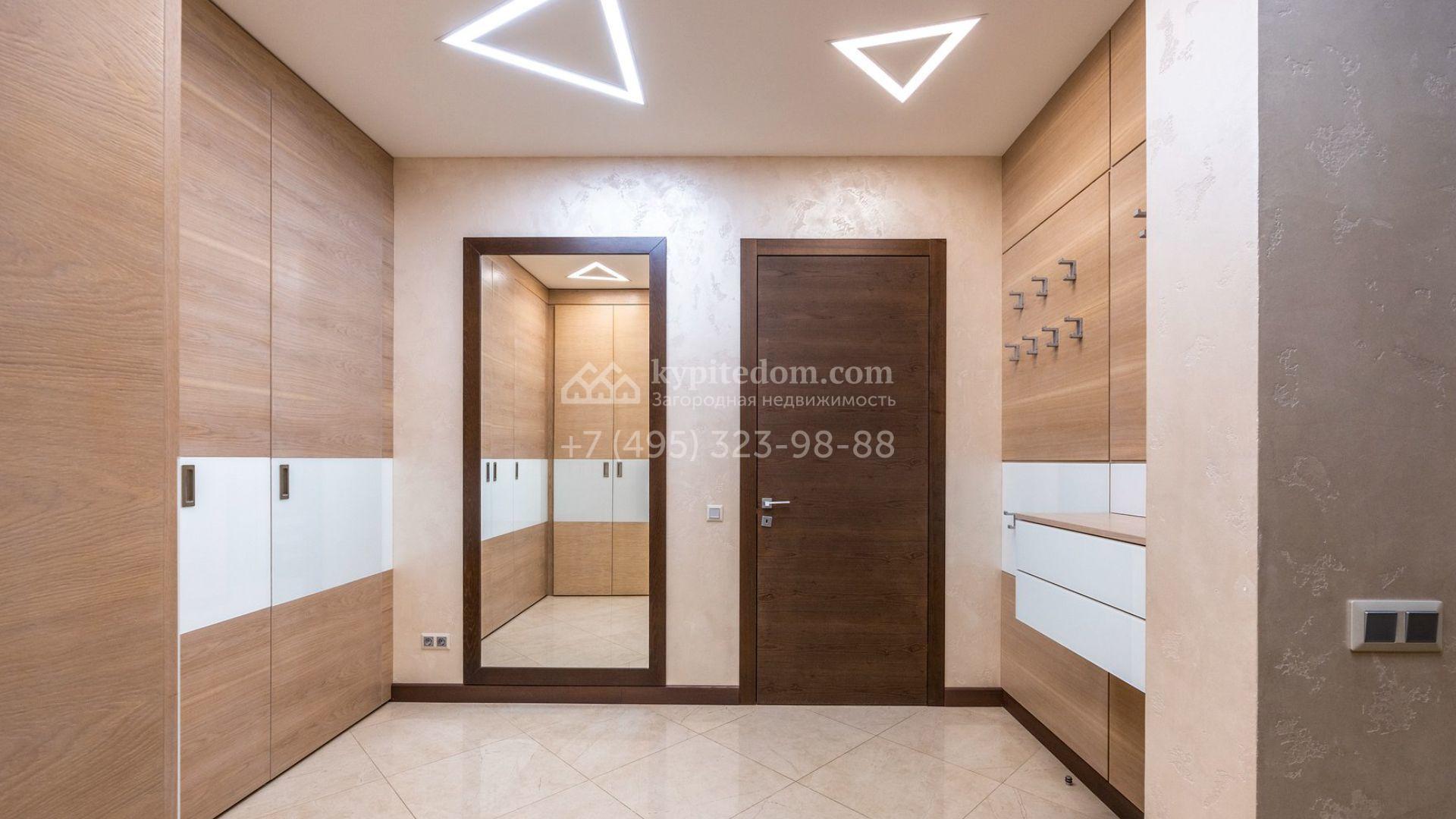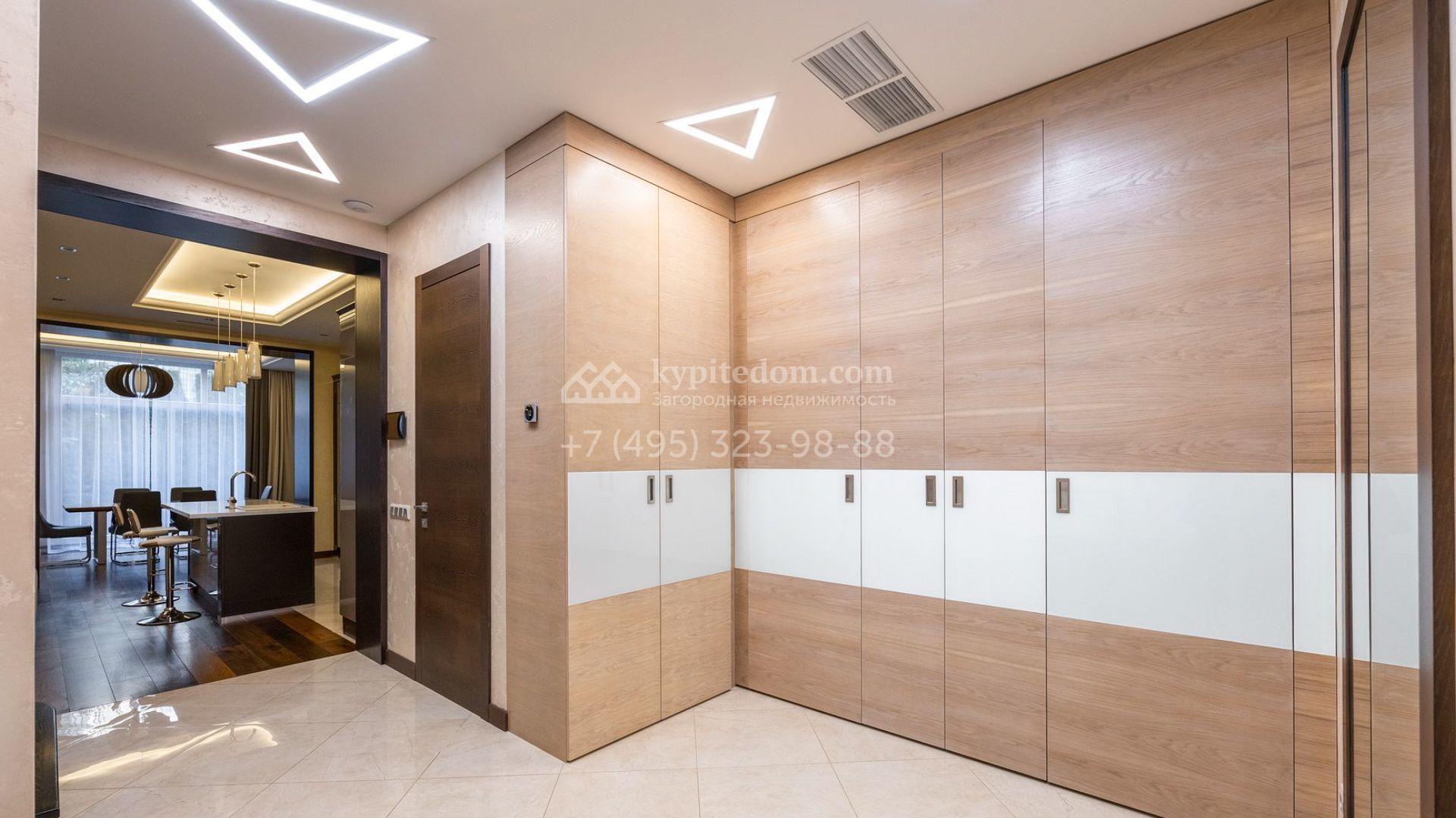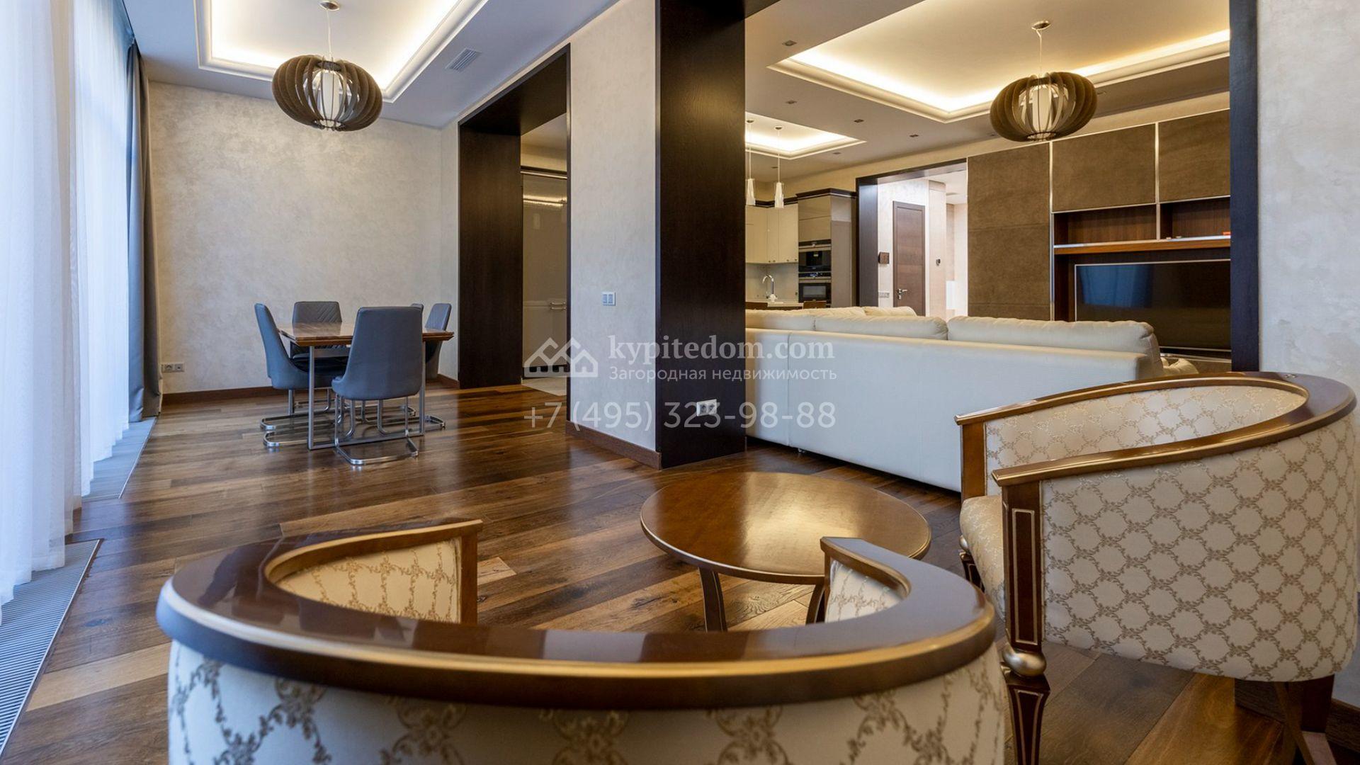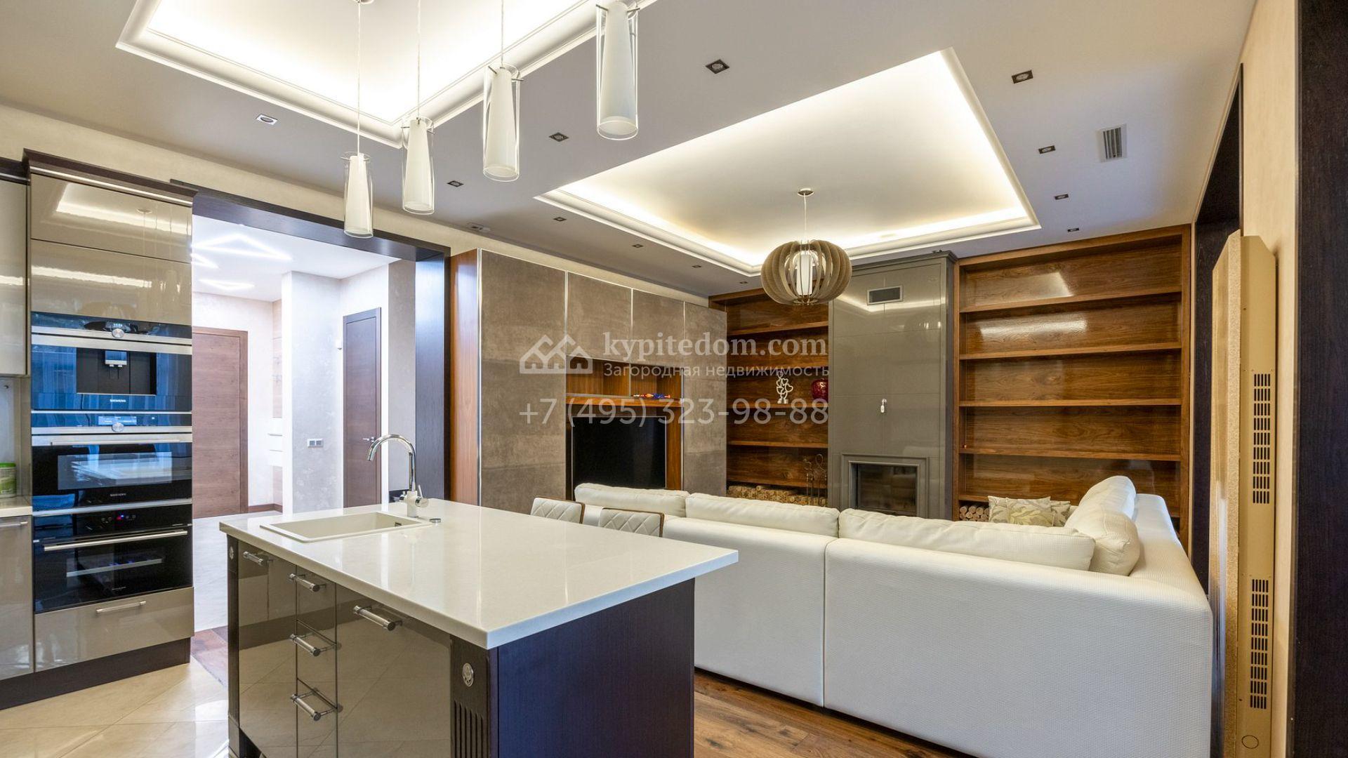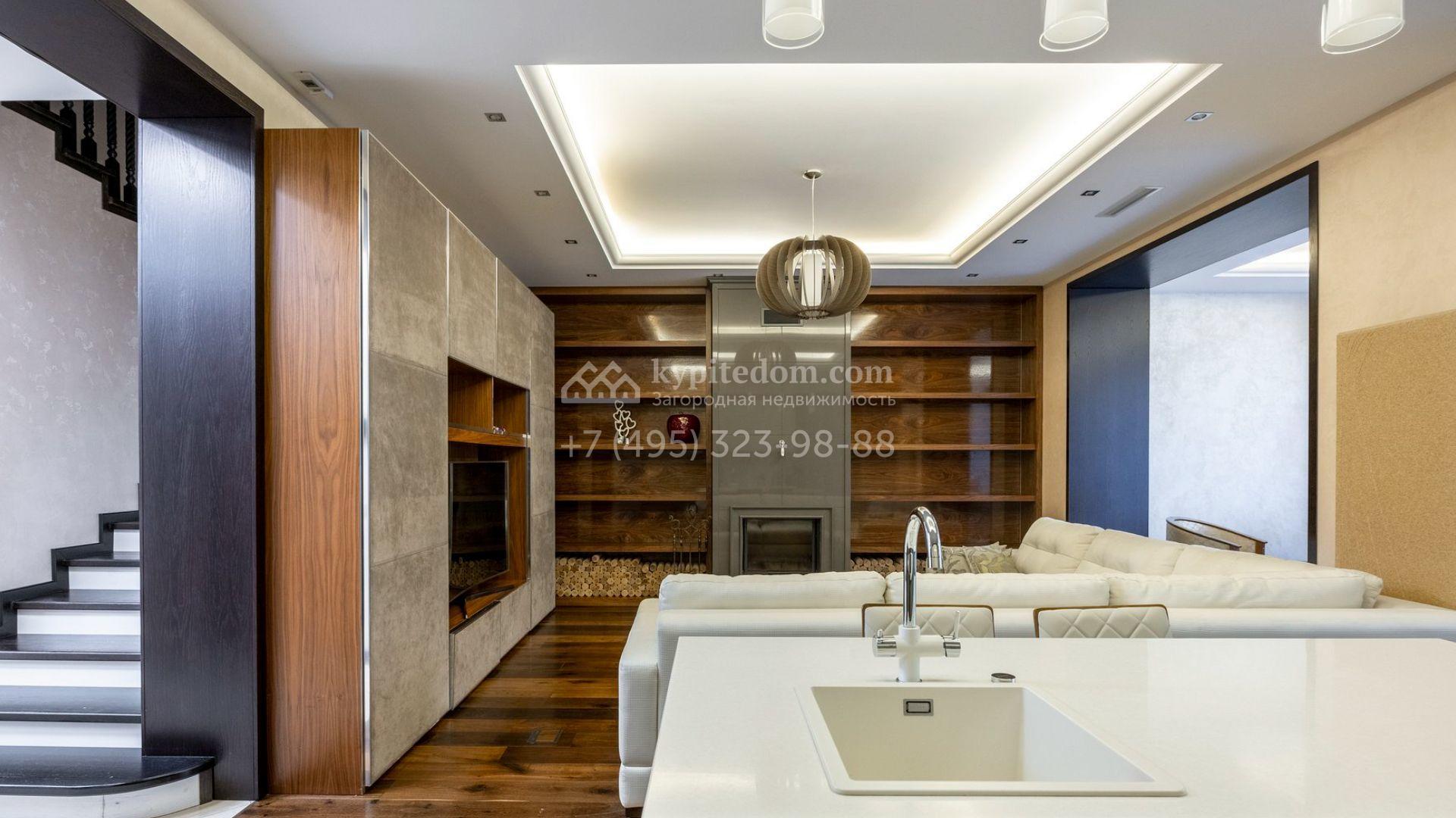 Таунхаус площадью 310 м² расположен на полевом участке 2,7 сотки. Фасад в райтовском стиле облицован травертином, лиственницей и мрамором. В отделке современного интерьера использованы дорогостоящие материалы, установлена мебель и система «умный дом». Планировка дома включает 5 спален, просторную кухню-гостиную с камином, столовую с выходом на участок и кабинет. В контуре резиденции расположен гараж. На участке выполнен ландшафтный дизайн, по периметру высажены туи и вымощены дорожки.