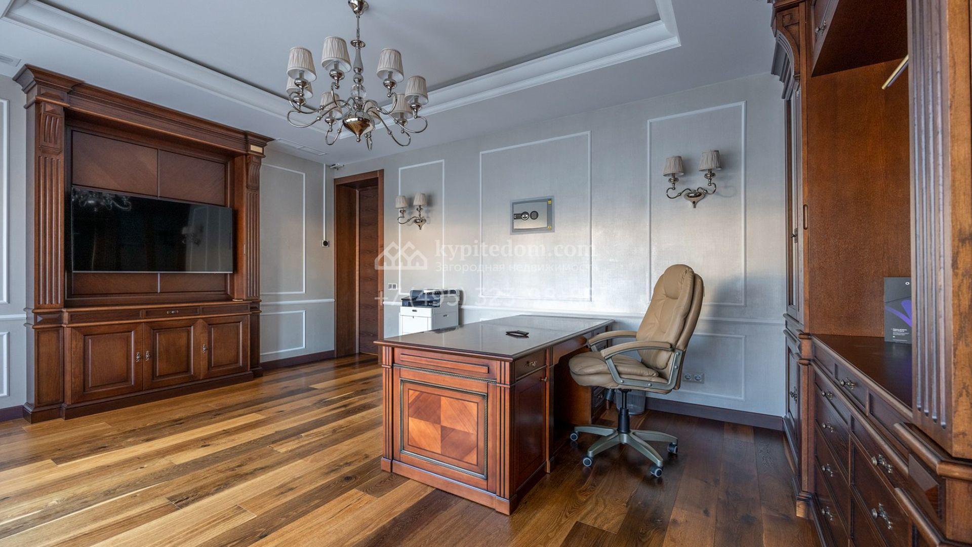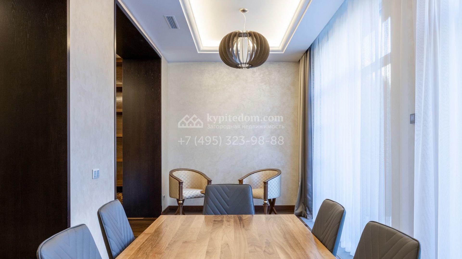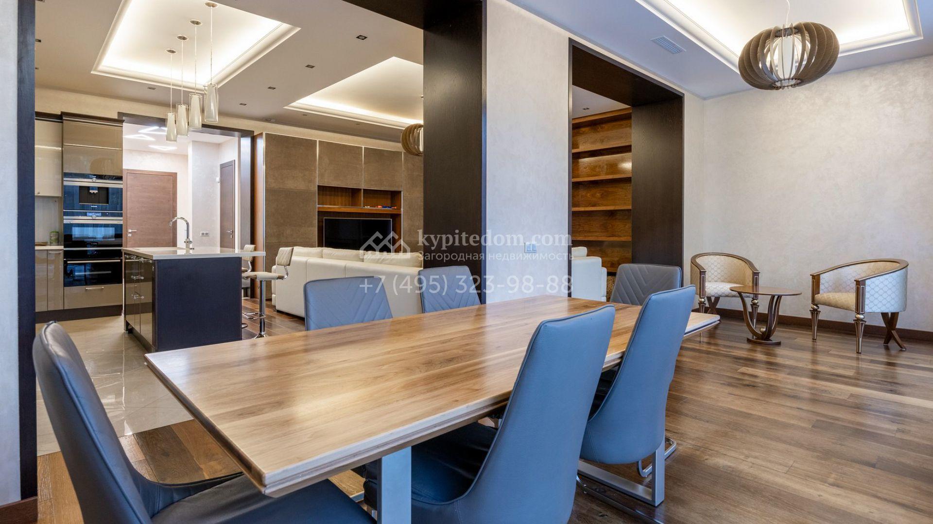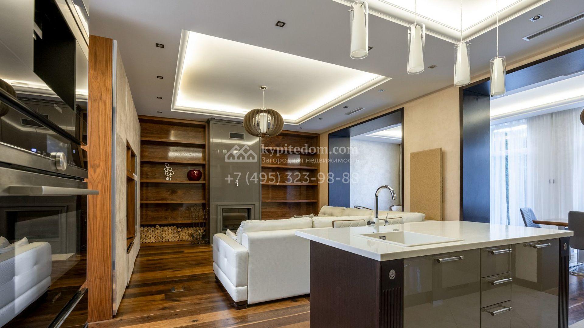 Таунхаус площадью 310 м² расположен на полевом участке 2,7 сотки. Фасад в райтовском стиле облицован травертином, лиственницей и мрамором. В отделке современного интерьера использованы дорогостоящие материалы, установлена мебель и система «умный дом». Планировка дома включает 5 спален, просторную кухню-гостиную с камином, столовую с выходом на участок и кабинет. В контуре резиденции расположен гараж. На участке выполнен ландшафтный дизайн, по периметру высажены туи и вымощены дорожки.