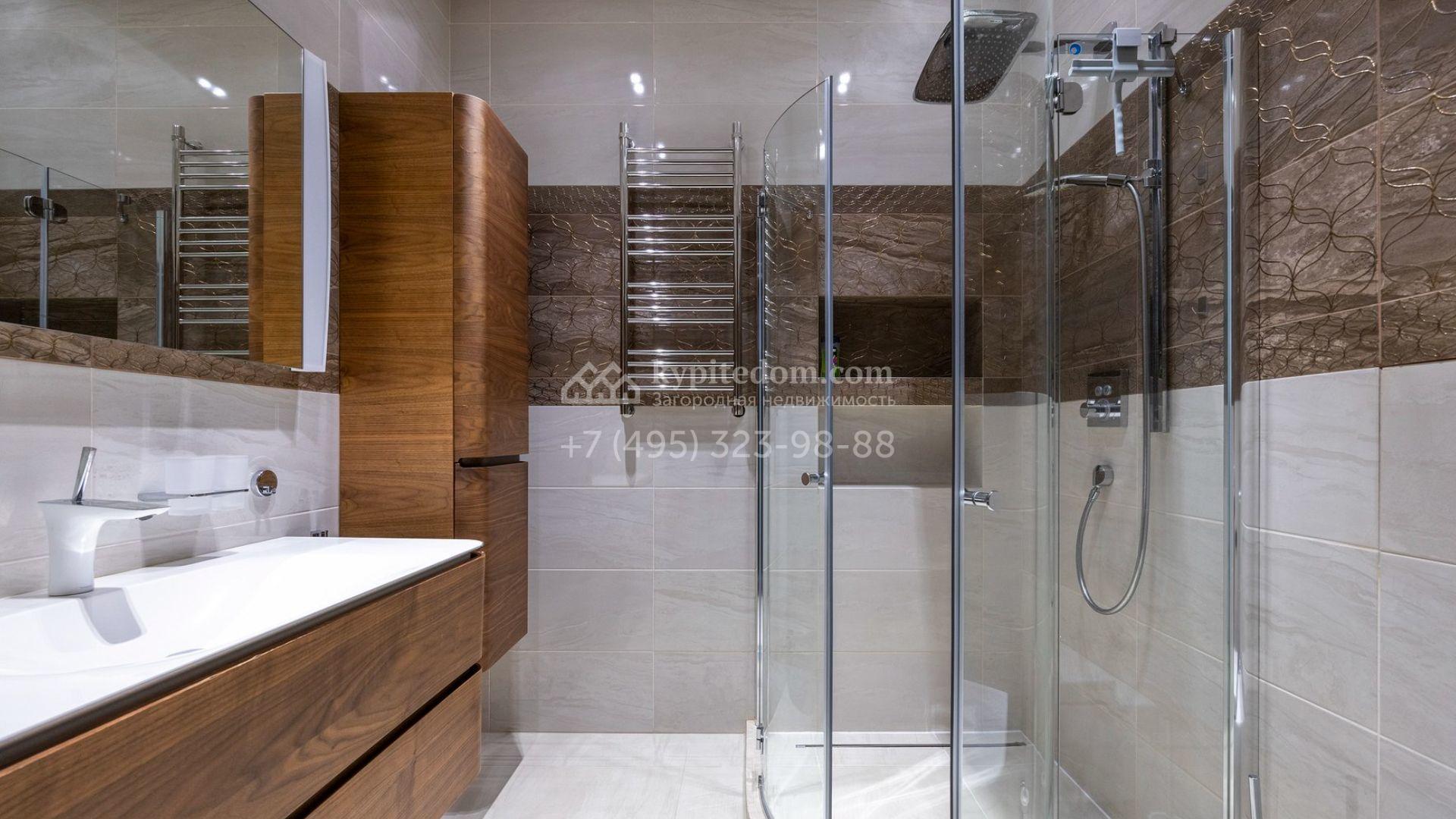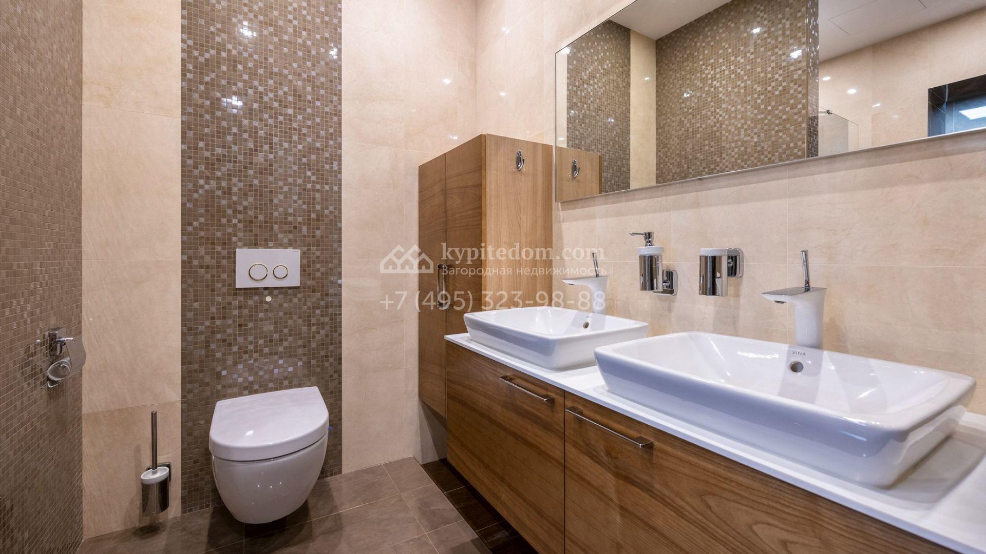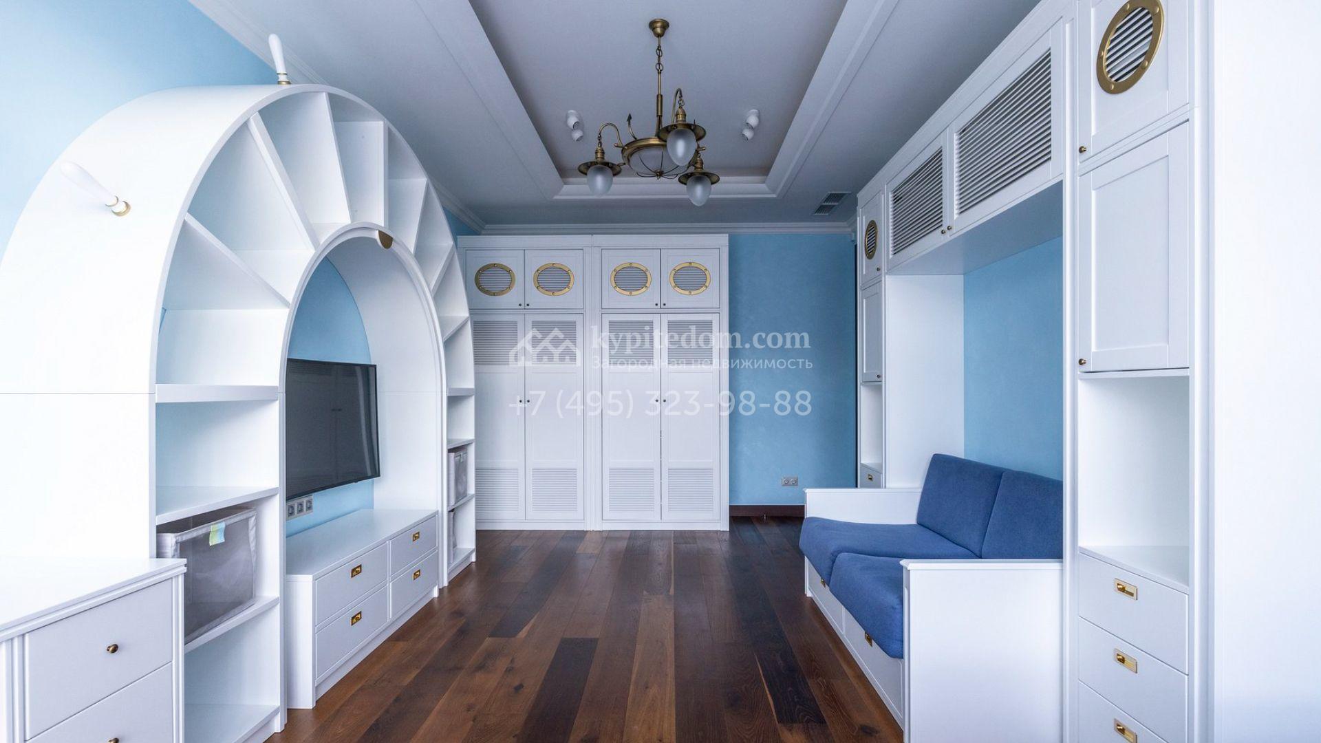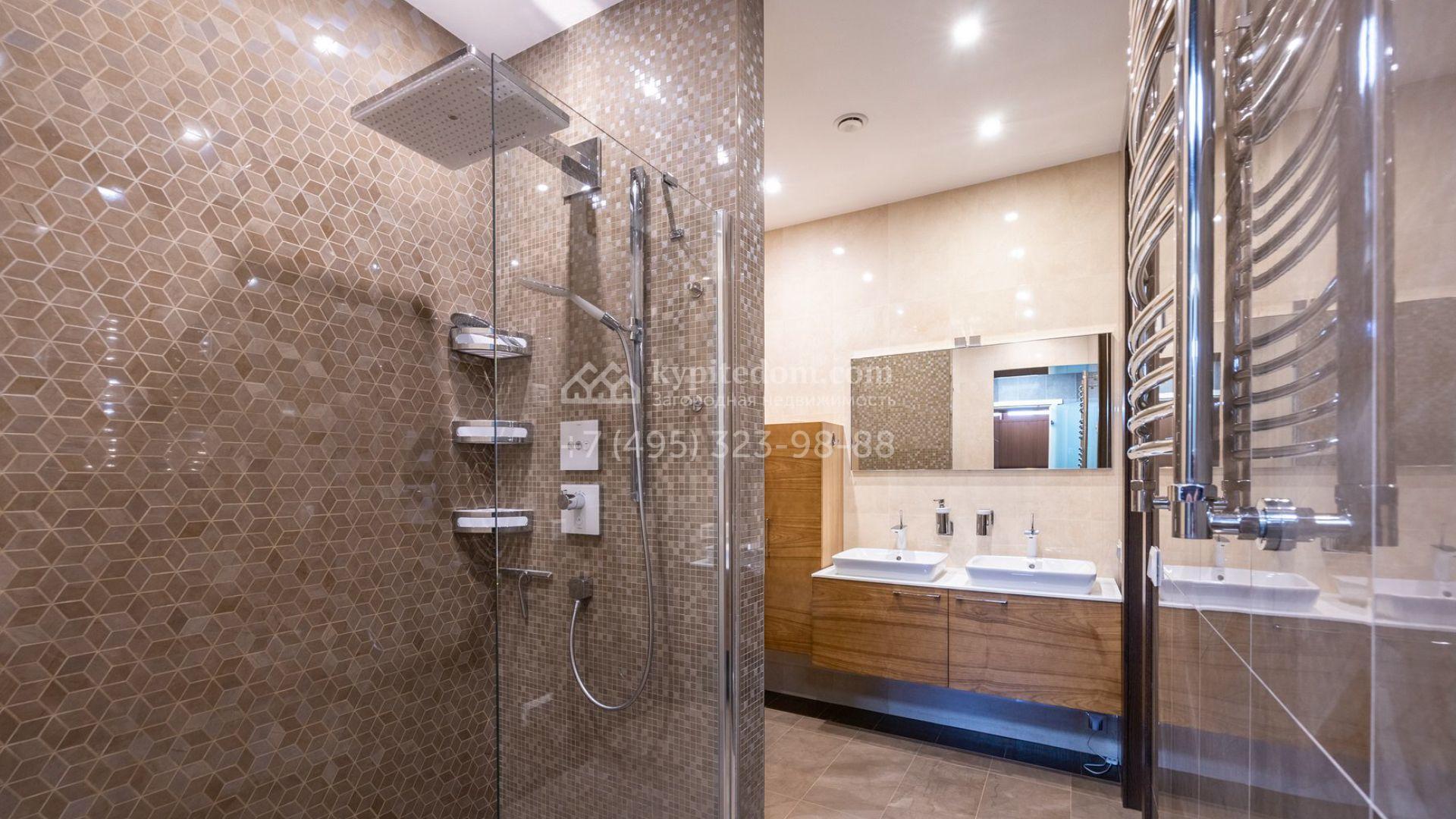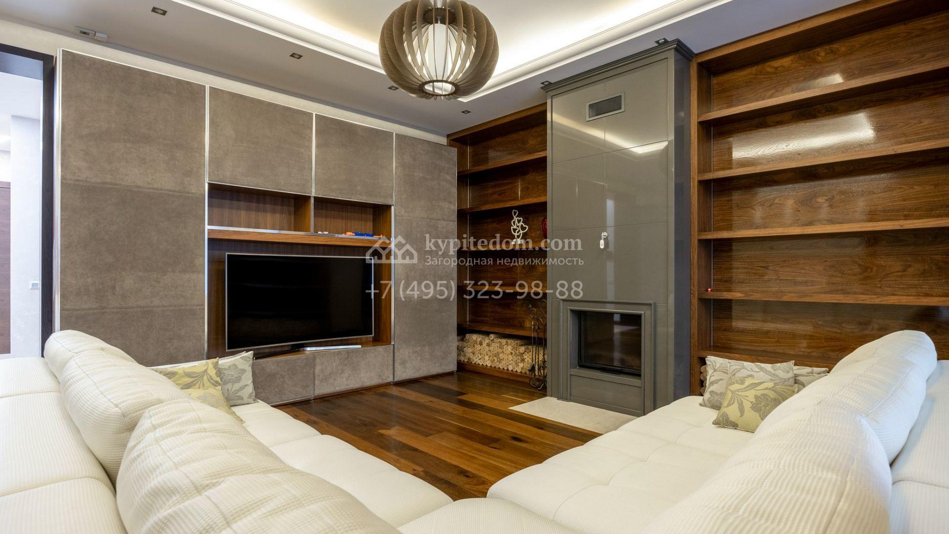 Таунхаус площадью 310 м² расположен на полевом участке 2,7 сотки. Фасад в райтовском стиле облицован травертином, лиственницей и мрамором. В отделке современного интерьера использованы дорогостоящие материалы, установлена мебель и система «умный дом». Планировка дома включает 5 спален, просторную кухню-гостиную с камином, столовую с выходом на участок и кабинет. В контуре резиденции расположен гараж. На участке выполнен ландшафтный дизайн, по периметру высажены туи и вымощены дорожки.