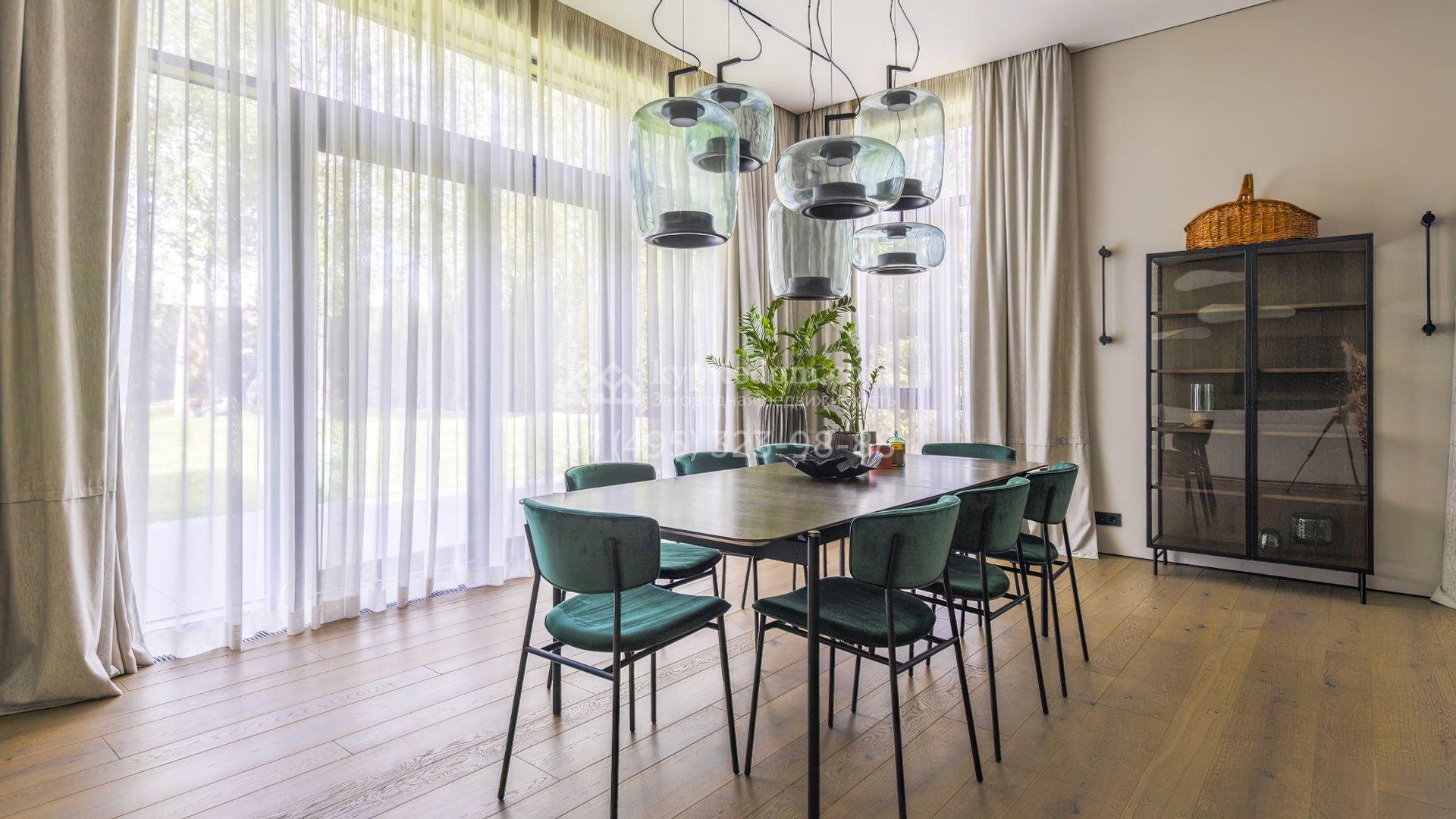 Планировка включает просторную гостиную с камином, кухню-столовую, четыре спальни, кабинет, блок для персонала и гараж на 40 м². На участке проведены ландшафтные работы — засеян газон, высажены взрослые хвойные деревья и кустарники, проложены дорожки и проведено уличное освещение.