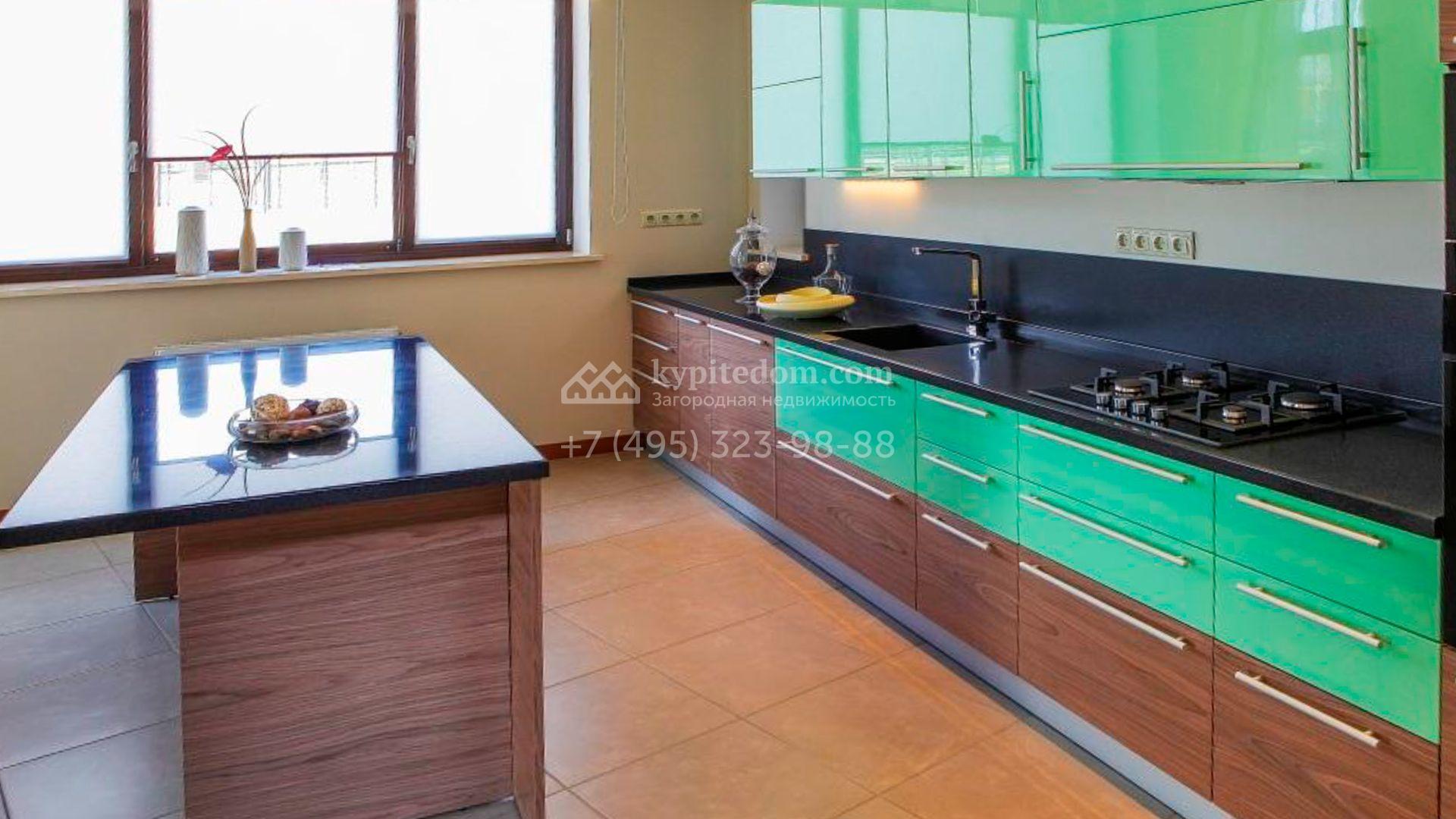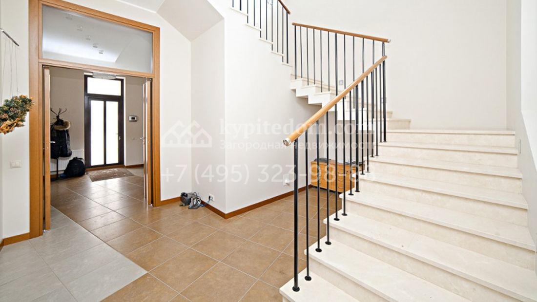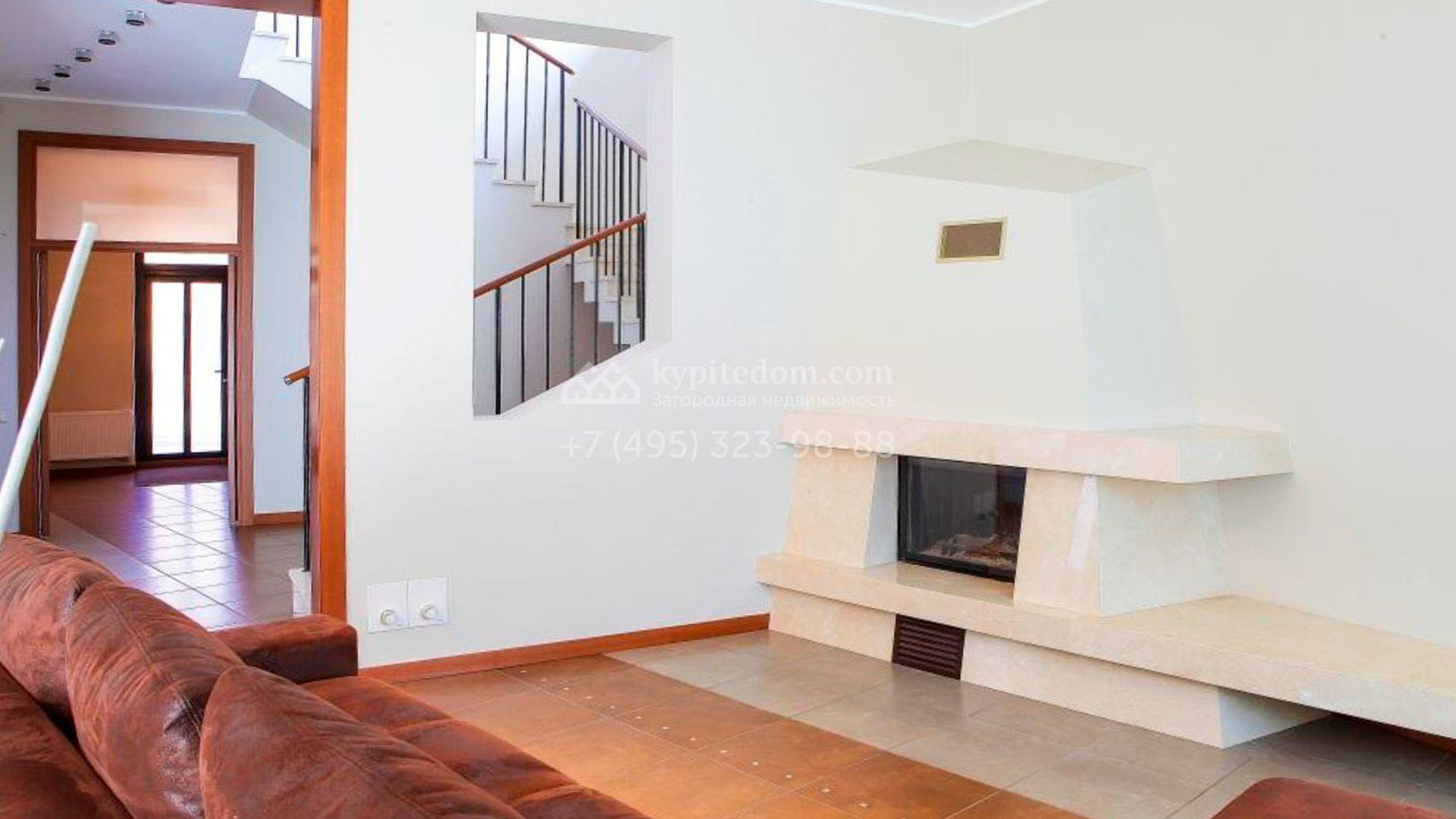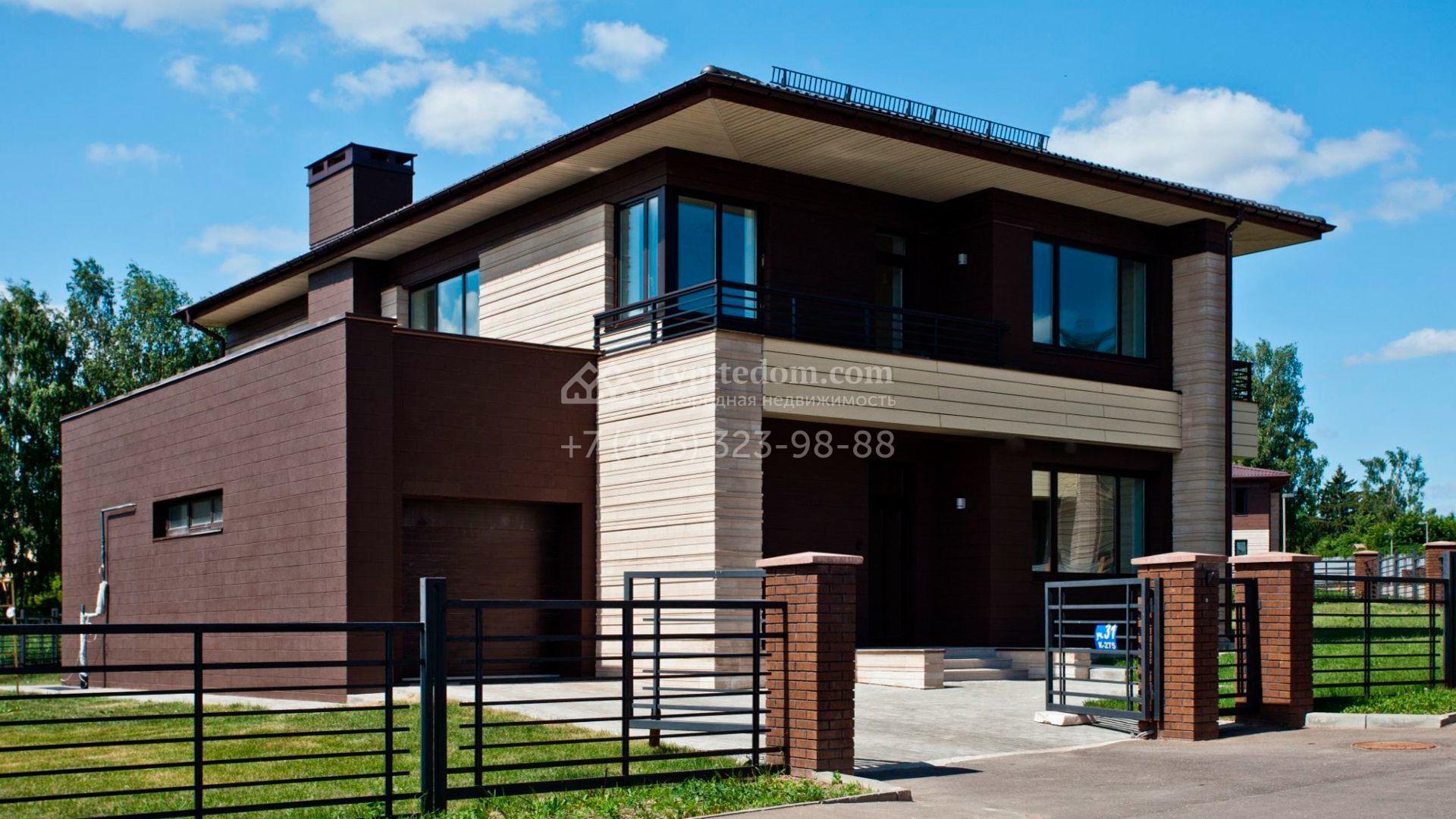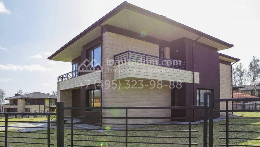 Двухэтажный современный дом с отделкой из кремовой и кофейной плитки. На первом этаже расположена прихожая, гостевой санузел и постирочная, можно выйти в кабинет, гараж и котельную. Кухня VITALY оборудована встроенной бытовой техникой, гостиная-столовая с камином подходит для семейных обедов — отсюда можно выйти на террасу. На втором этаже санузел, 2 спальни с балконами и спальня хозяев с санузлом, гардеробной и выходом на балкон. Общая площадь дома 323 м², на открытом участке в 13 соток посажен газон.