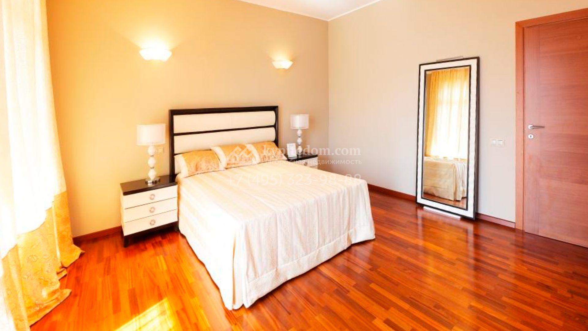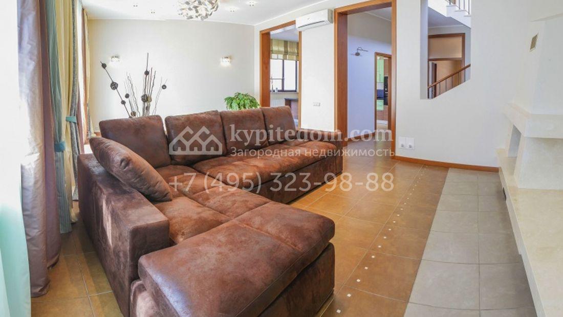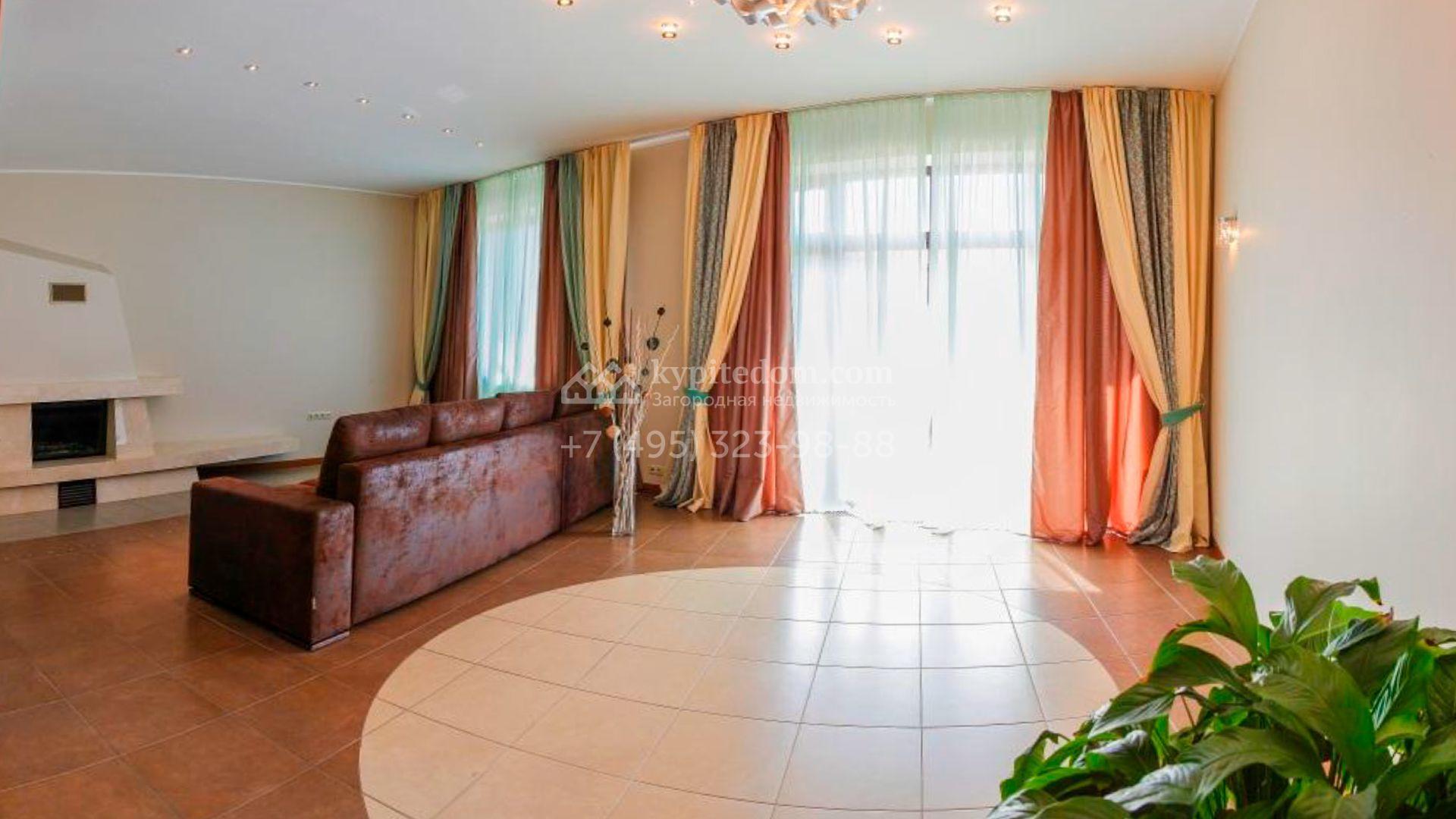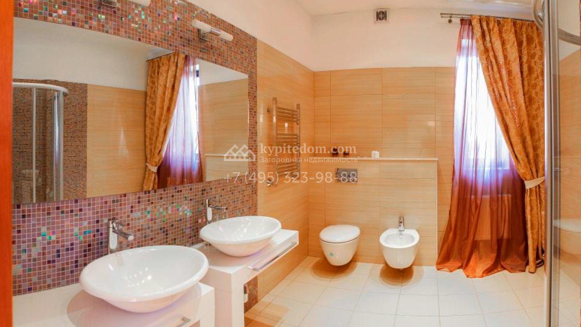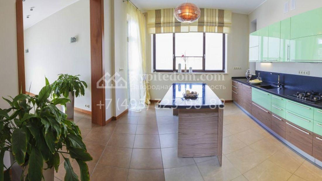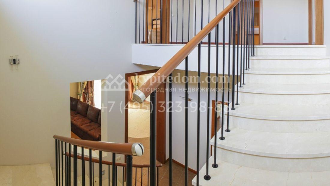 Двухэтажный современный дом с отделкой из кремовой и кофейной плитки. На первом этаже расположена прихожая, гостевой санузел и постирочная, можно выйти в кабинет, гараж и котельную. Кухня VITALY оборудована встроенной бытовой техникой, гостиная-столовая с камином подходит для семейных обедов — отсюда можно выйти на террасу. На втором этаже санузел, 2 спальни с балконами и спальня хозяев с санузлом, гардеробной и выходом на балкон. Общая площадь дома 323 м², на открытом участке в 13 соток посажен газон.