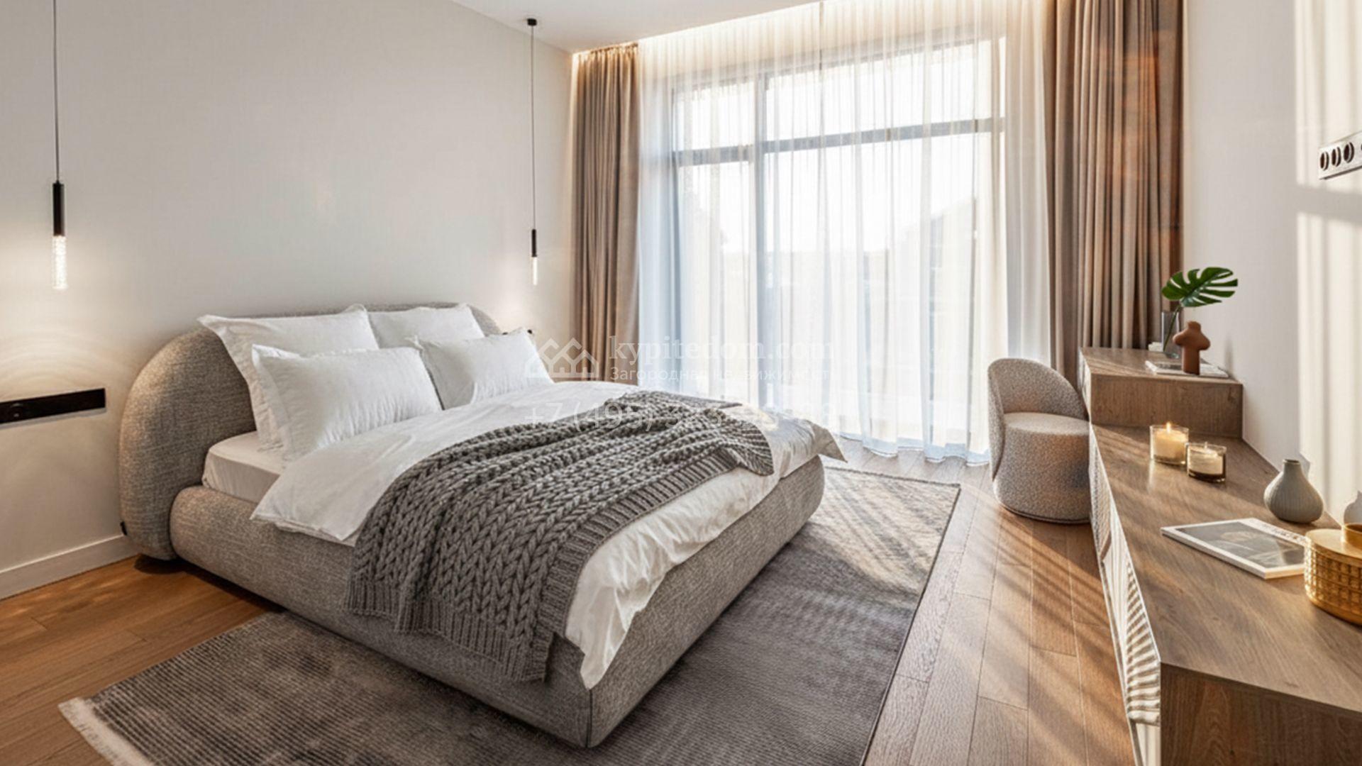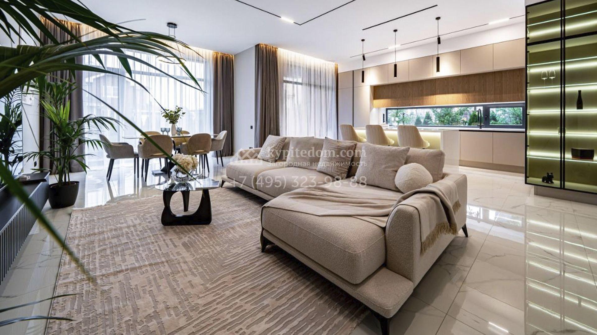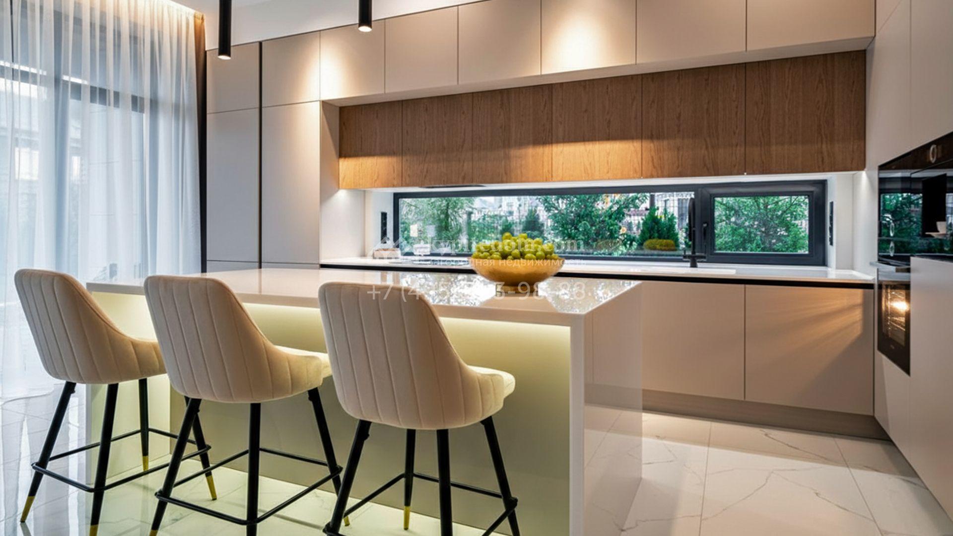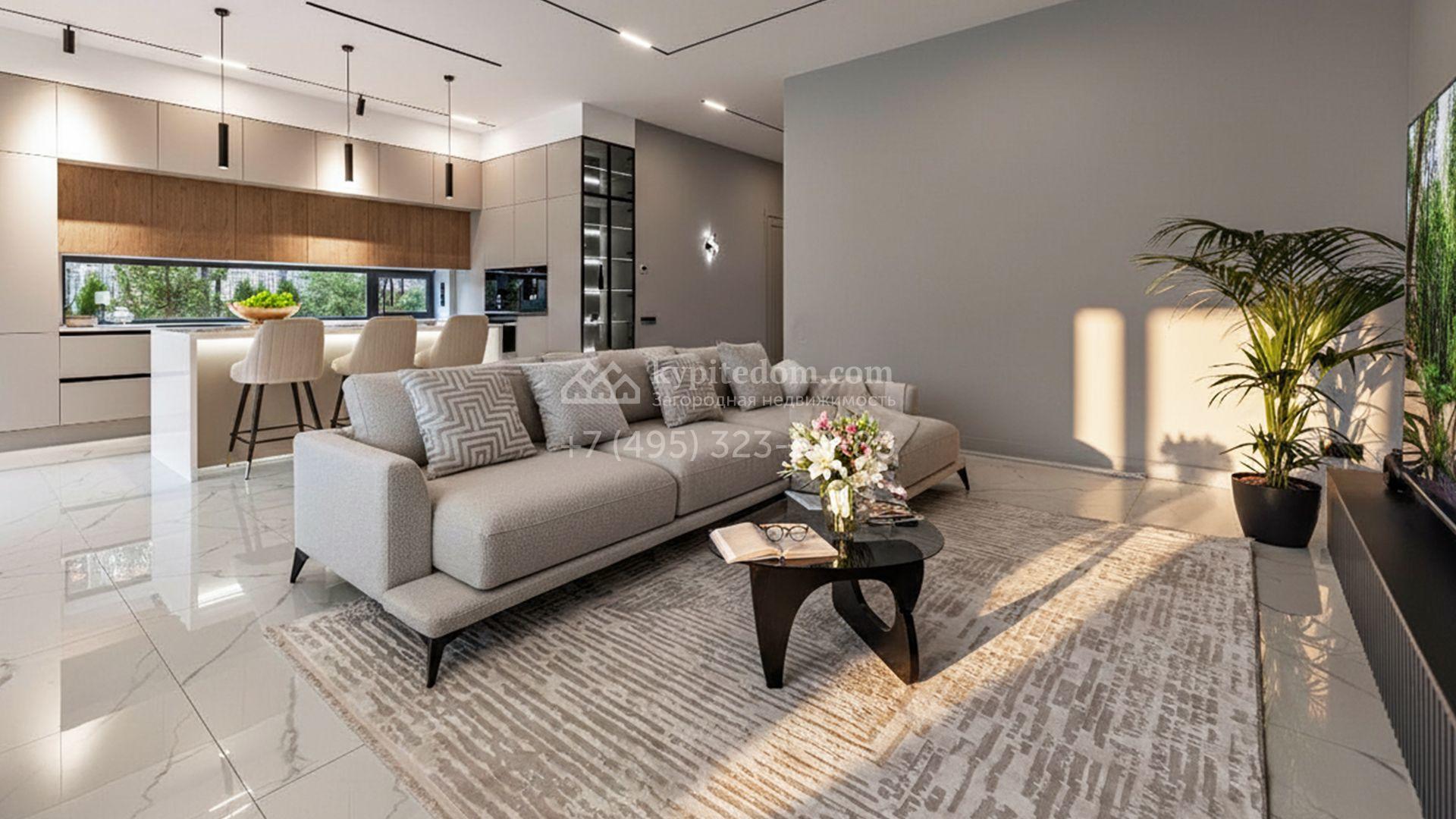 Загородный коттедж площадью 310 м² расположен на полевом участке 6 соток в тихой верхней части посёлка. Современный фасад, гармонично сочетающий фактуры камня и дерева, выглядит особенно эффектно вечером благодаря стильной архитектурной подсветке. Панорамные окна открывают живописные виды на озеро и наполняют внутренние пространства солнцем, визуально расширяя их.