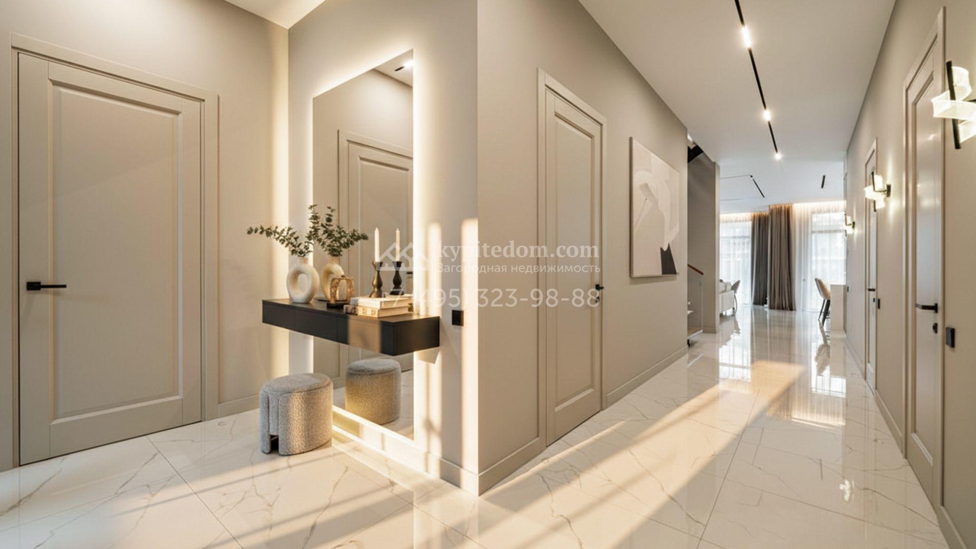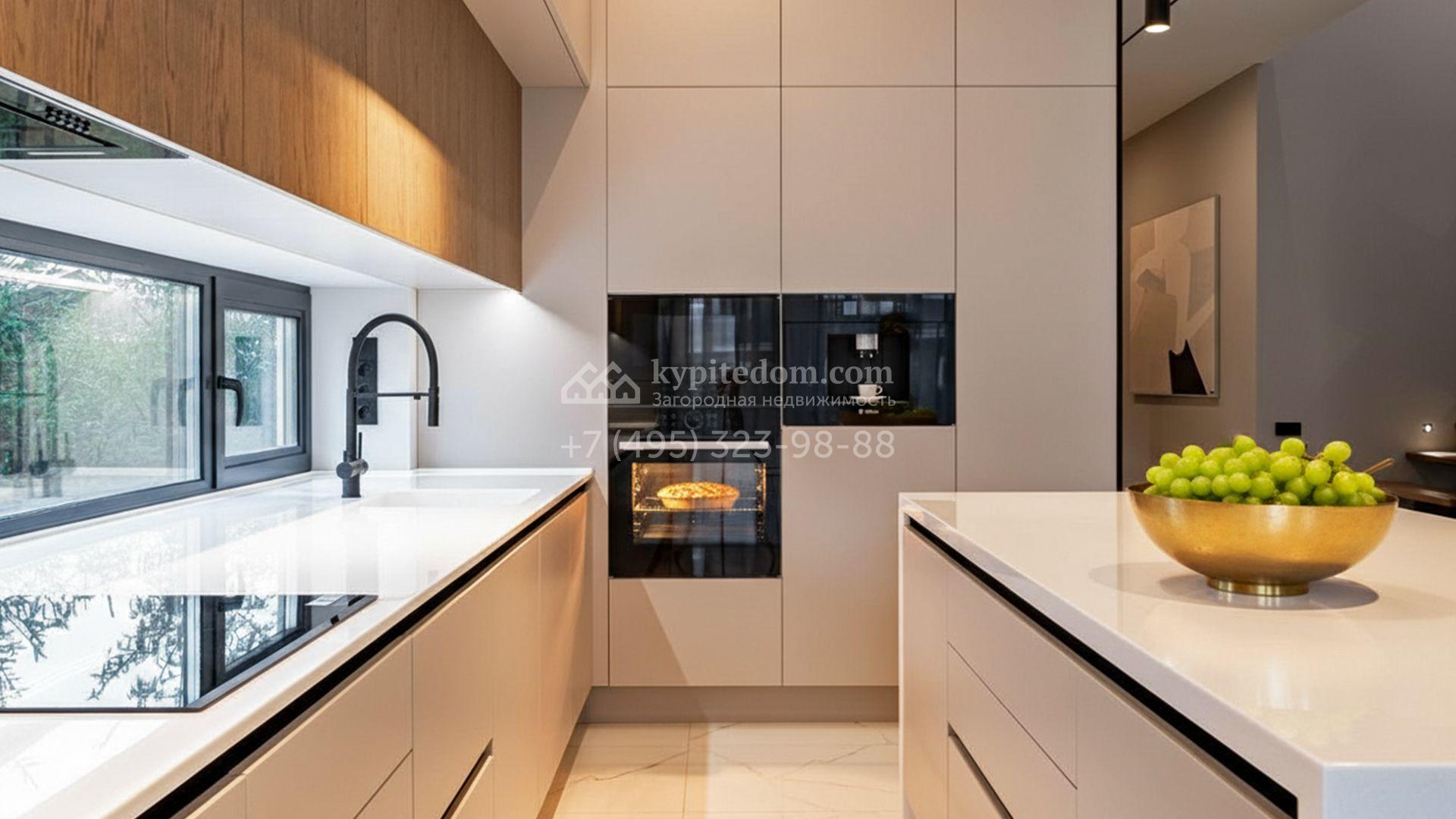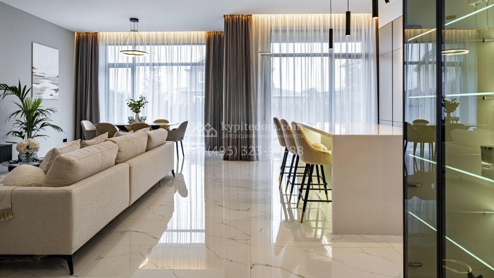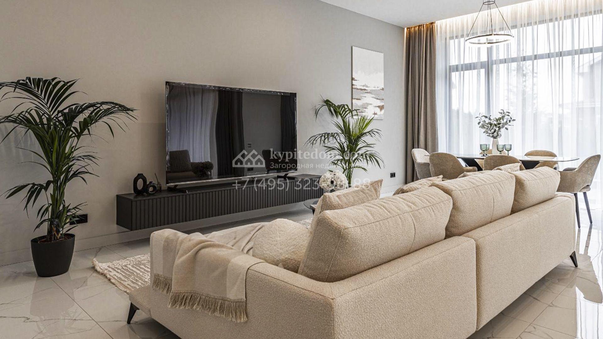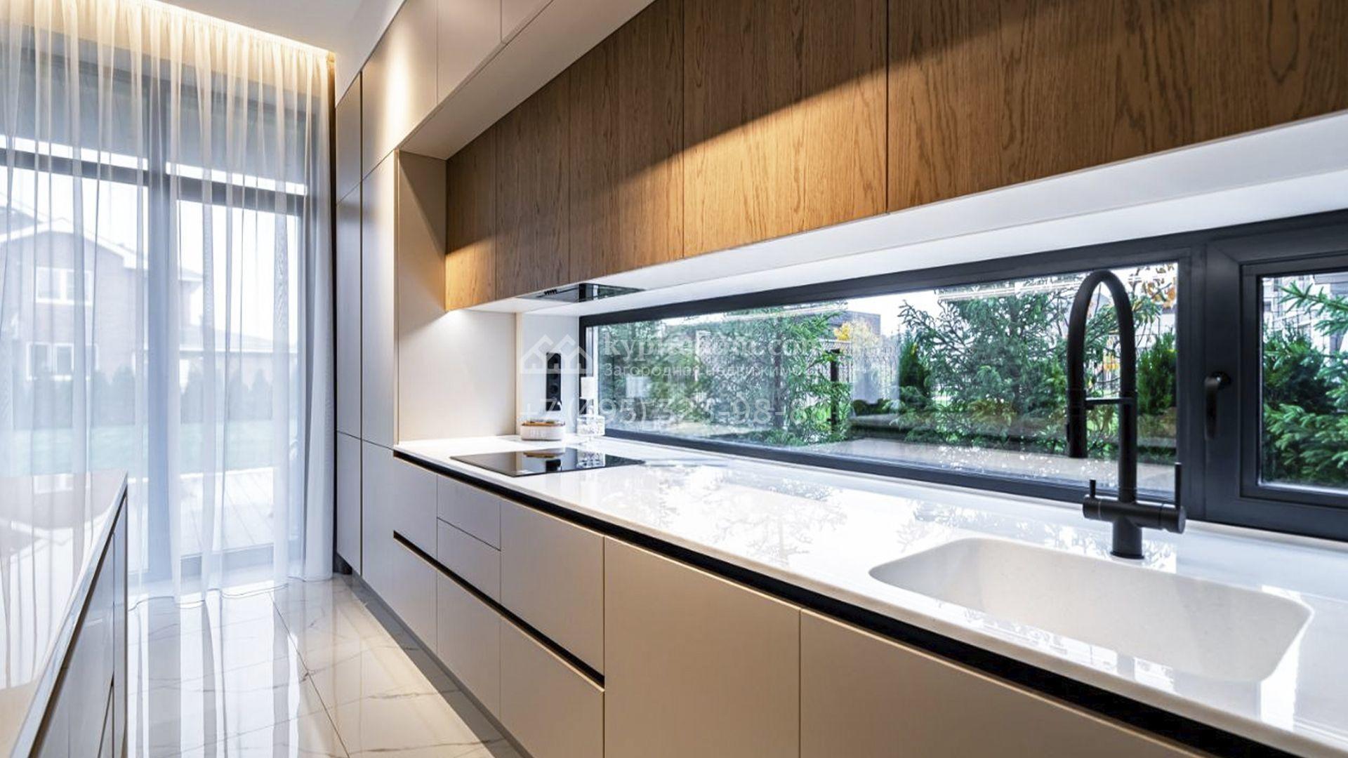 Загородный коттедж площадью 310 м² расположен на полевом участке 6 соток в тихой верхней части посёлка. Современный фасад, гармонично сочетающий фактуры камня и дерева, выглядит особенно эффектно вечером благодаря стильной архитектурной подсветке. Панорамные окна открывают живописные виды на озеро и наполняют внутренние пространства солнцем, визуально расширяя их.