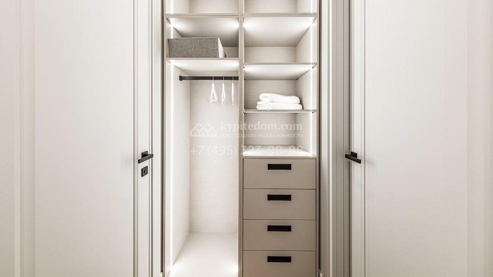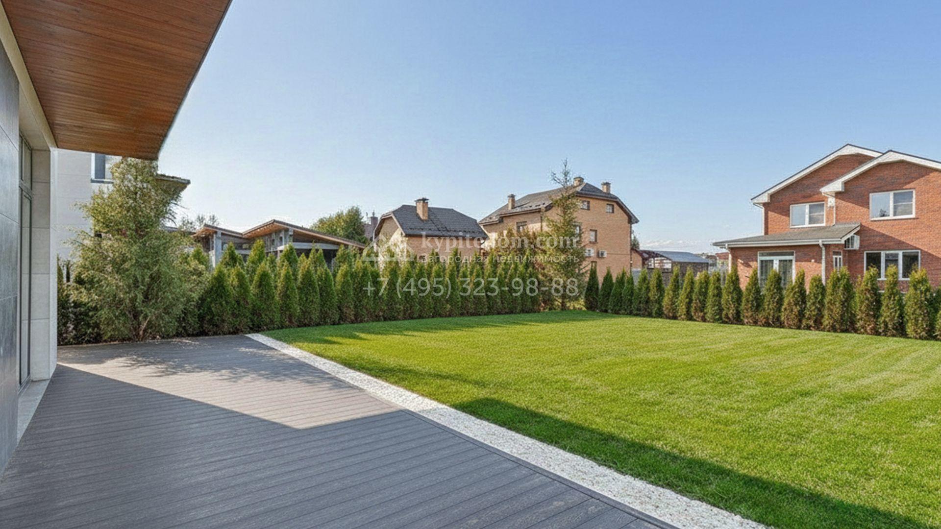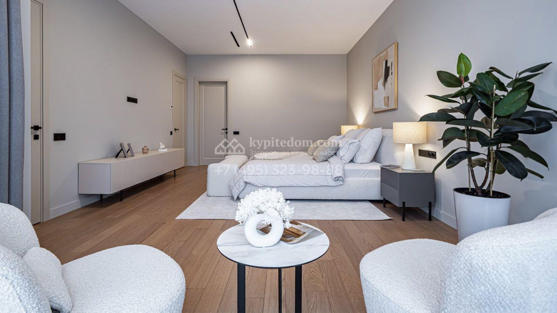 Планировка включает просторную гостиную-кухню-столовую с удобным островом, четыре уютные спальни с собственными гардеробными, приватный кабинет, сауну, оборудованную постирочную и террасу для вечерних чаепитий. Для комфортного размещения машин предусмотрен навес. Участок благоустроен — здесь вымощена плиткой придомовая территория, засеян аккуратный газон, а по периметру высажены стройные туи, создающие атмосферу приватности.