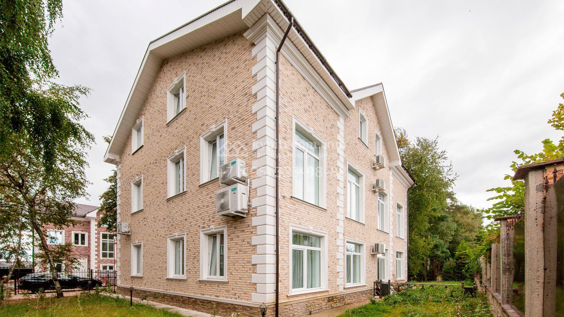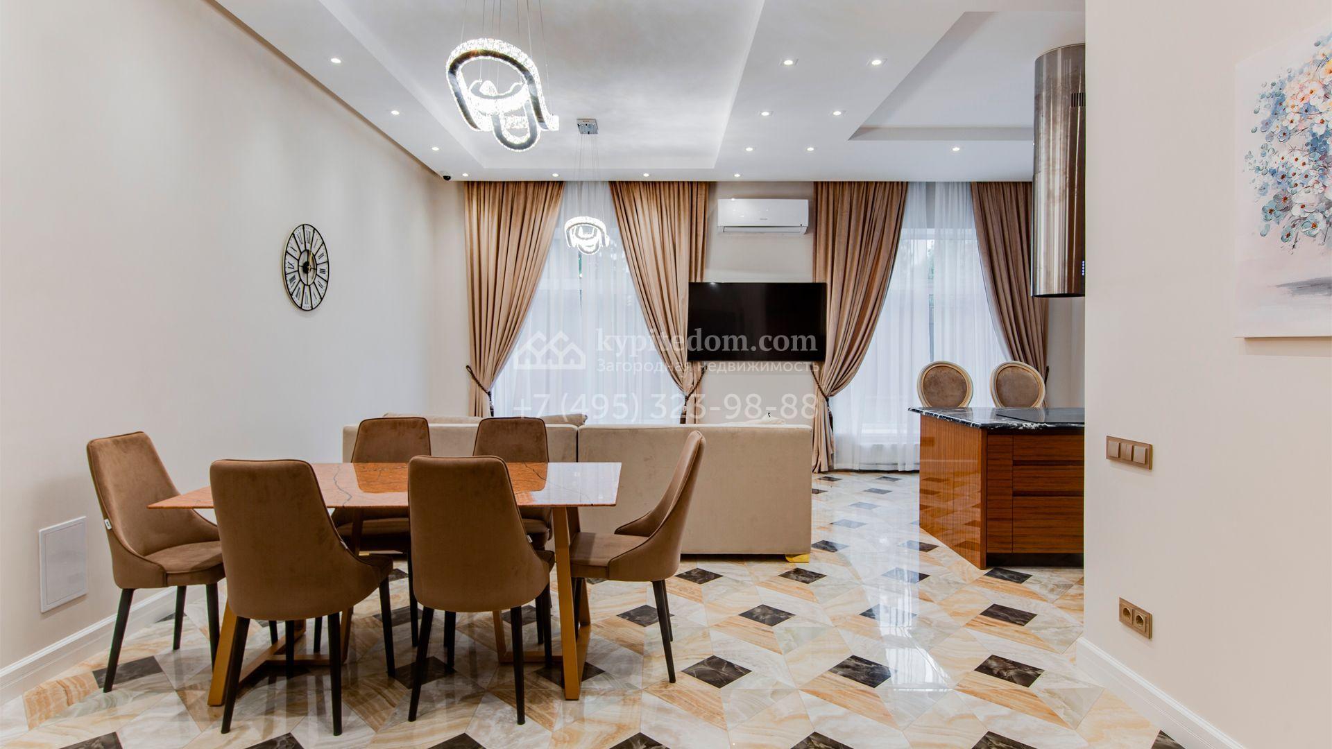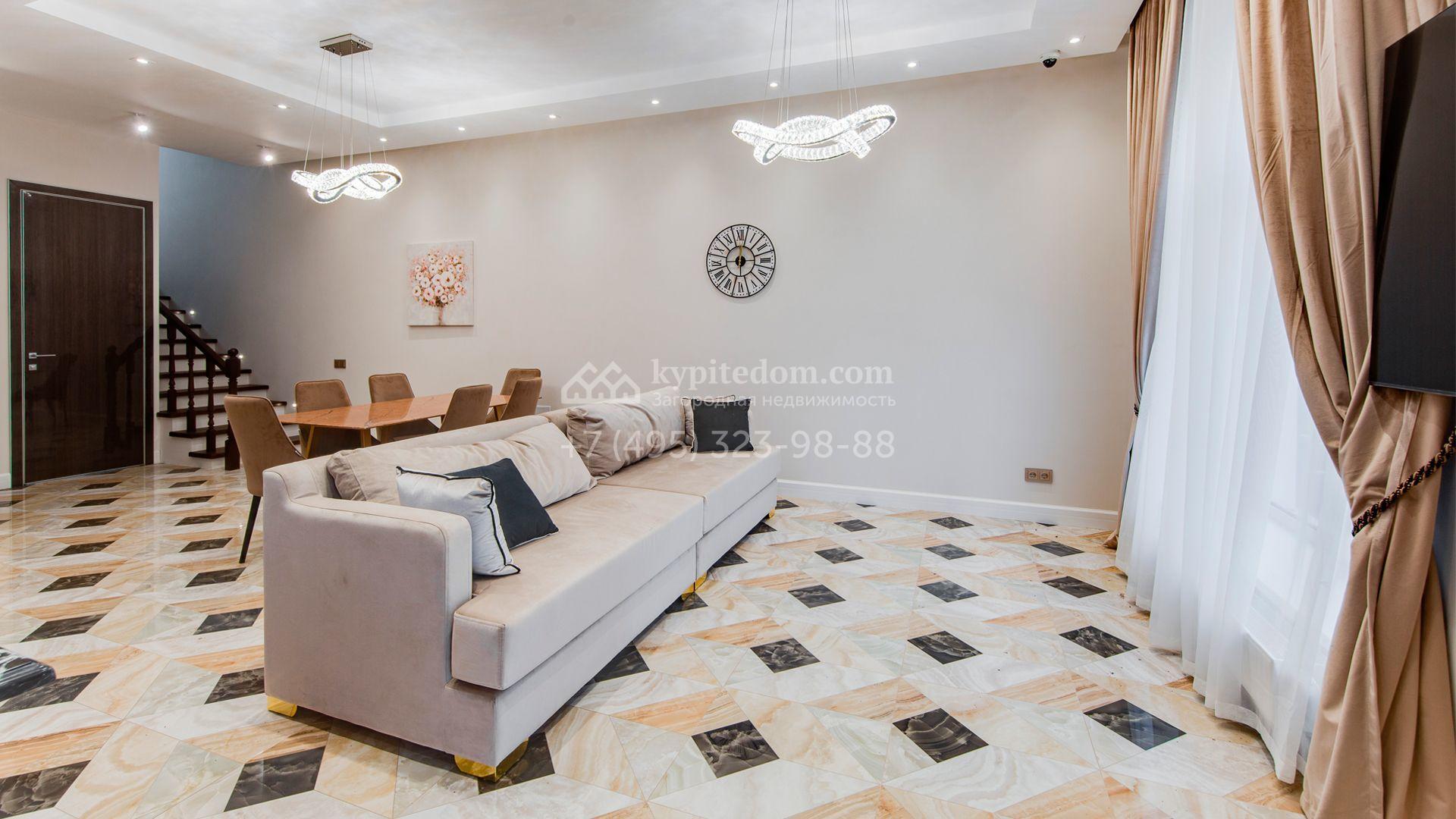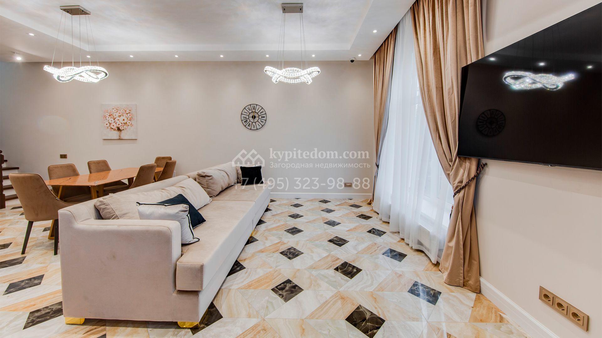 Уютный таунхаус площадью 225 м² расположен на полевом участке 3 сотки. Фасад облицован бежевой клинкерной плиткой, украшен белыми наличниками и рустовкой. Современный интерьер выполнен в теплой светлой гамме цветов. Внутри разместили 3 спальни, кухню-столовую, гостиную, кабинет и кинотеатр. На огороженном участке засеян газон и установлено уличное освещение.