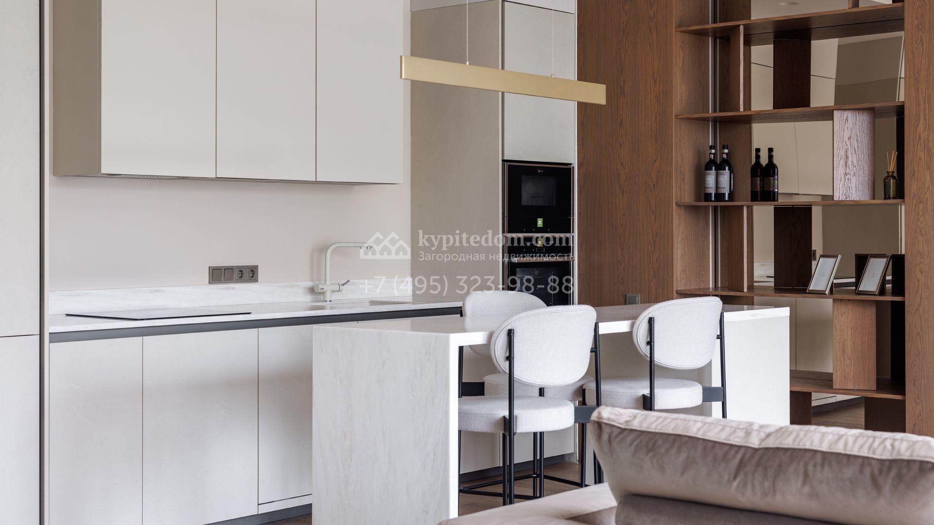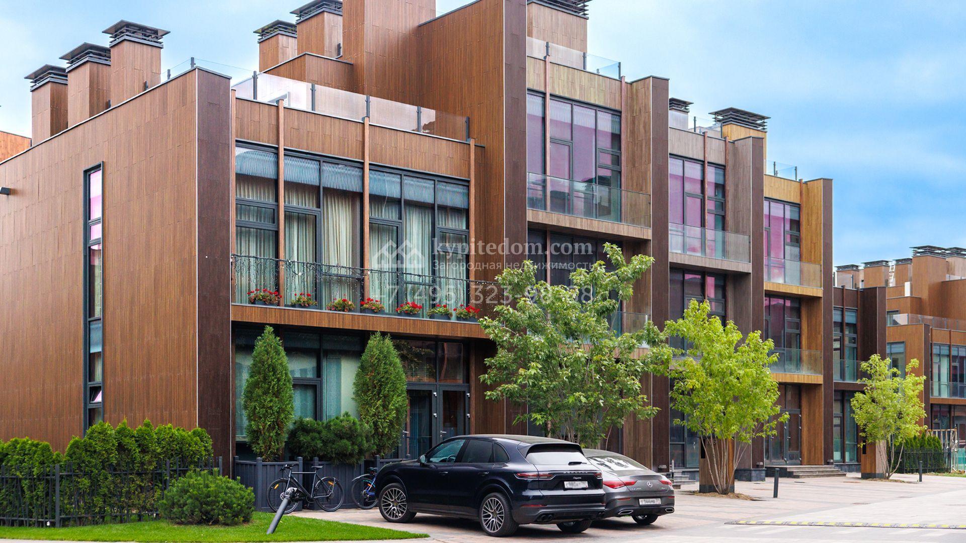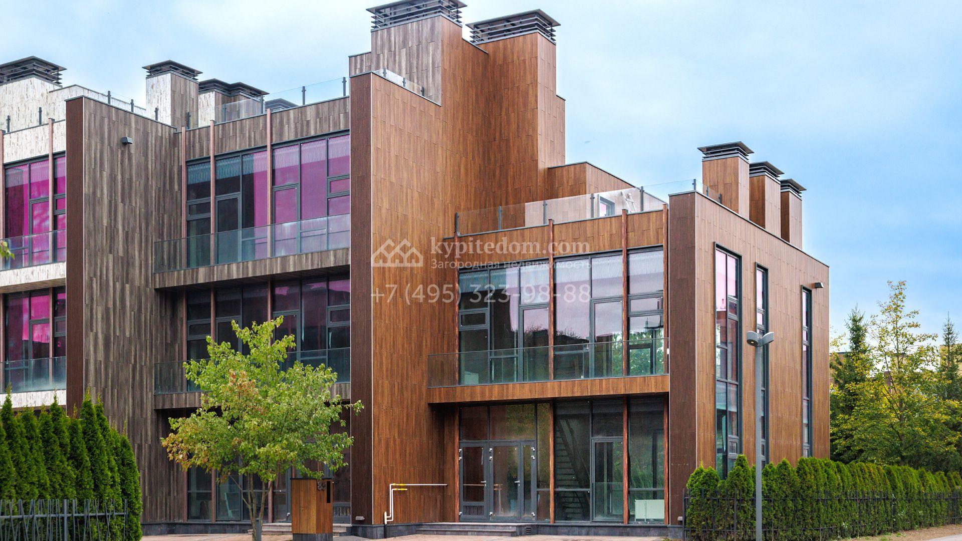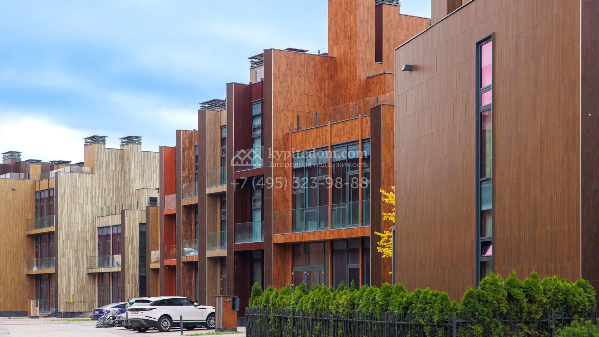 Таунхаус площадью 240 м² расположен в середине секции на участке 3,5 сотки. Современный фасад здания выполнен из австрийских панелей, имитирующих дерево, и изготовлен из высокопрочного пластика. Внутреннее оформление демонстрирует эстетику минимализма и выдержано в светлых нейтральных оттенках. Мебель в серо-кремовых тонах от итальянских брендов органично сочетается с натуральными текстурами дерева и мрамора. Широкоформатные панорамные окна и тщательно продуманные сценарии освещения завершают композицию.